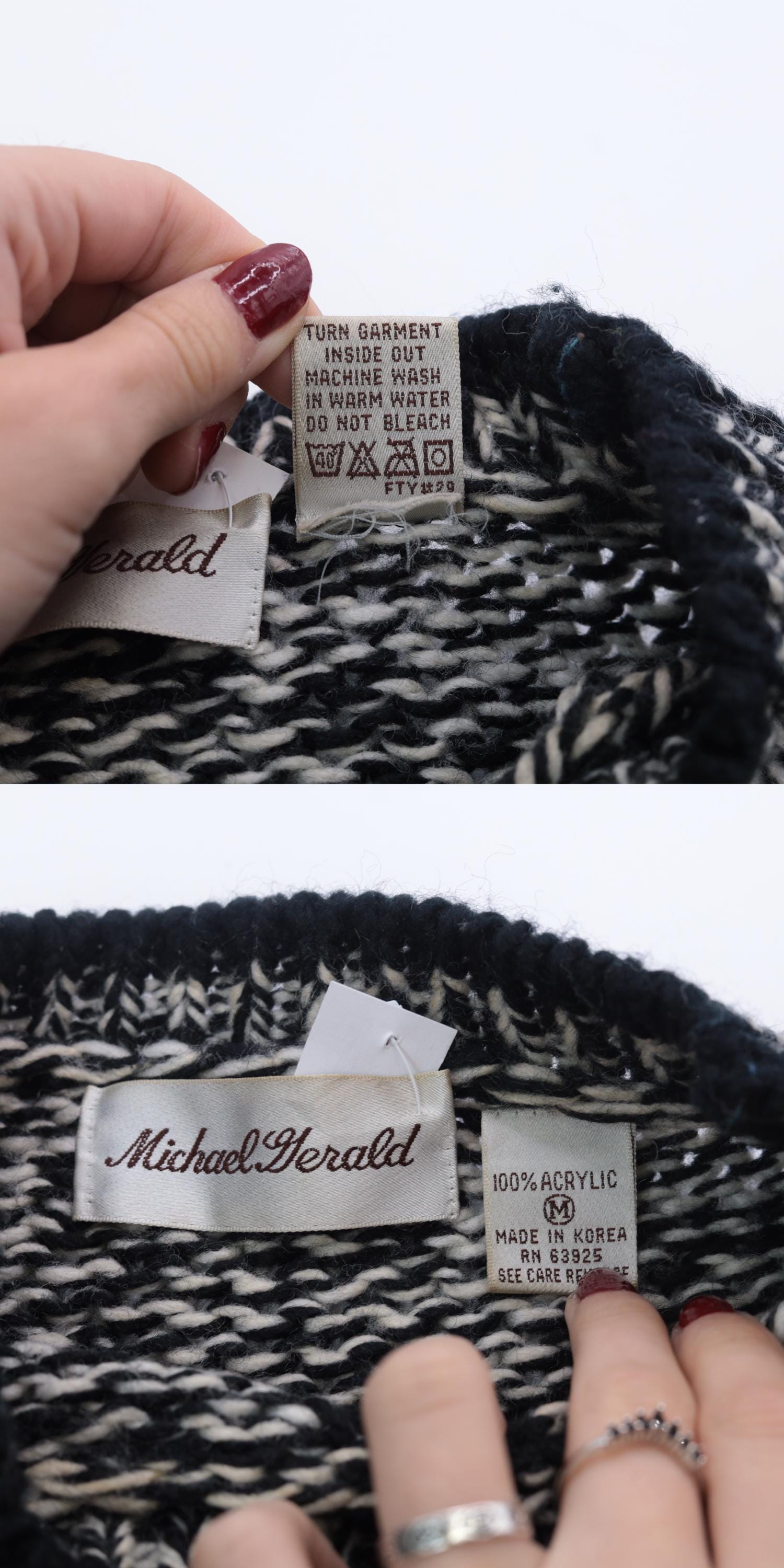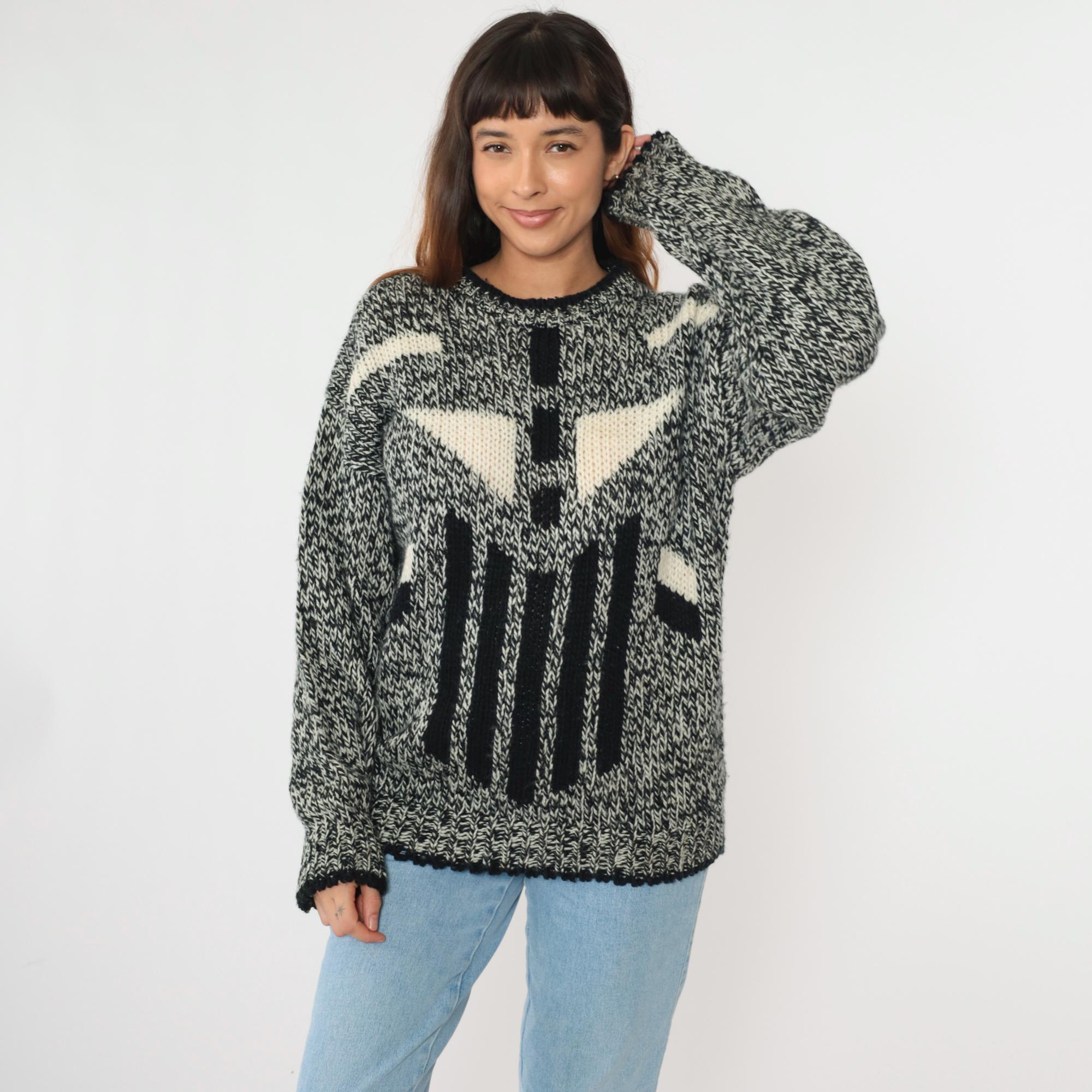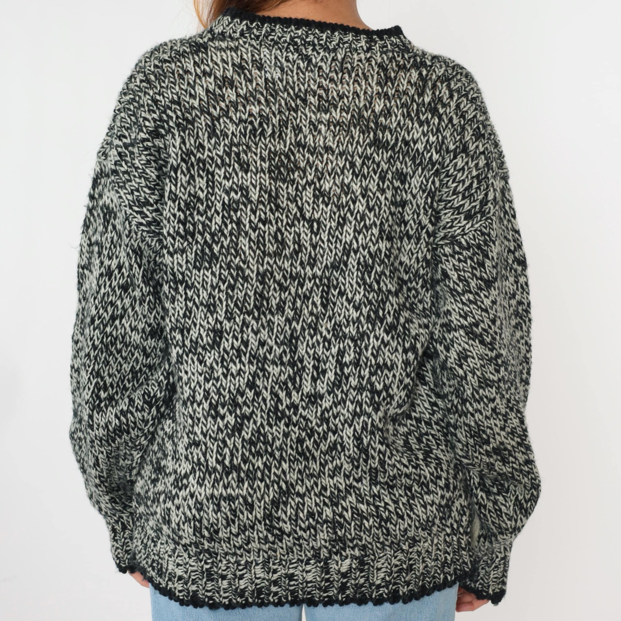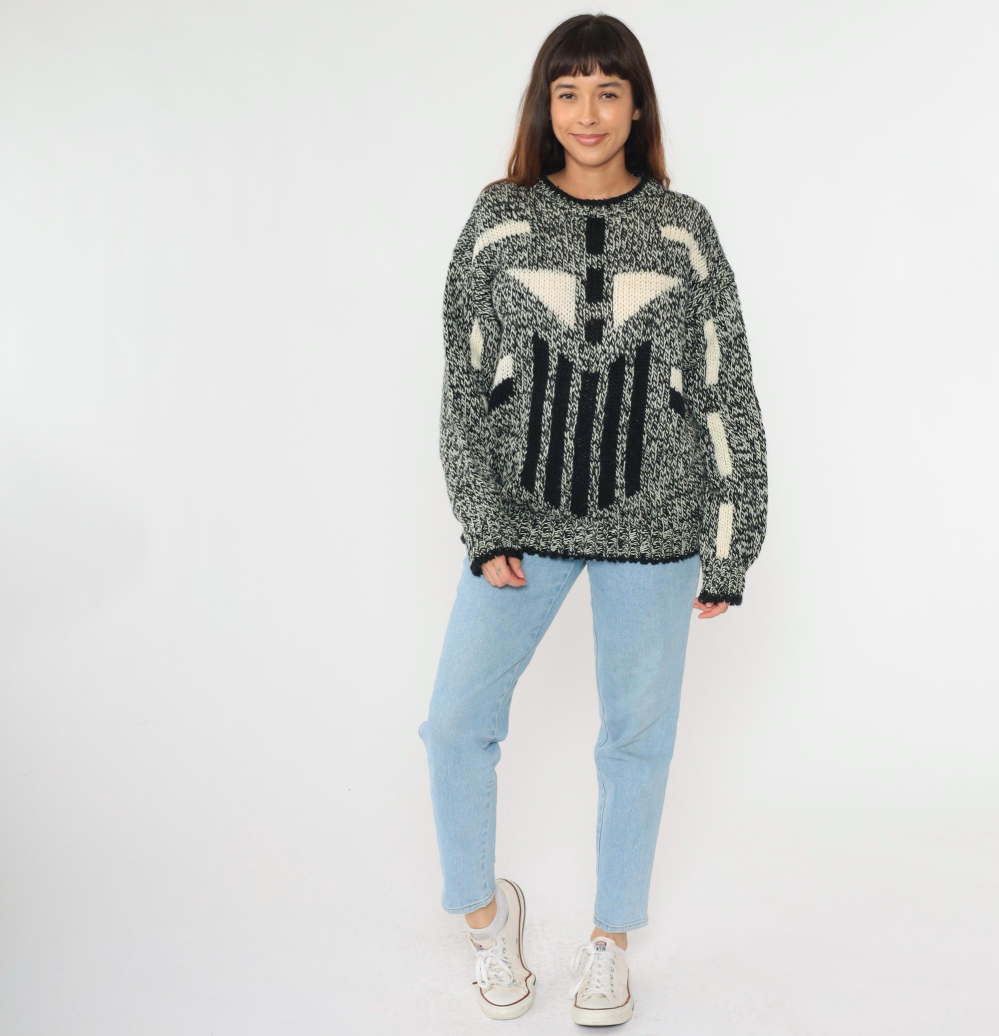 Vintage 1980s marled black and white chunky knit sweater featuring a bold geometric design across the front. This pullover sweater has a classic crew neck and a relaxed, oversized fit.