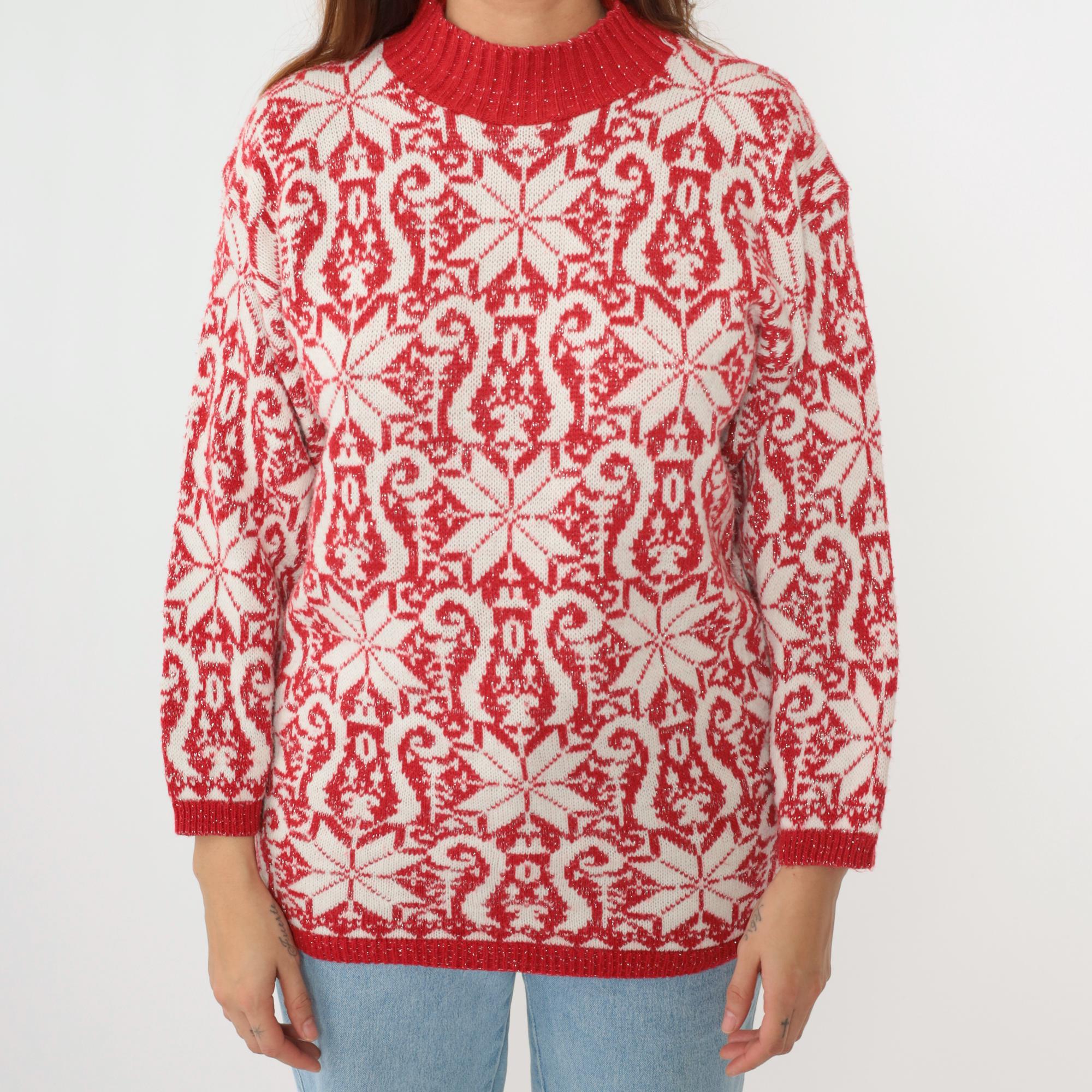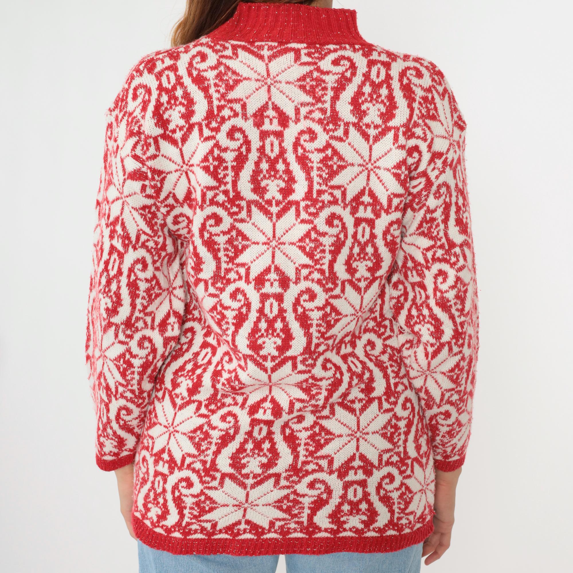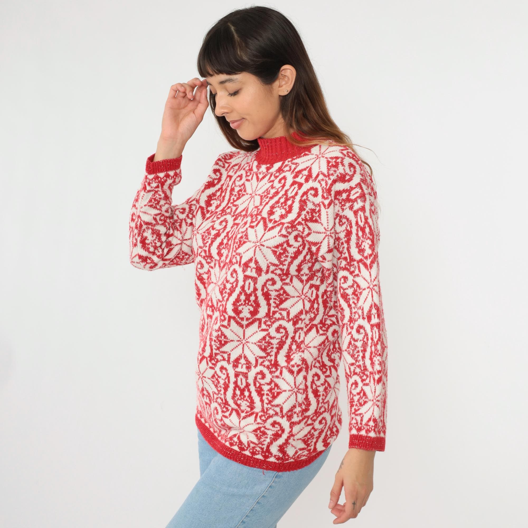 Vintage 80s 90s sweater in a red and white metallic snowflake print with a mock neck.