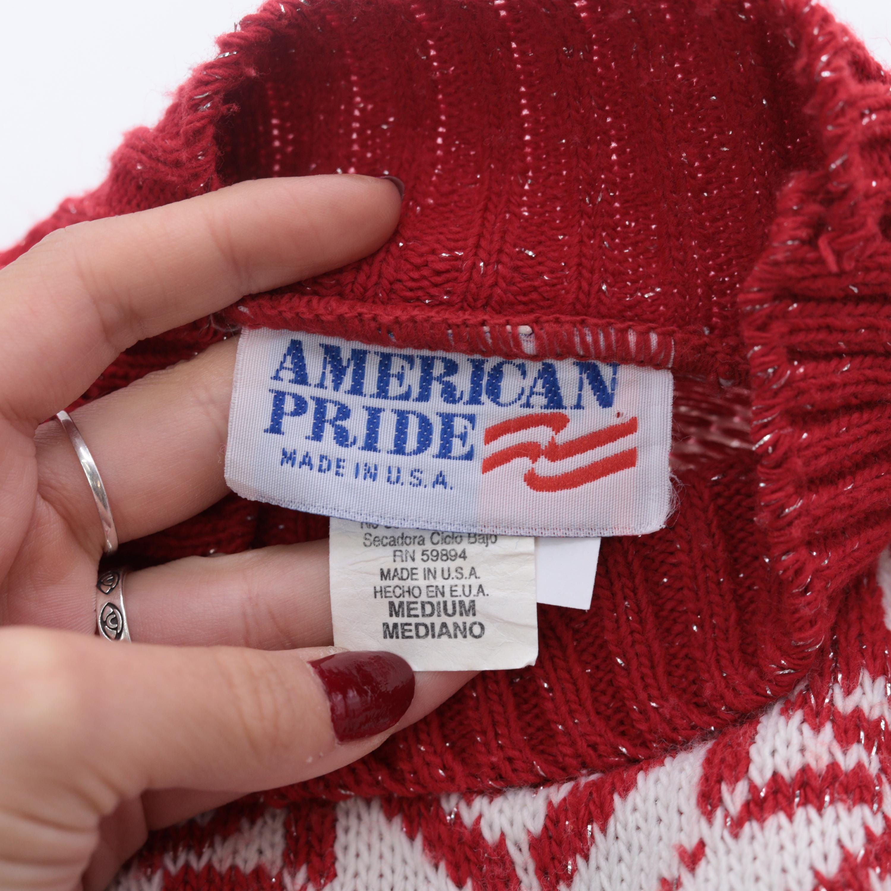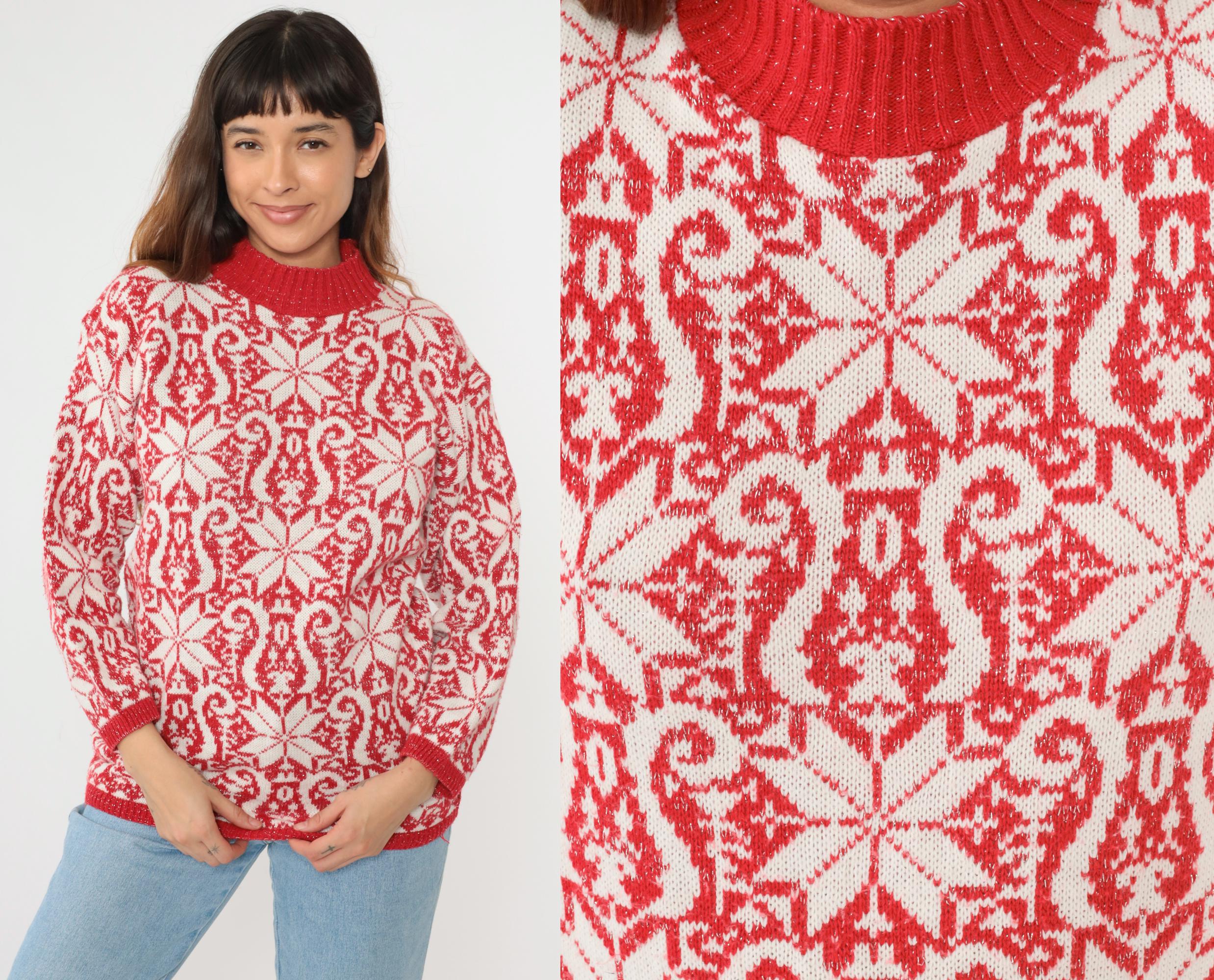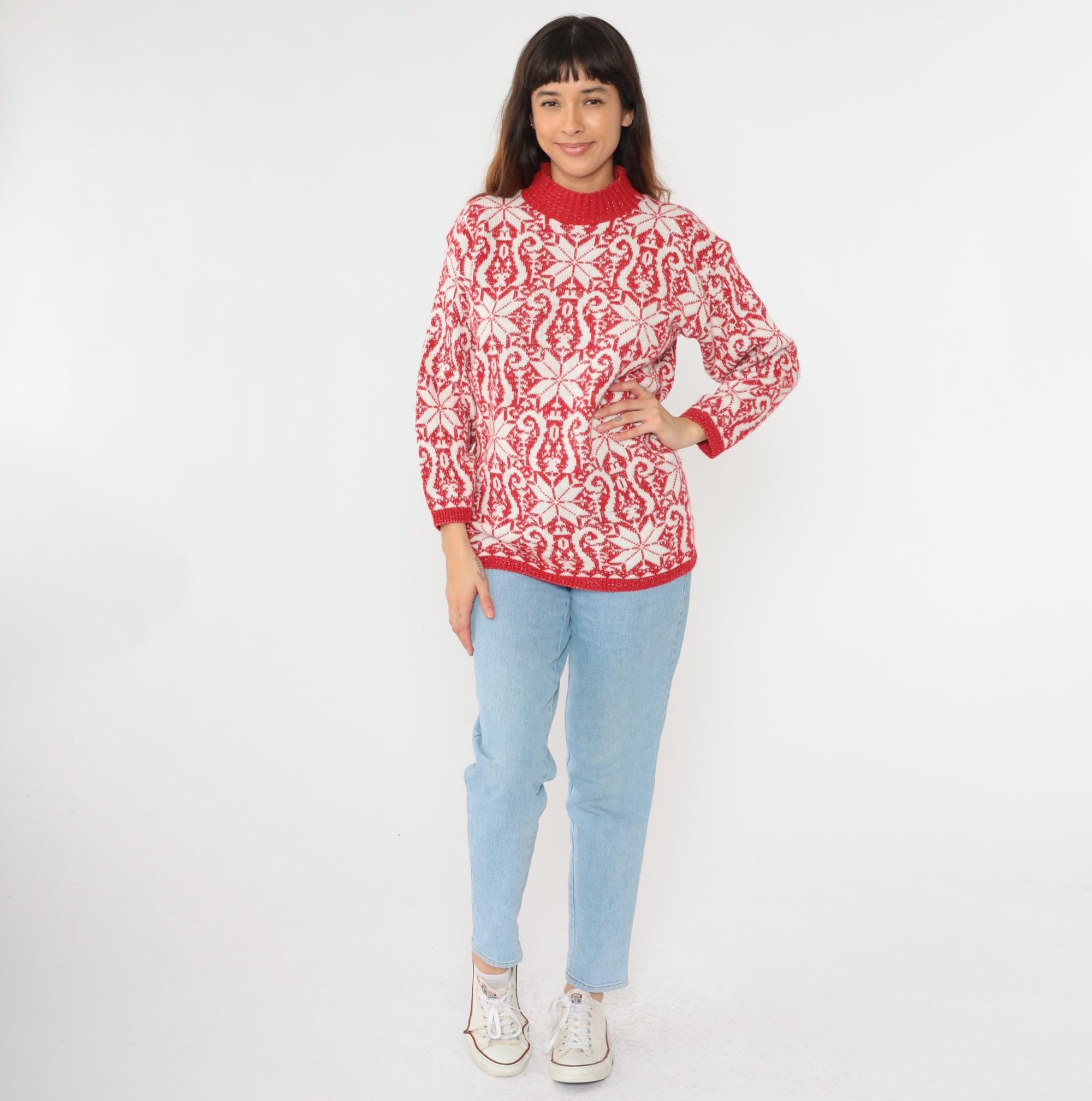 Vintage 80s 90s sweater in a red and white metallic snowflake print with a mock neck.