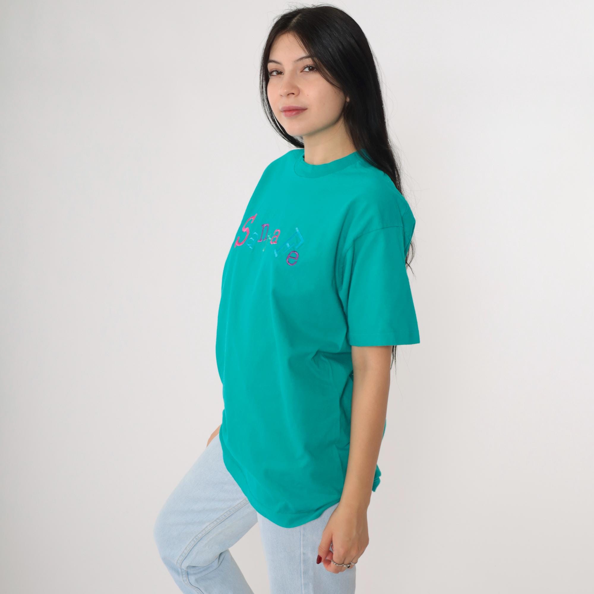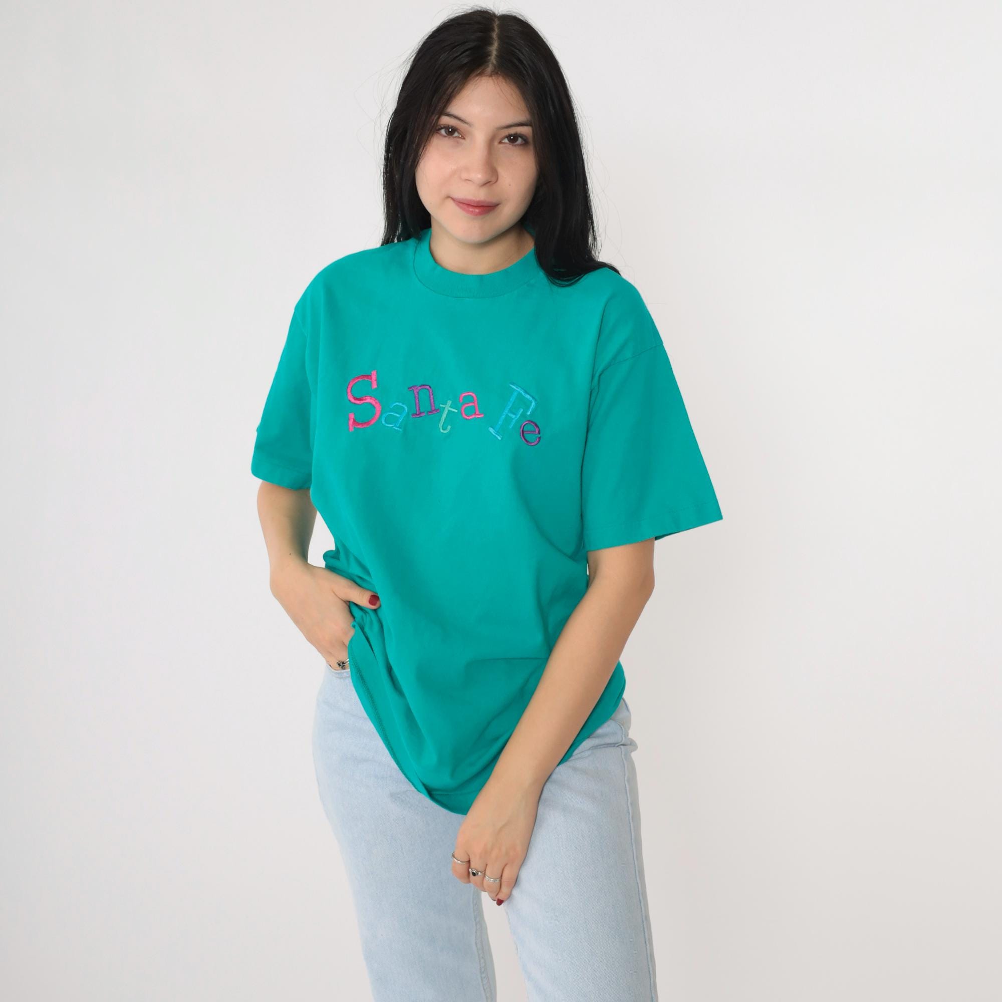 Vintage 90s t shirt with Santa Fe embroidered on the chest. It features a crewneck and short sleeves.