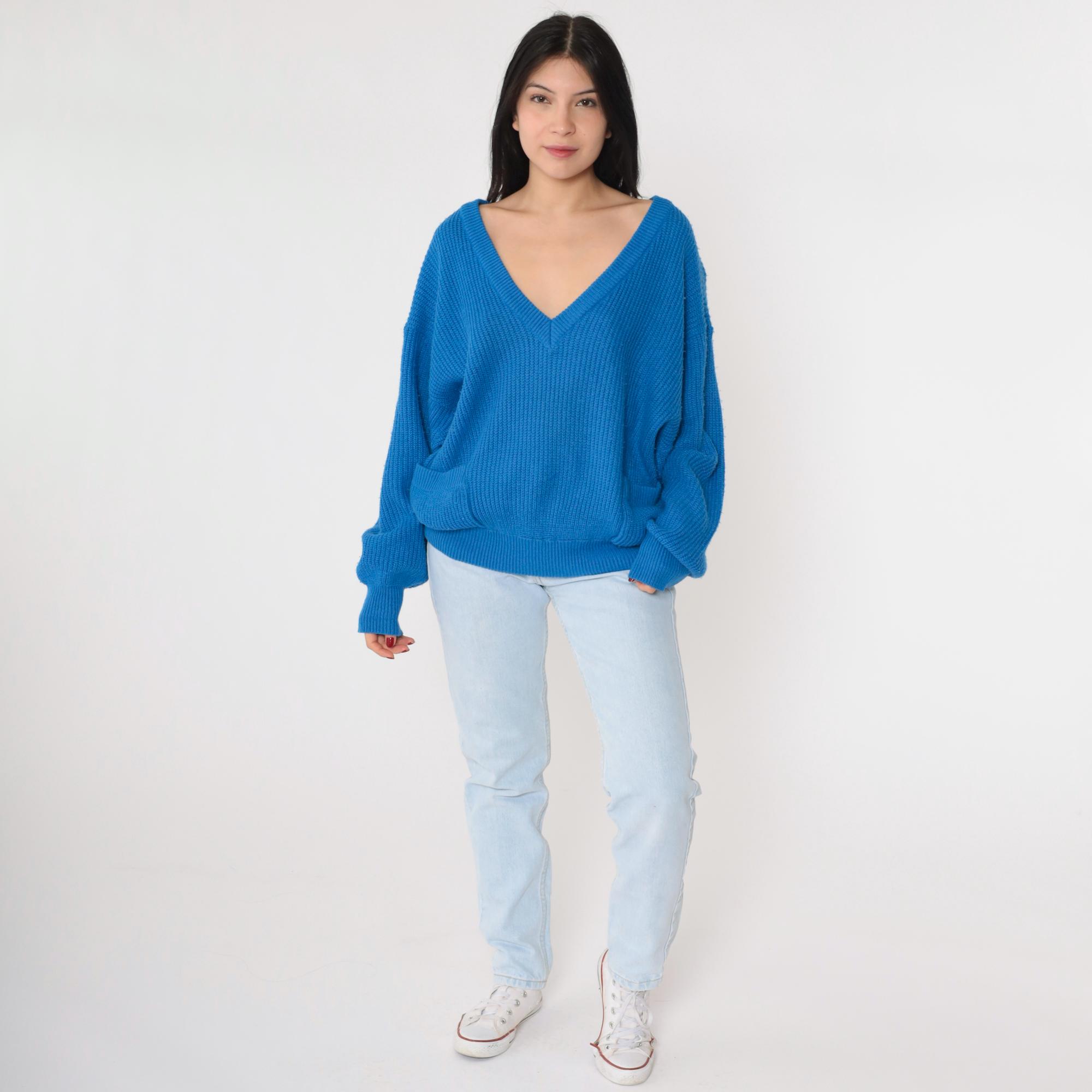 Vintage 80s sweater in blue ribbed knit with a deep v neck and pockets. Runs oversize.