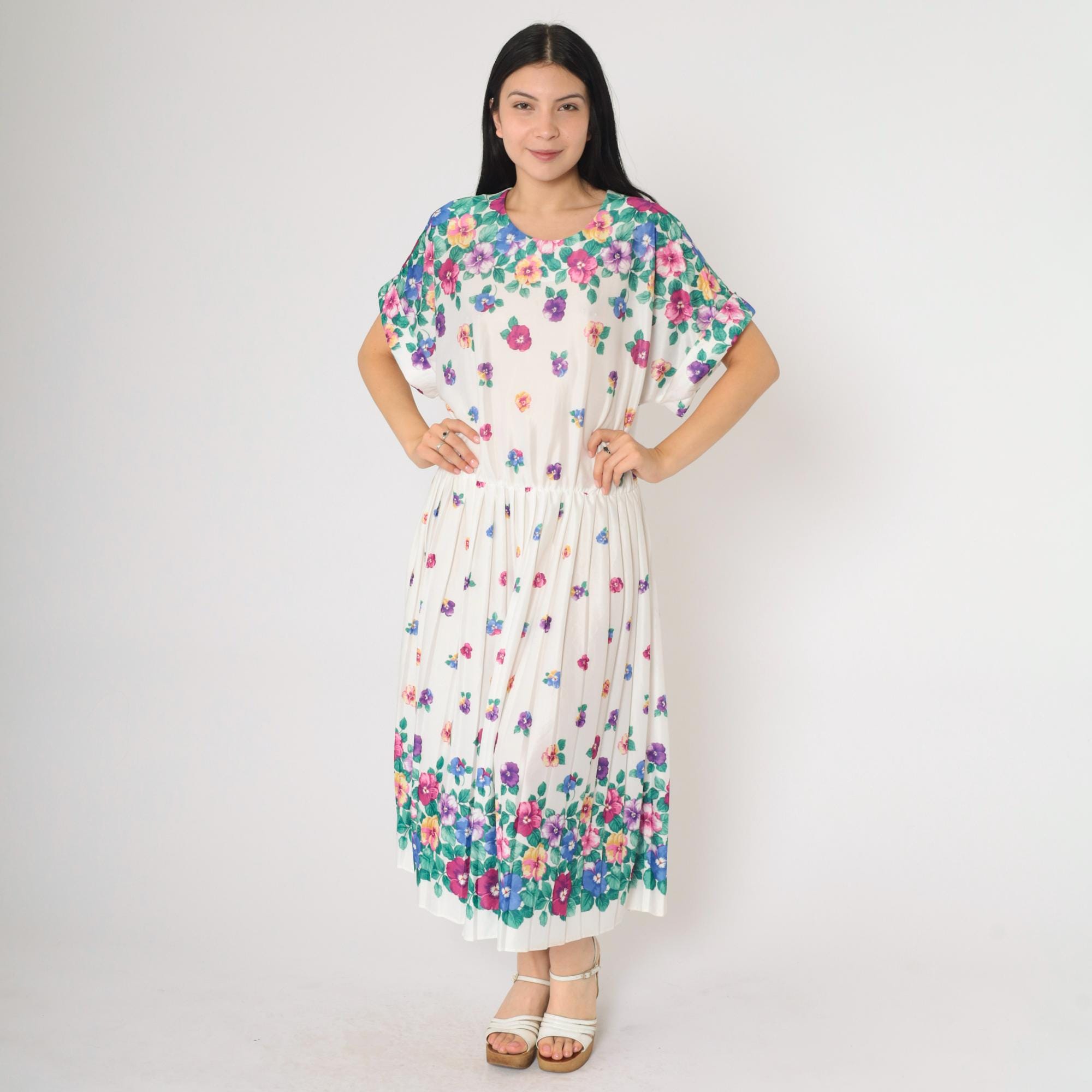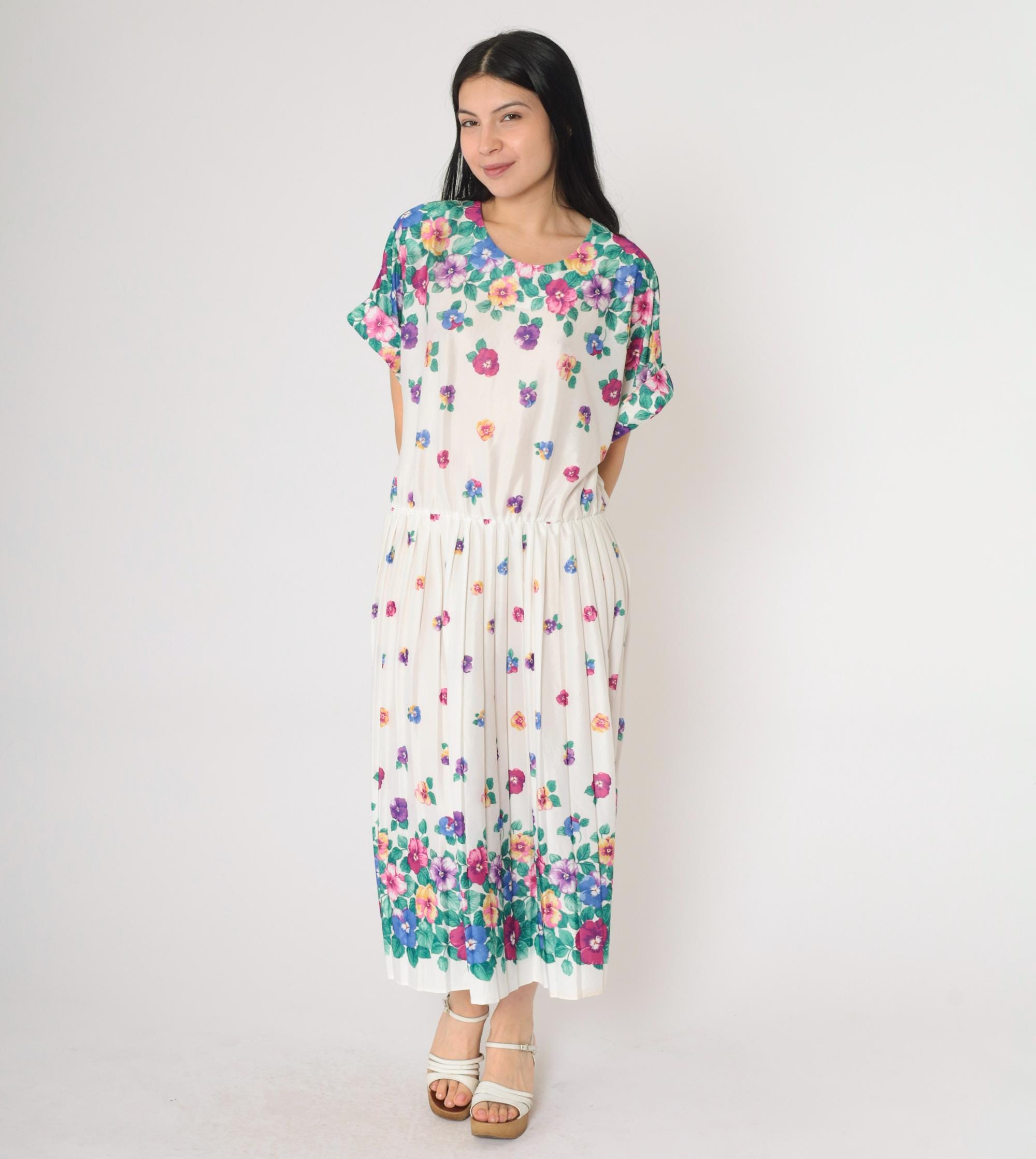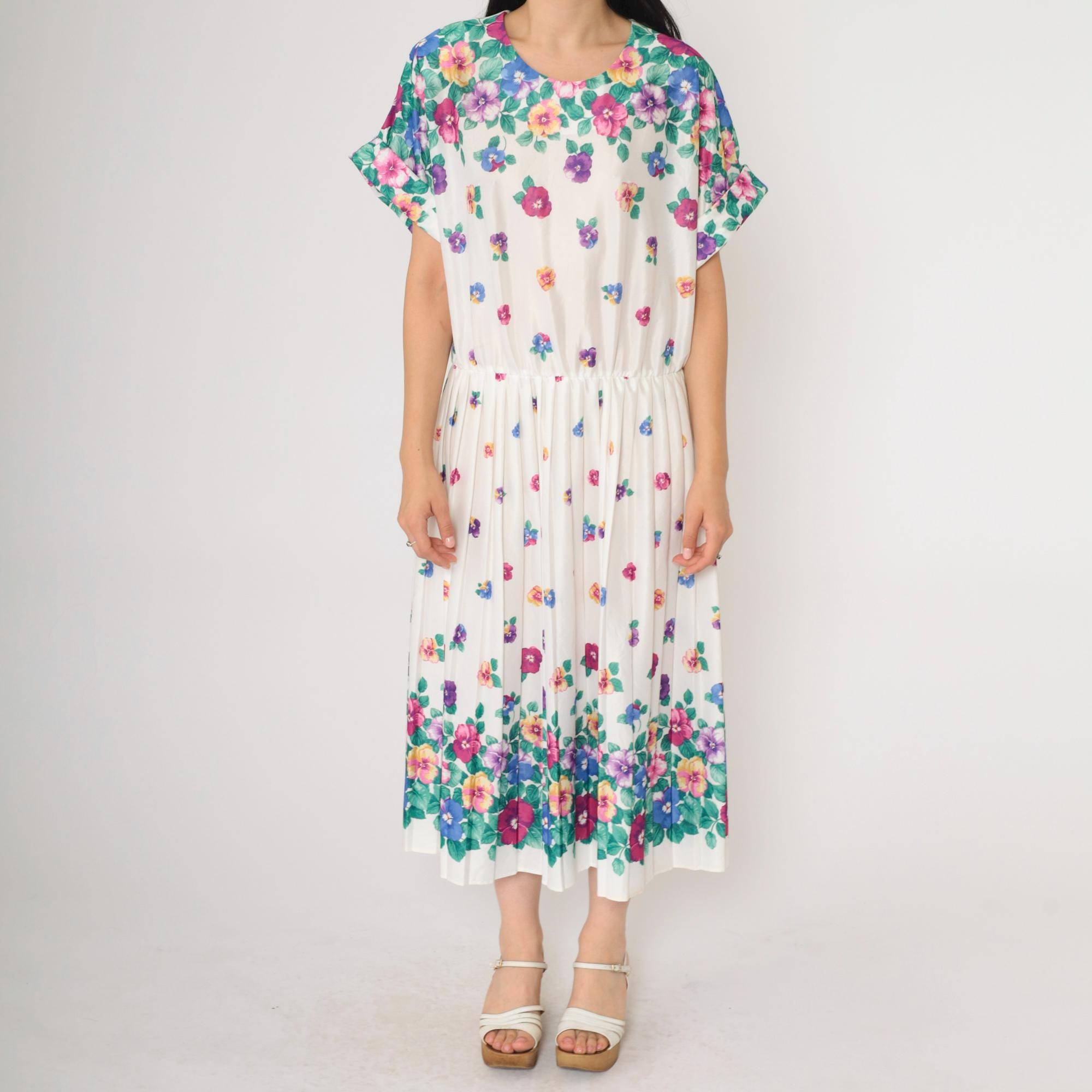 Vintage 80s dress in white with a multicolor floral print. High waisted with a pleated midi skirt and a slouchy fit.