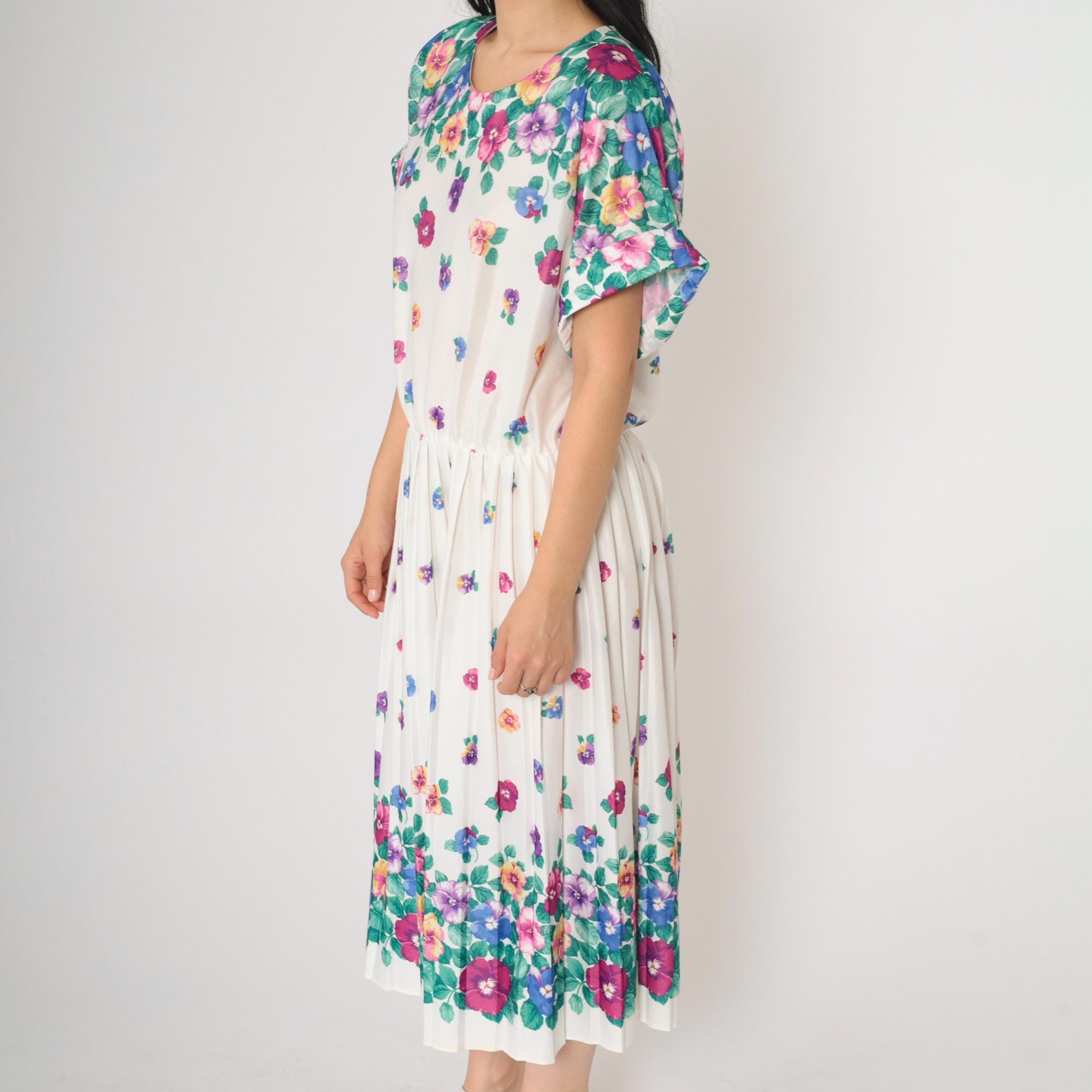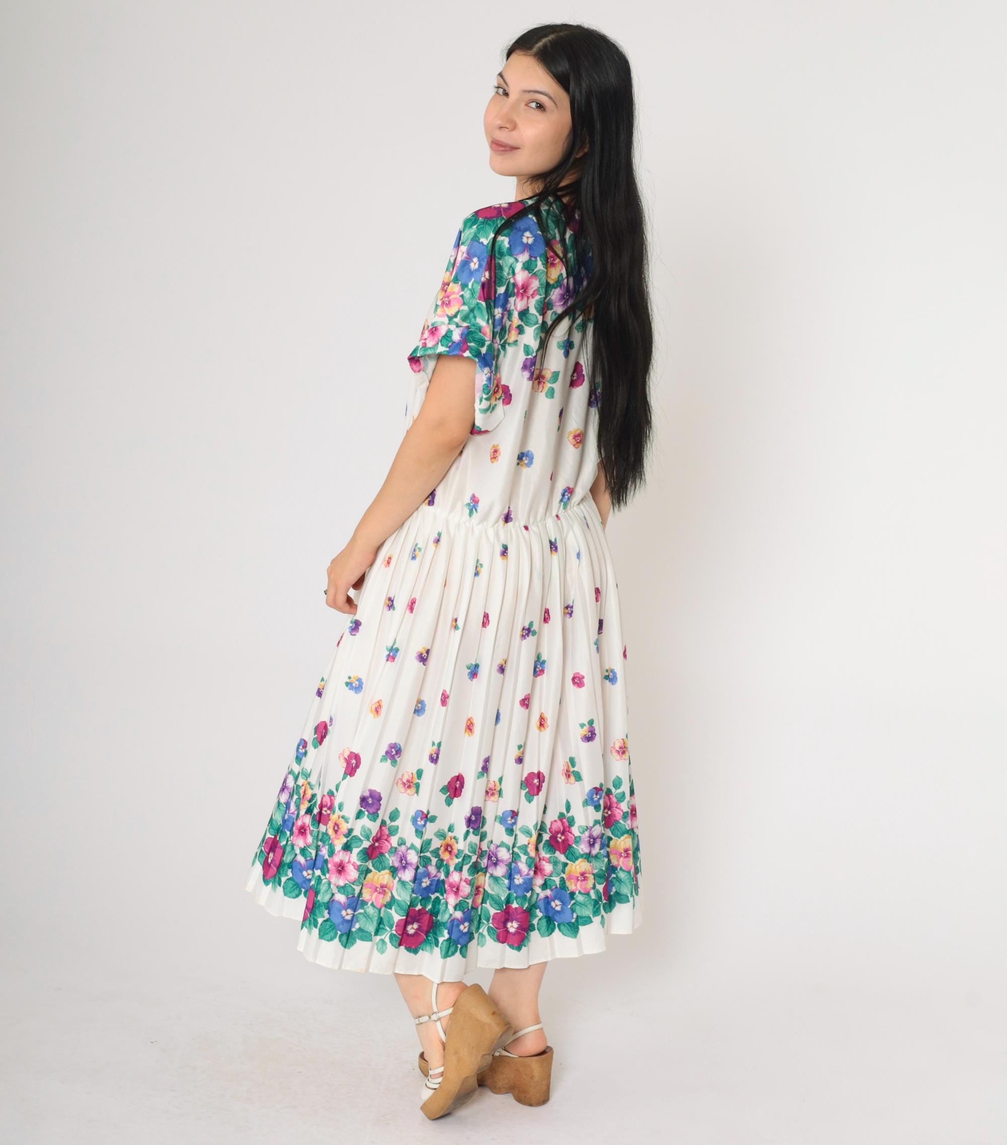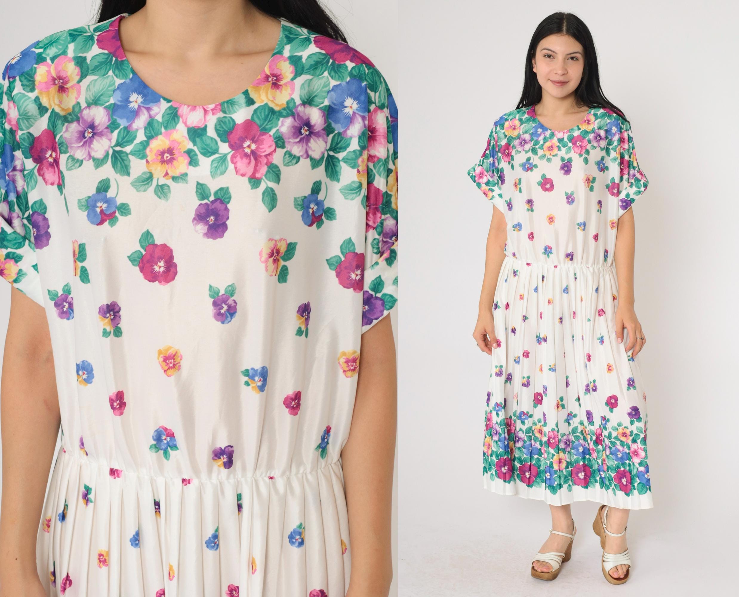 Vintage 80s dress in white with a multicolor floral print. High waisted with a pleated midi skirt and a slouchy fit.