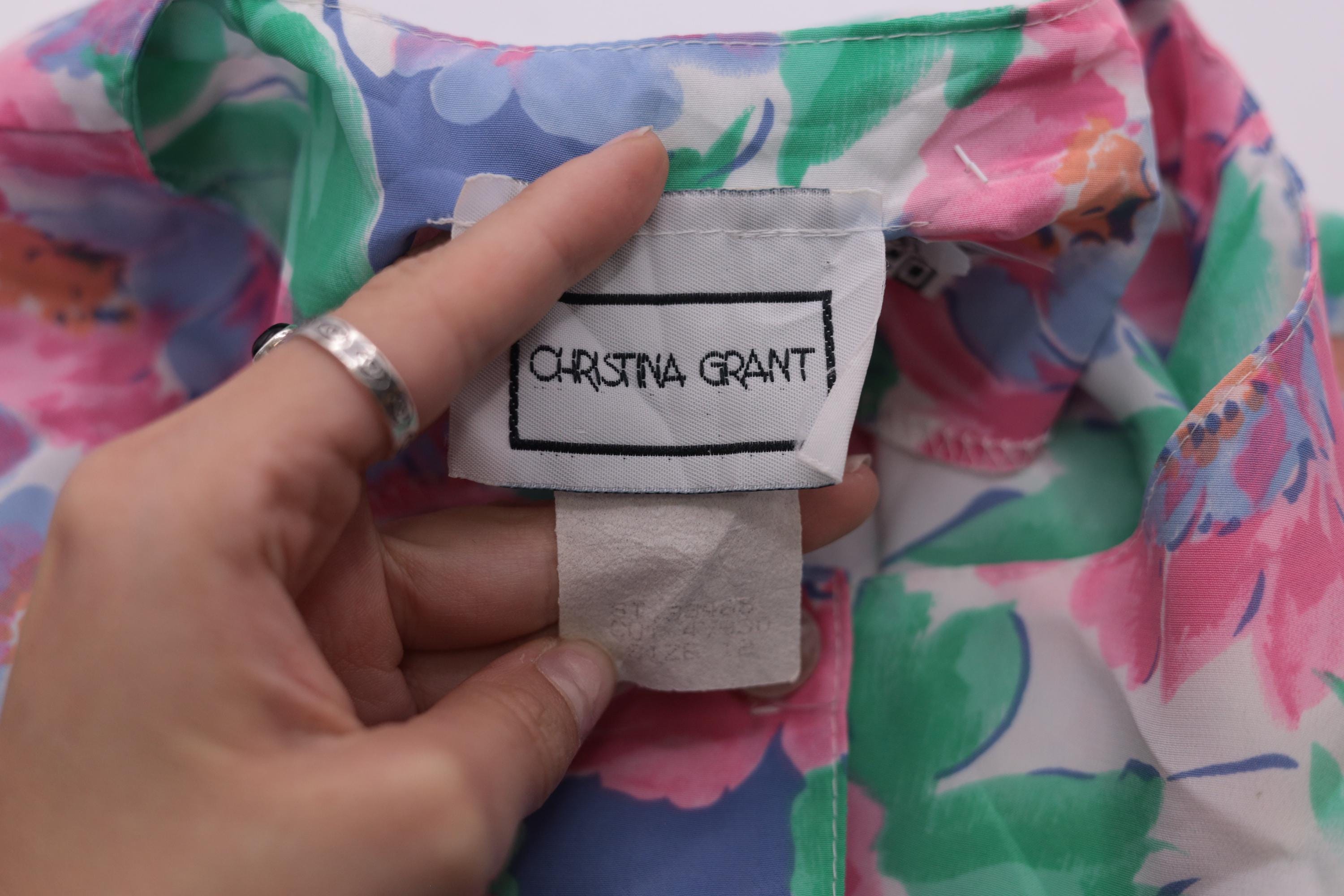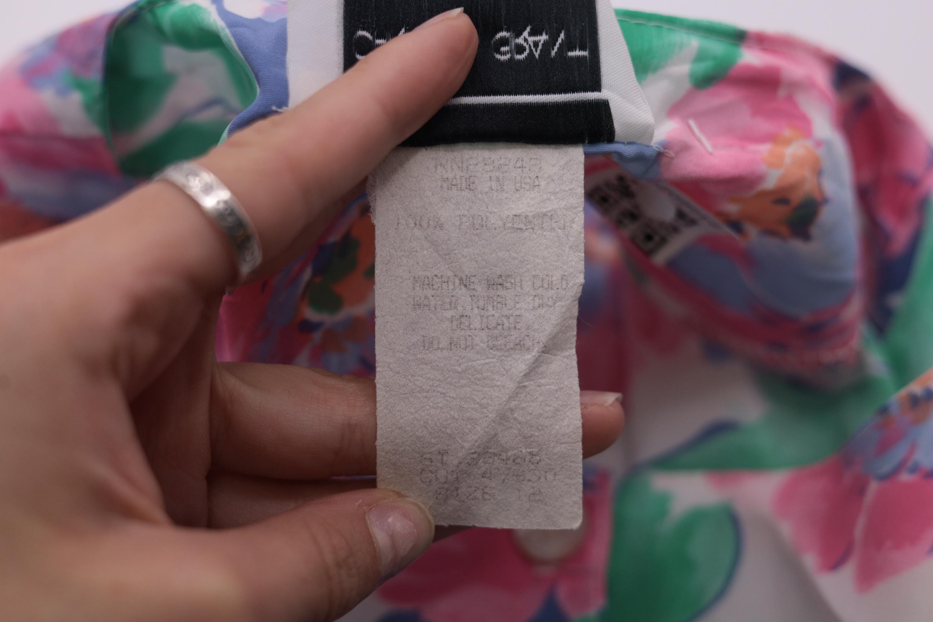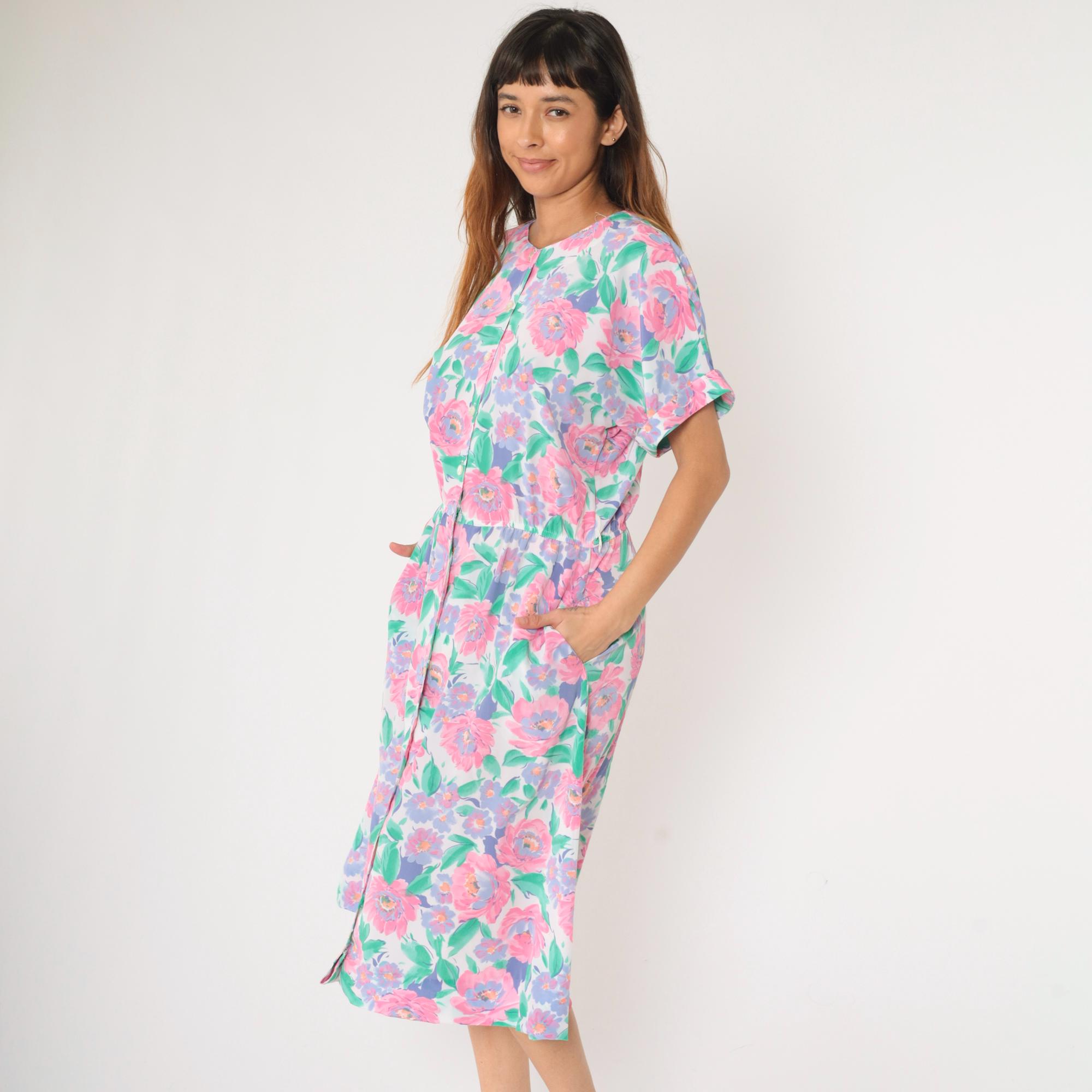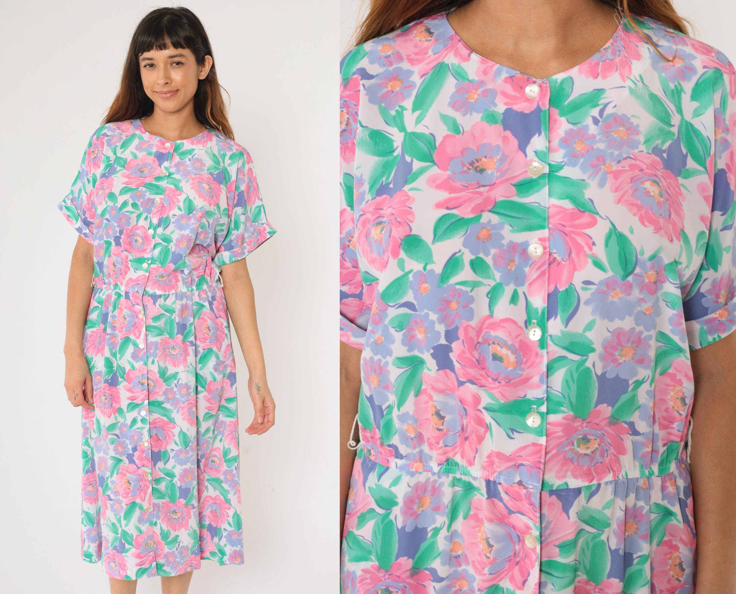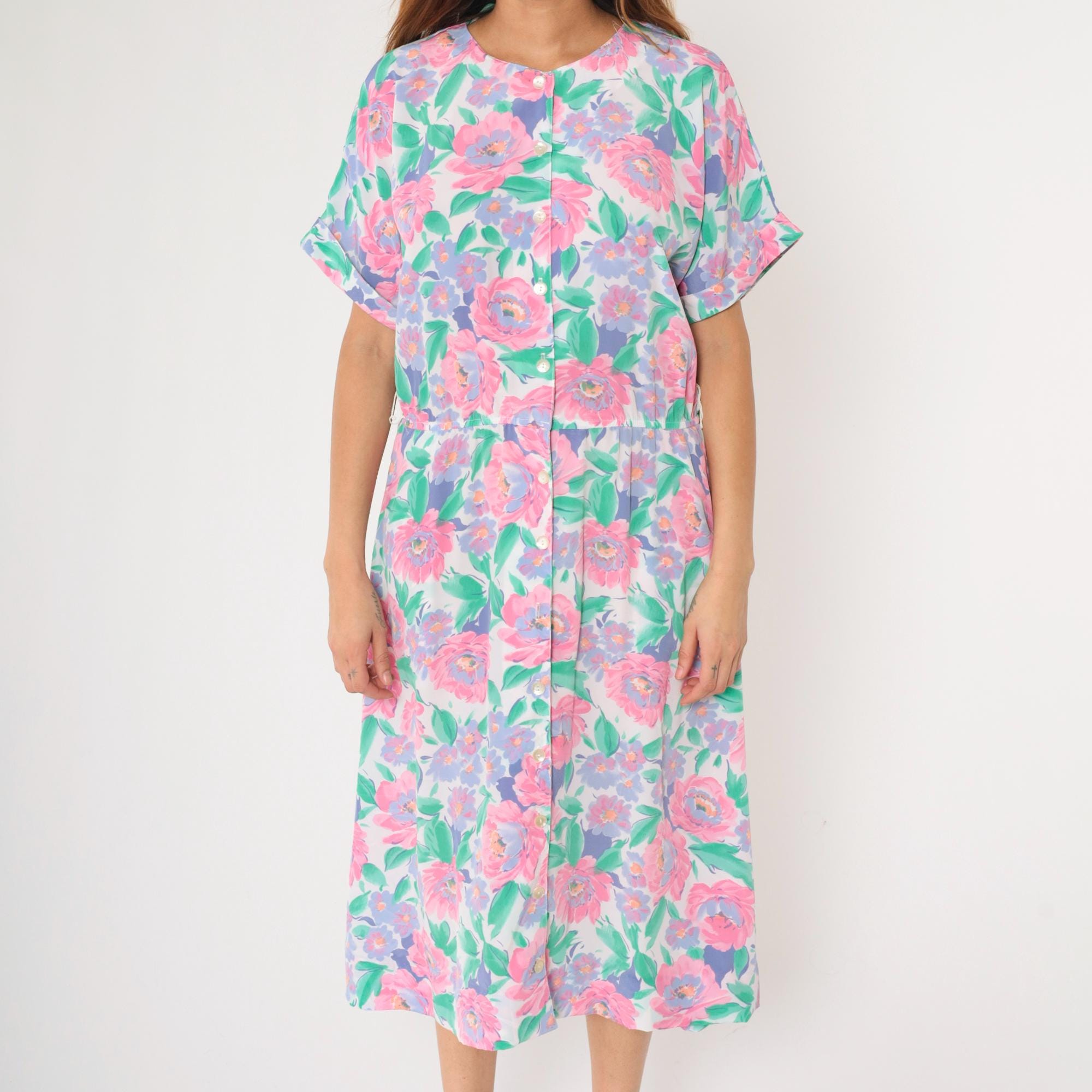 Vintage 80s dress in a pink, purple and green floral print. It features short sleeves and buttons up the front. Midi length.