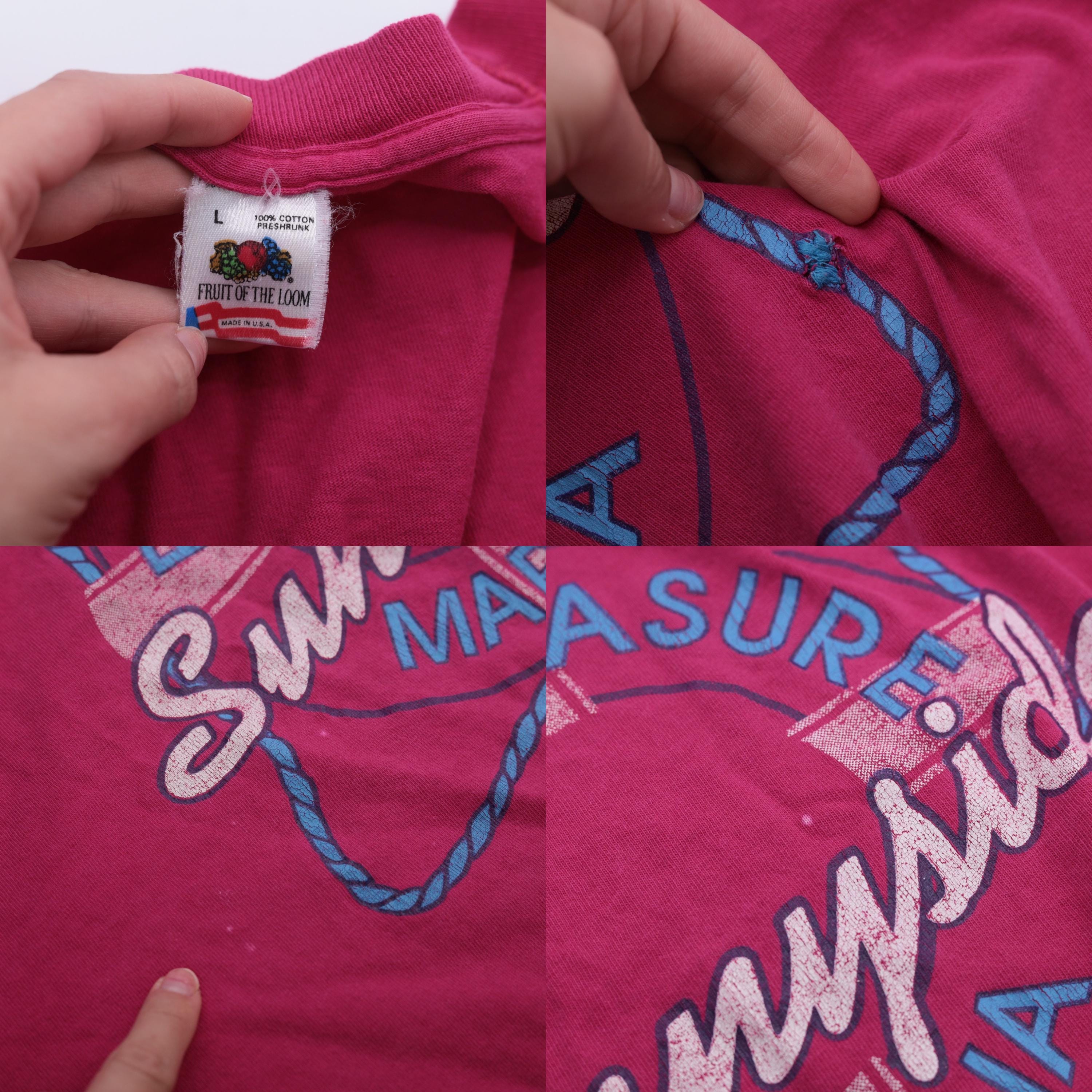 Vintage 90s t shirt with a Pier Pleasure Sunnyside Marina graphic. It features a crewneck and short sleeves. Distressed.