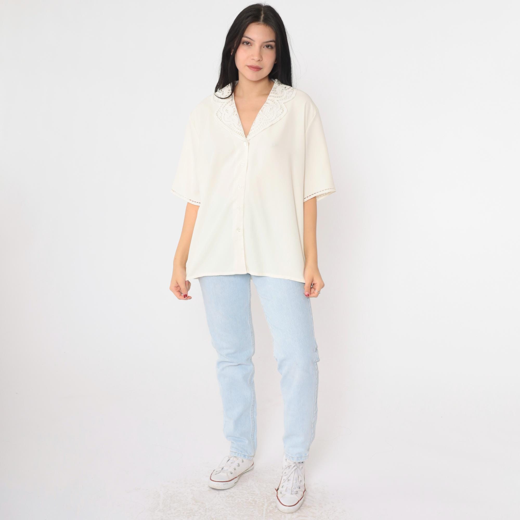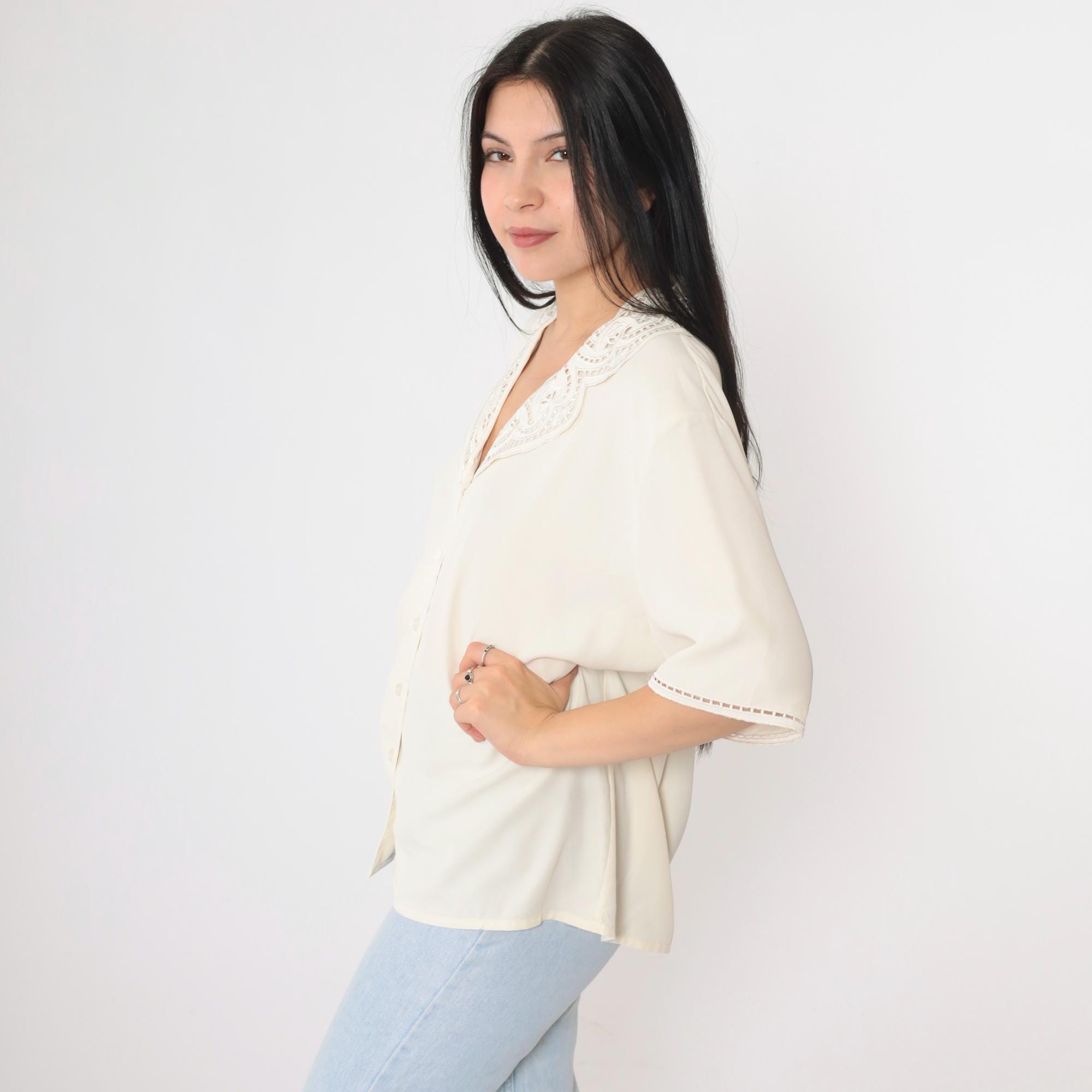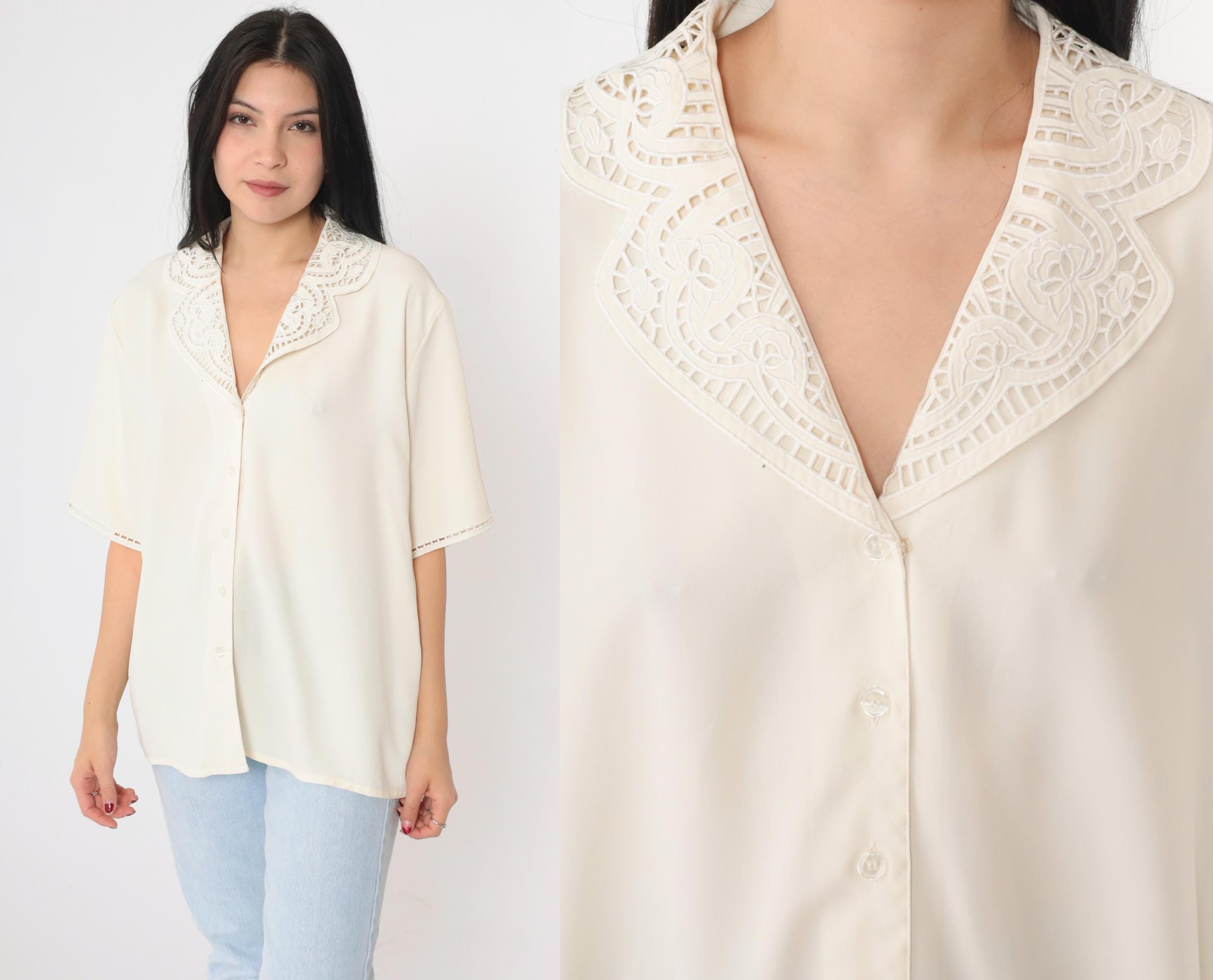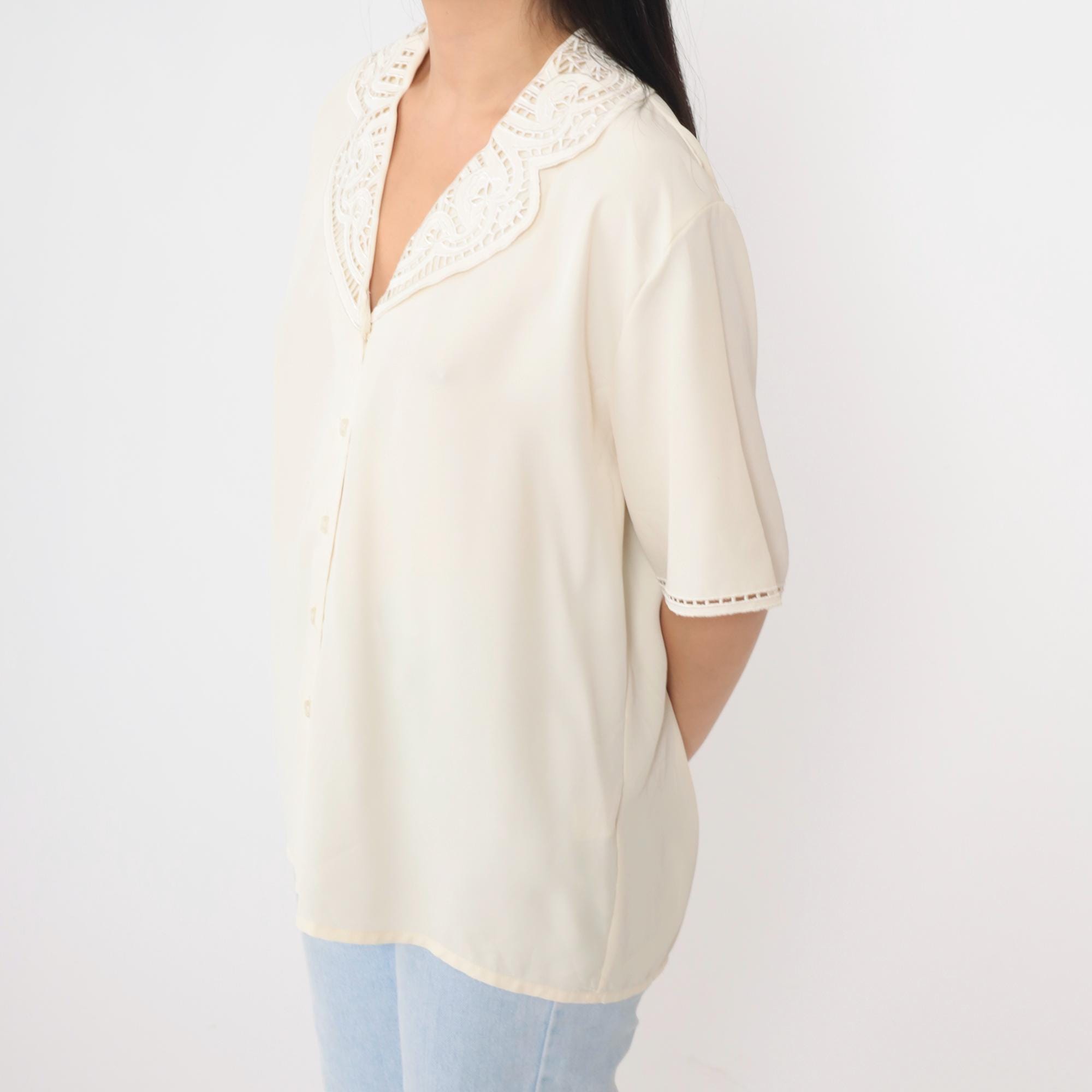 Vintage 90s blouse in off-white with cutwork and floral embroidery. Buttons up the front with short sleeves.