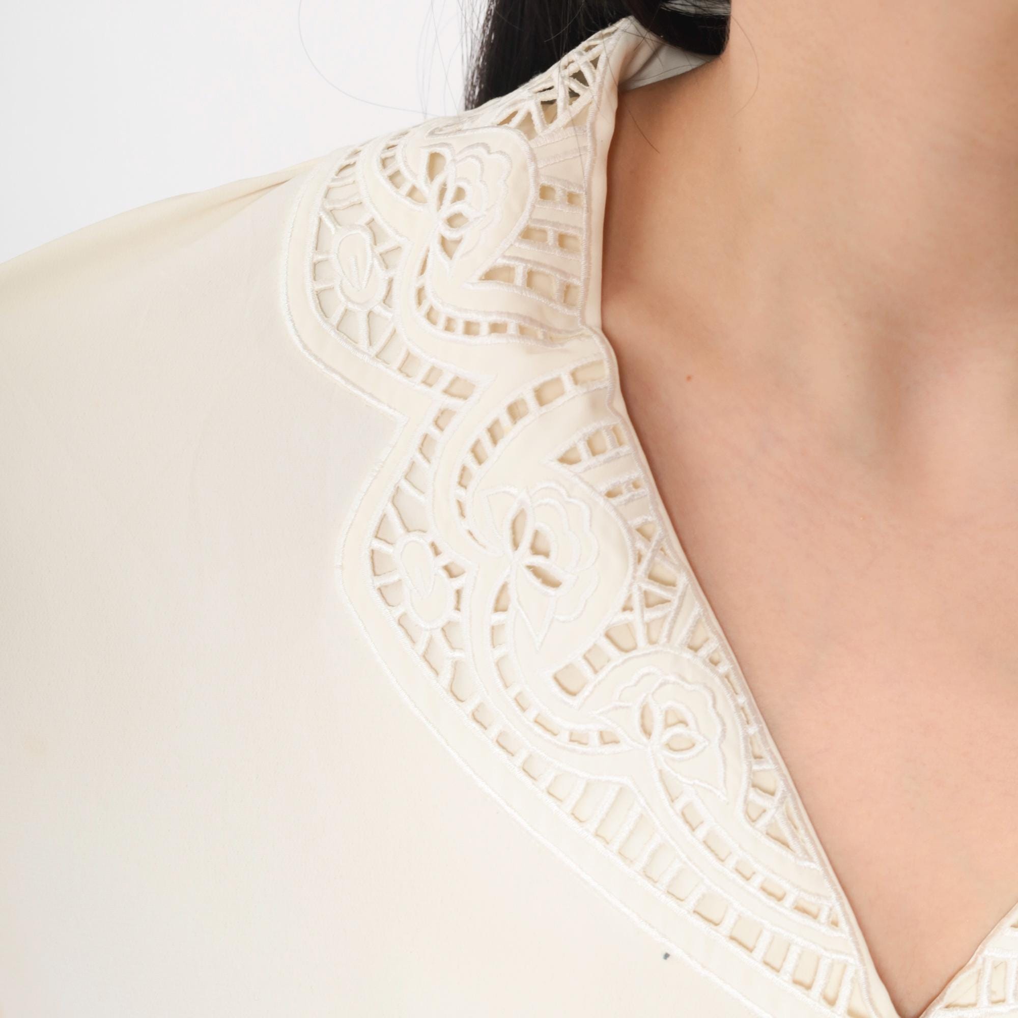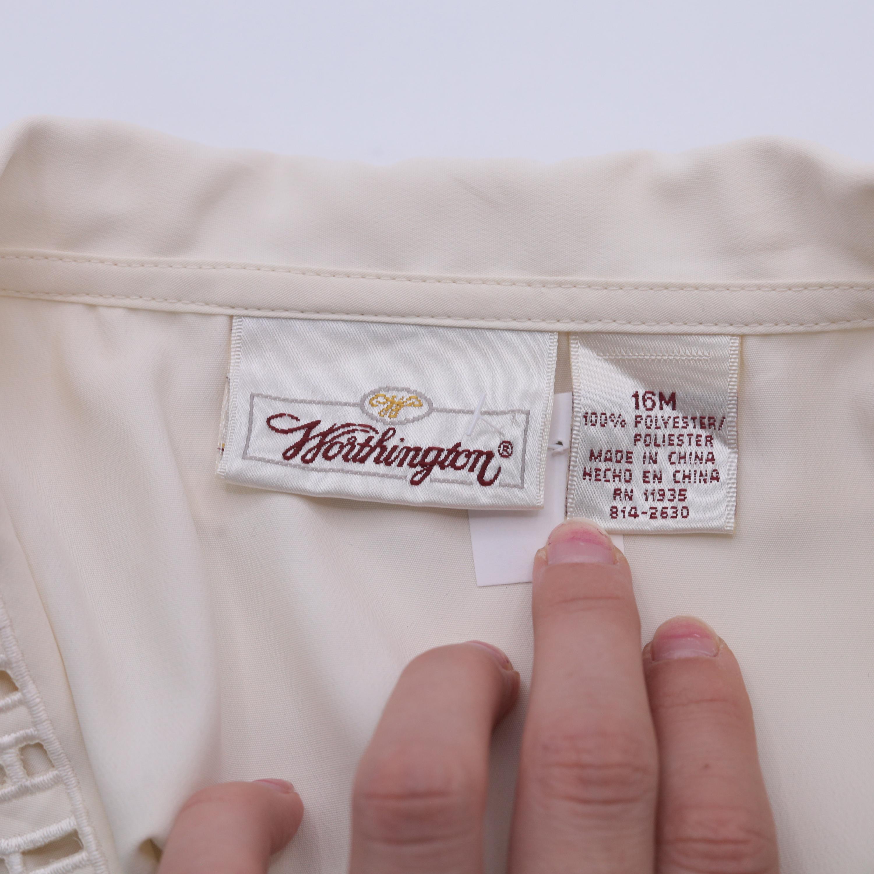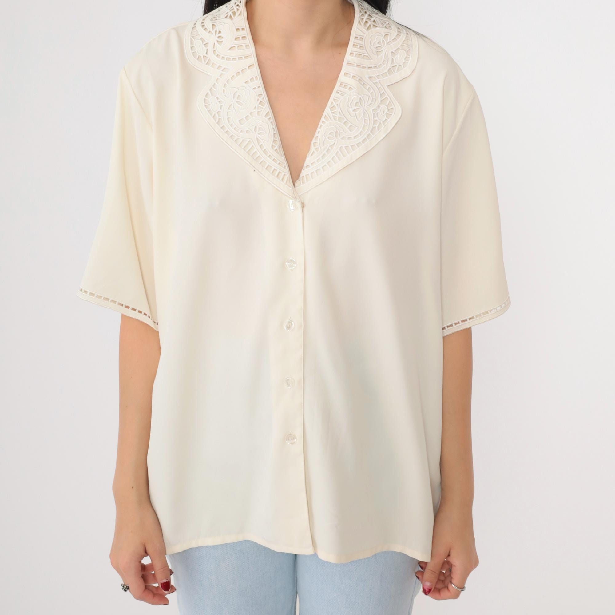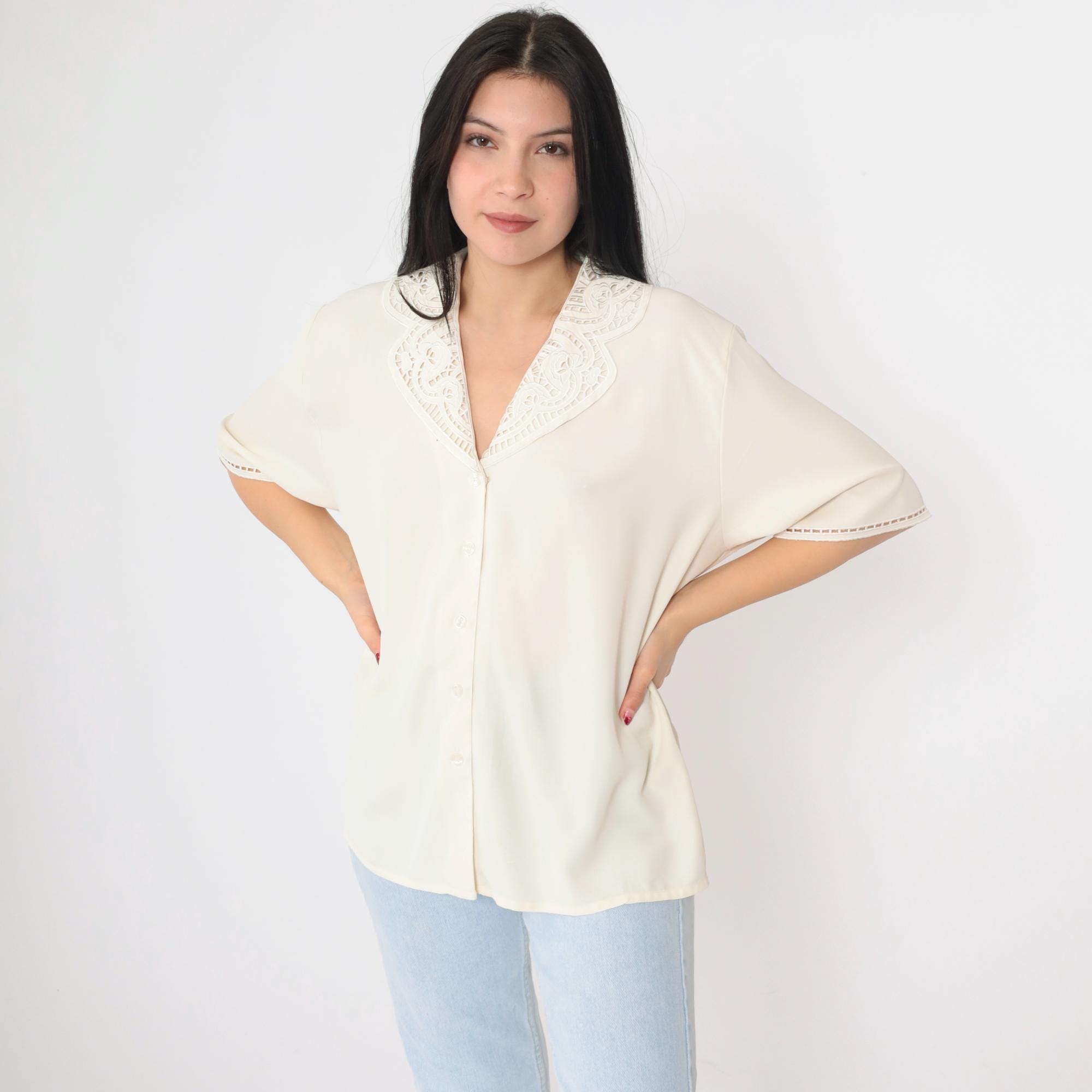Vintage 90s blouse in off-white with cutwork and floral embroidery. Buttons up the front with short sleeves.