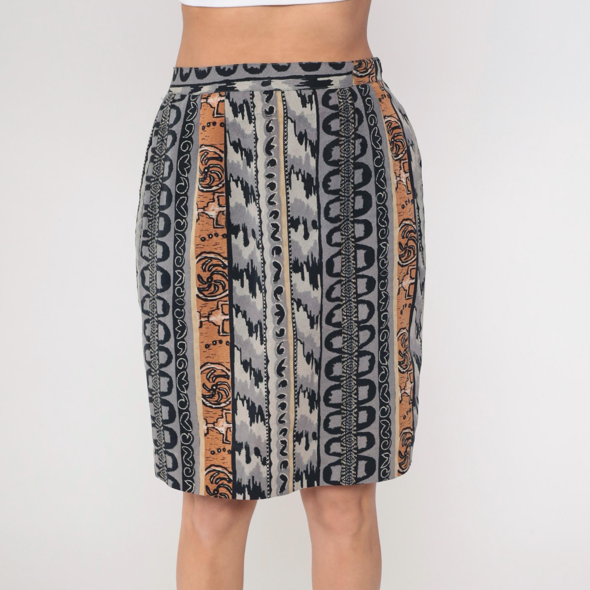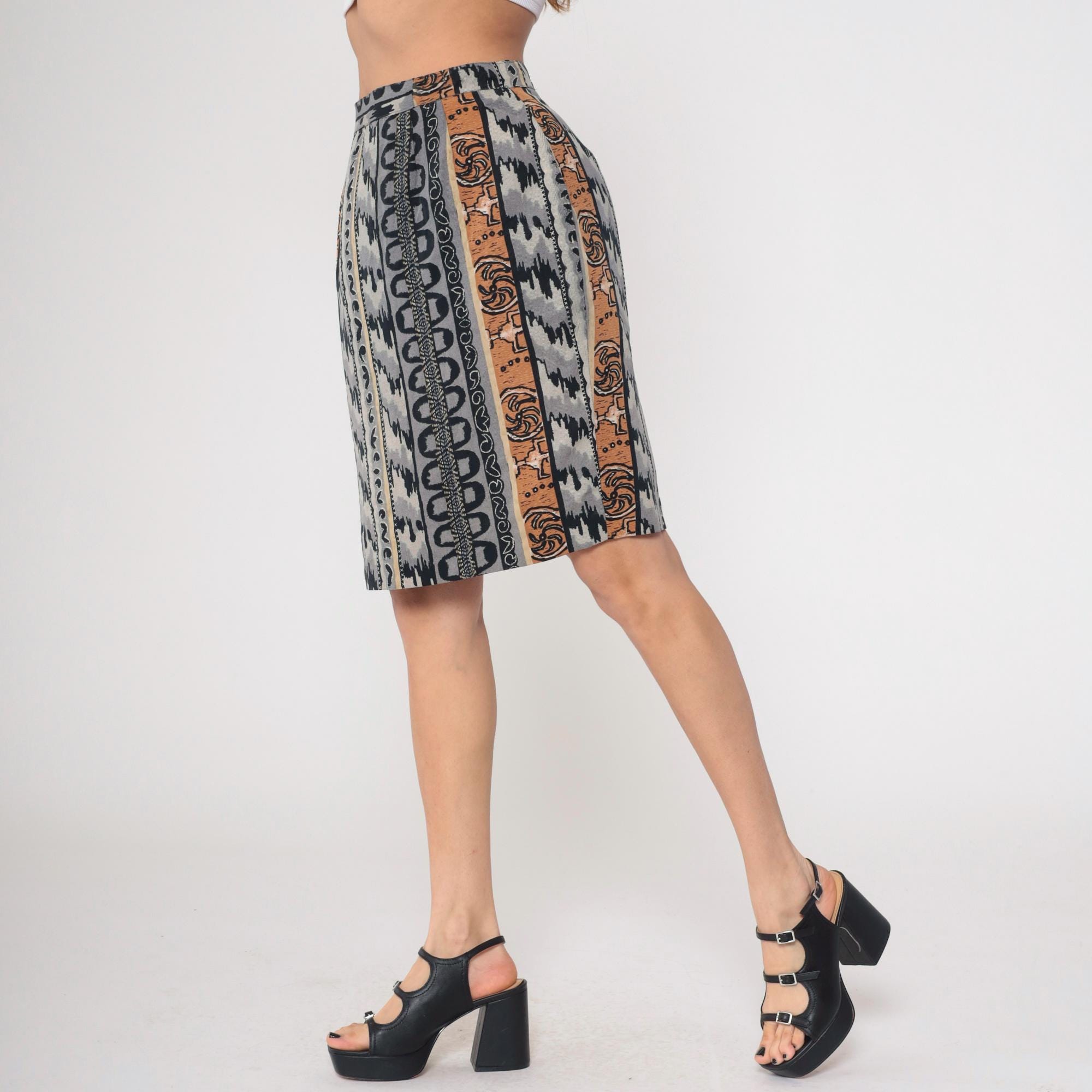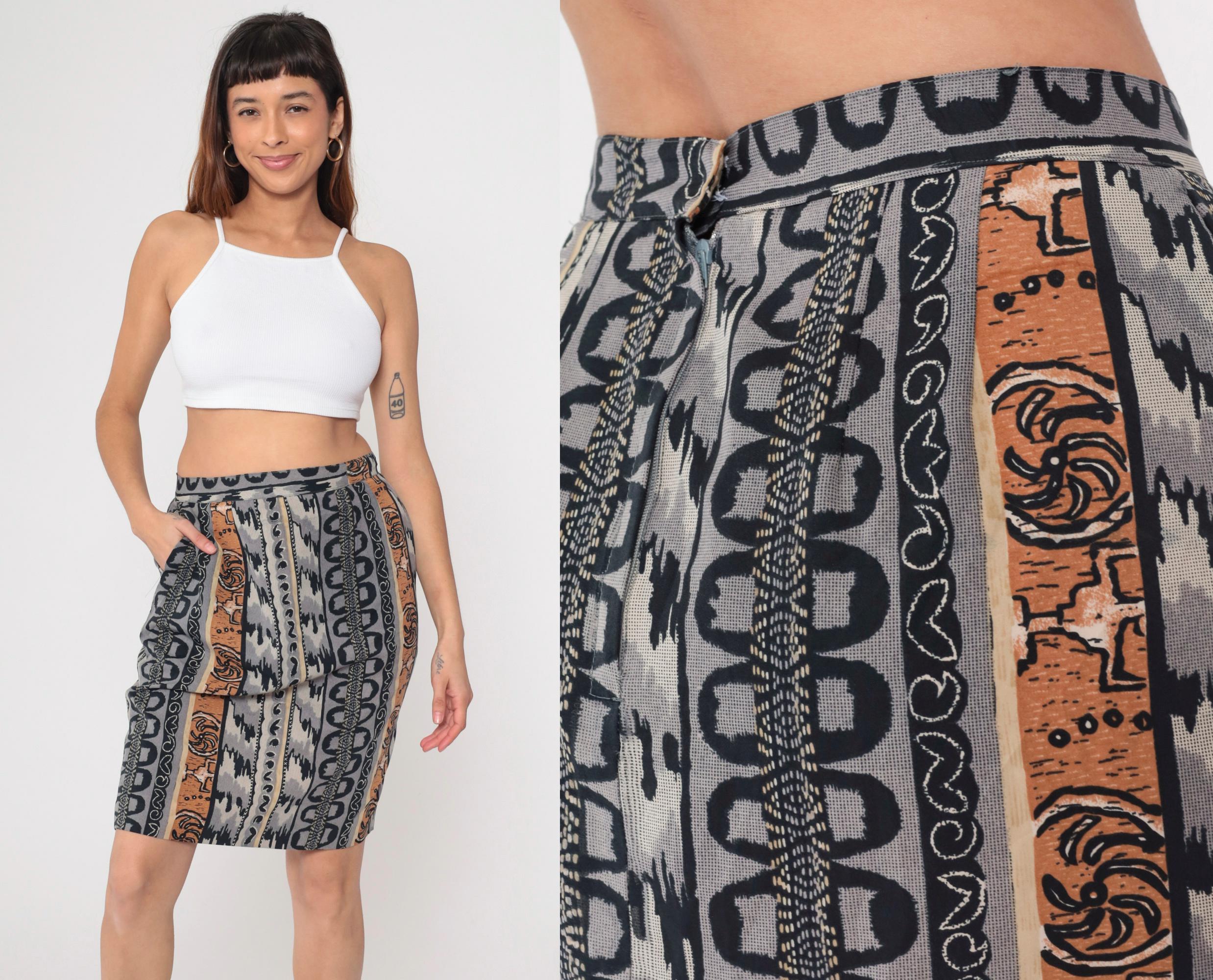 Vintage 90s high-waisted mini skirt featuring geometric and stripe patterns in black, grey, tan, and beige tones. This pencil skirt has a fitted silhouette with a zip at the back.
