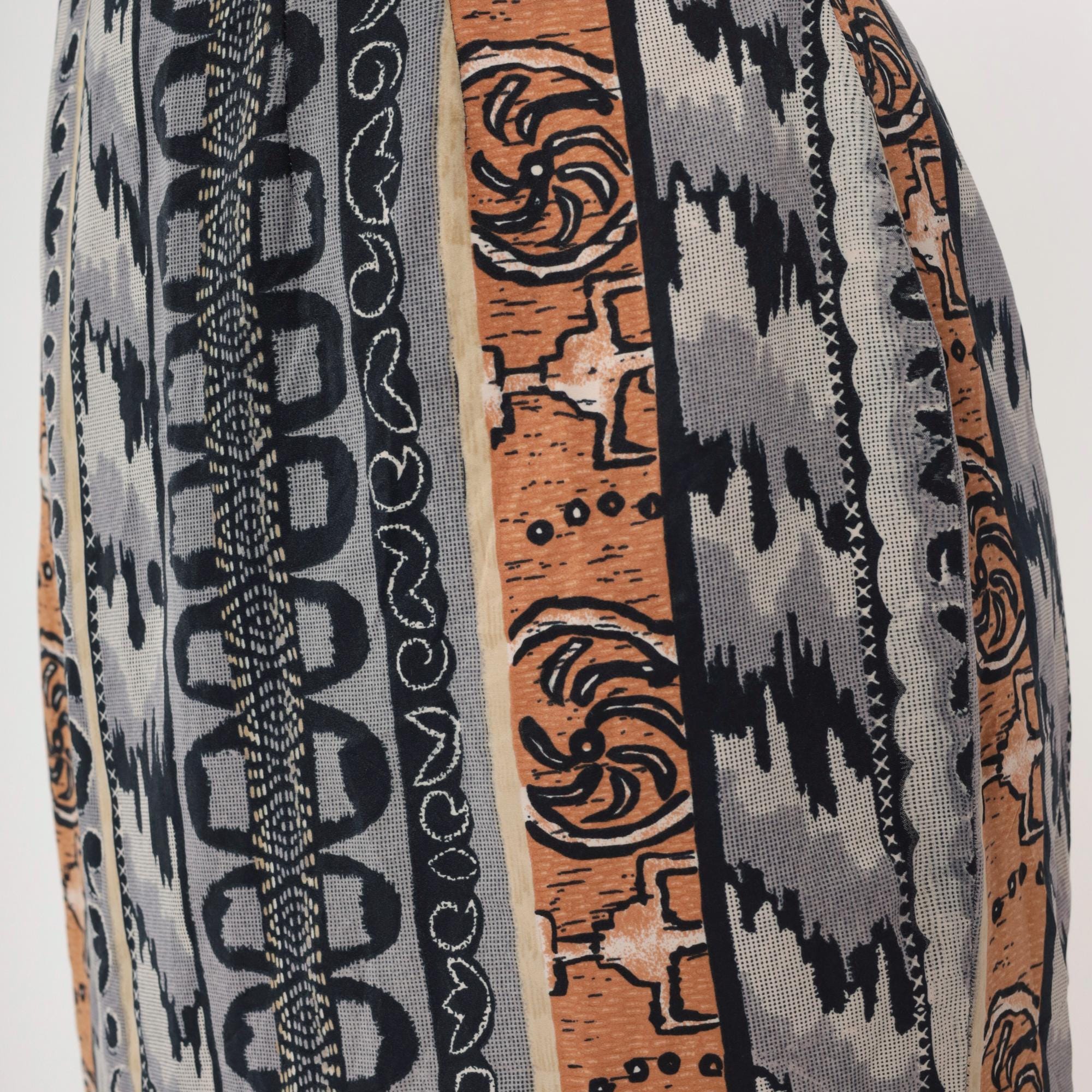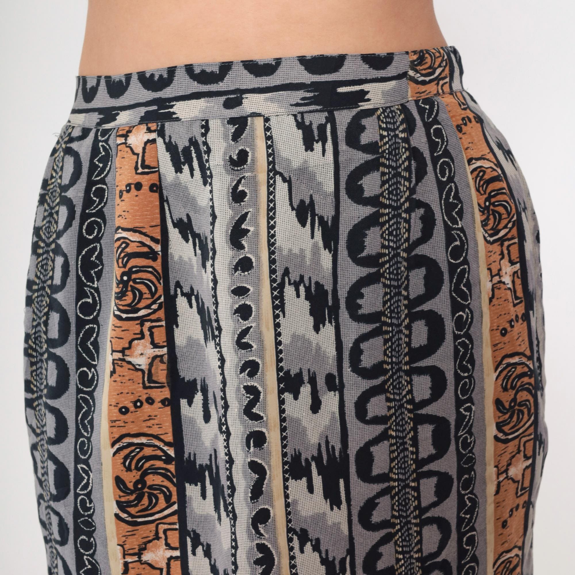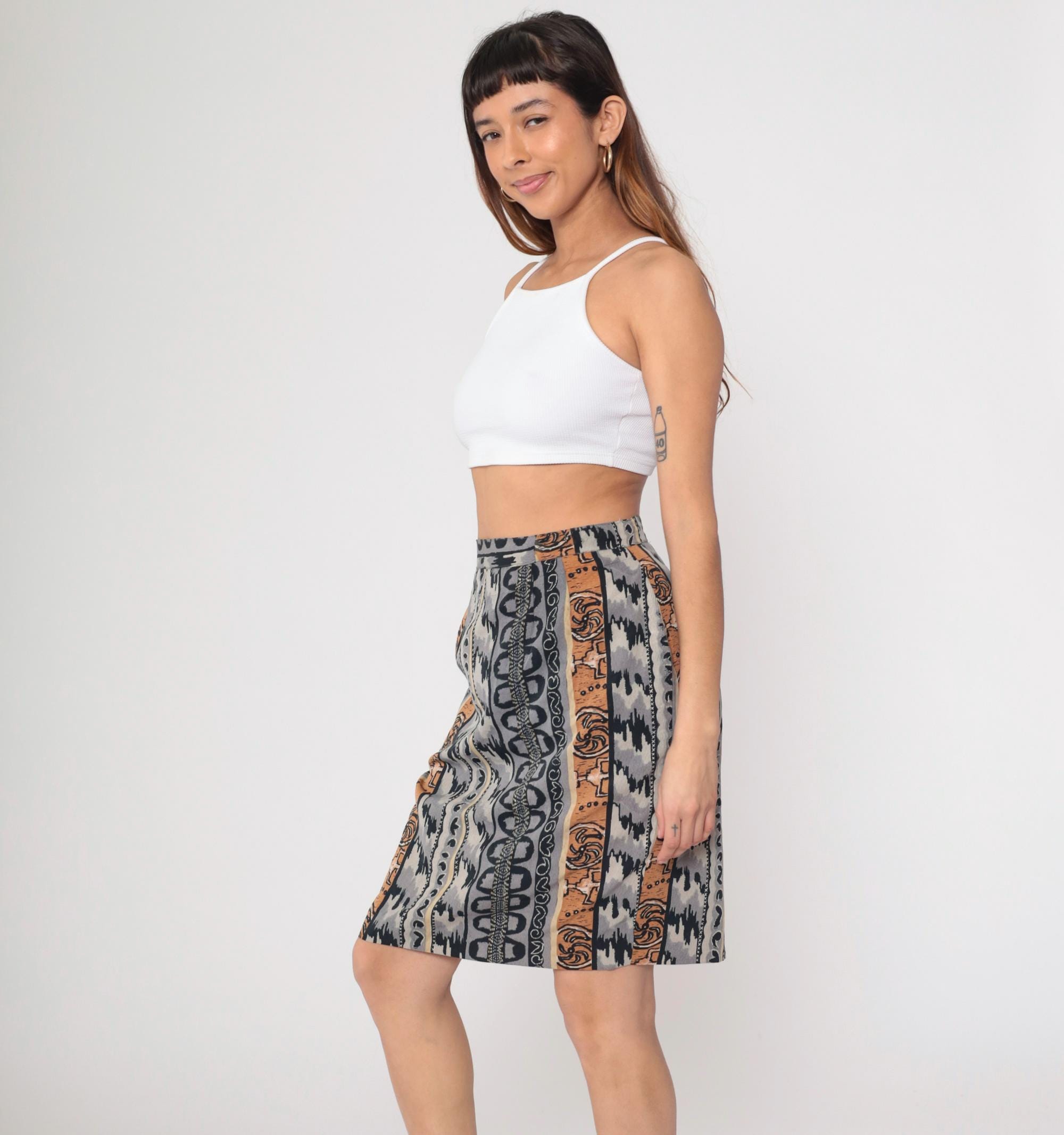 Vintage 90s high-waisted mini skirt featuring geometric and stripe patterns in black, grey, tan, and beige tones. This pencil skirt has a fitted silhouette with a zip at the back.