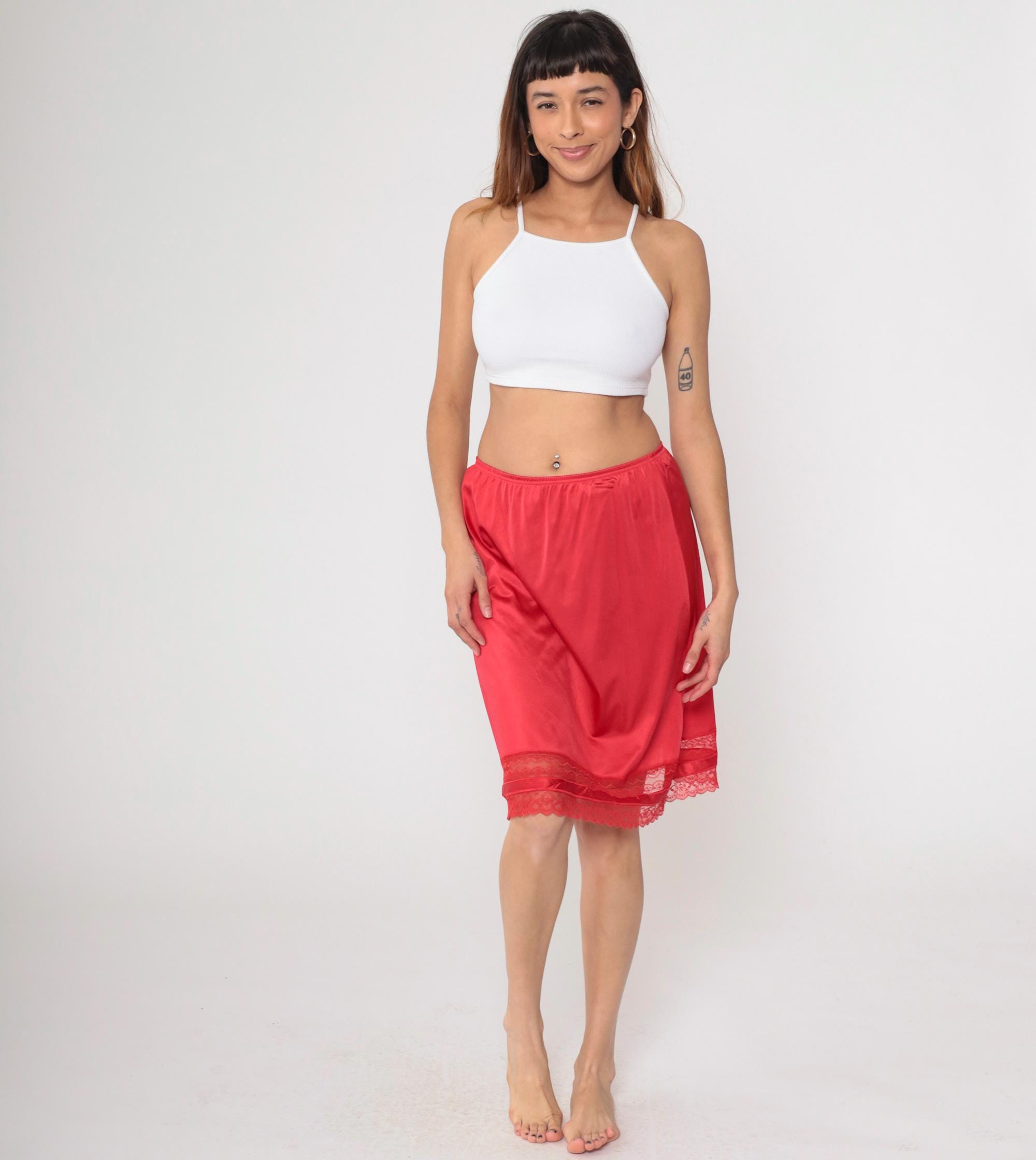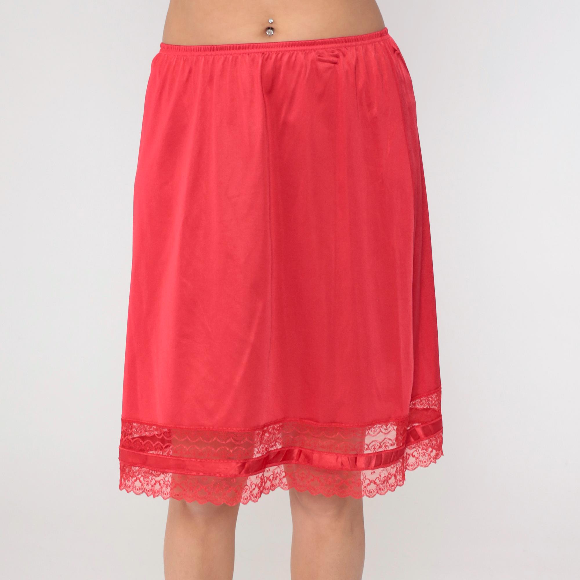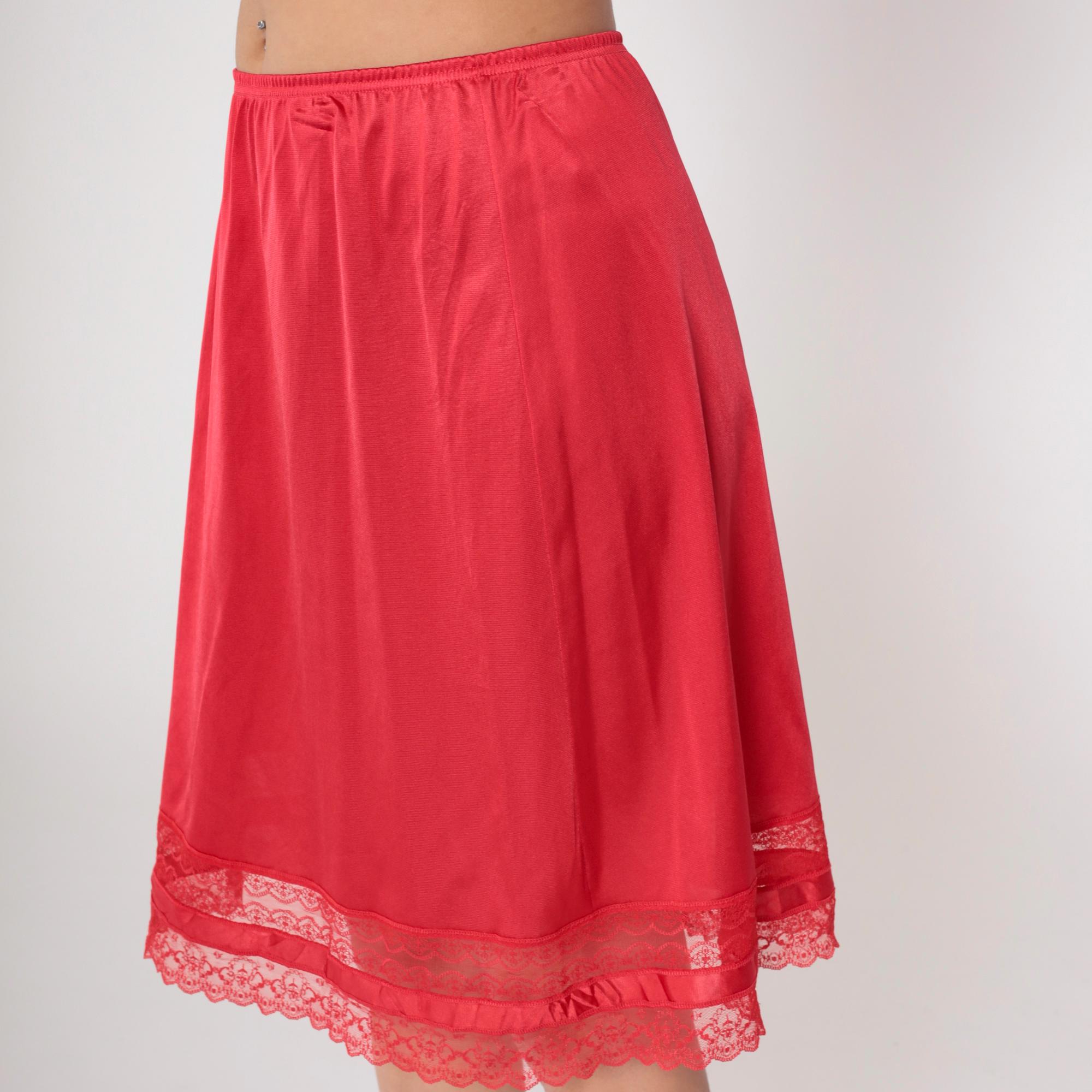 Vintage 80s lingerie slip skirt in red with lace trim. High waisted, knee length.