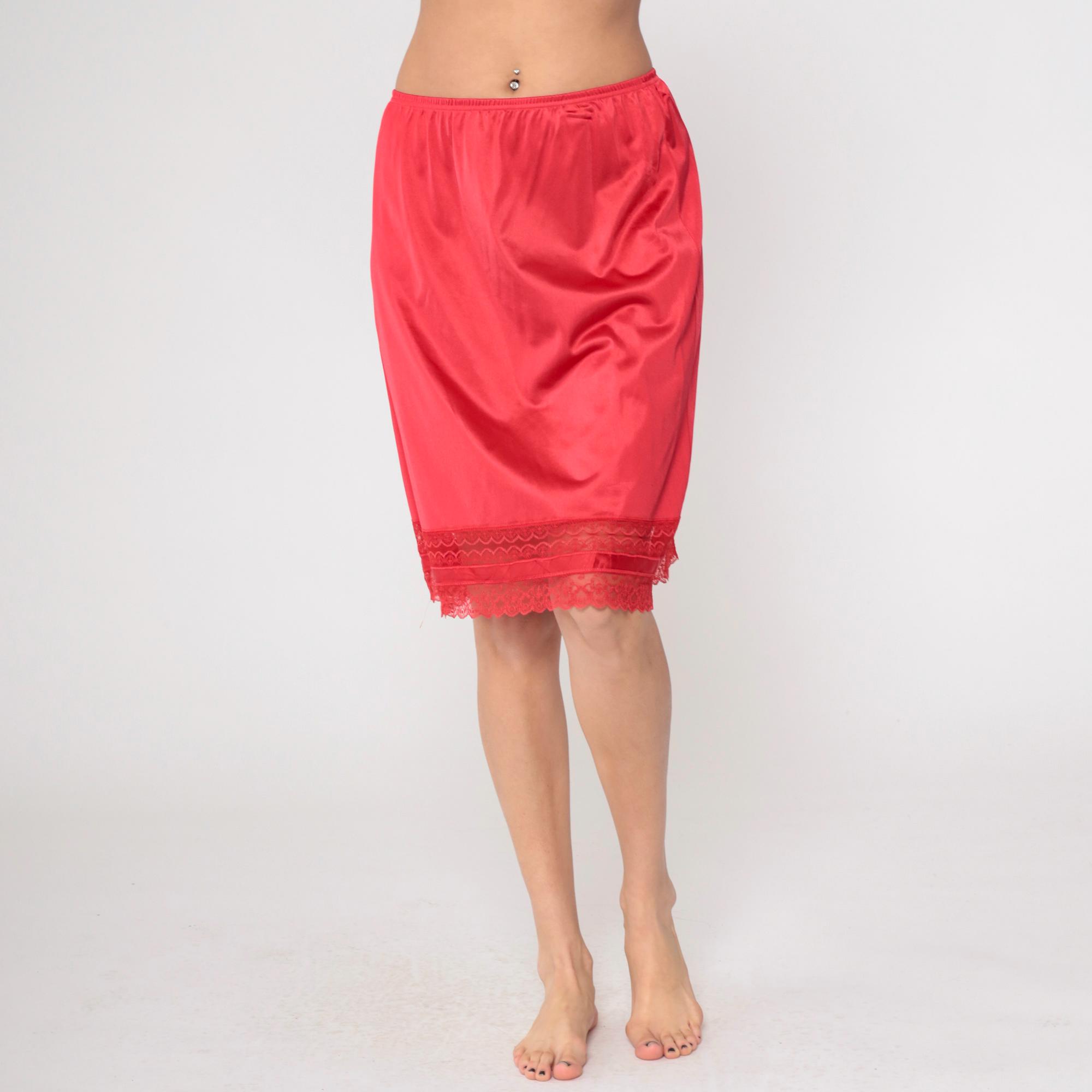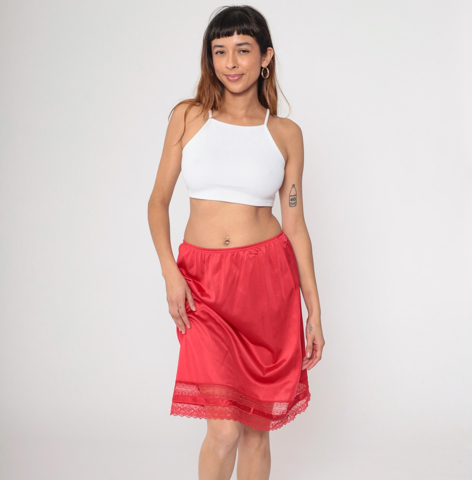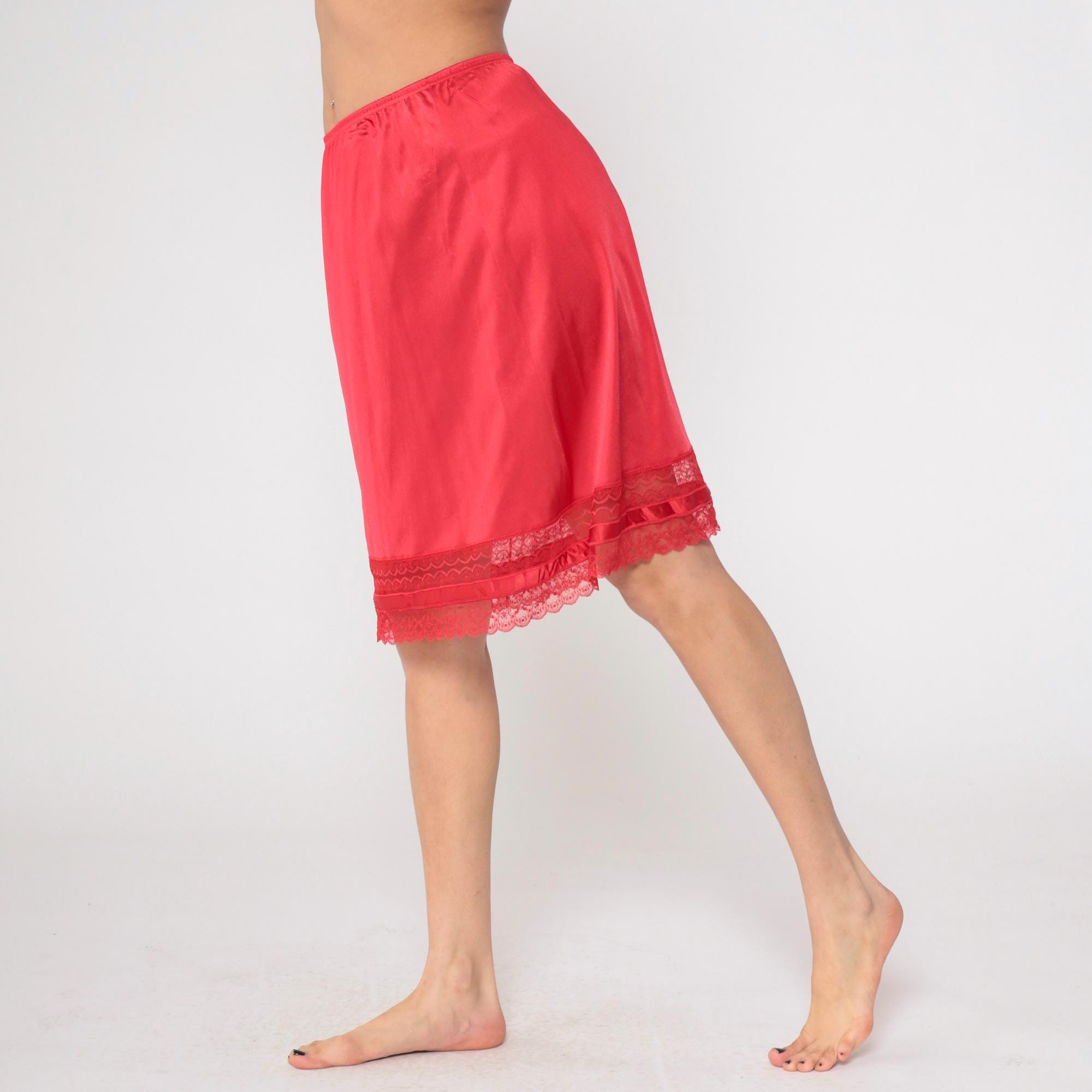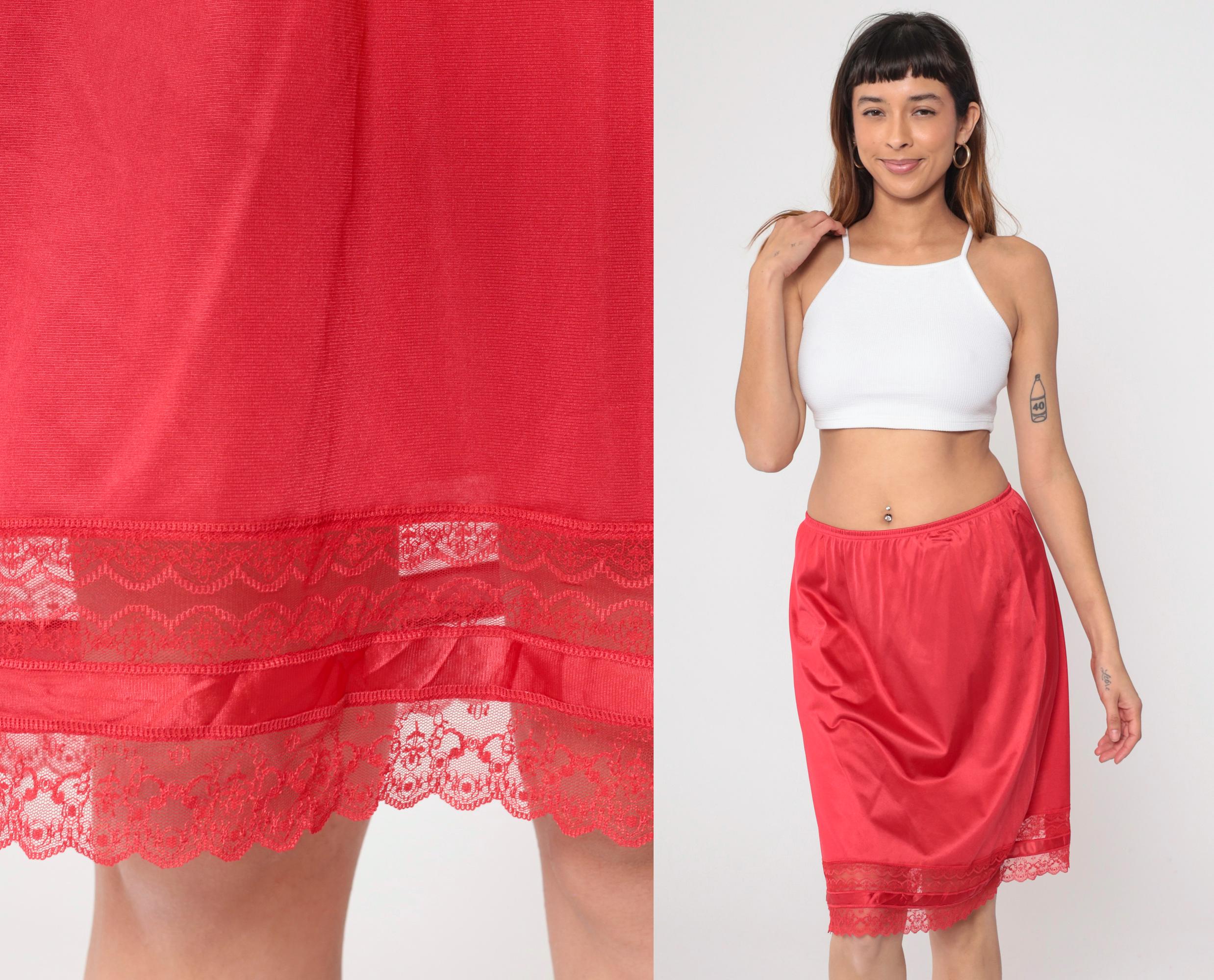 Vintage 80s lingerie slip skirt in red with lace trim. High waisted, knee length.