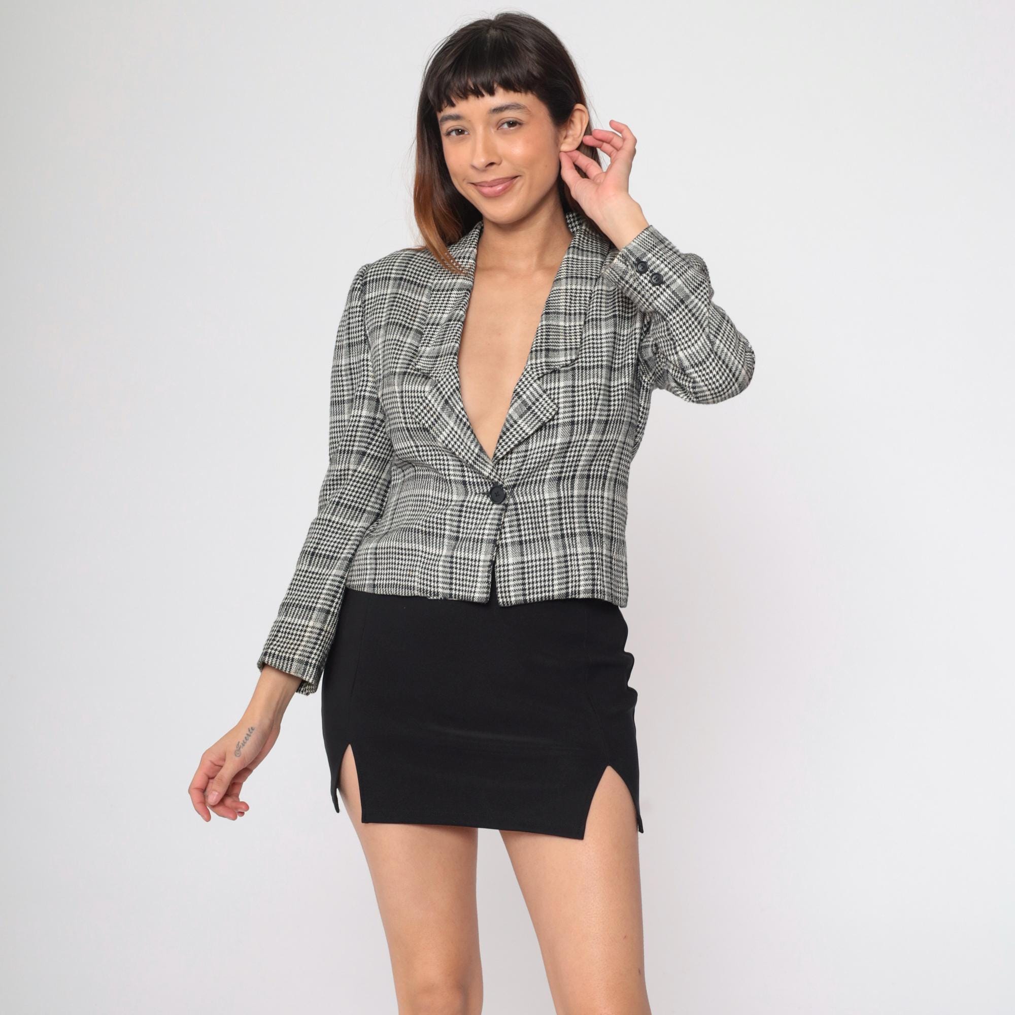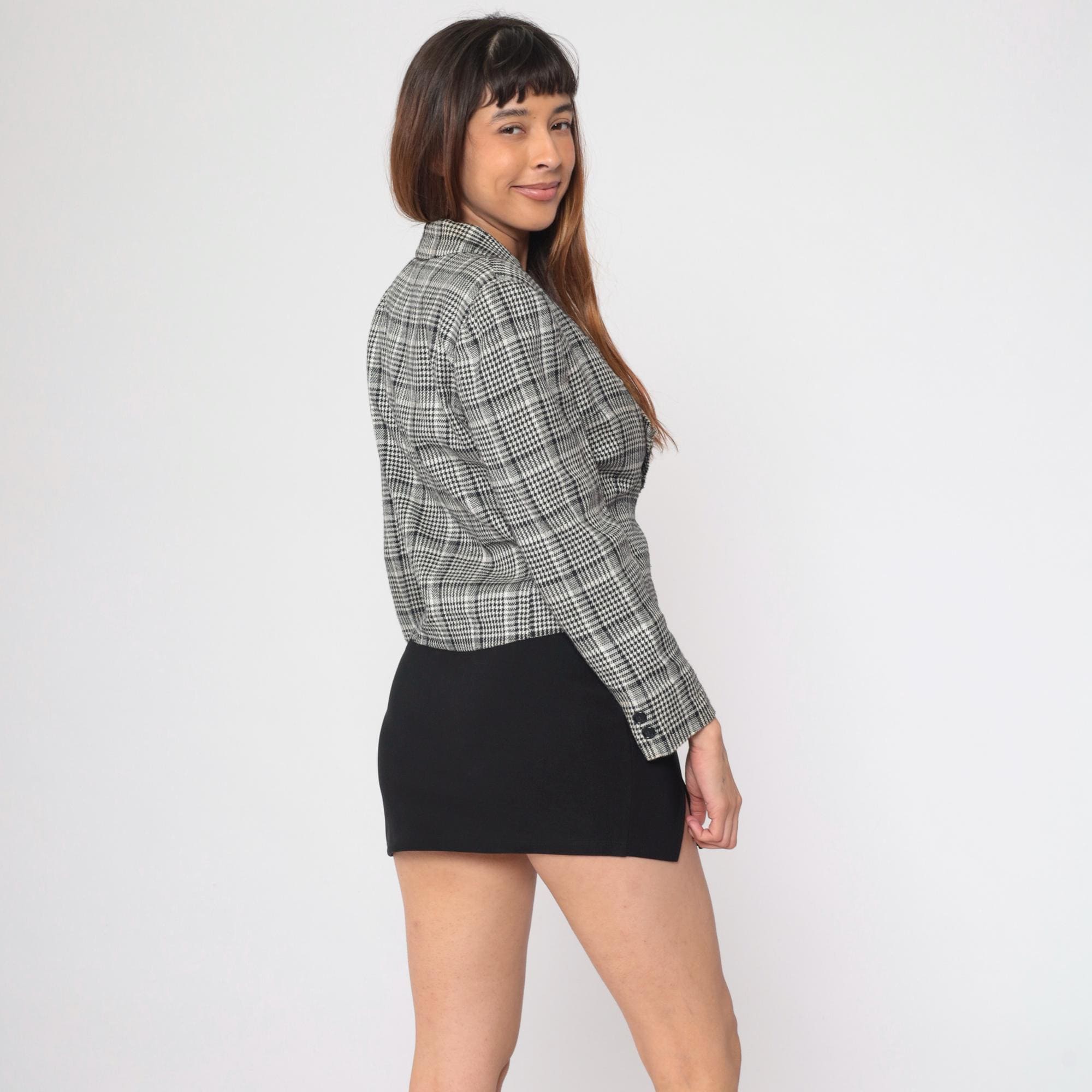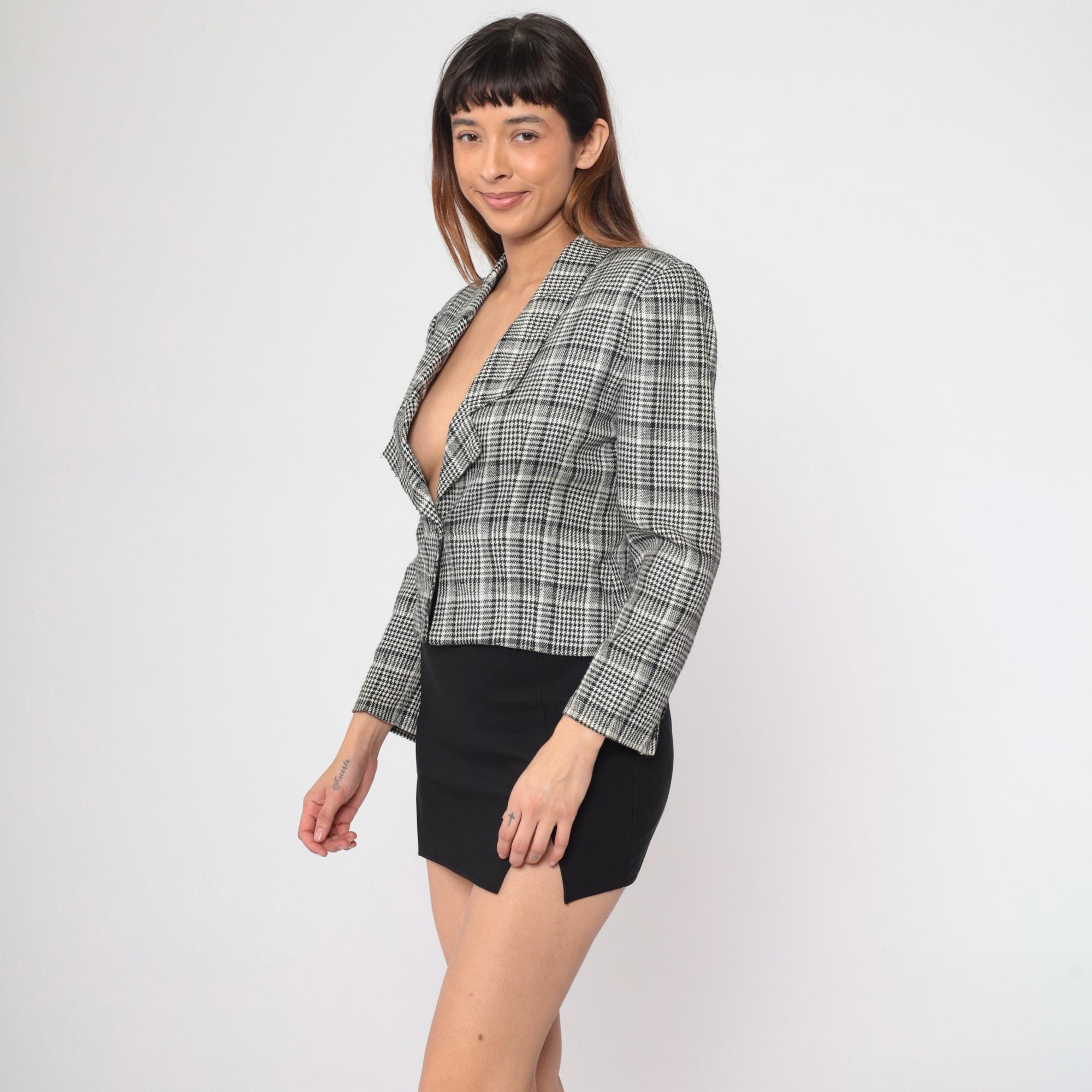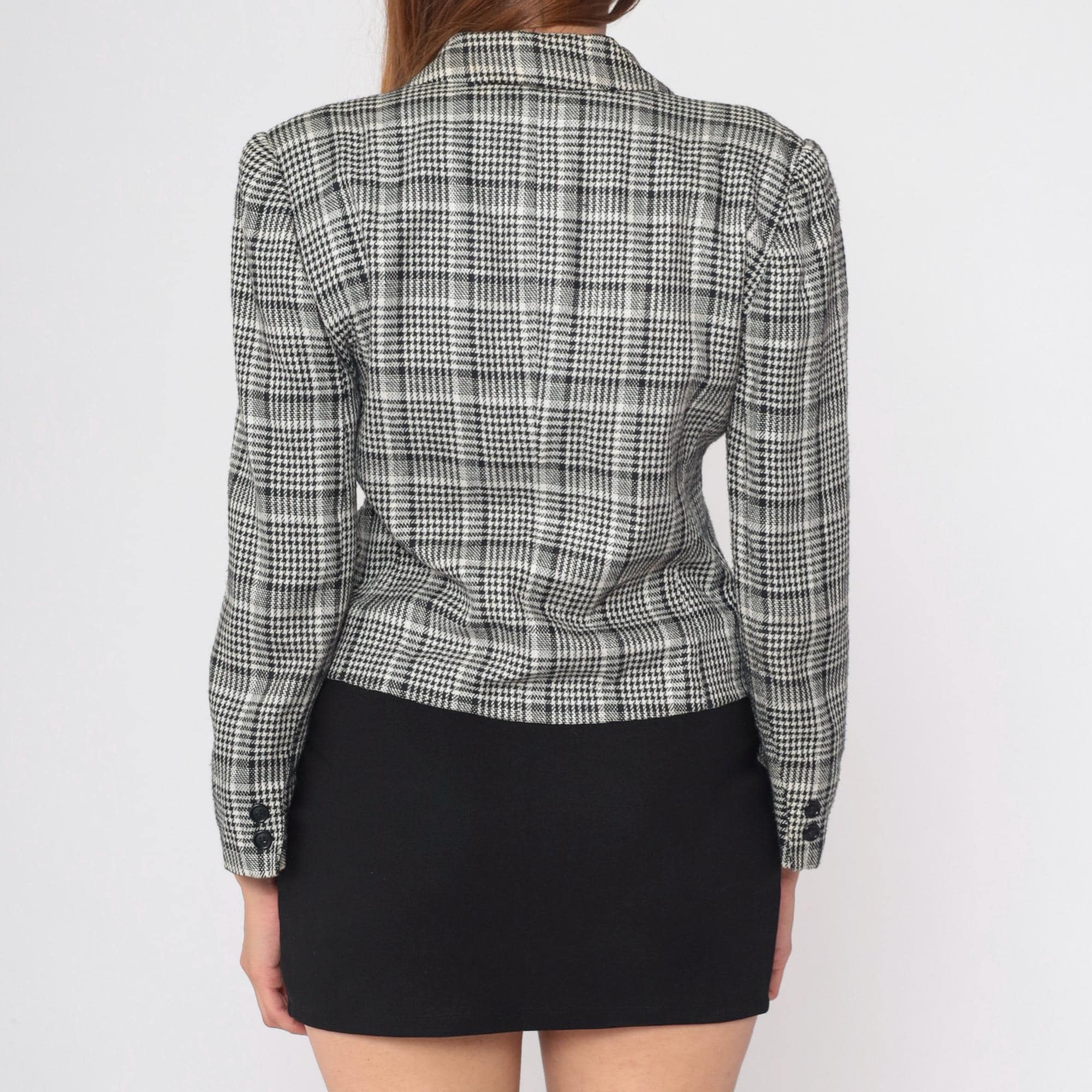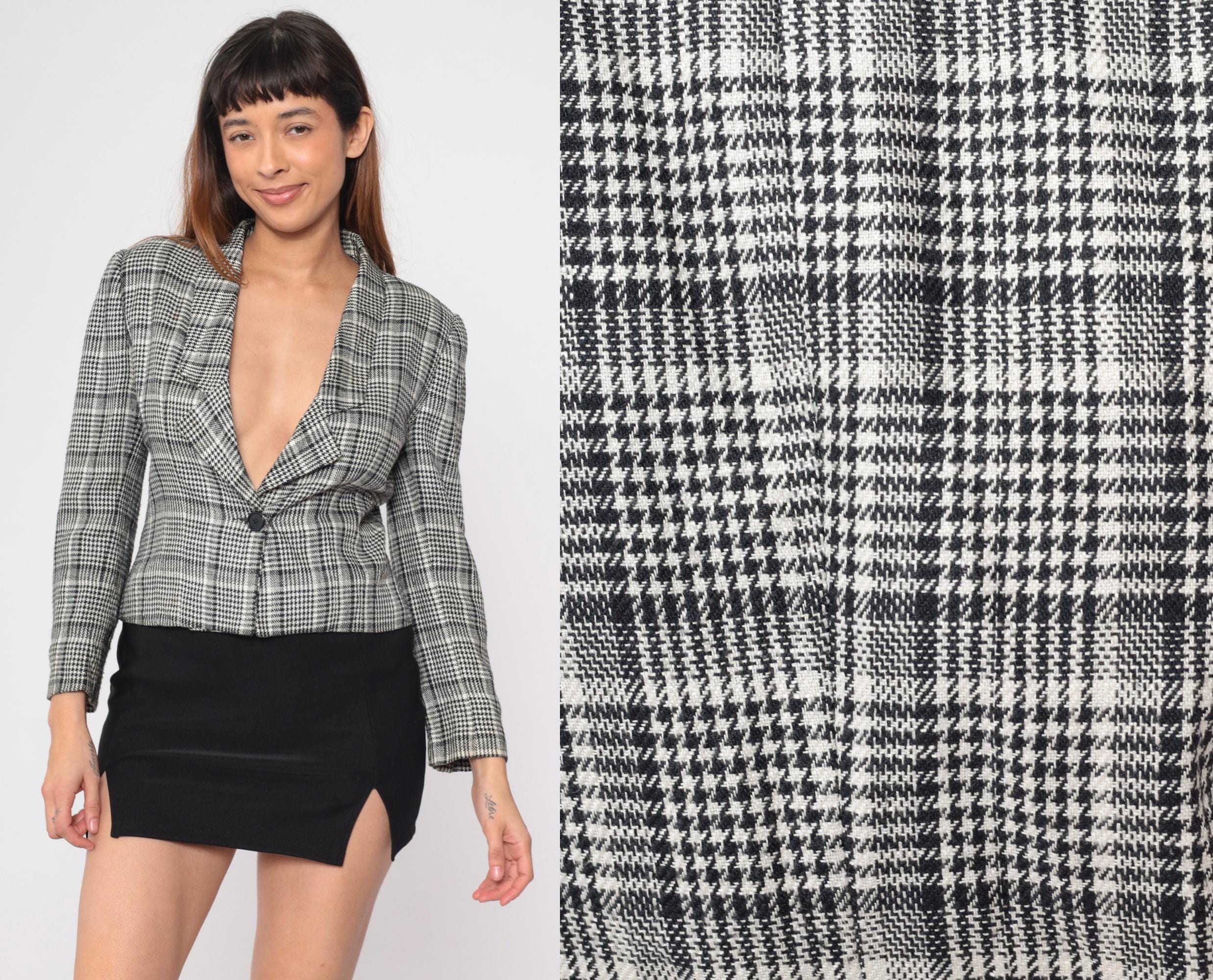 Vintage 90s jacket in black and white houndstooth print with a single button closure.