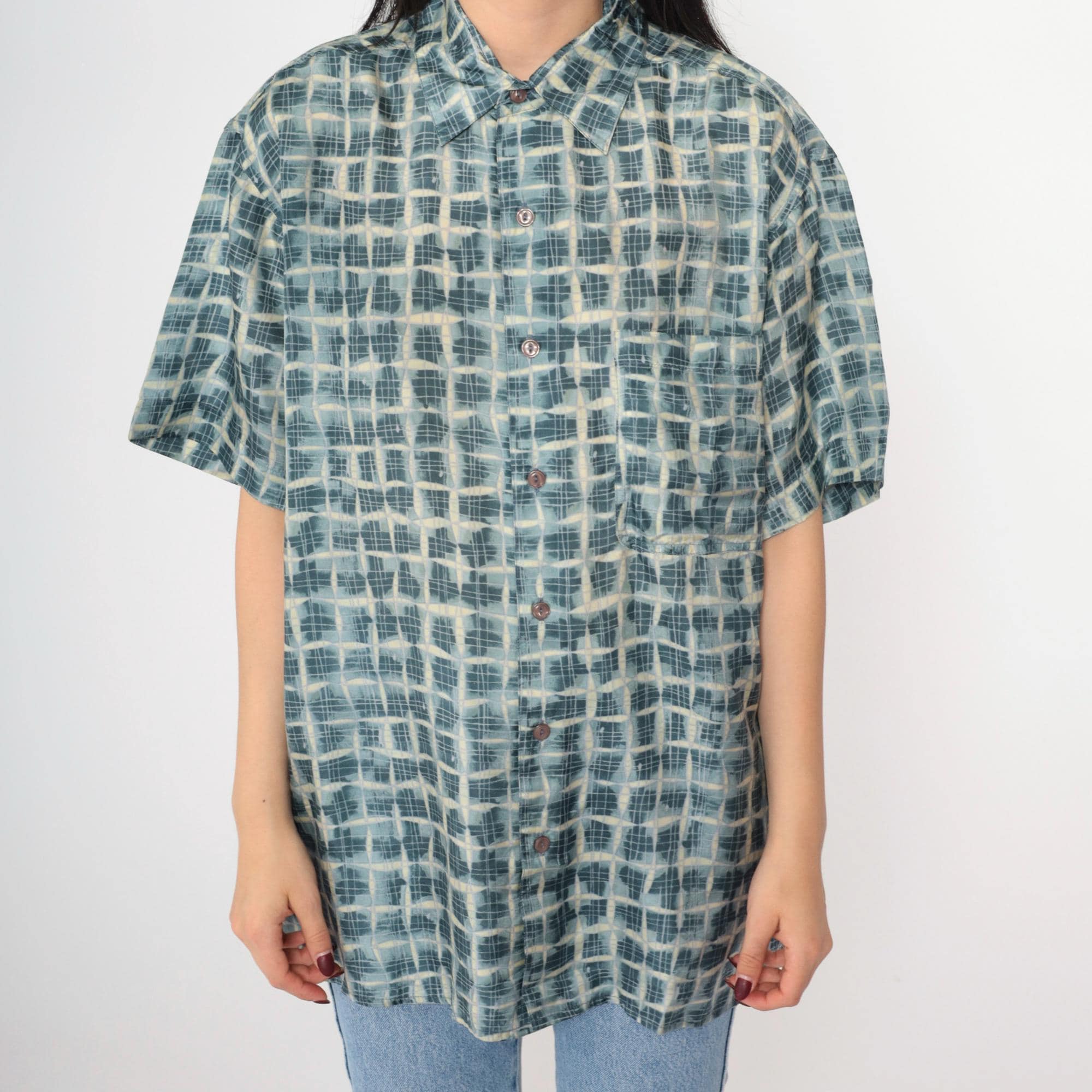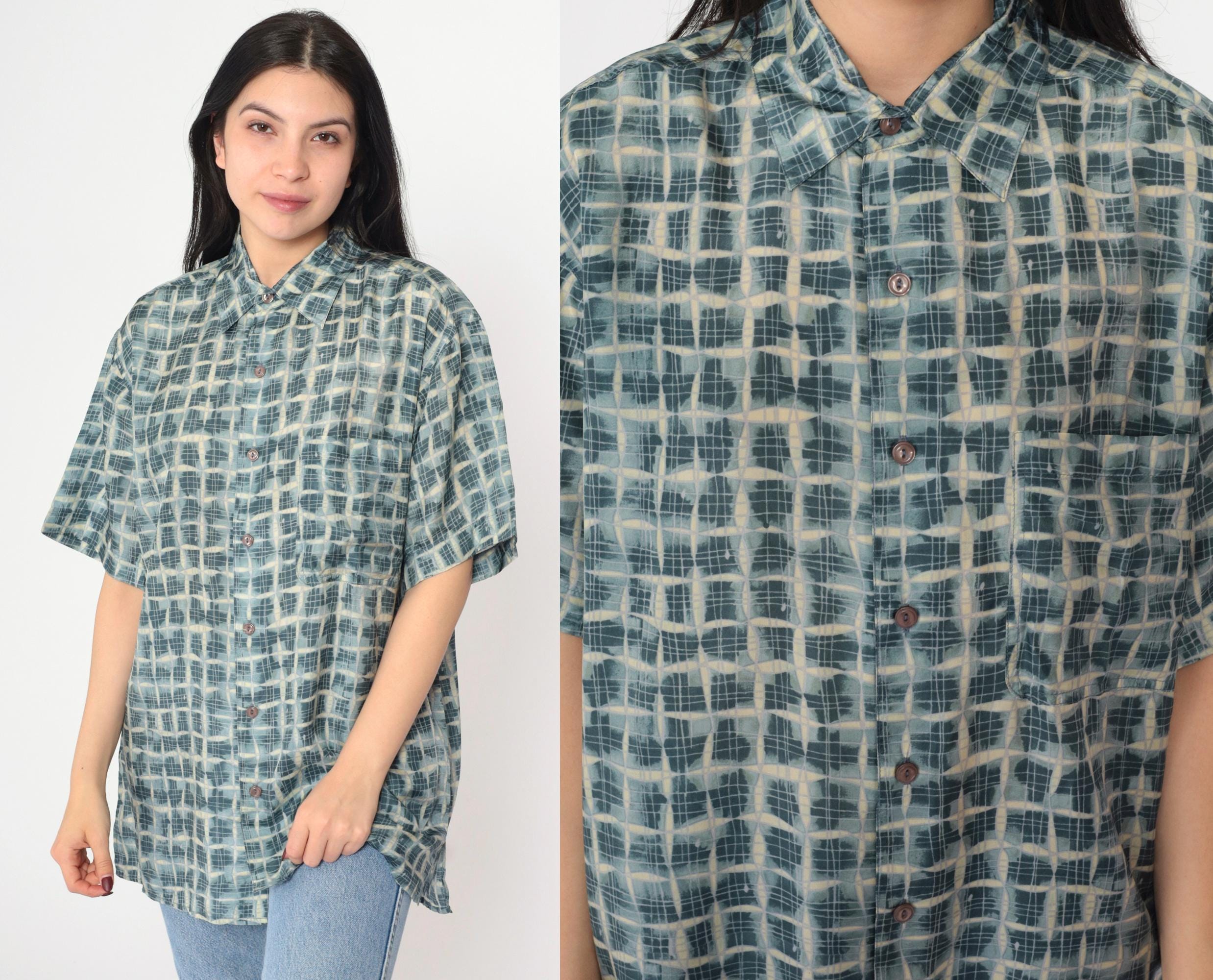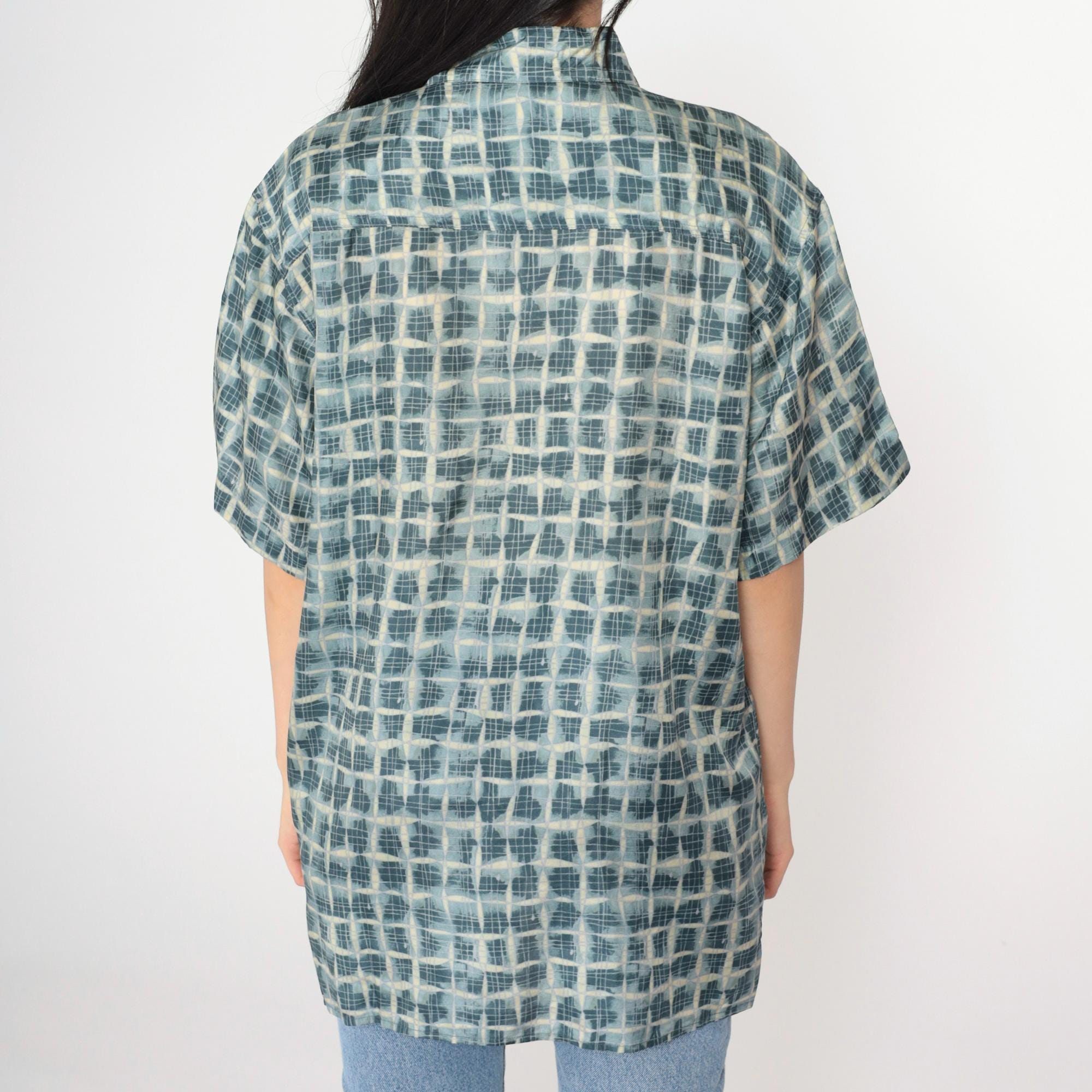 Vintage 90s silk shirt in blue with a geometric print. It has short sleeves and buttons up the front.