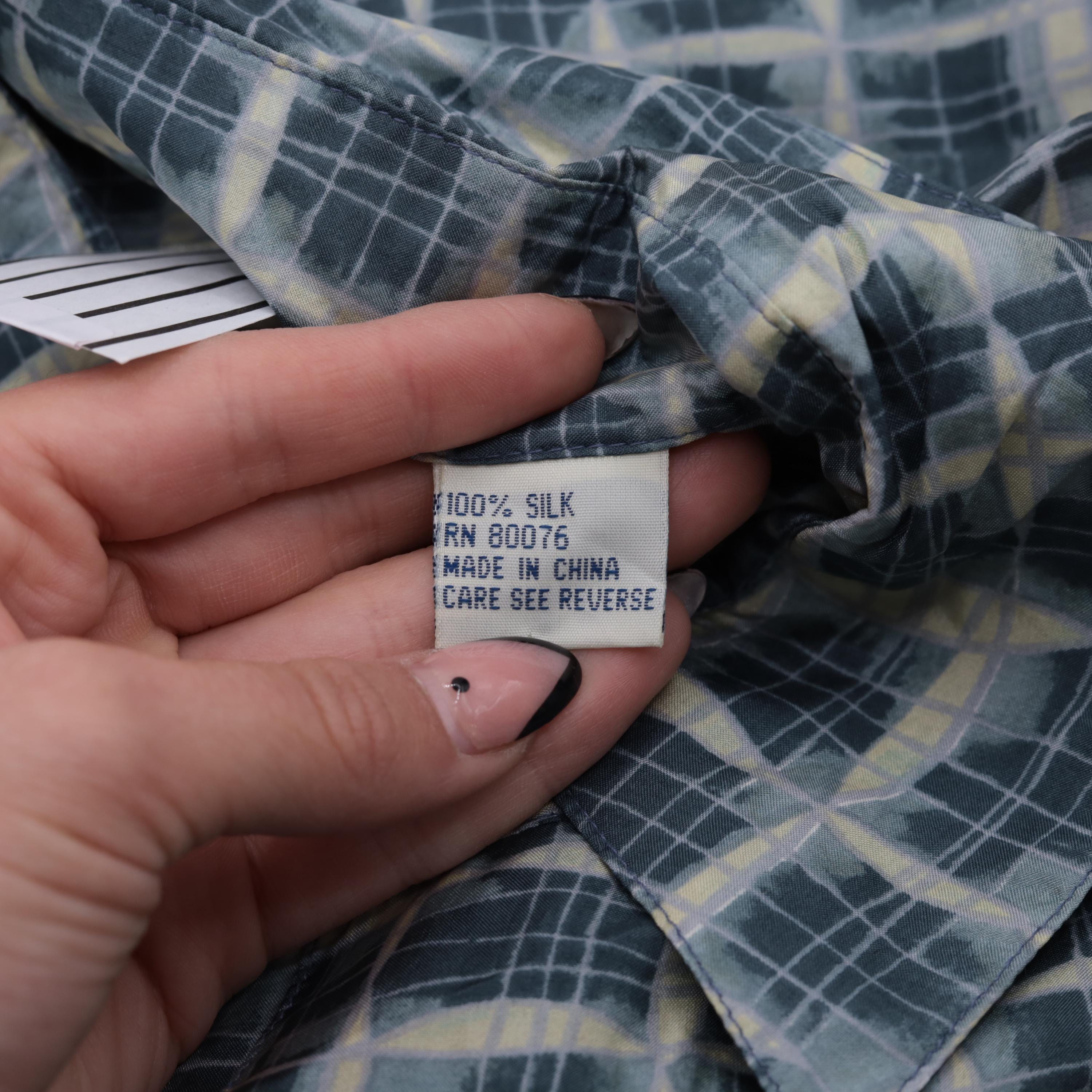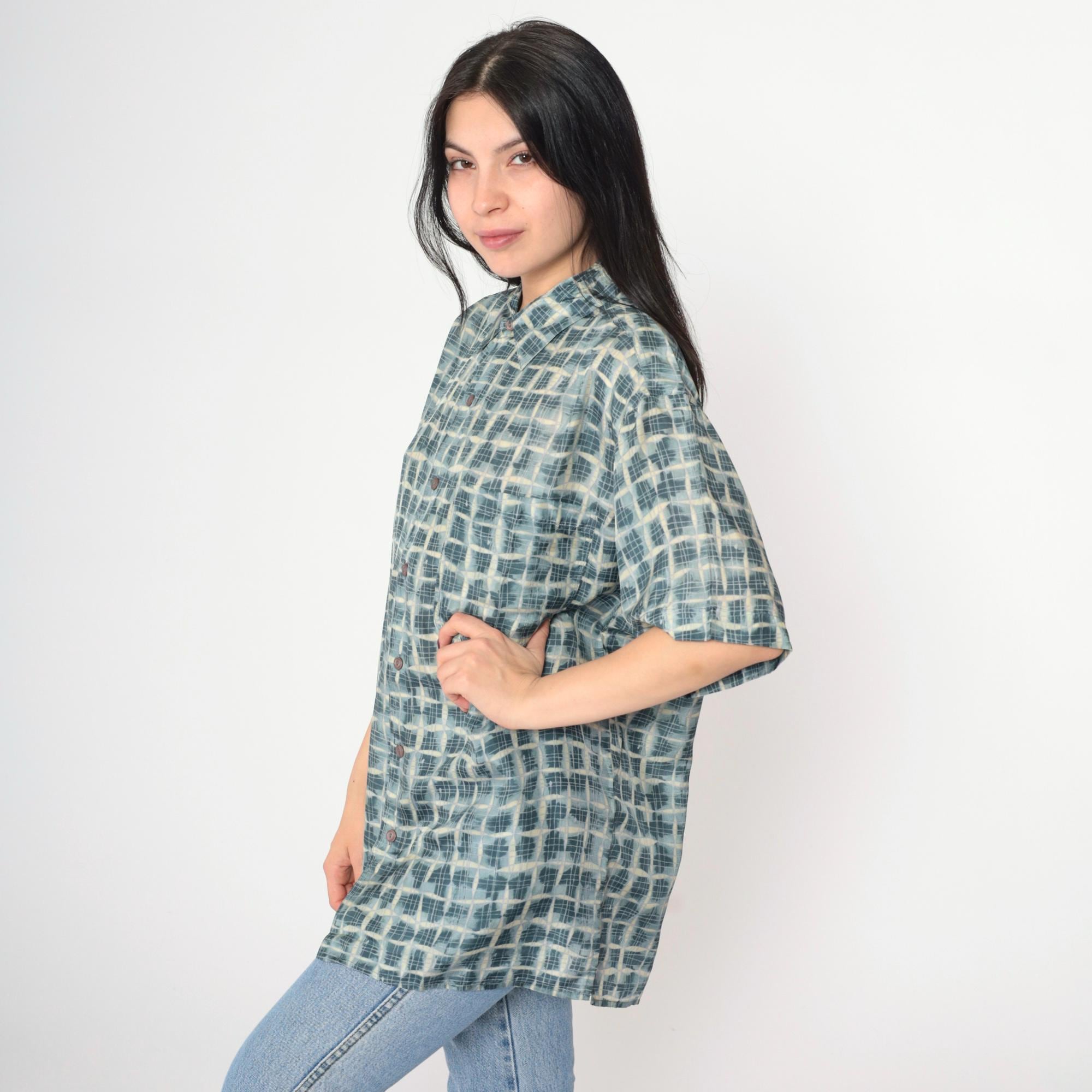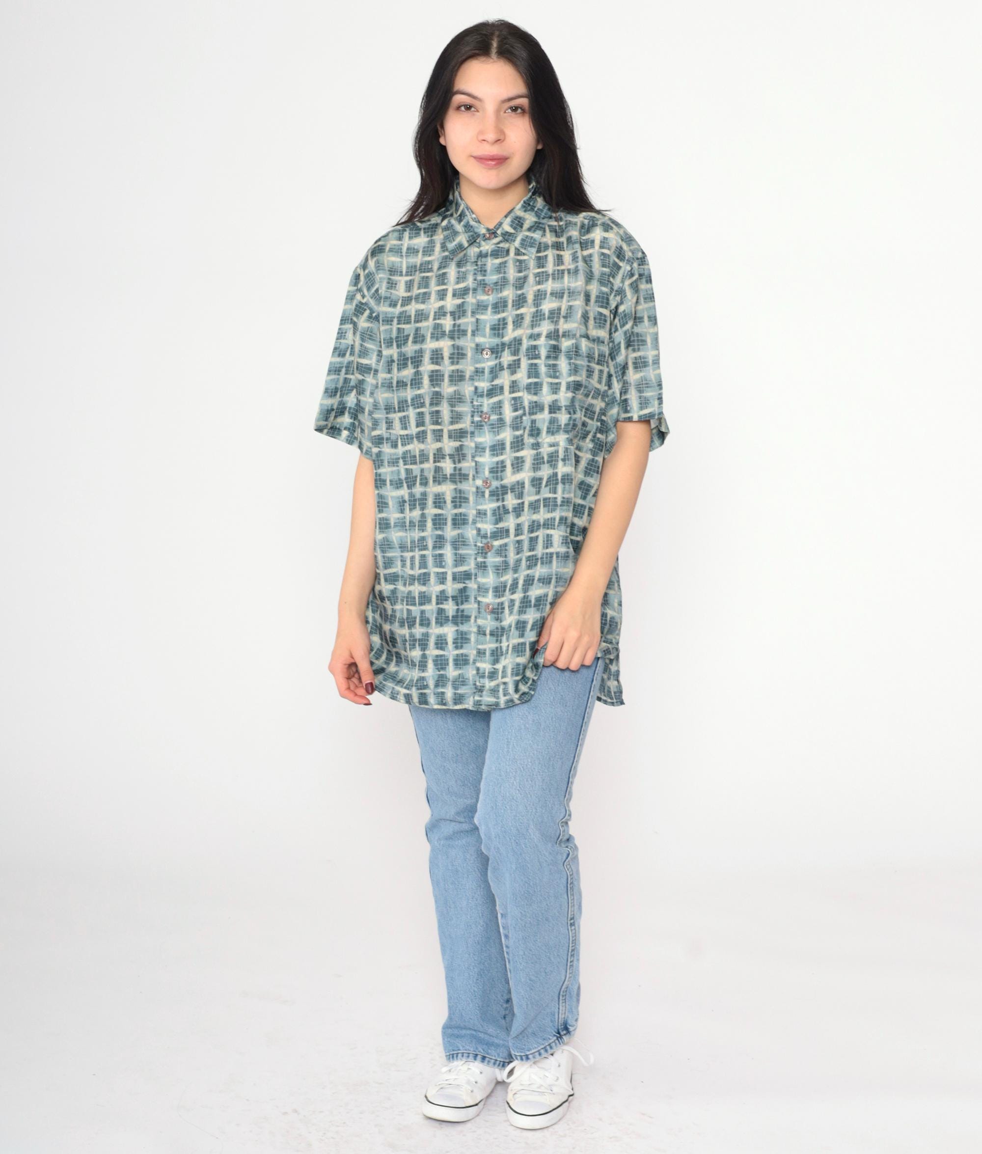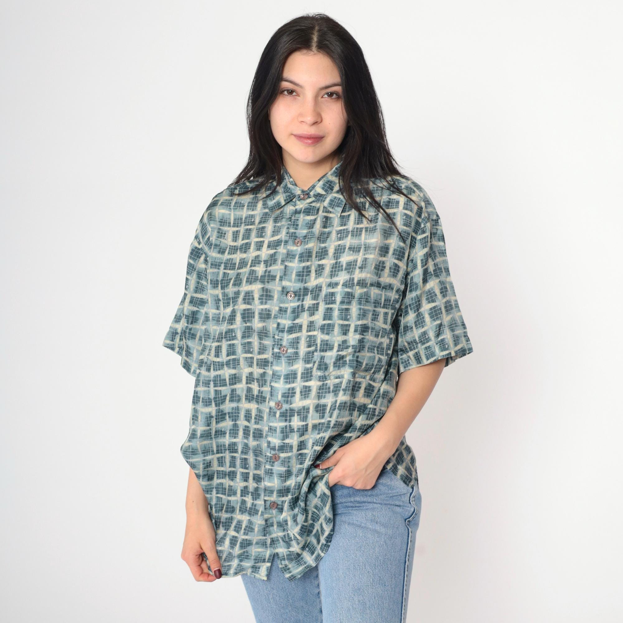 Vintage 90s silk shirt in blue with a geometric print. It has short sleeves and buttons up the front.