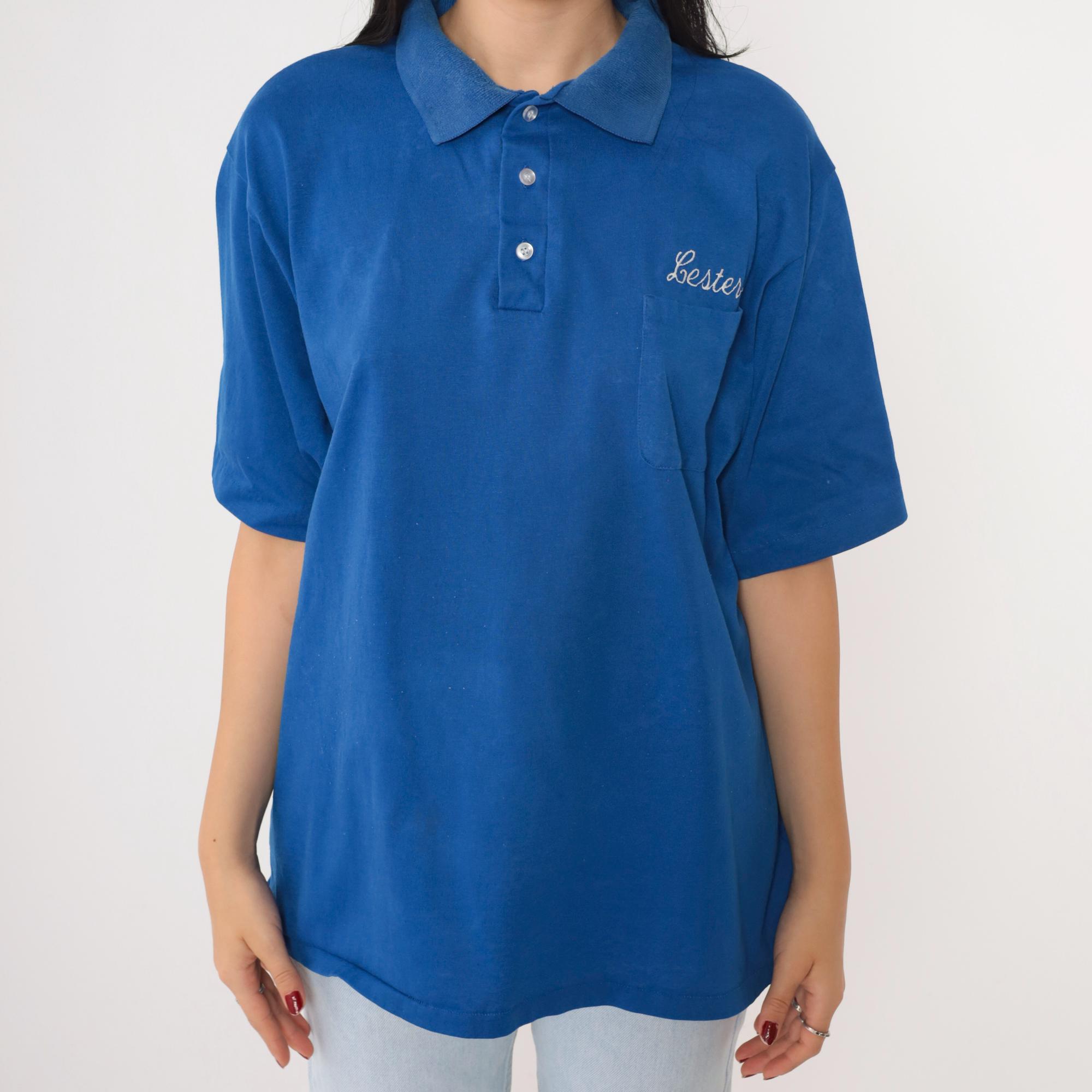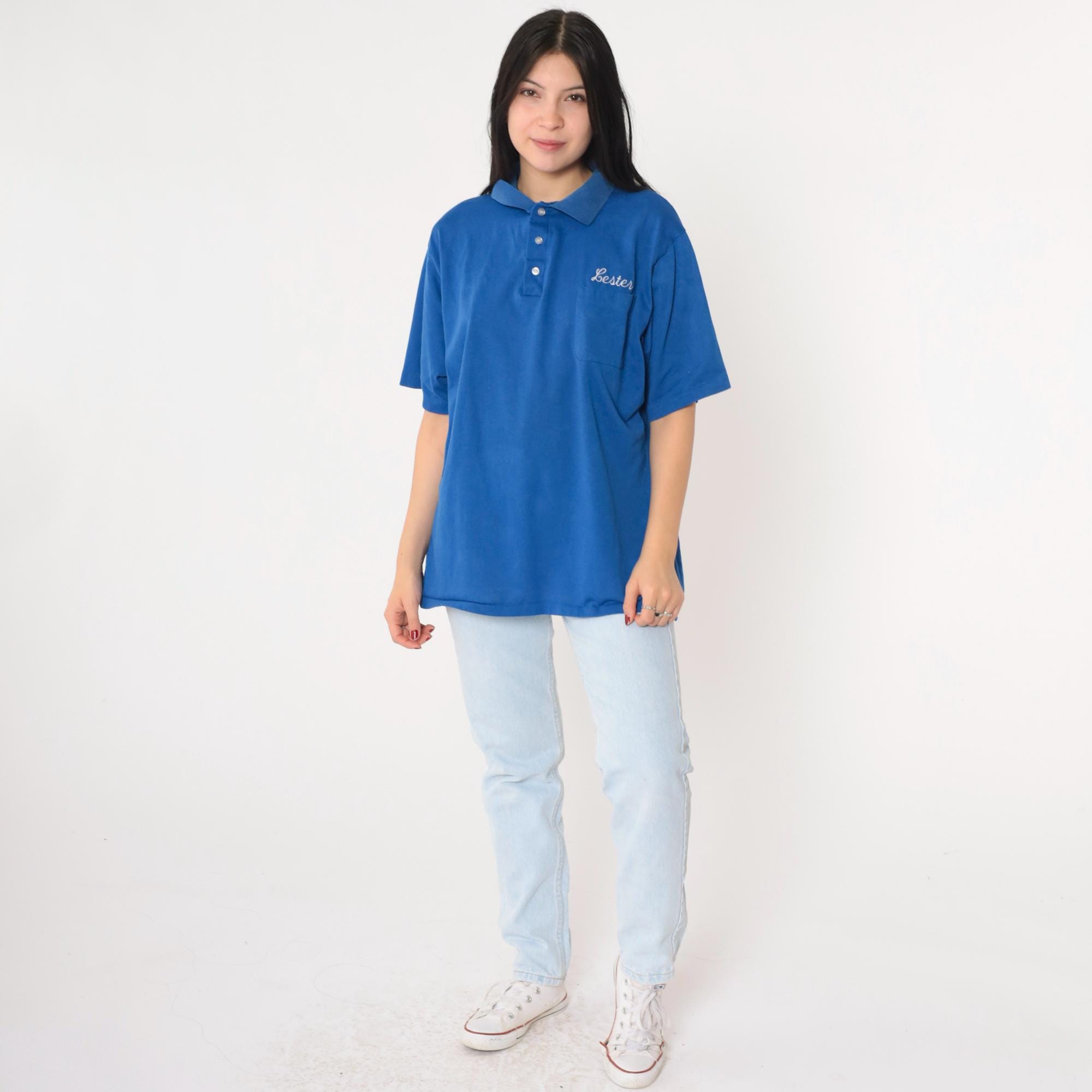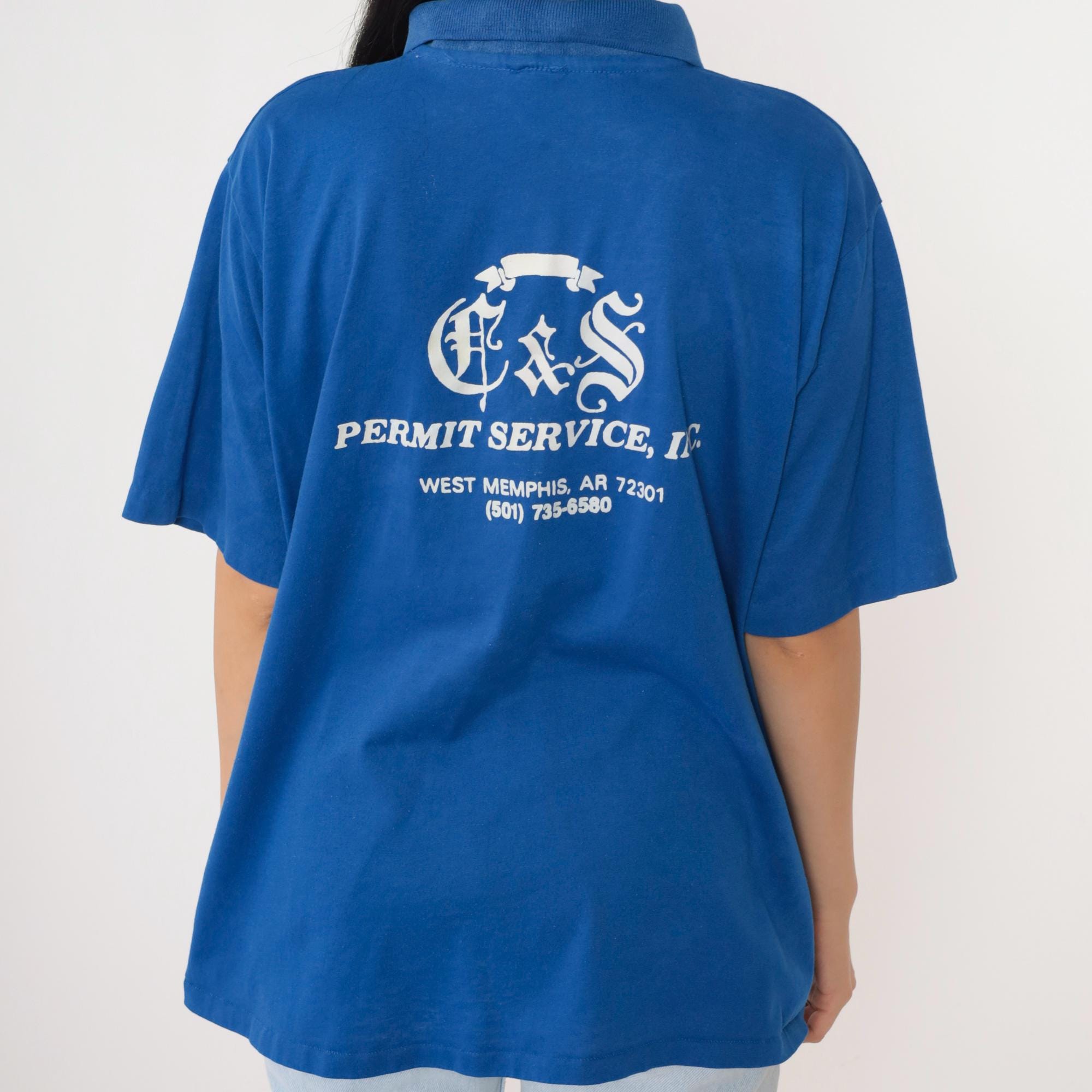 Vintage 90s polo shirt in blue with Lester embroidered on the chest and C&S Permit Service inc on the back. Collared with short sleeves and buttons up the chest.