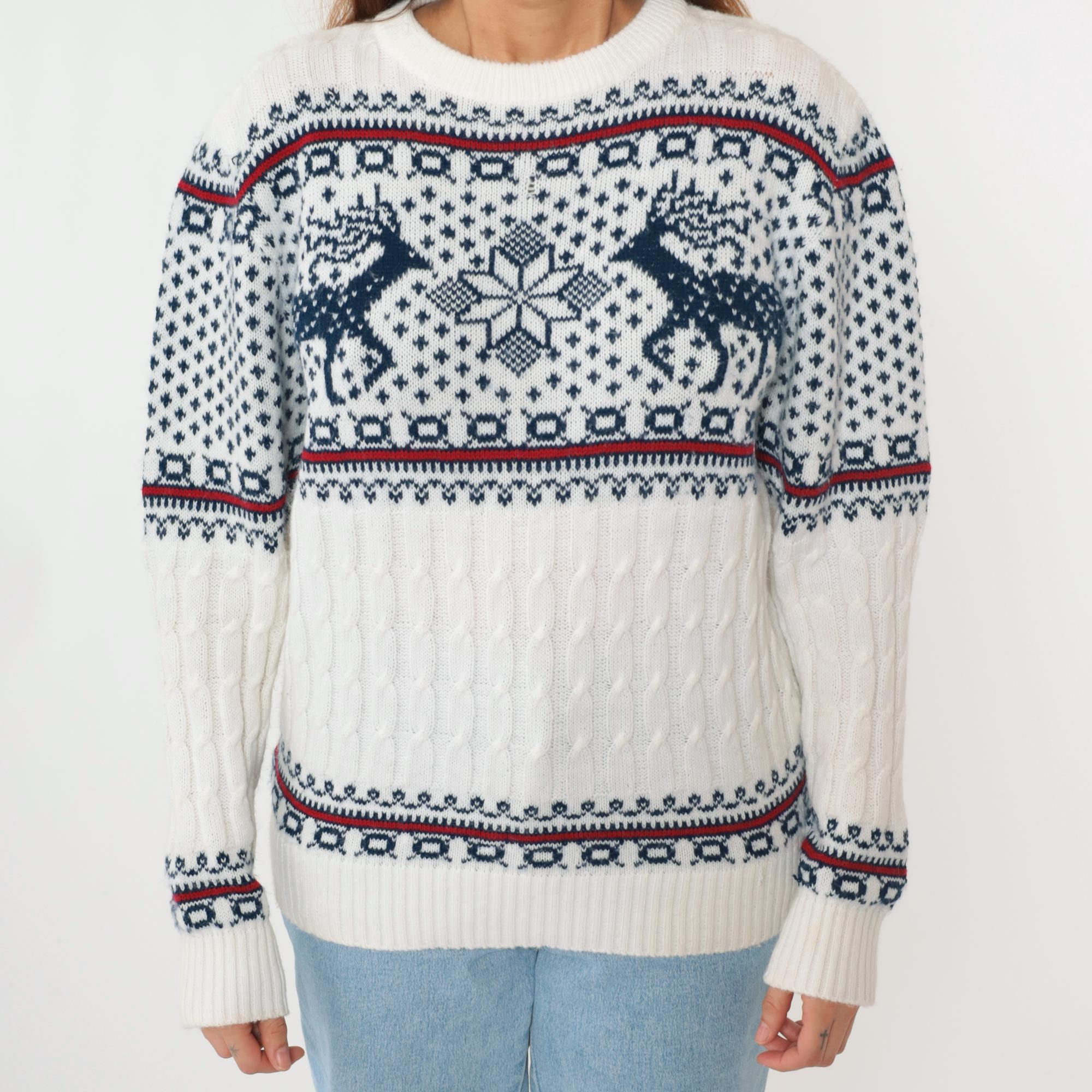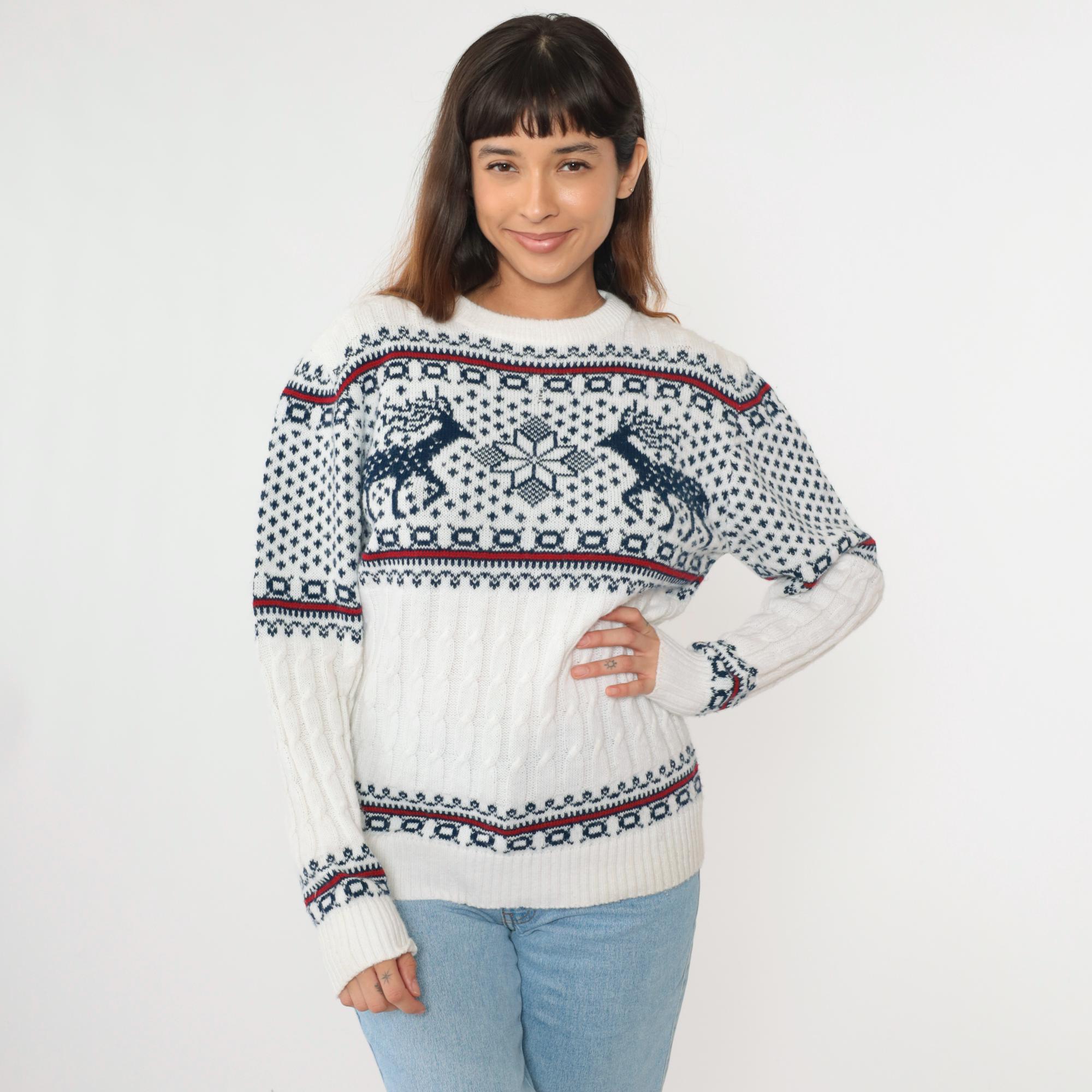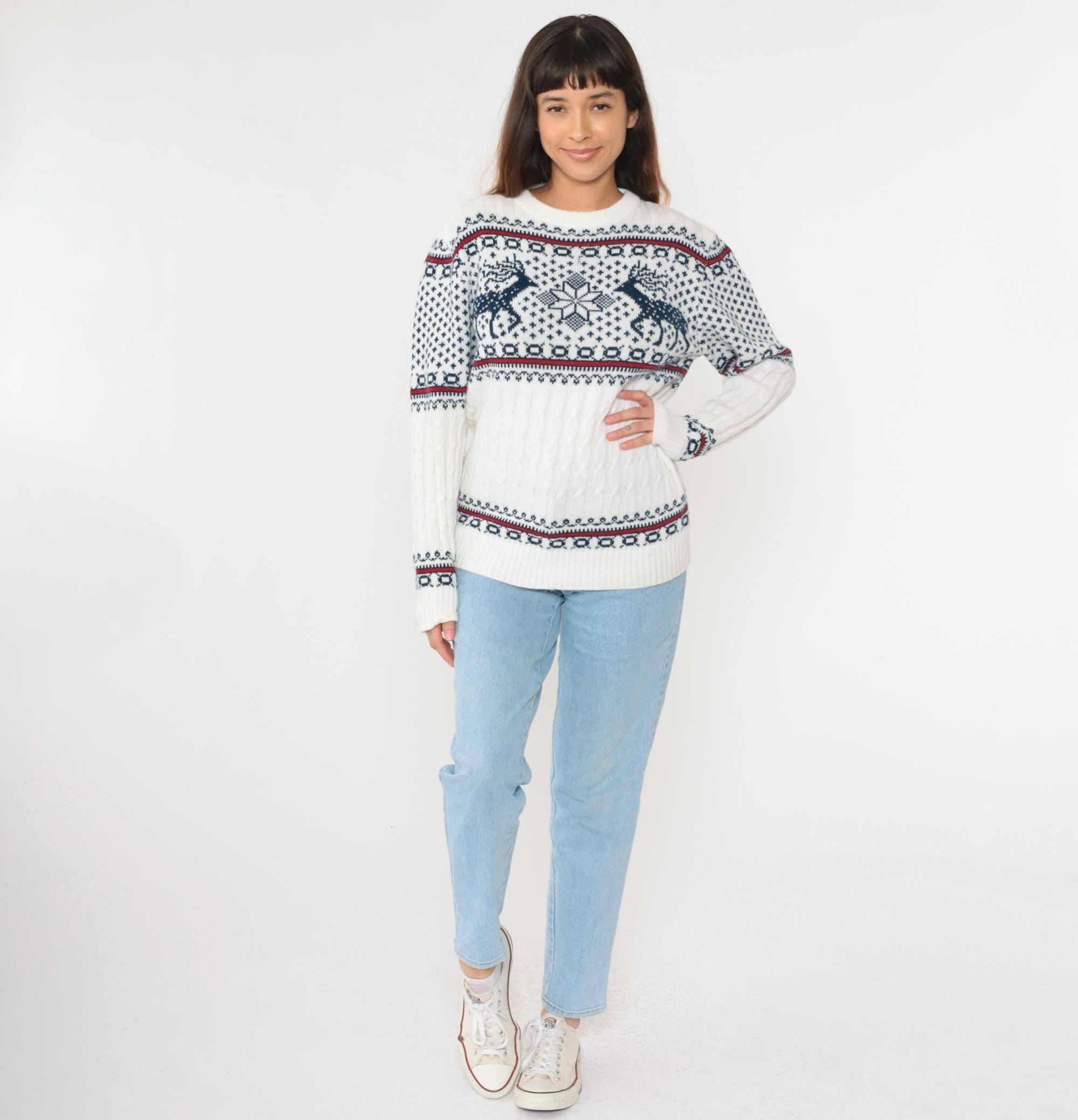 Vintage 80s sweater with a Fair Isle deer and snowflake design. Slouchy fit with a crewneck.