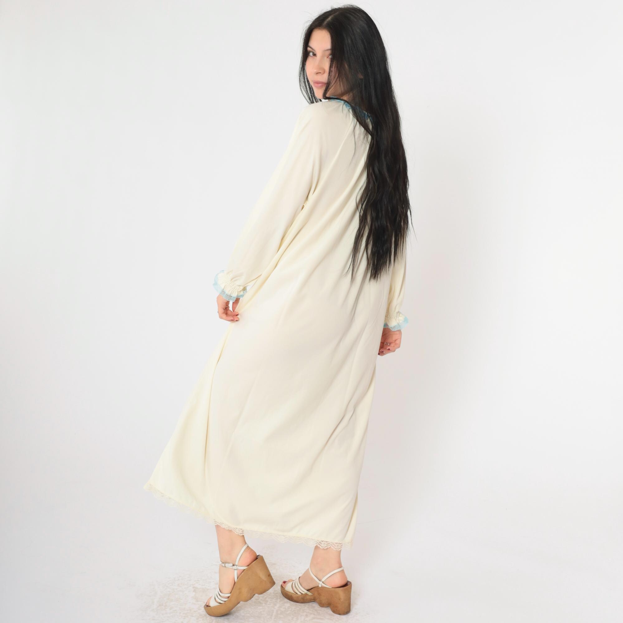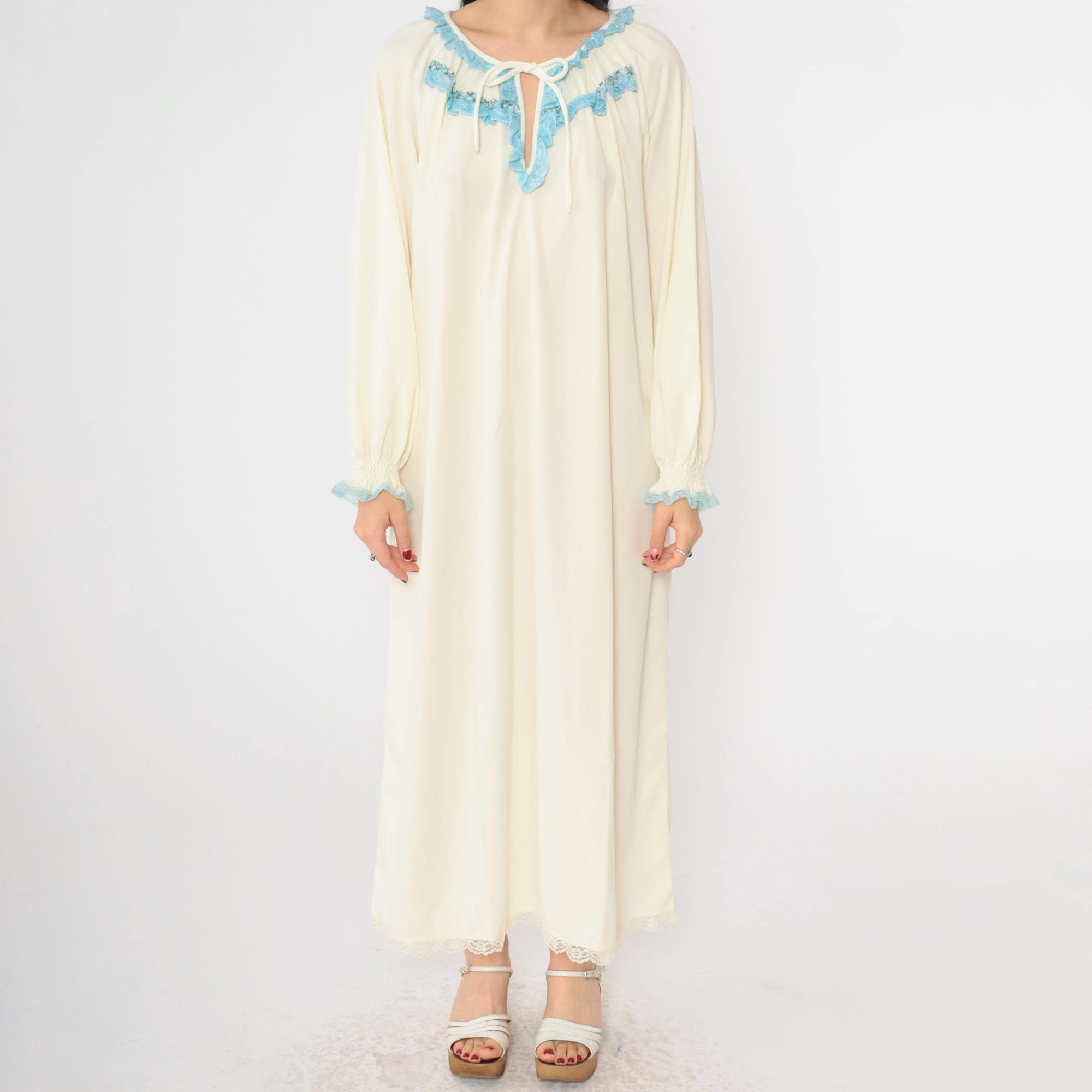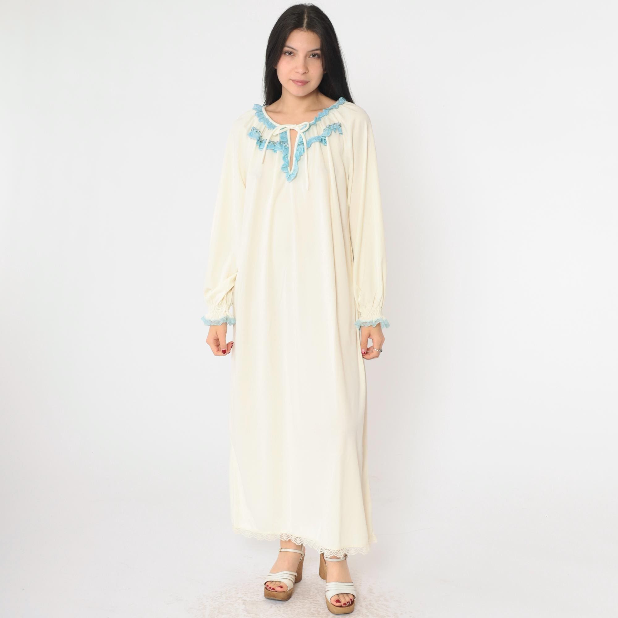 Vintage 70s nightgown in cream with blue lace trim. It has long sleeves and a keyhole with a tie at the neck. Maxi length.