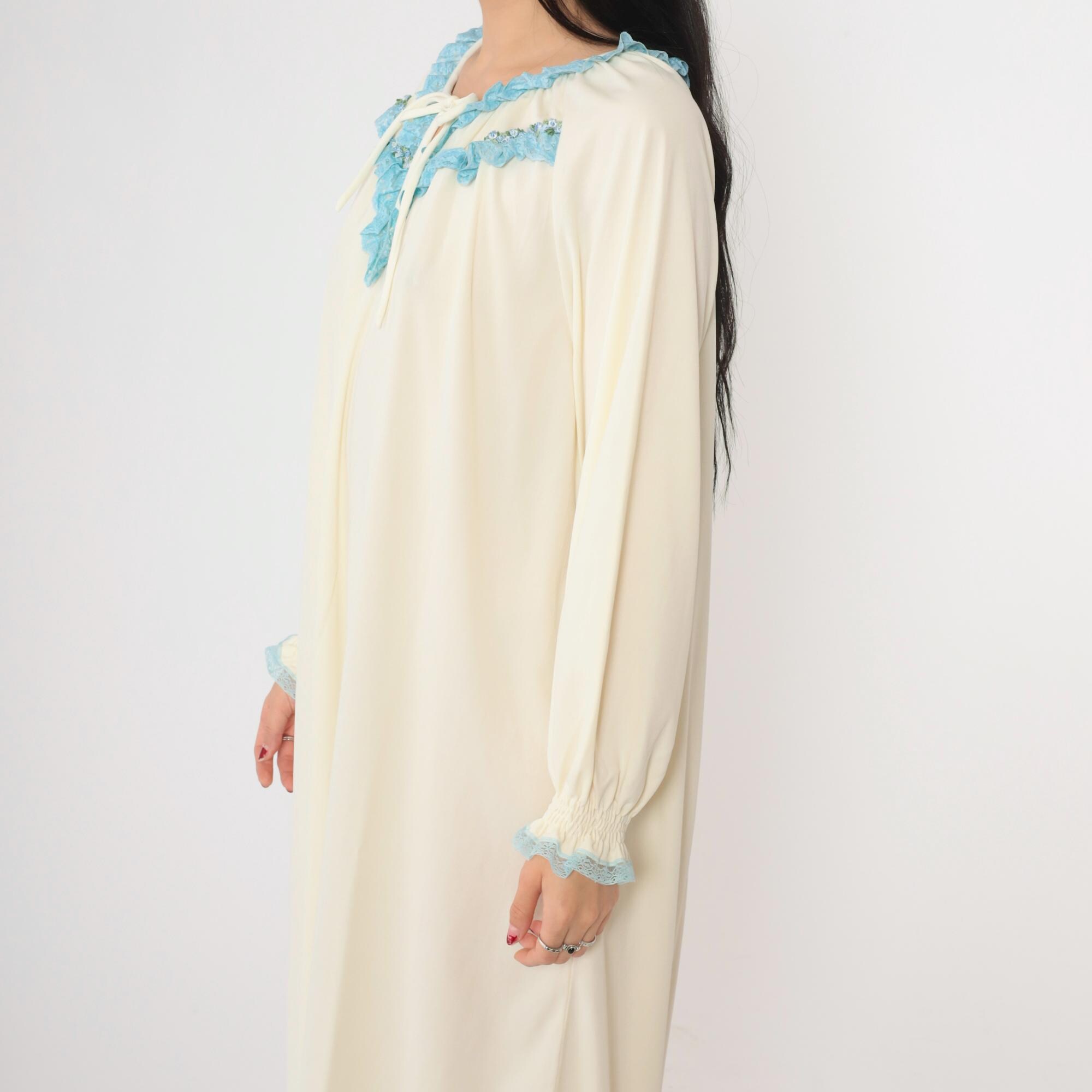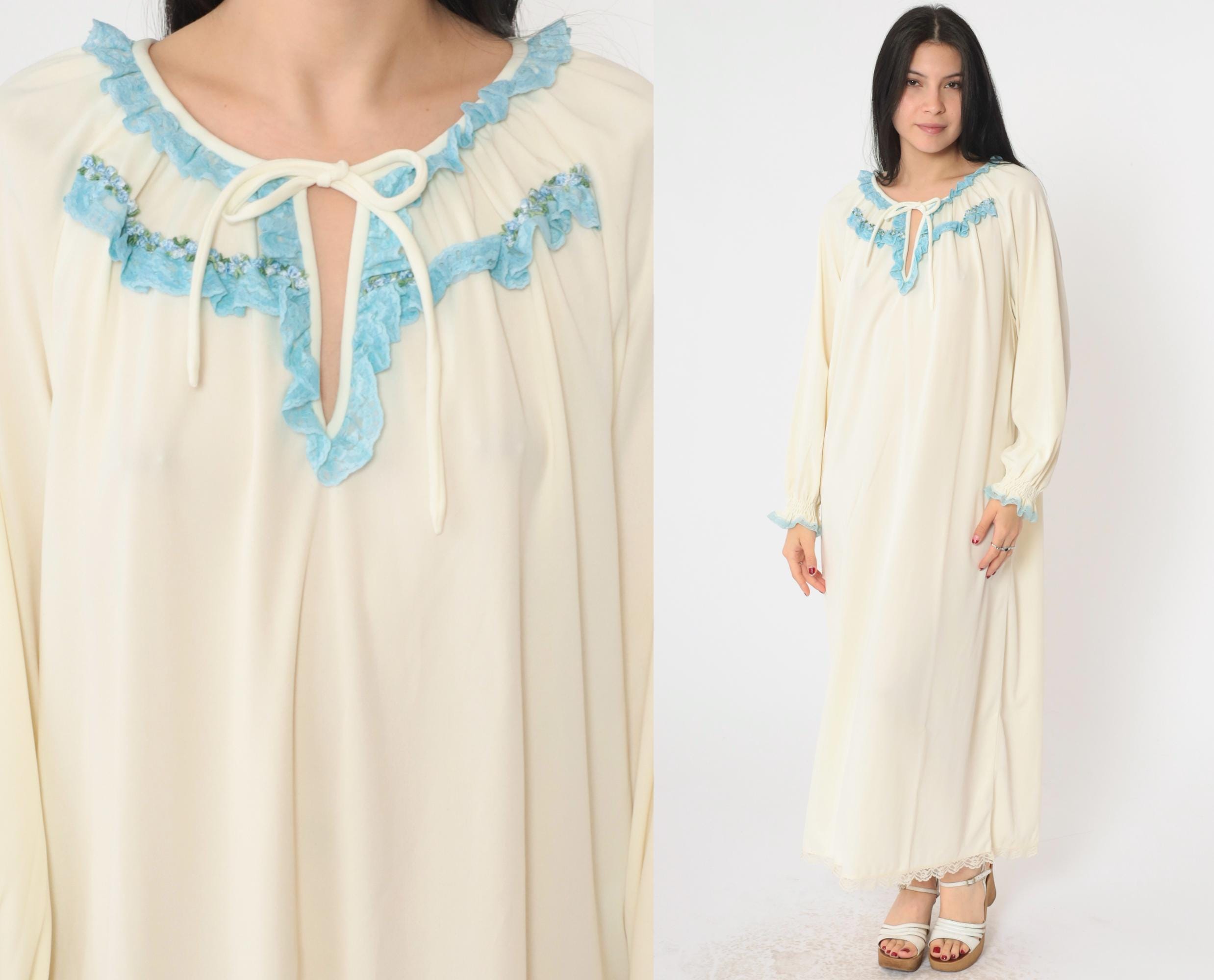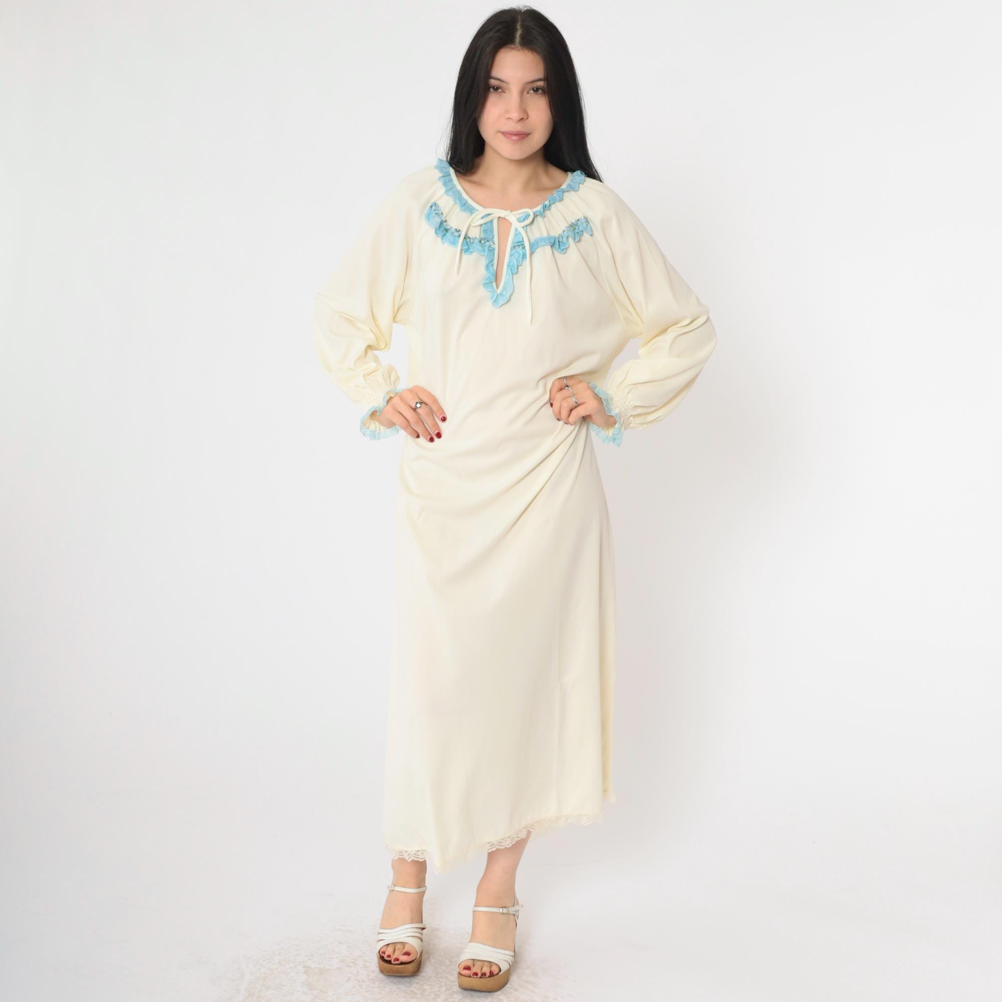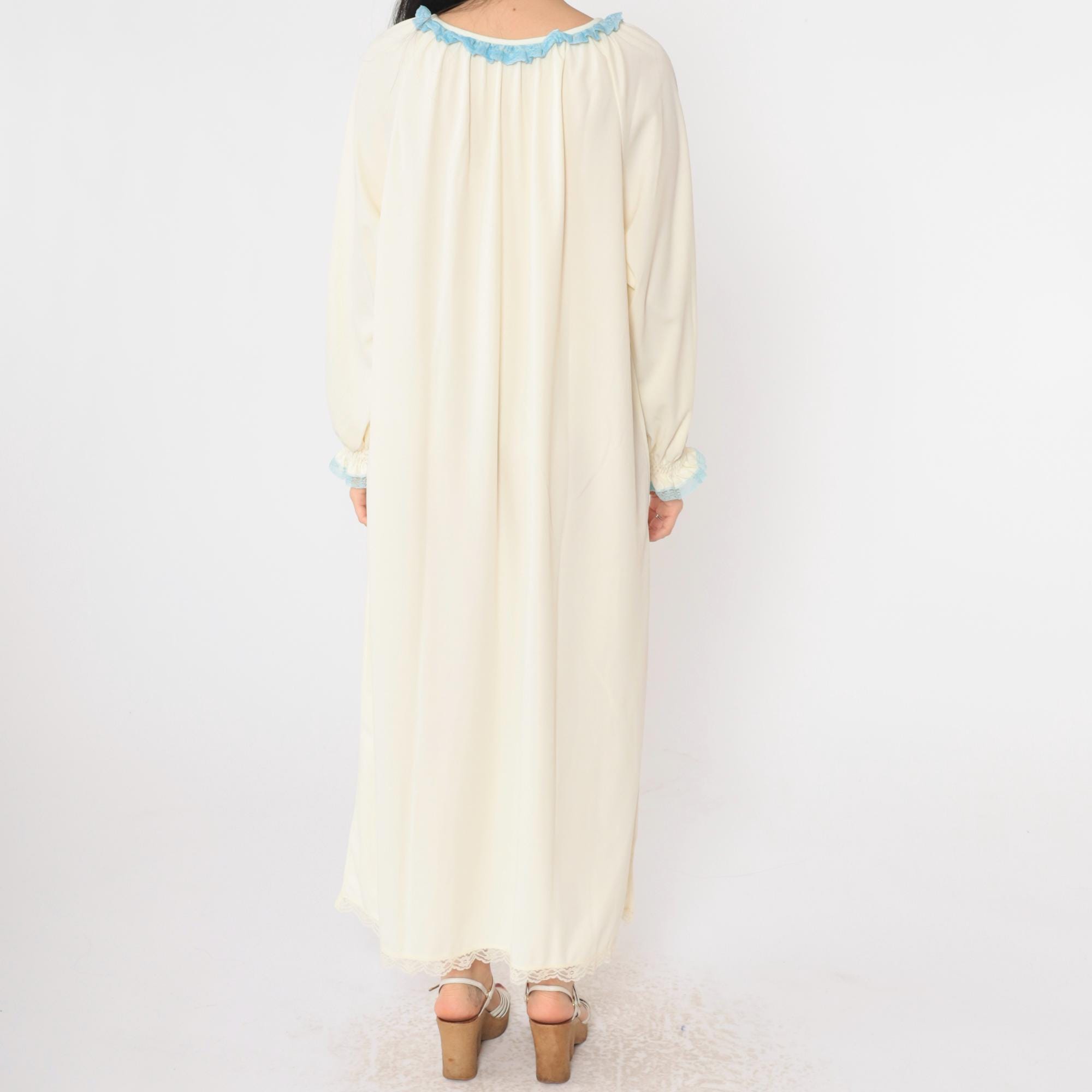 Vintage 70s nightgown in cream with blue lace trim. It has long sleeves and a keyhole with a tie at the neck. Maxi length.