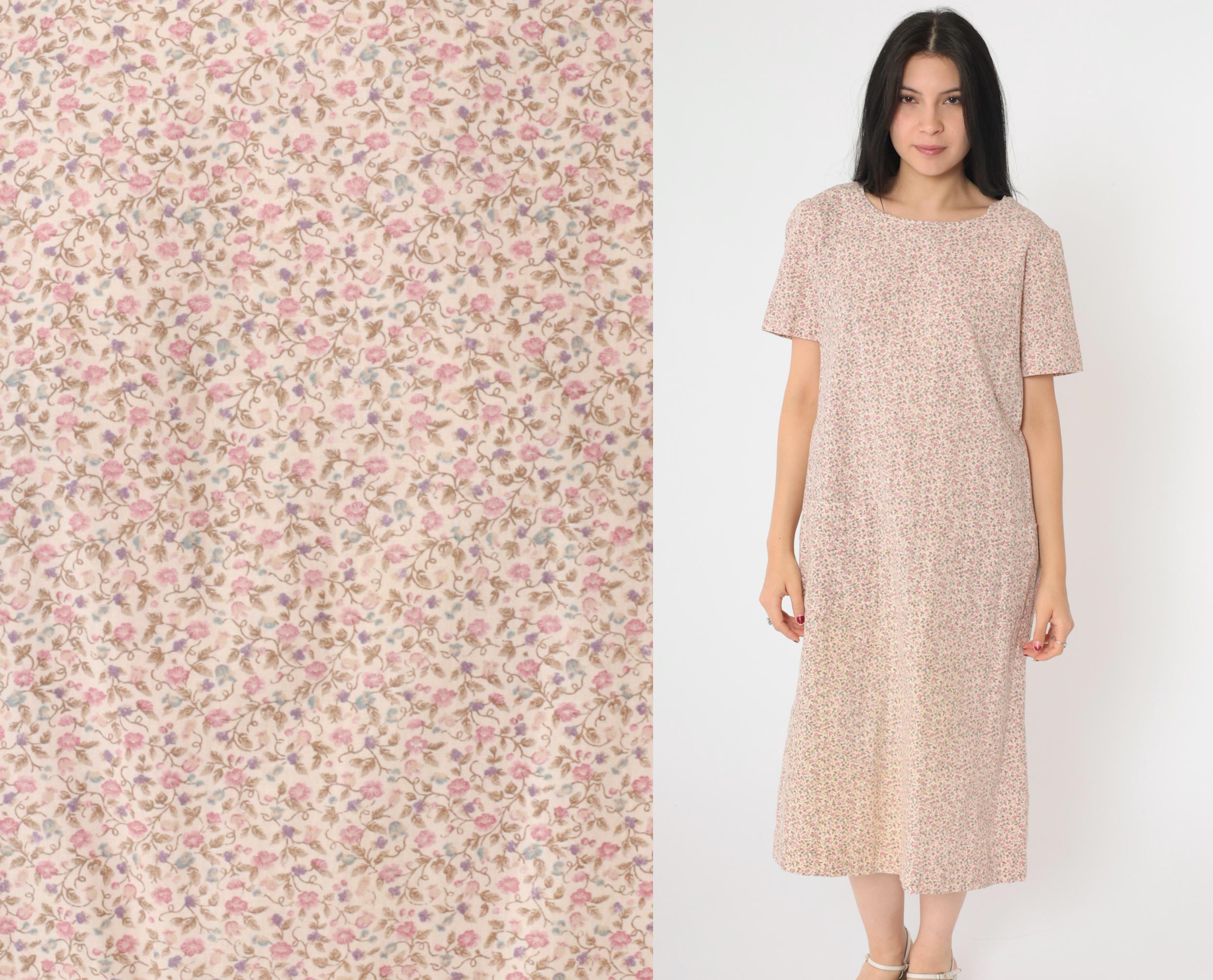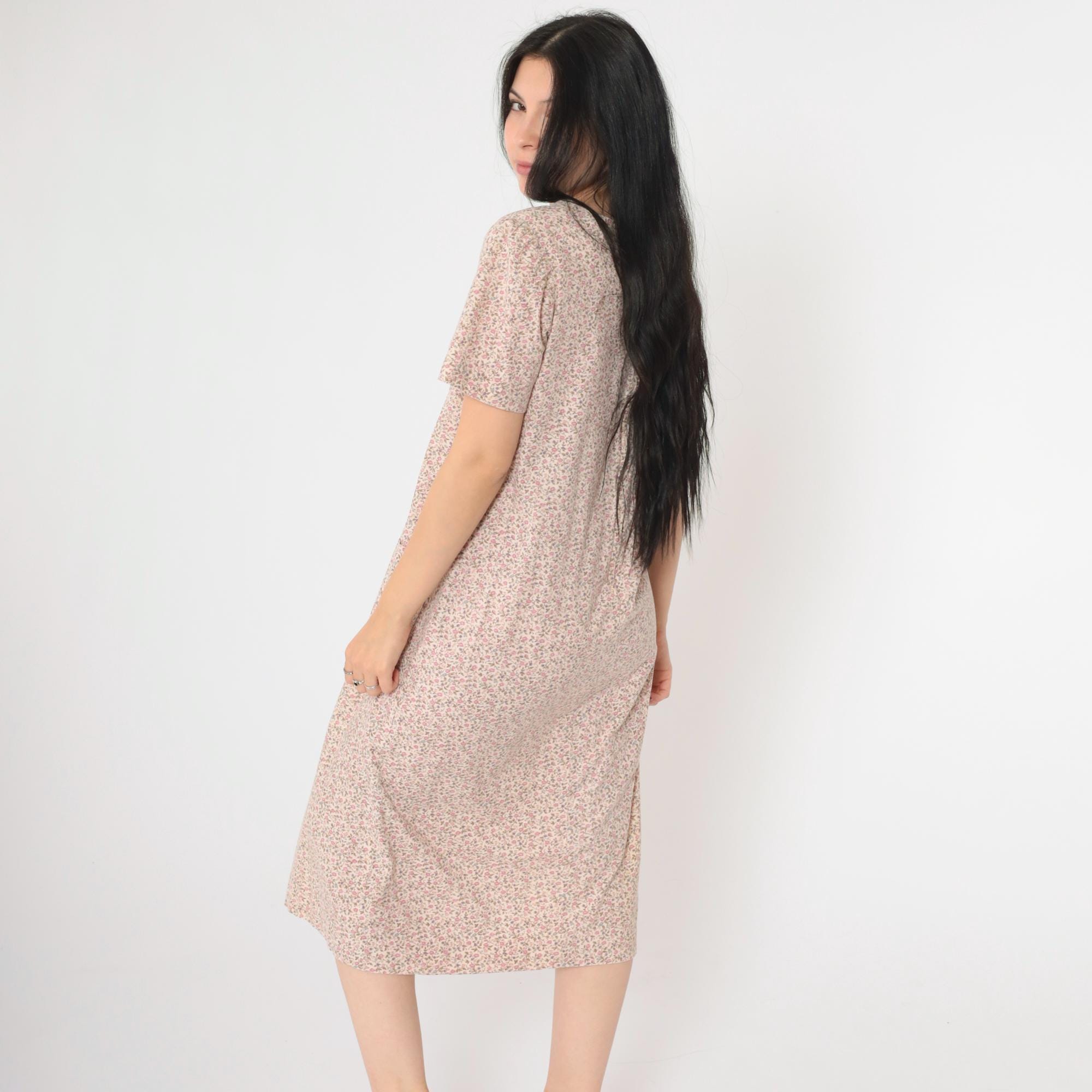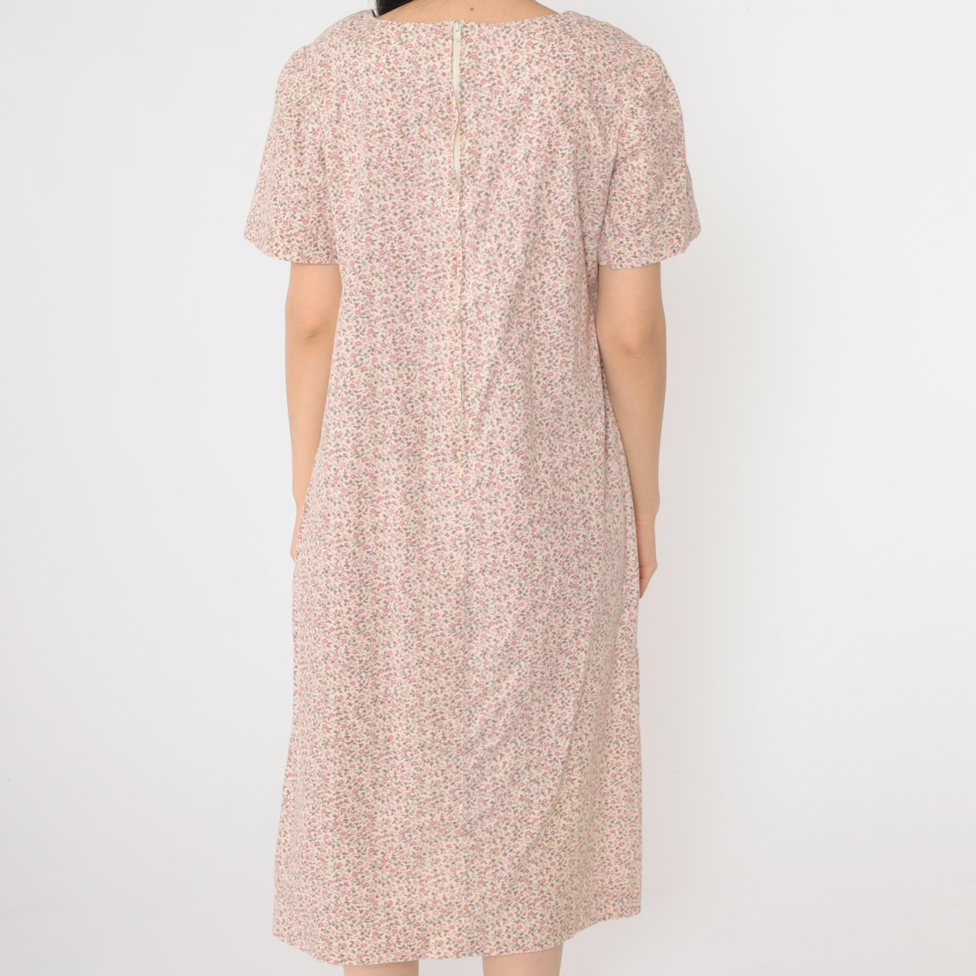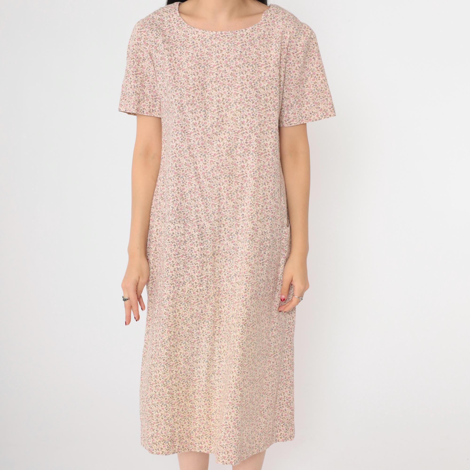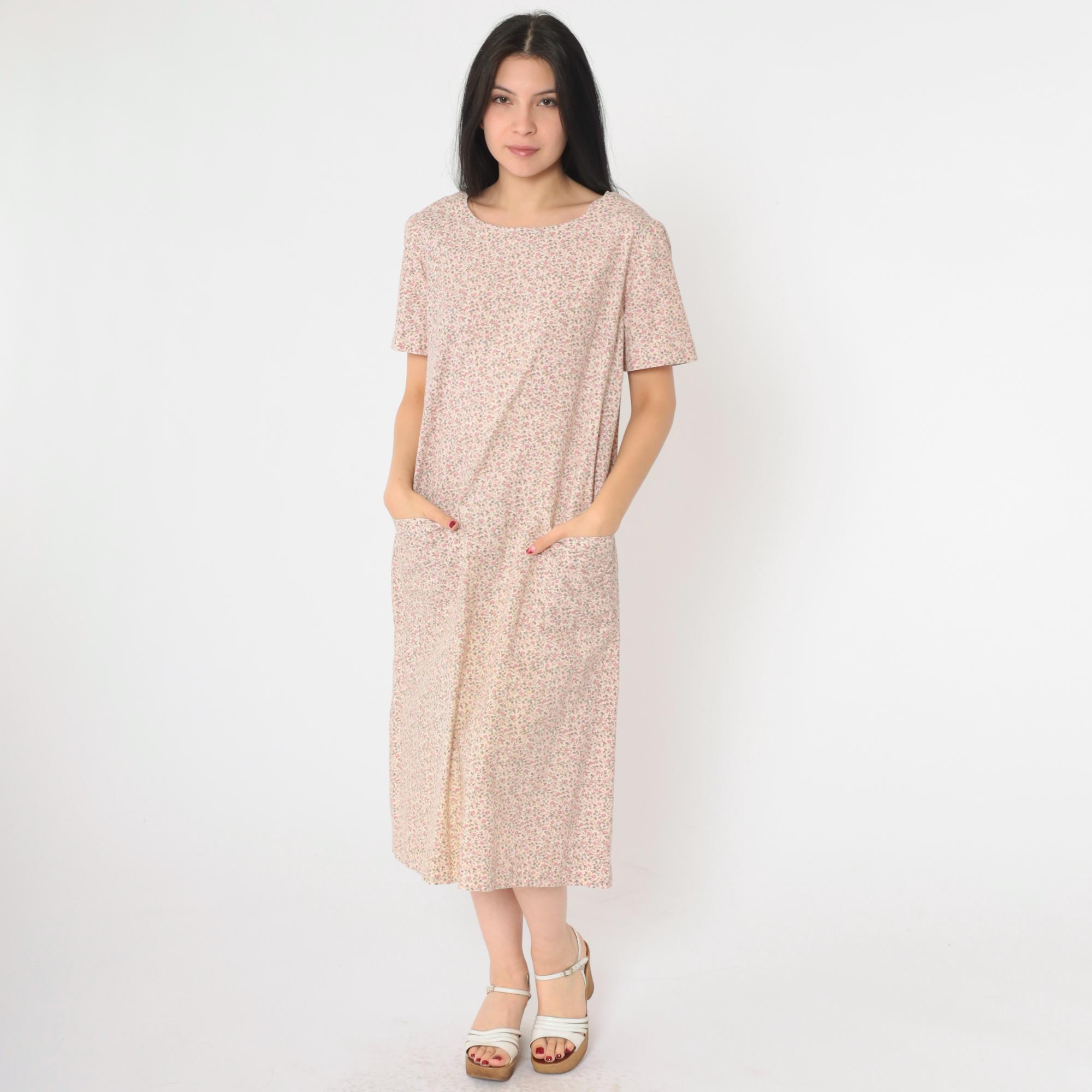 Vintage 90s midi dress in off-white with a floral print. Shift cut with short sleeves and pockets.