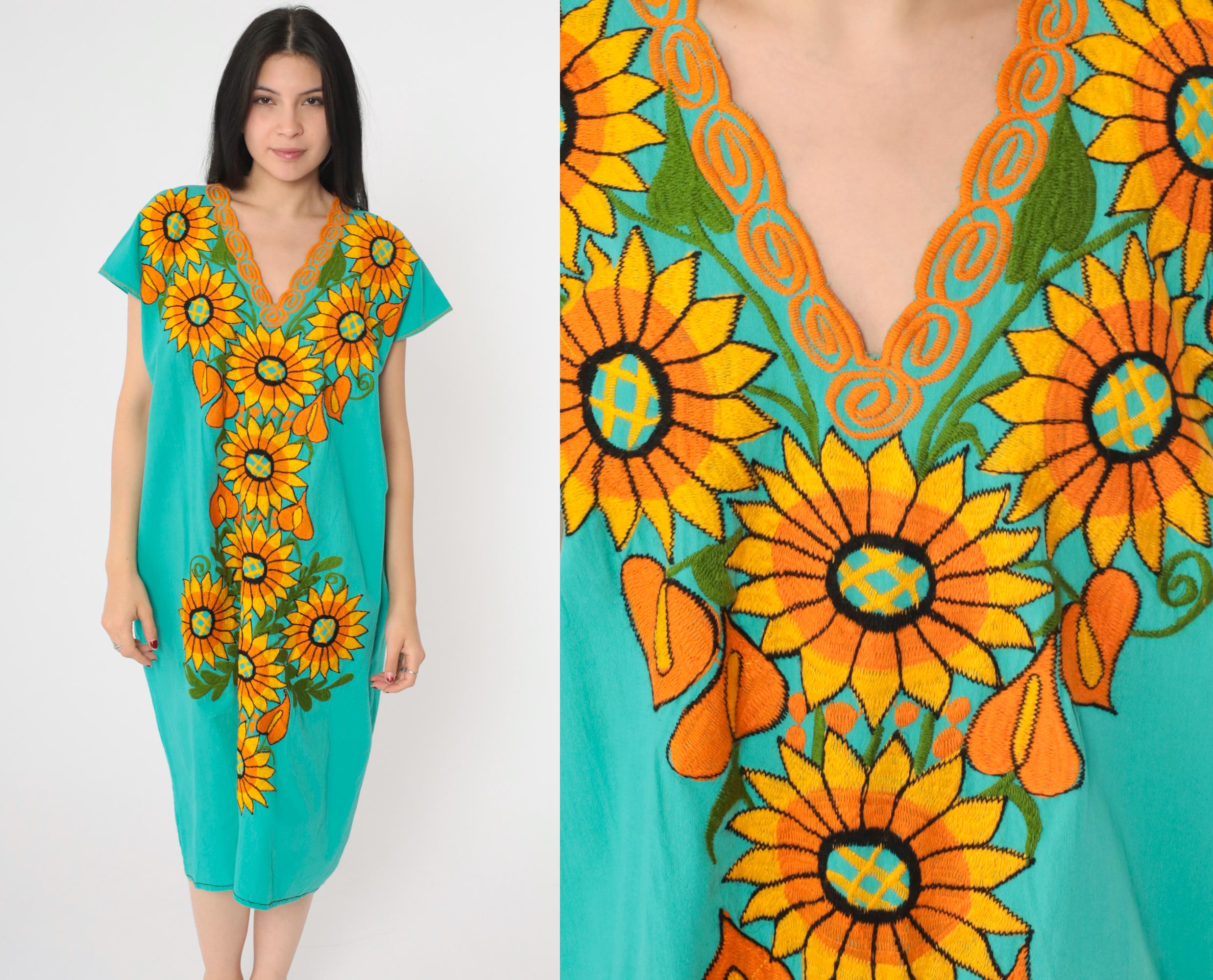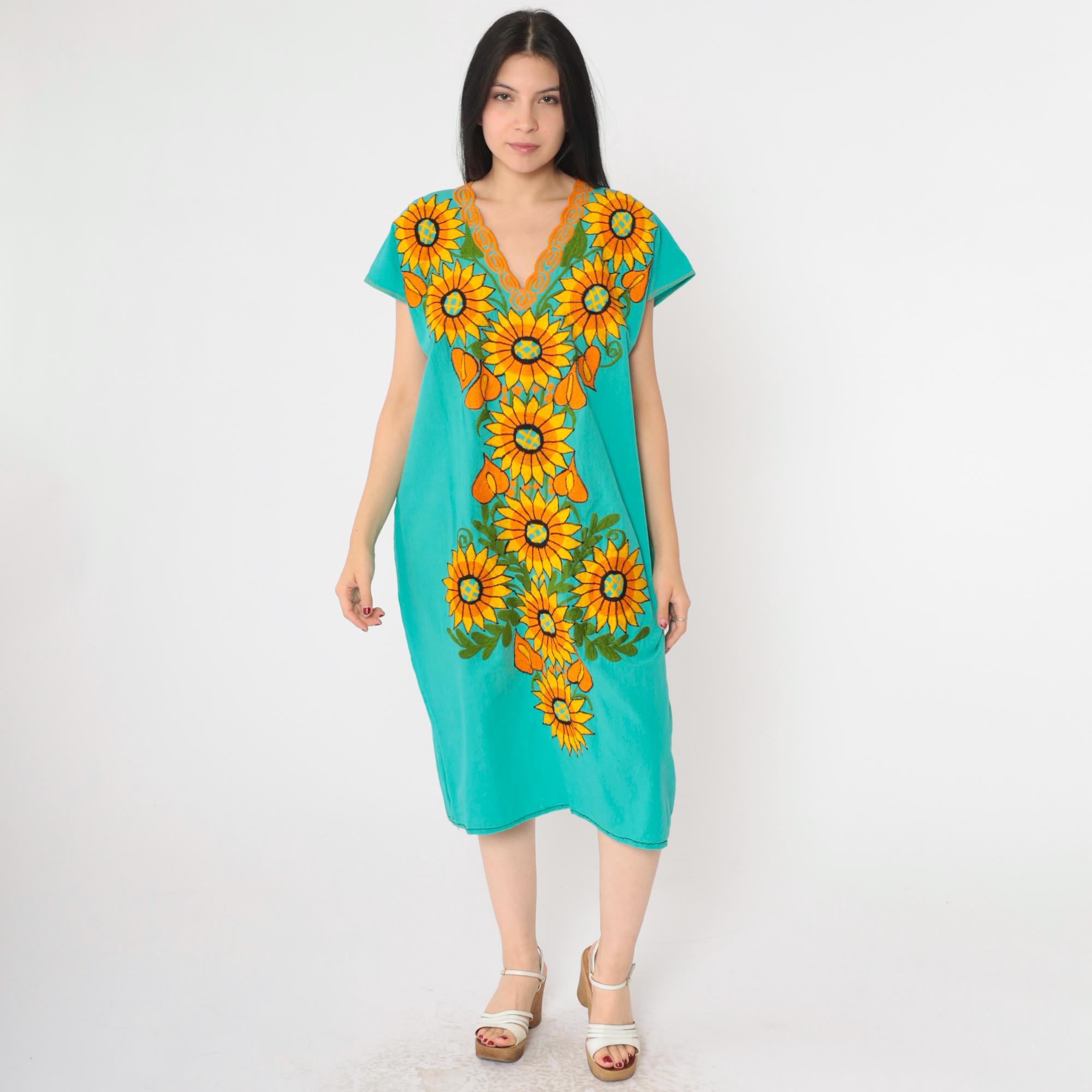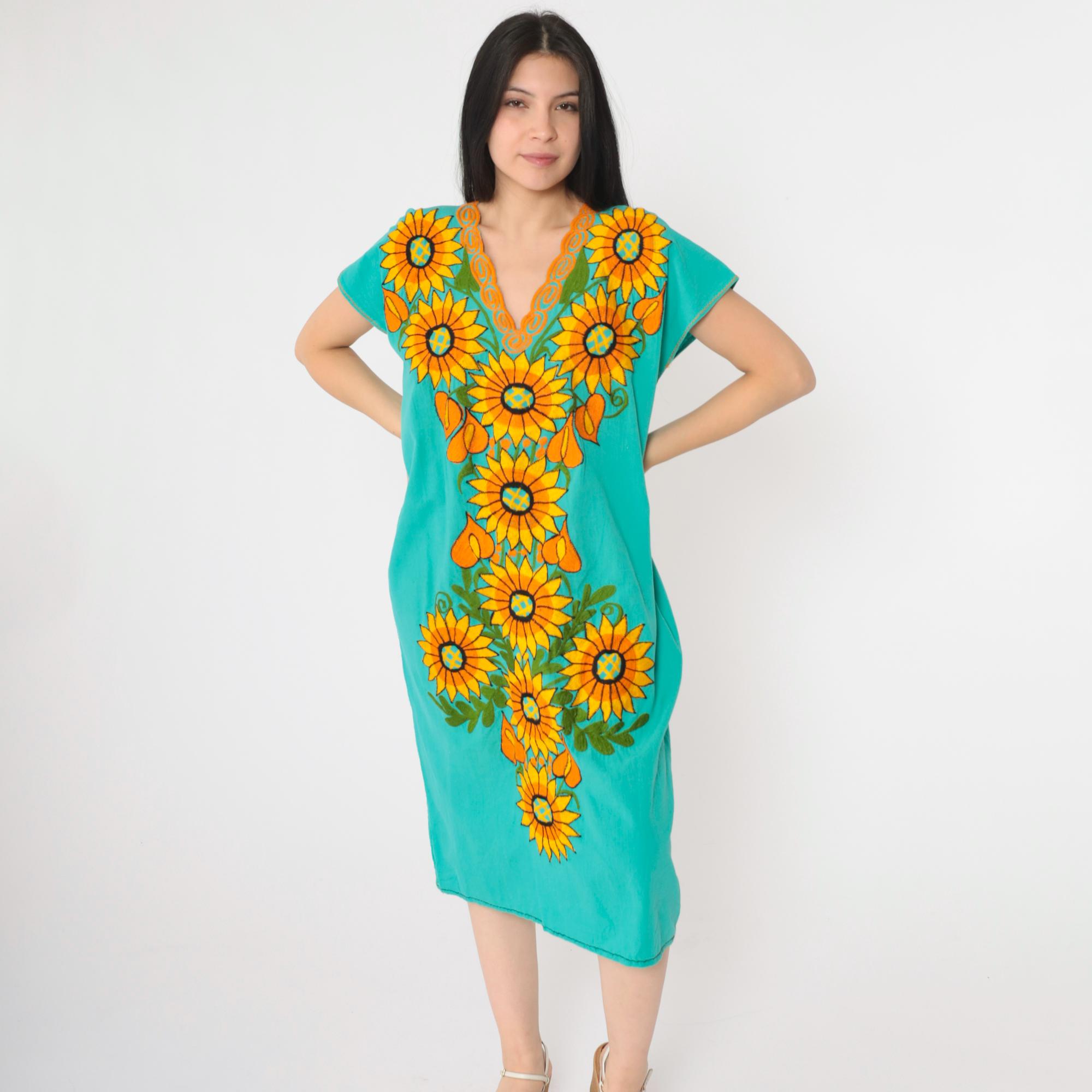 Vintage 90s Mexican dress in turquoise with embroidered sunflowers. Tunic cut with short sleeves. Midi length.