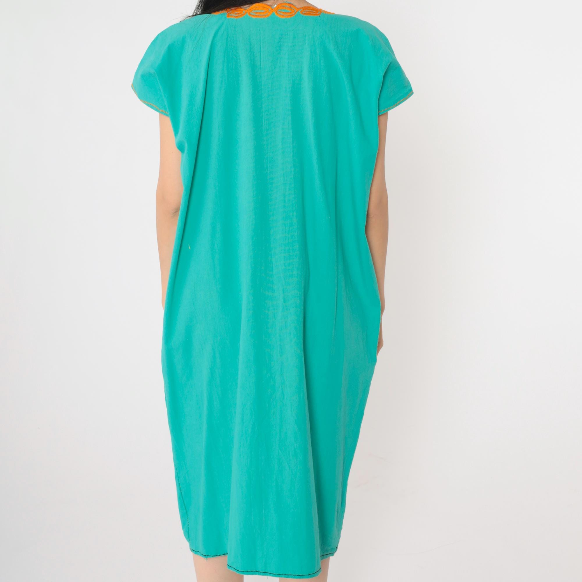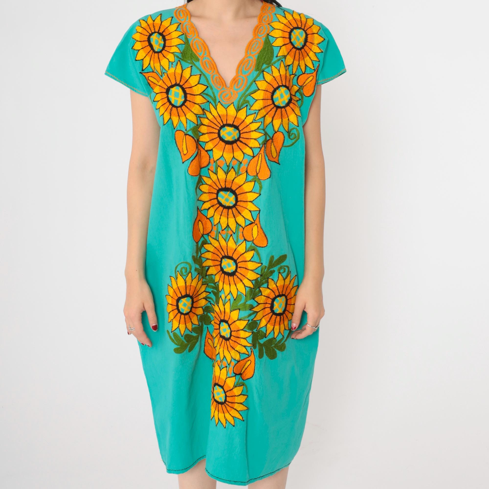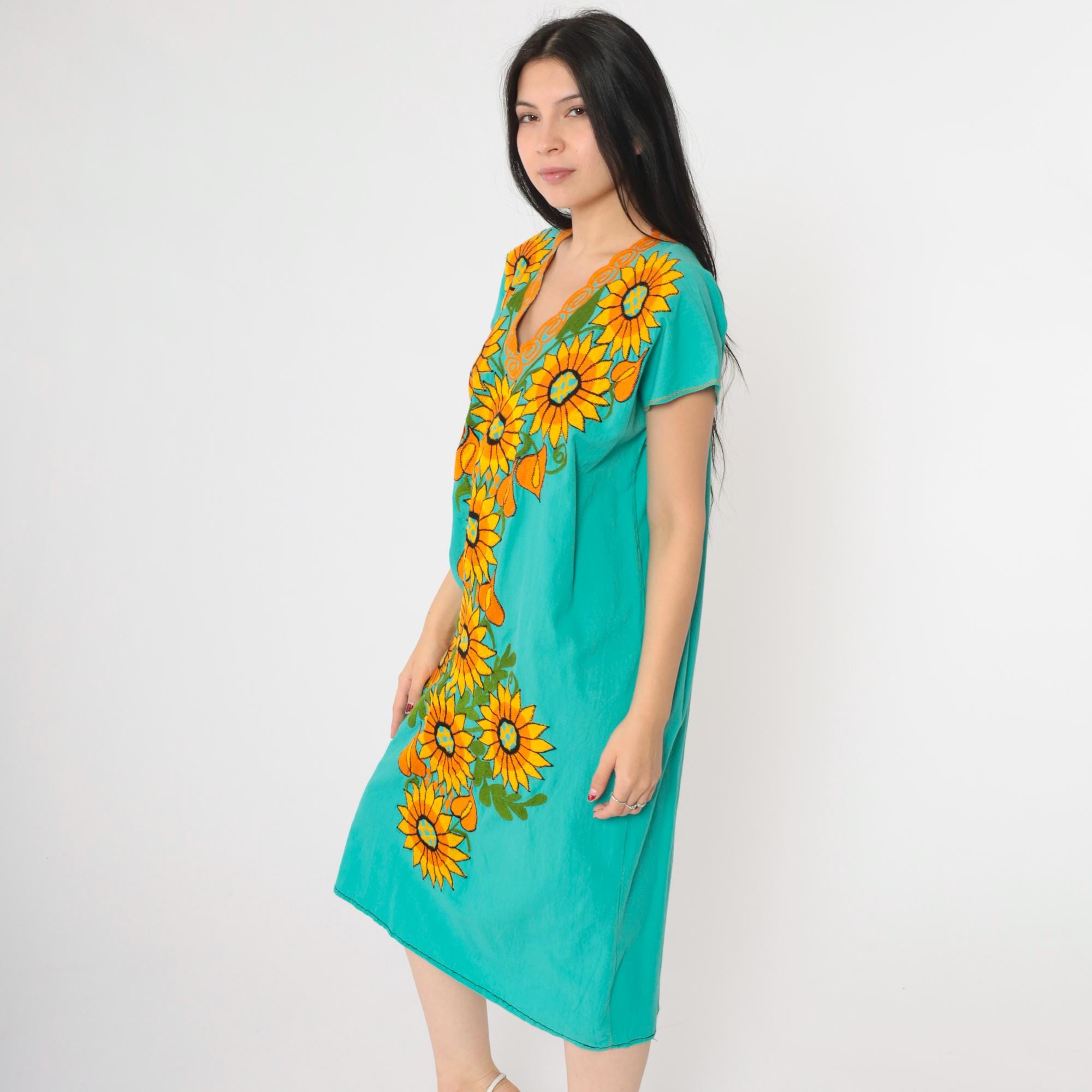 Vintage 90s Mexican dress in turquoise with embroidered sunflowers. Tunic cut with short sleeves. Midi length.