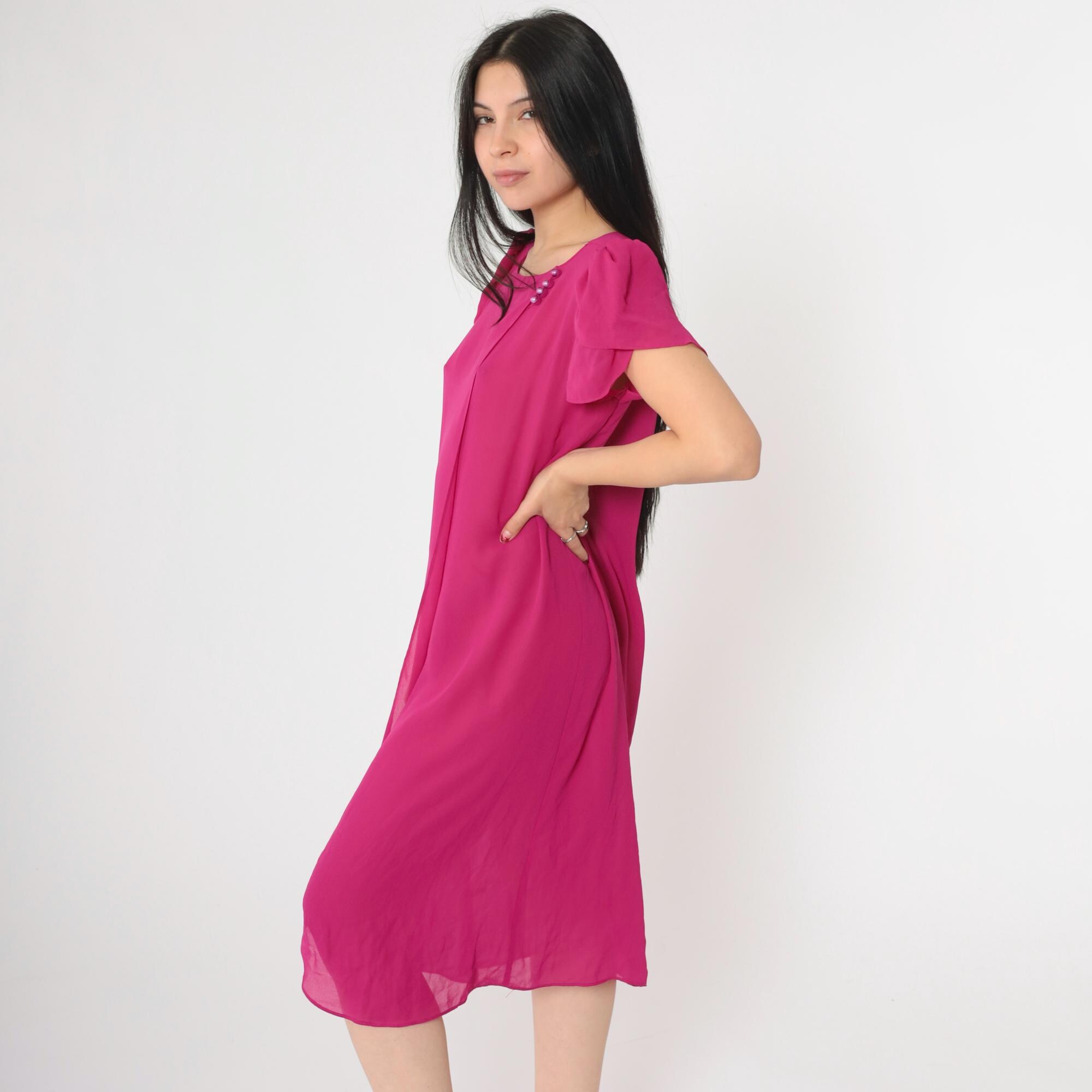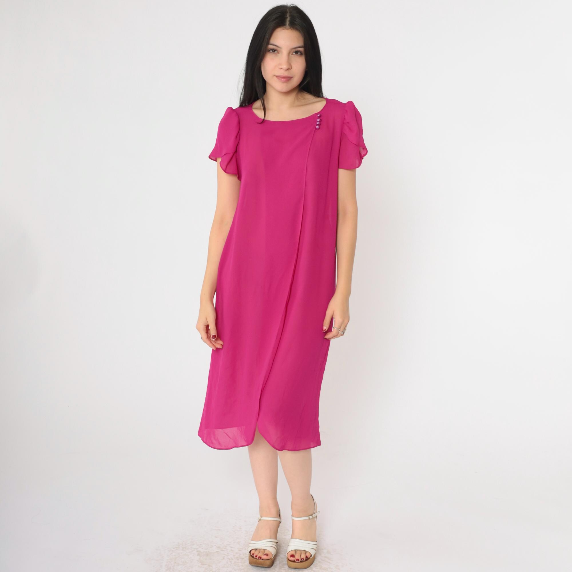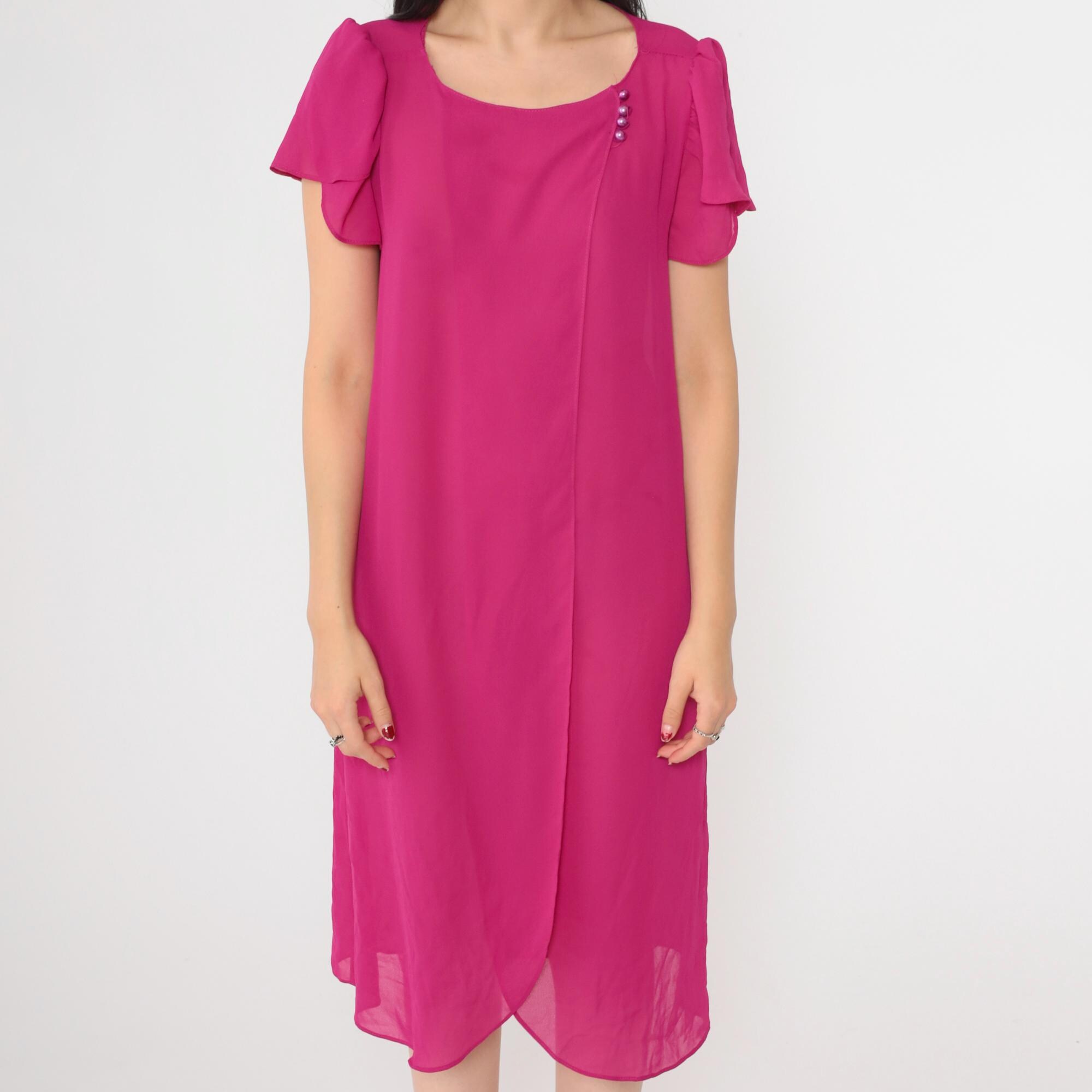 Vintage 80s dress in semi-sheer fuchsia chiffon with a shift cut and puff sleeves. Buttons at the chest.