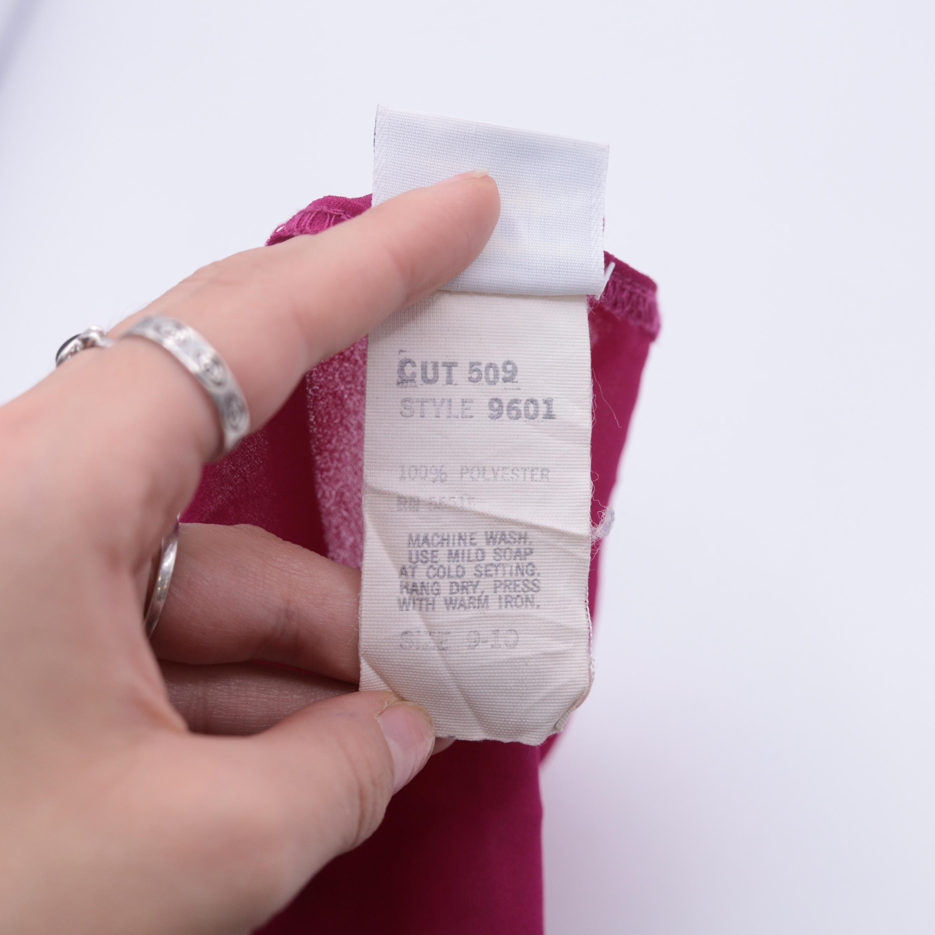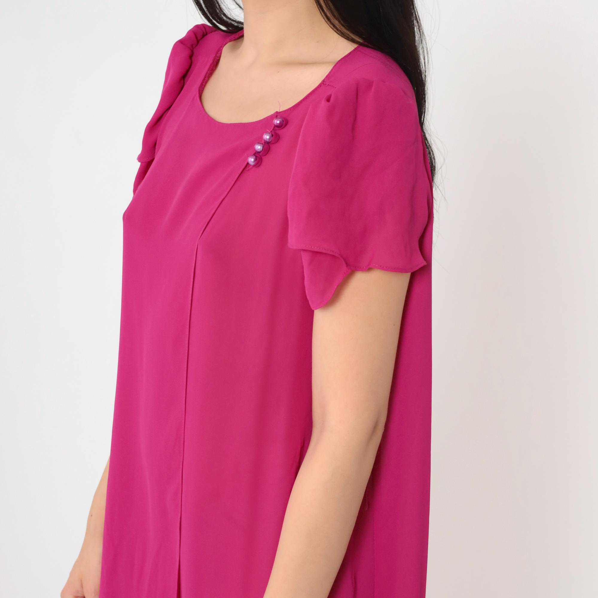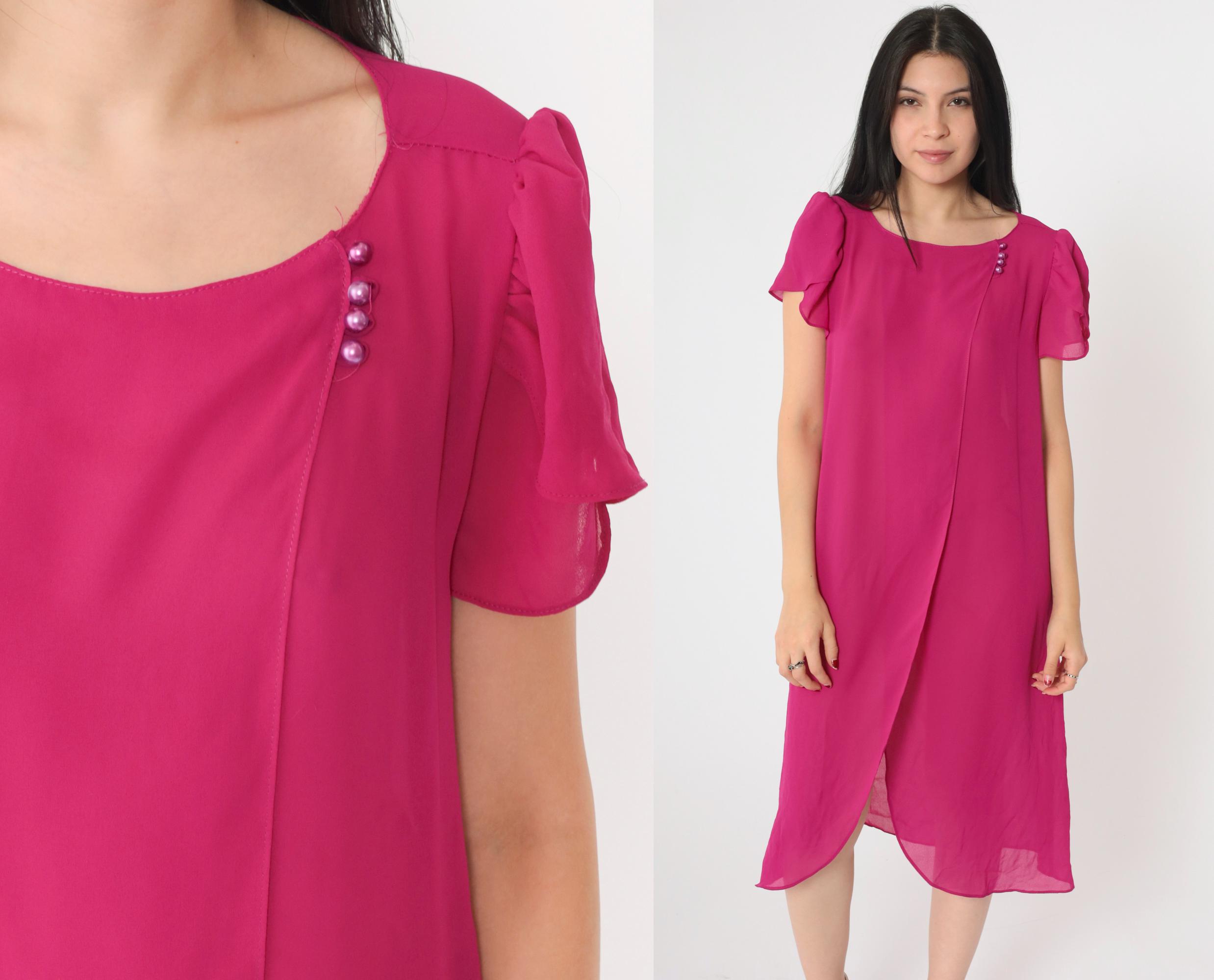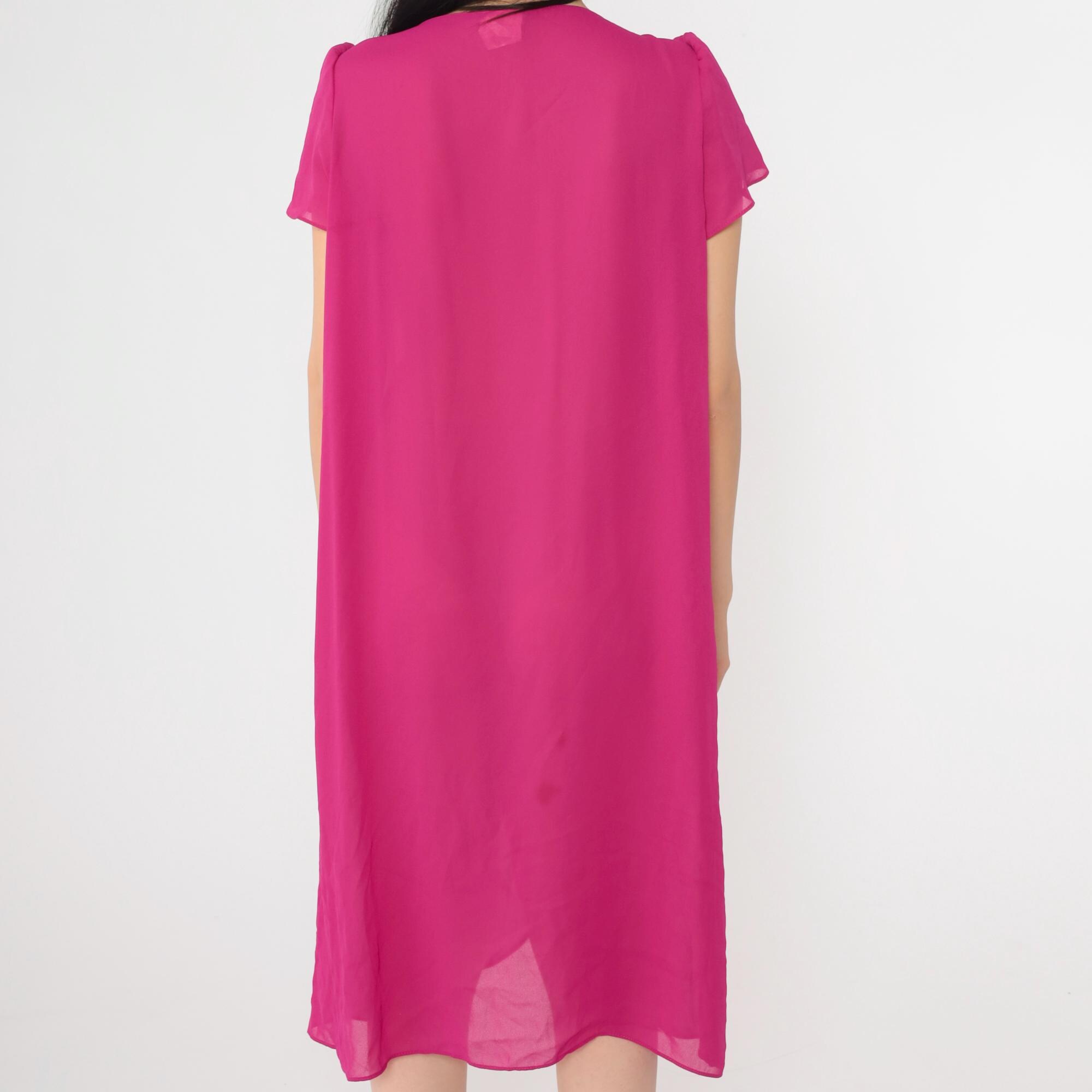 Vintage 80s dress in semi-sheer fuchsia chiffon with a shift cut and puff sleeves. Buttons at the chest.