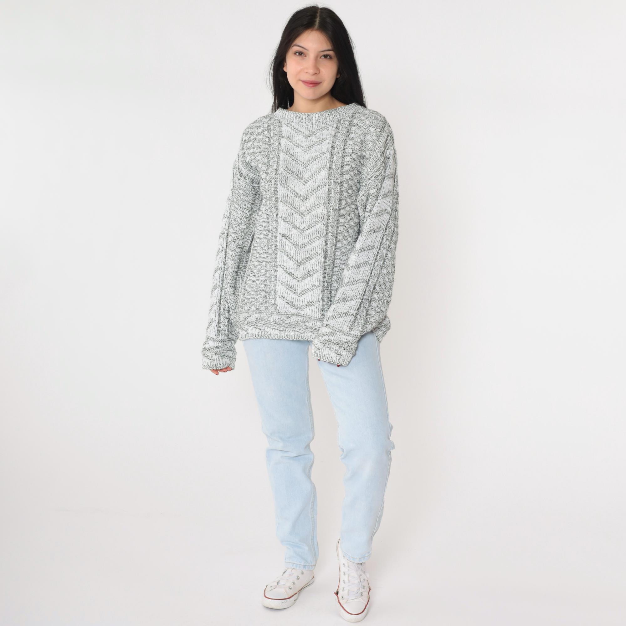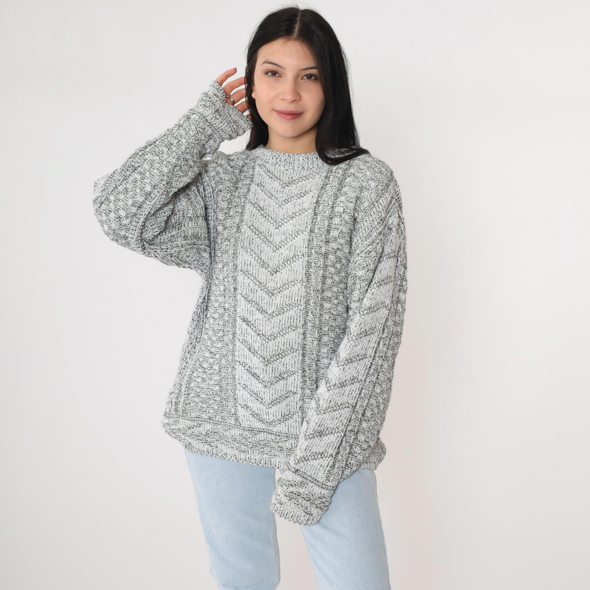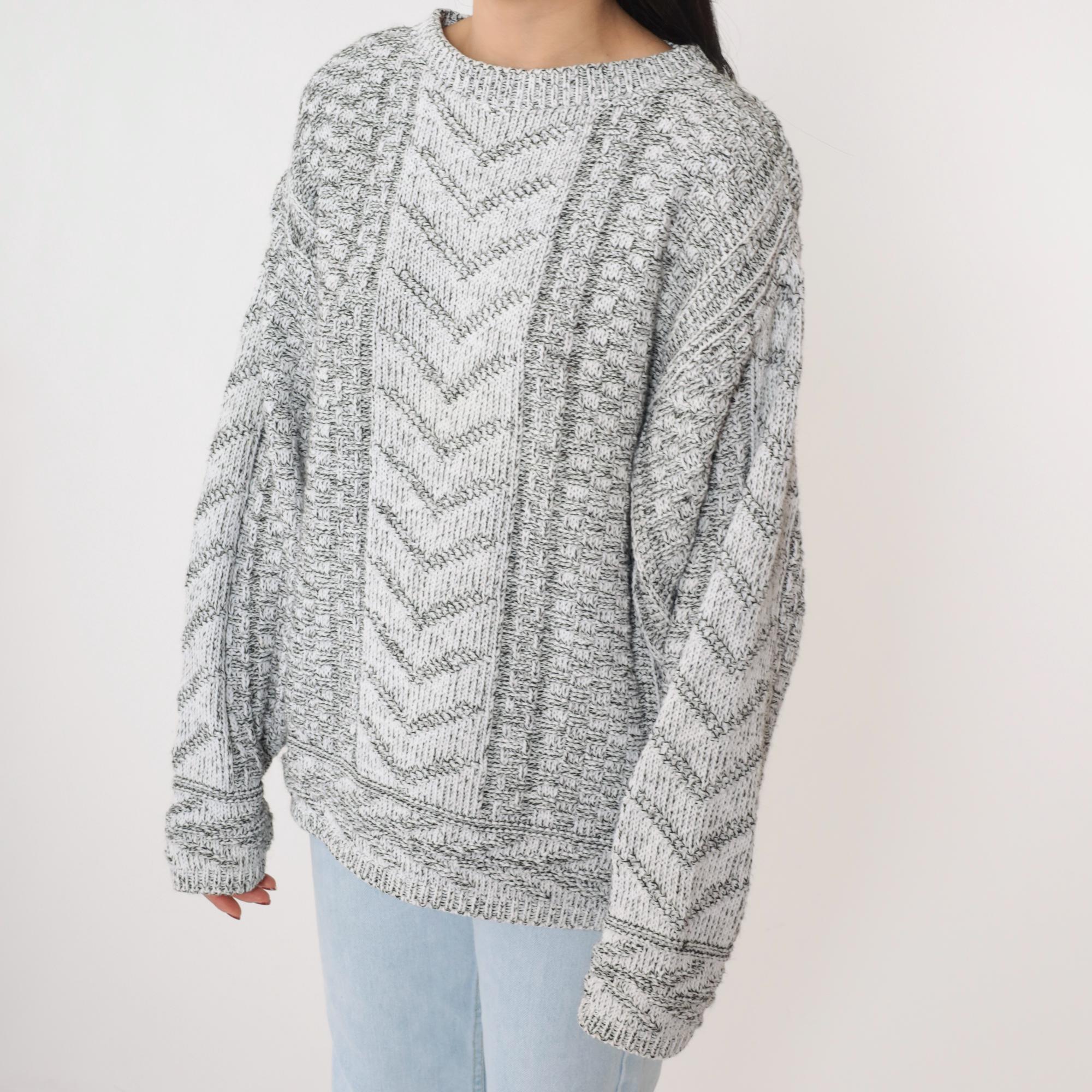 Vintage 90s sweater in a grey with a white chevron design. Pullover style with a crewneck.