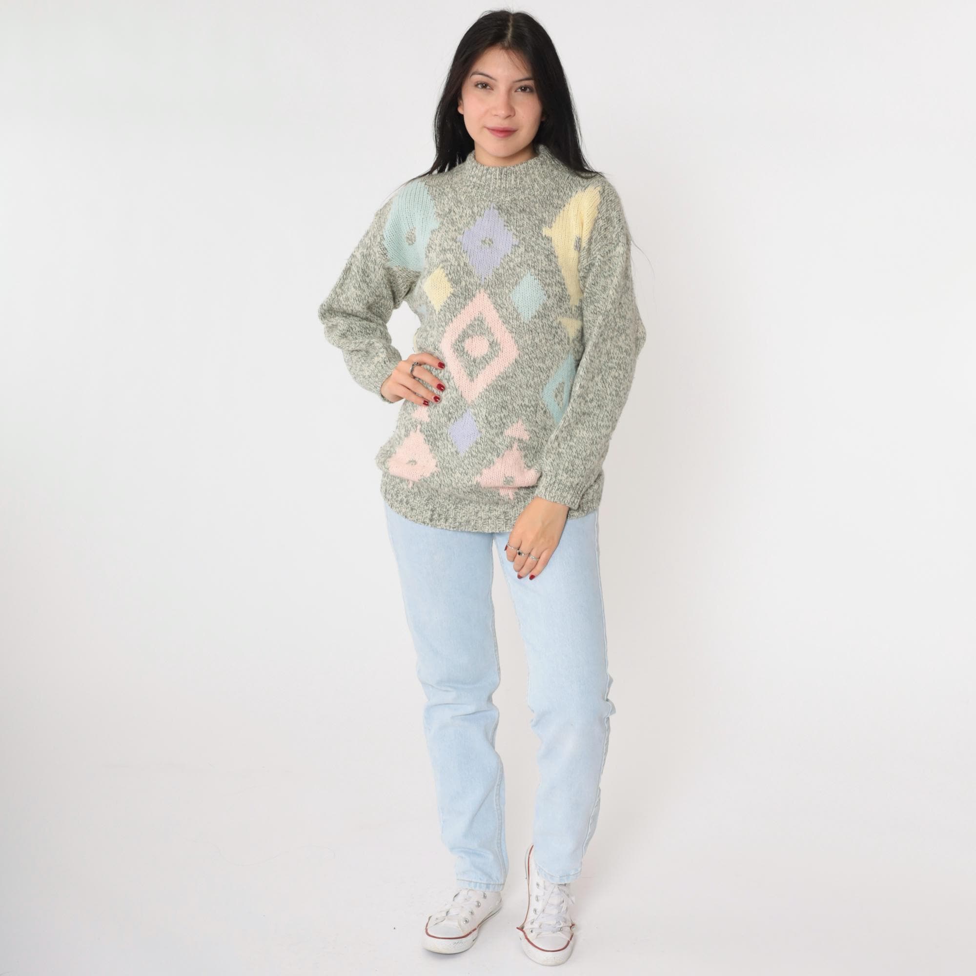 Vintage 80s sweater in flecked grey with a pastel geometric print and a mock neck.
