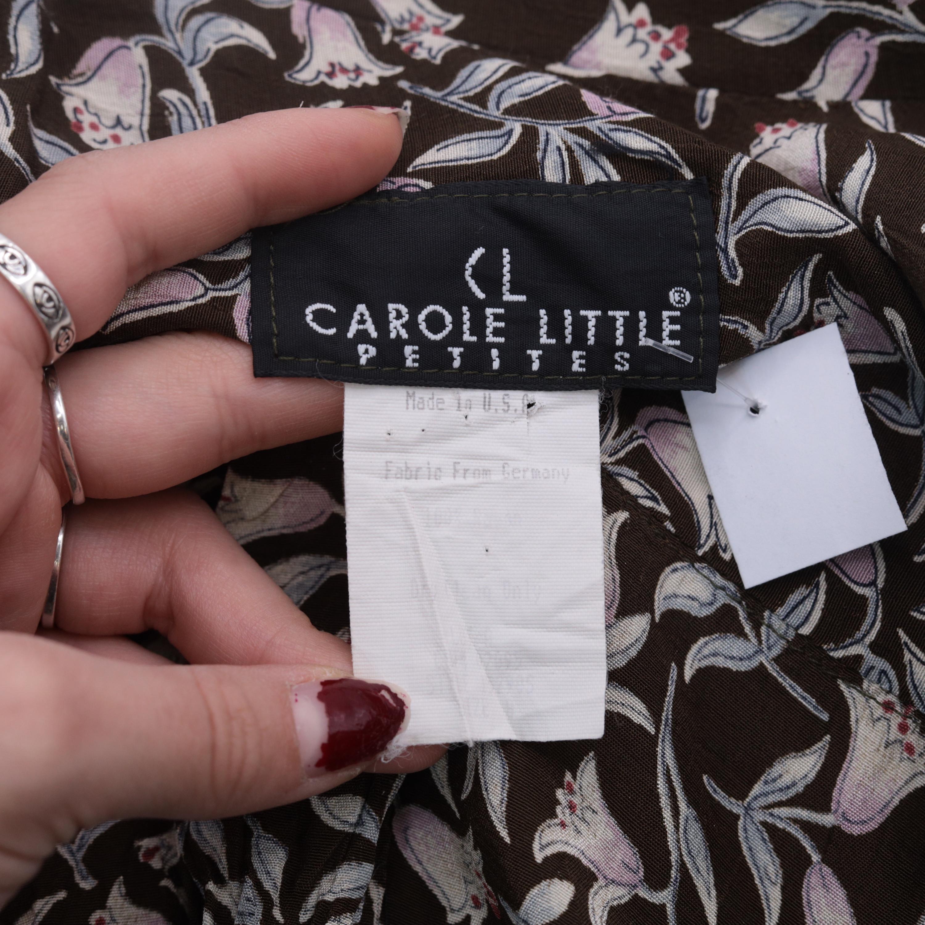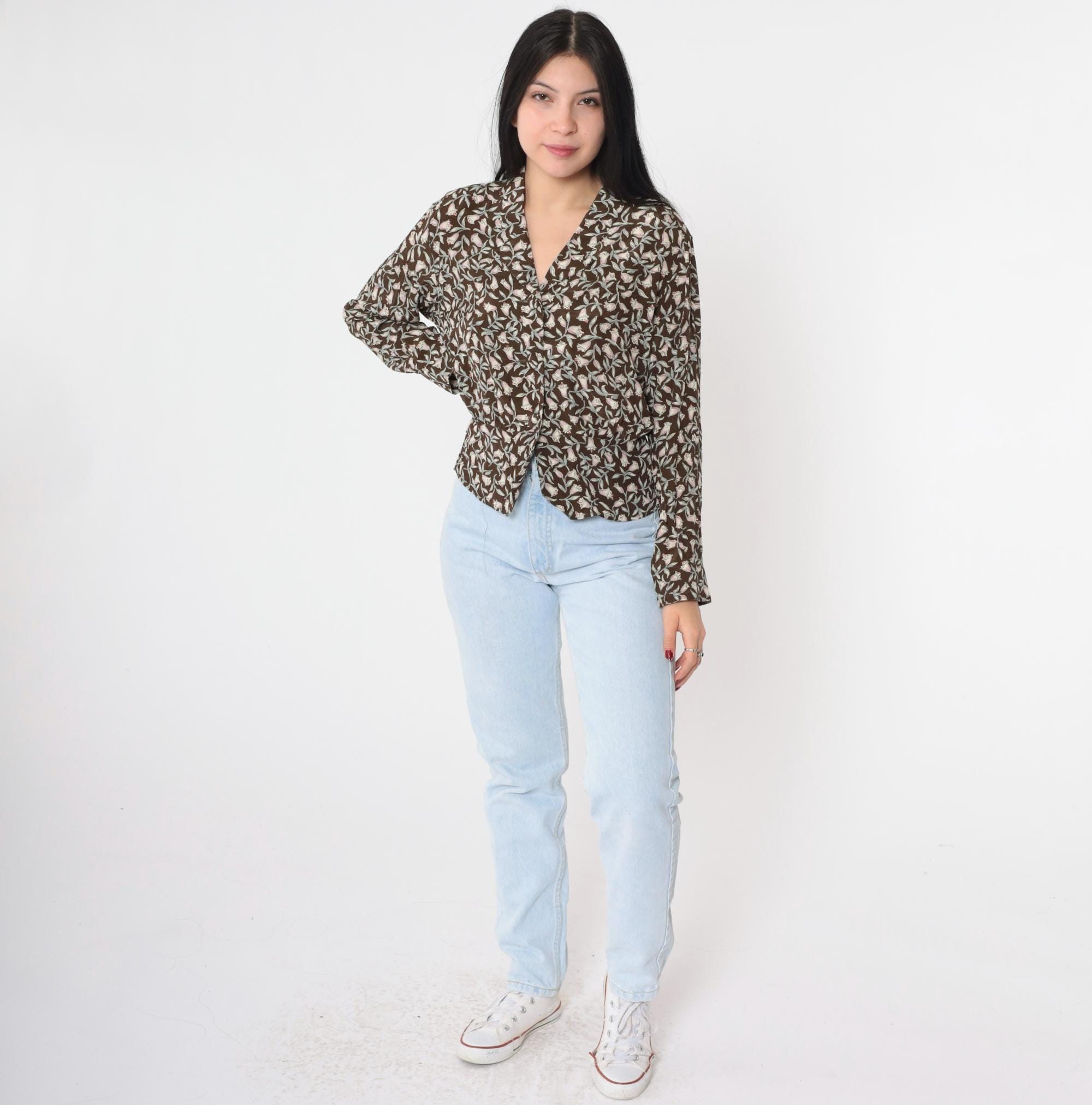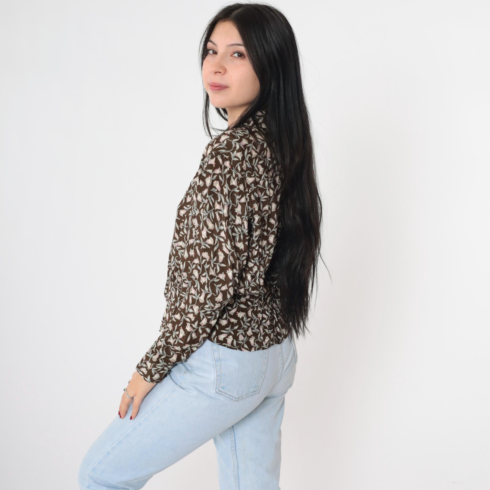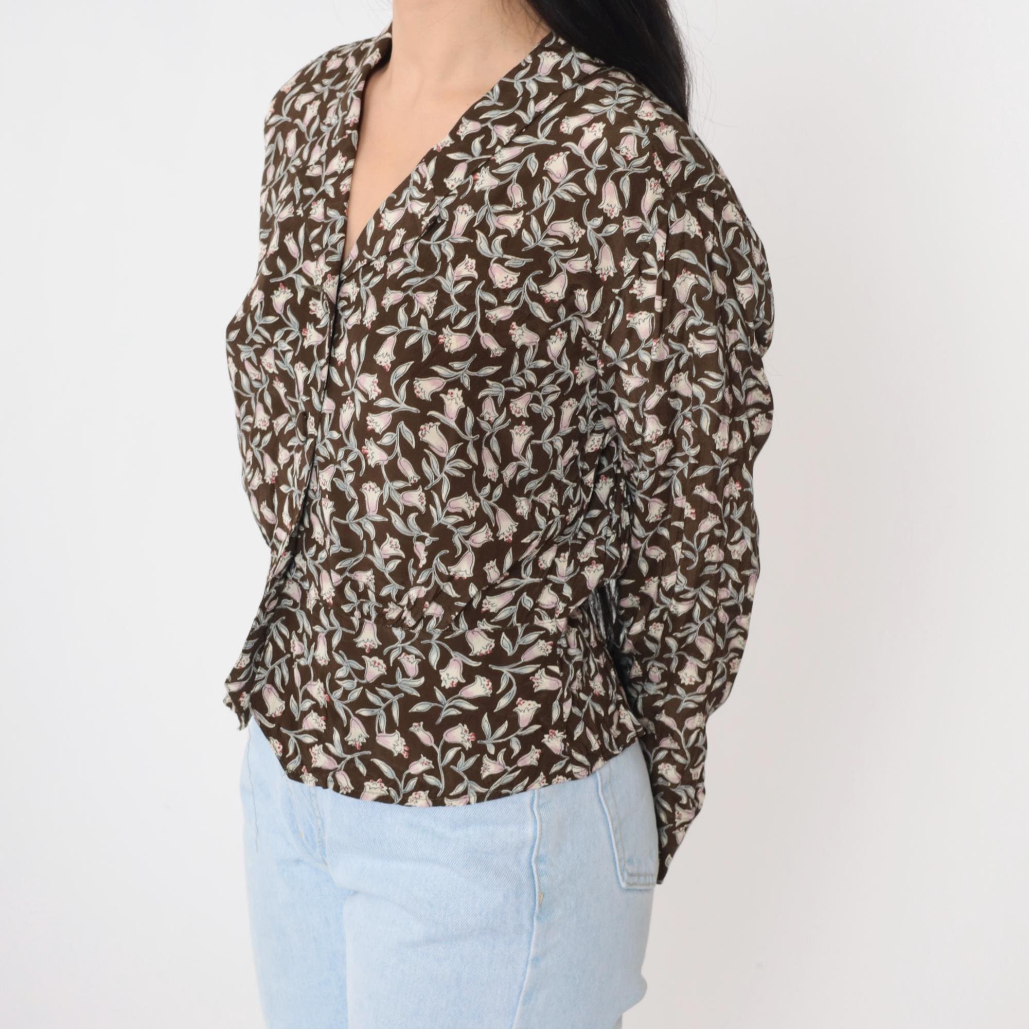 Vintage 90s shirt in brown with a floral print. It has long sleeves, a peplum, and buttons up the front.