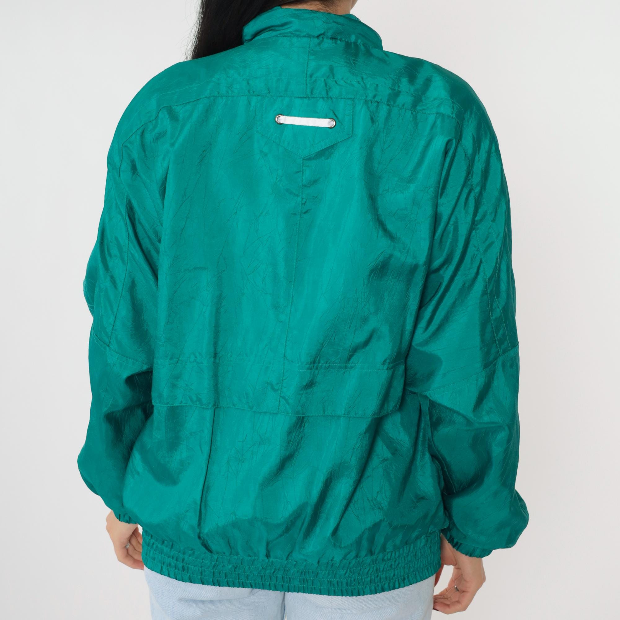 Vintage 80s 90s windbreaker jacket in teal green with cargo pockets. It features an elastic waistband and cuffs, and a full zipper closure up the front.