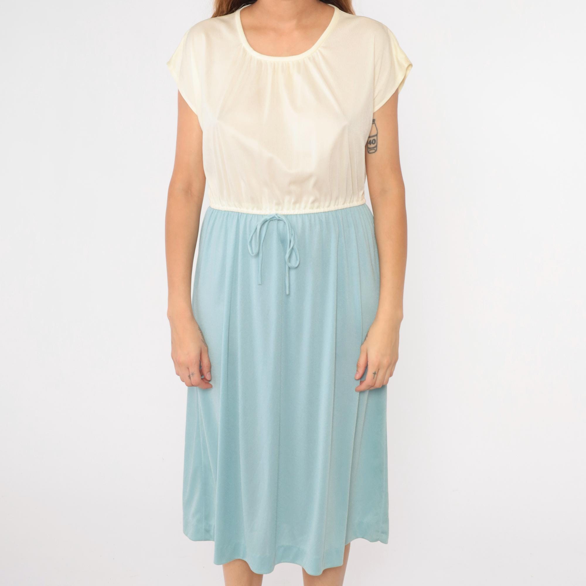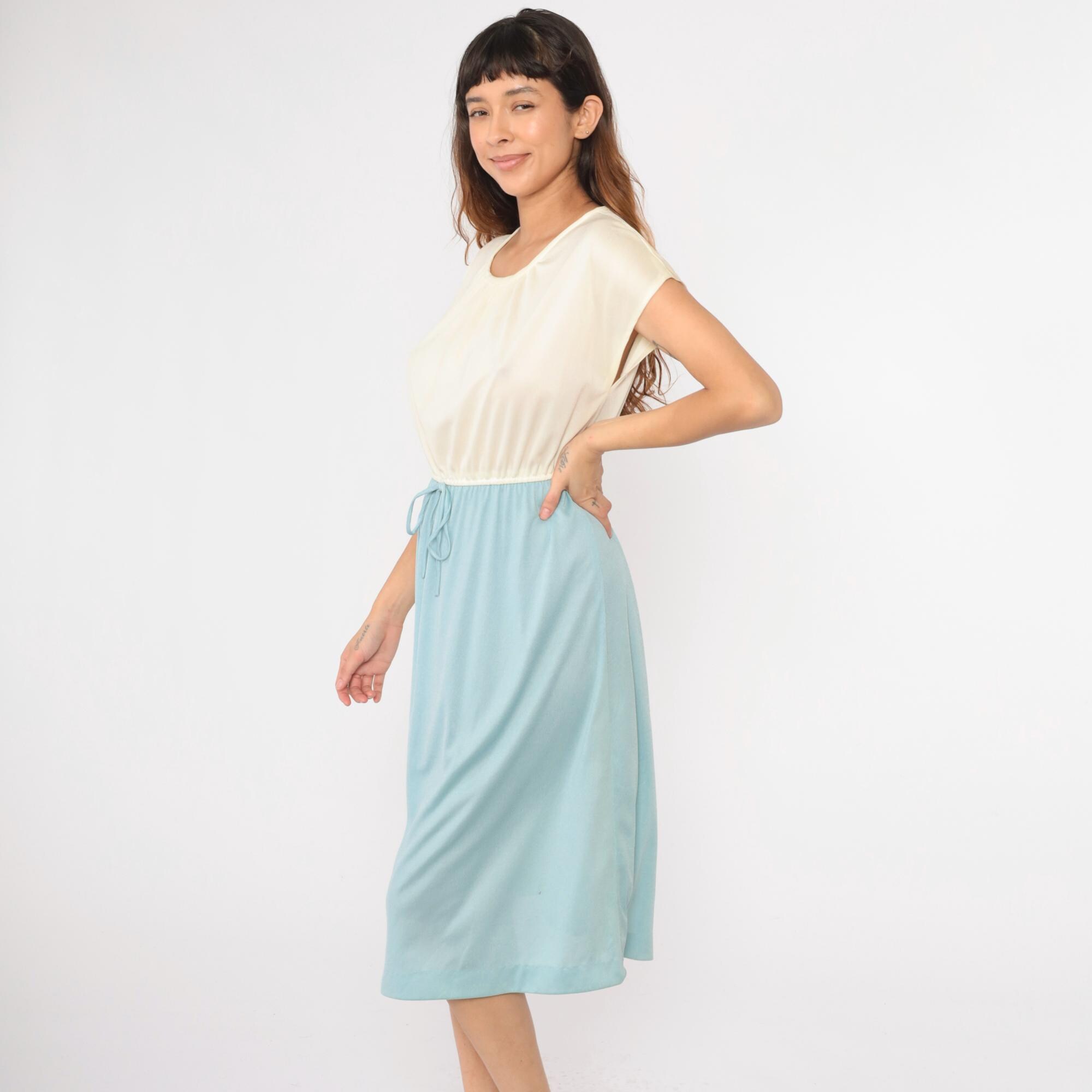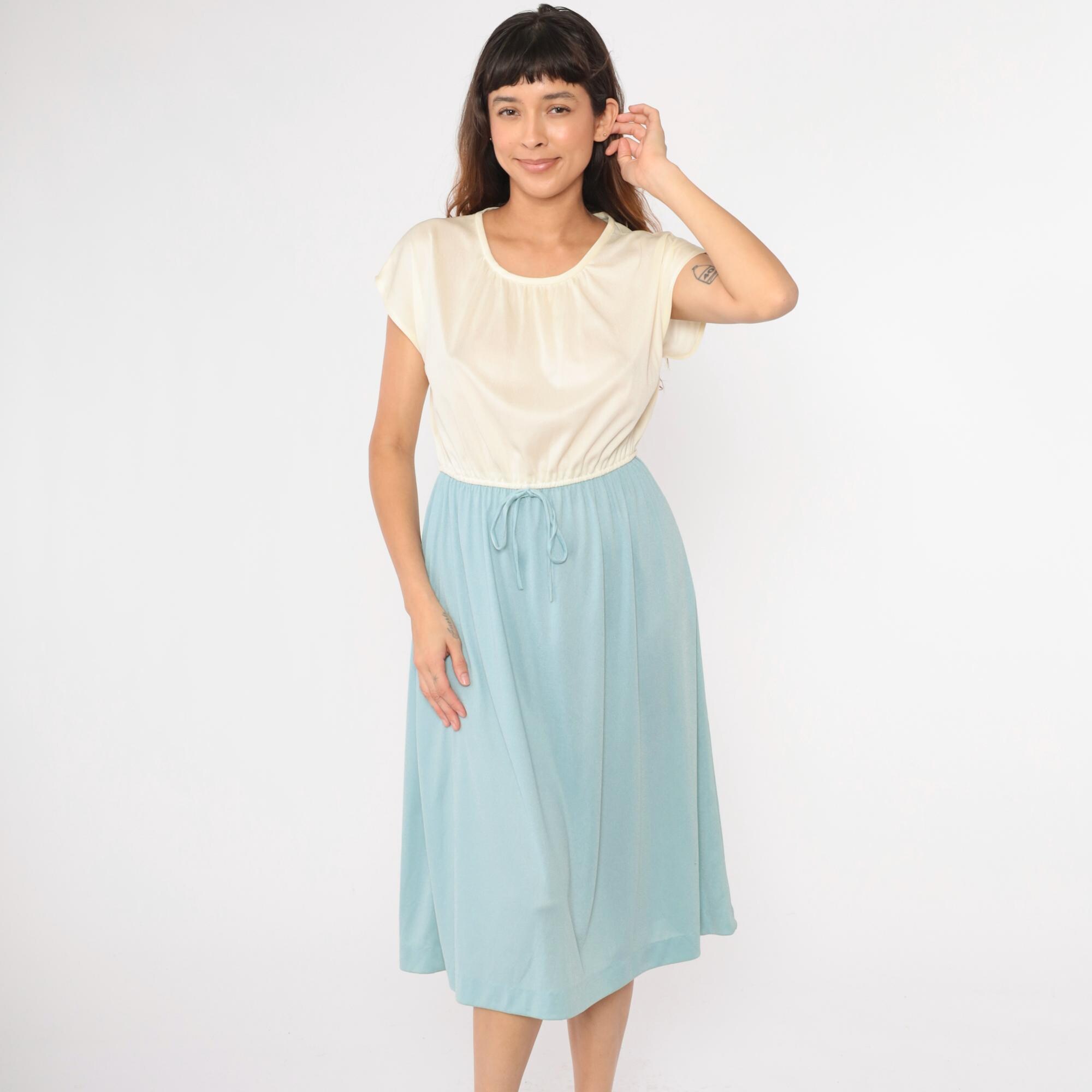 Vintage 70s dress with a white bodice and a baby blue skirt. It features short sleeves, an elastic waist, and a round neck. Midi length.