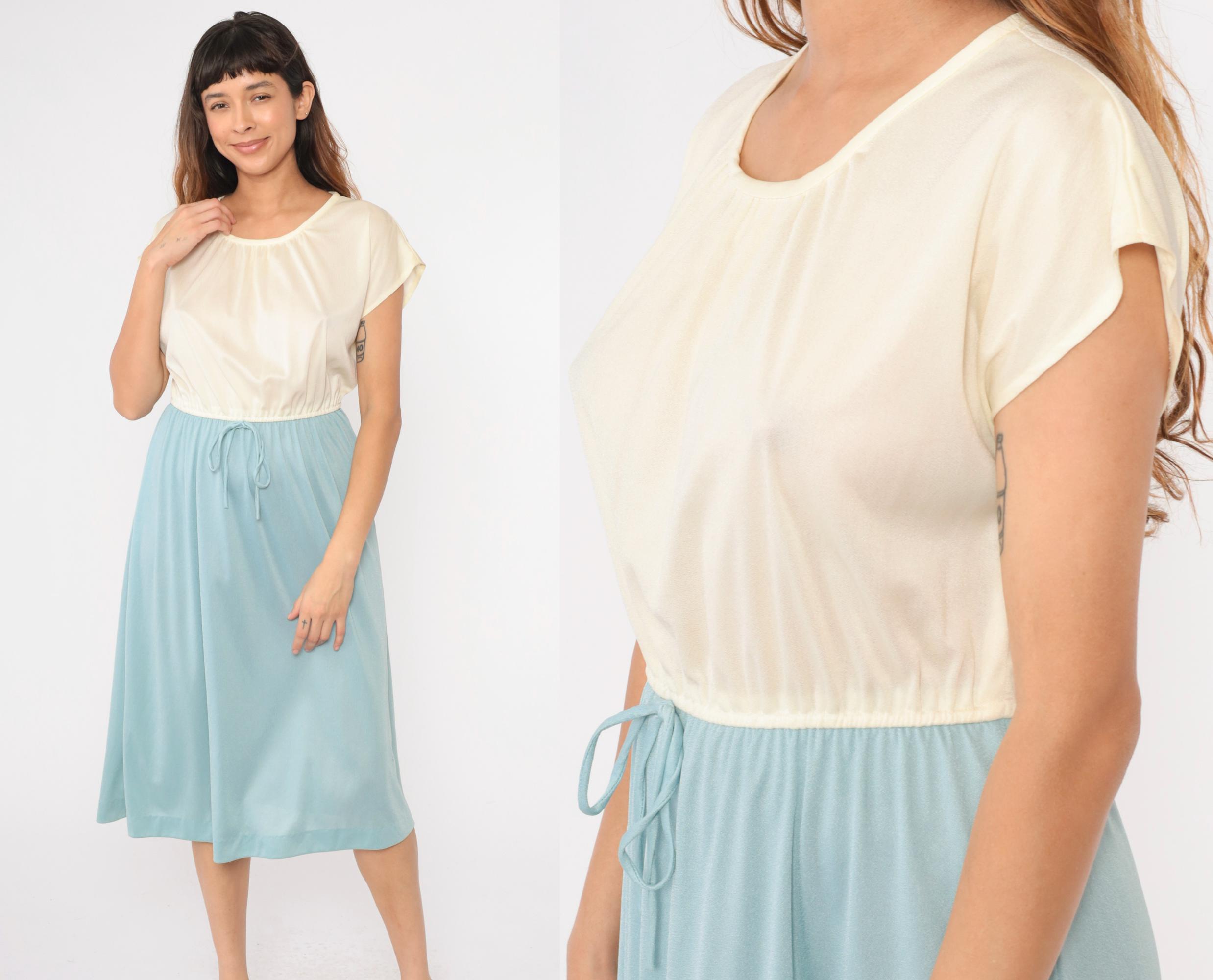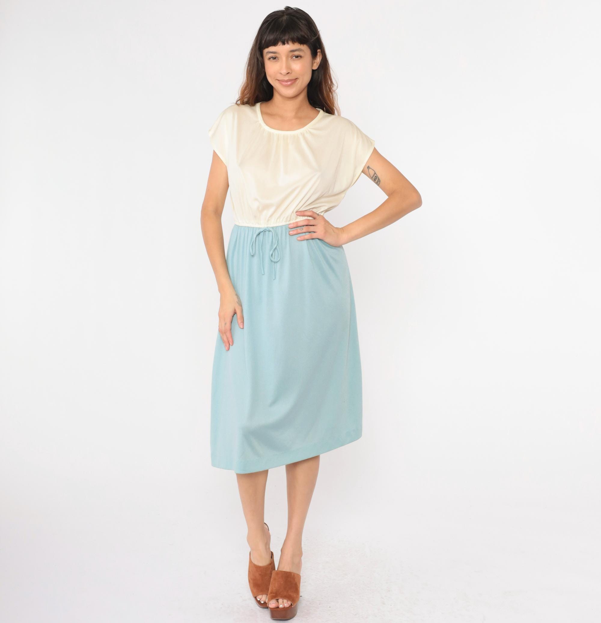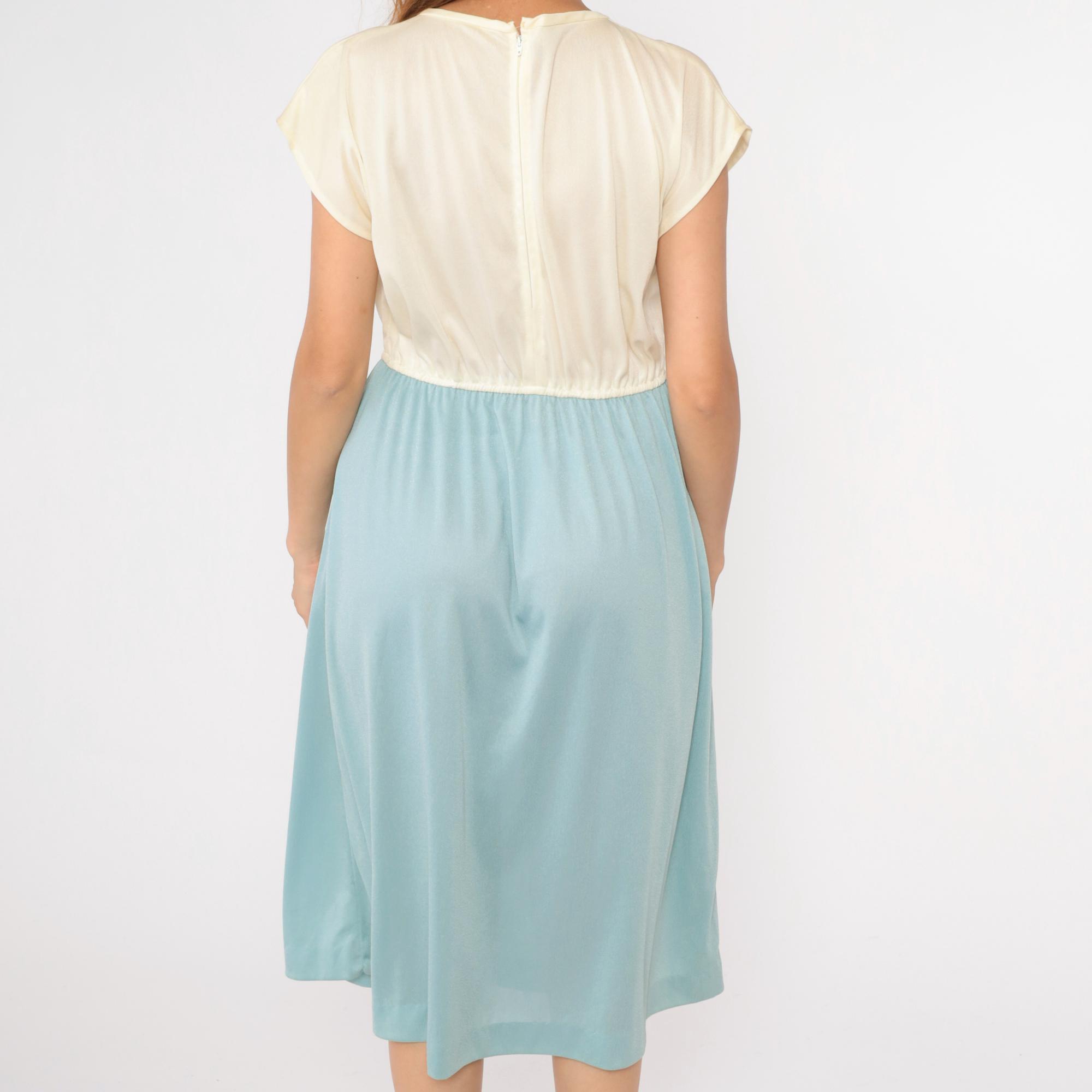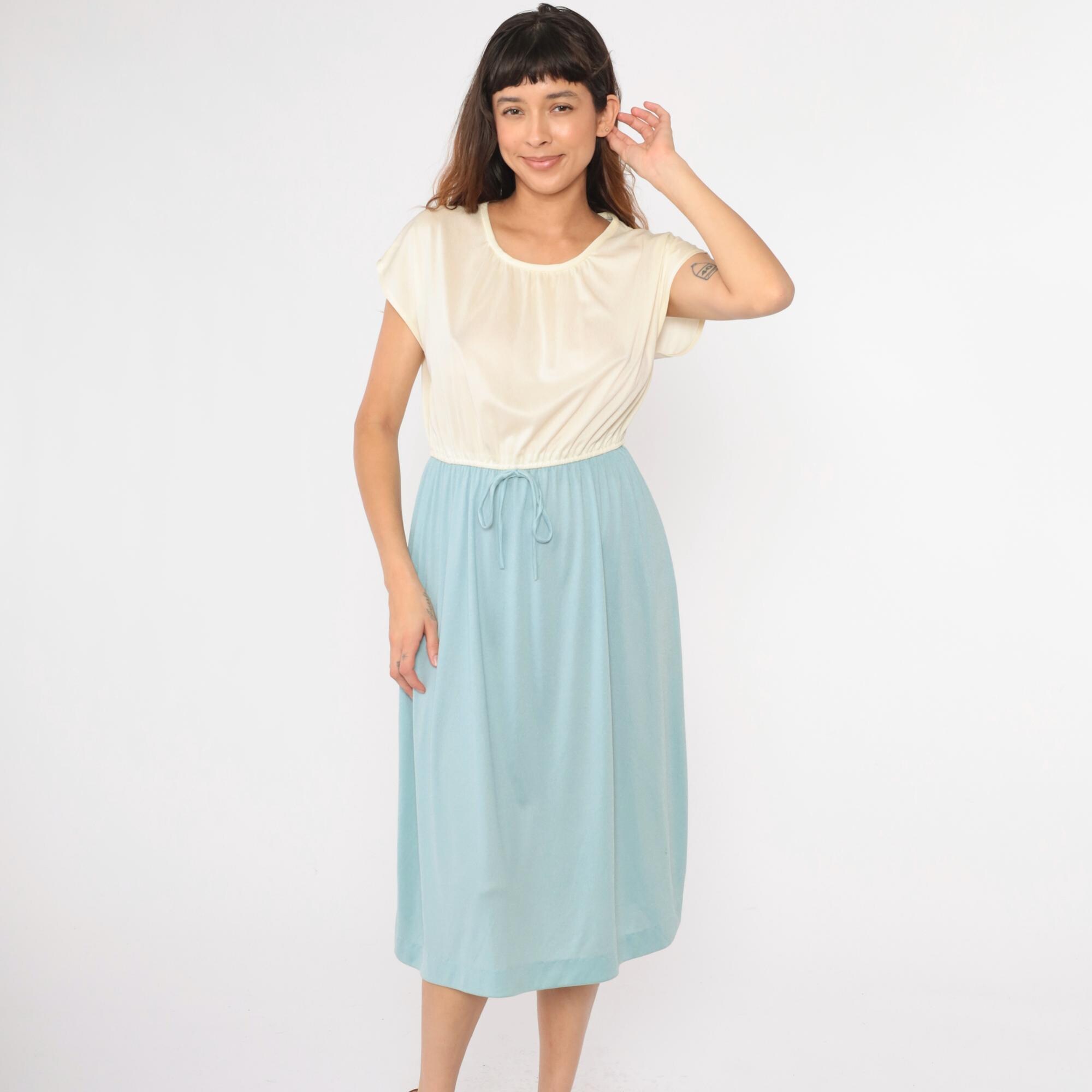 Vintage 70s dress with a white bodice and a baby blue skirt. It features short sleeves, an elastic waist, and a round neck. Midi length.