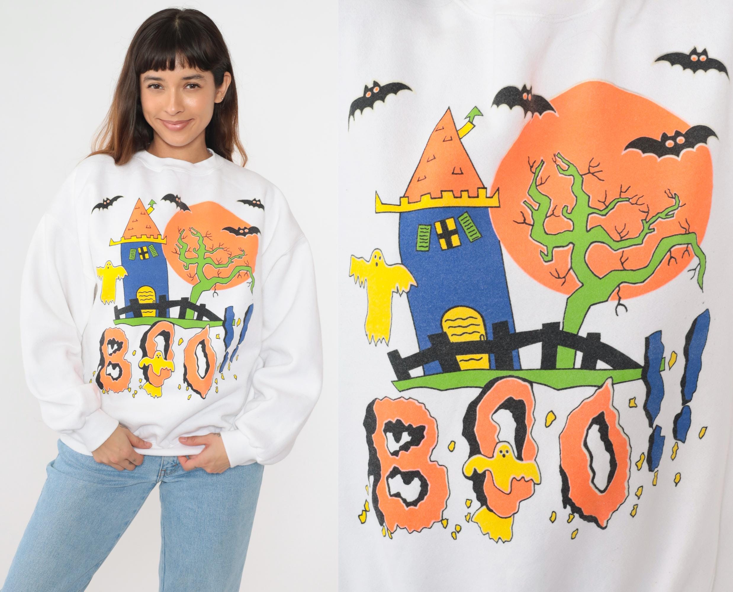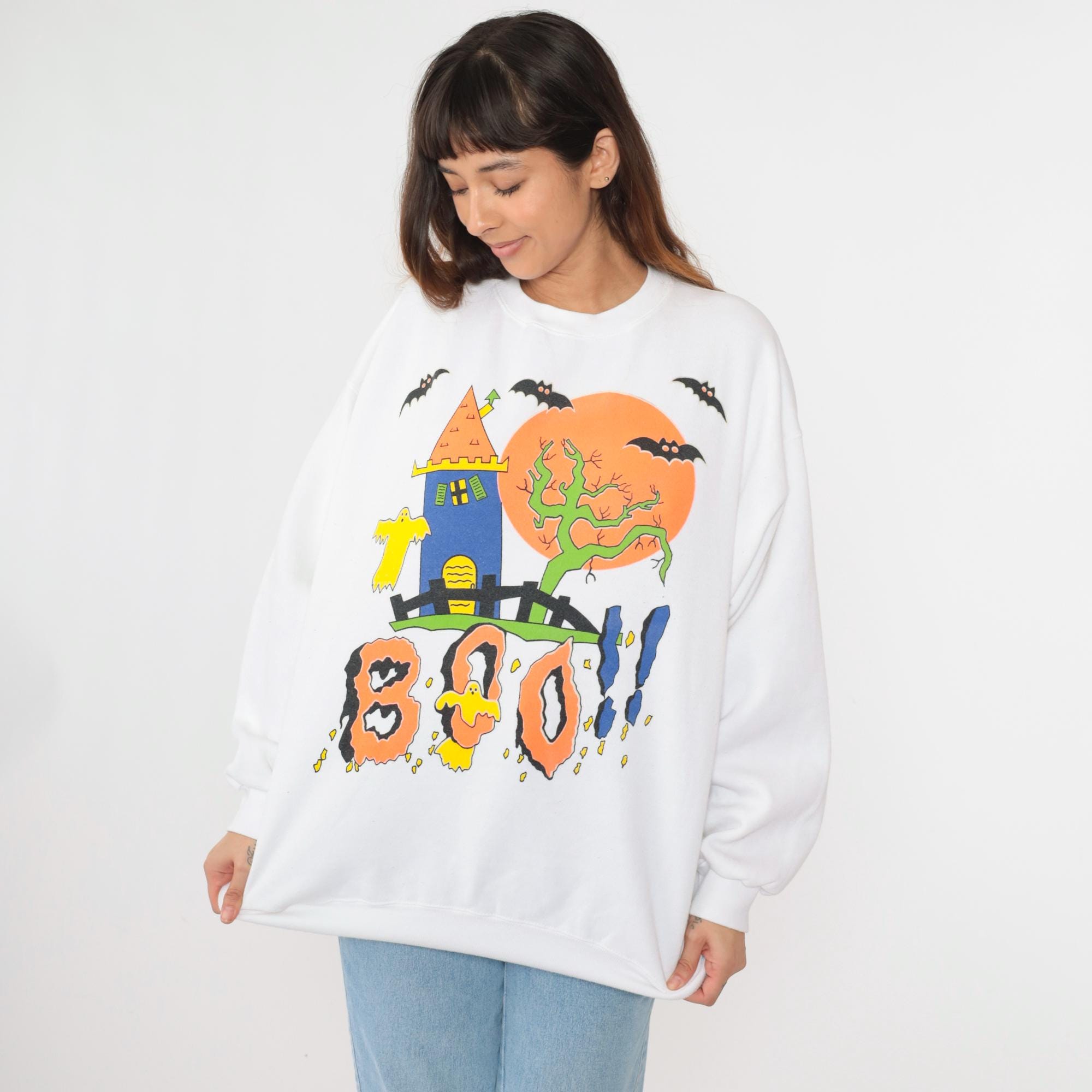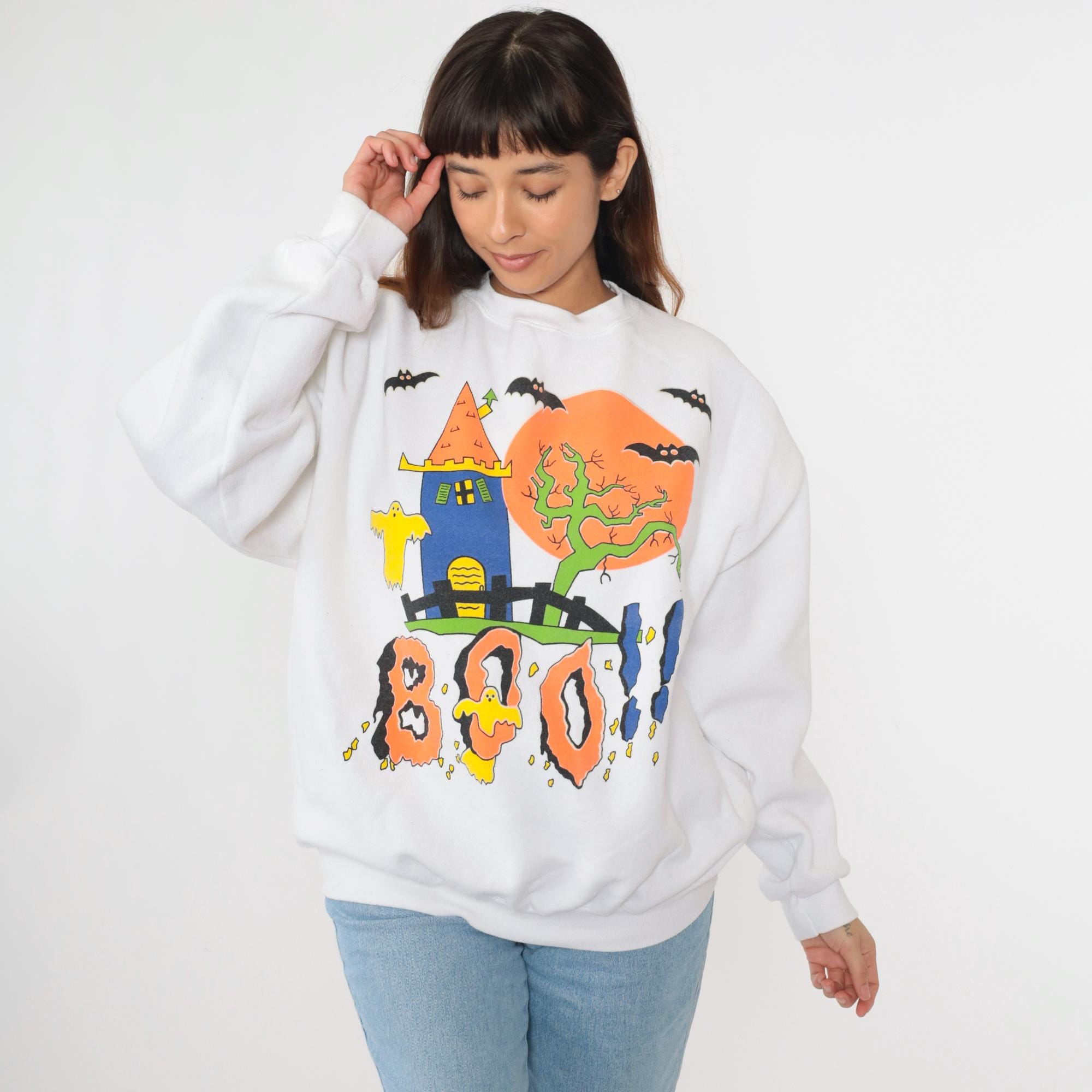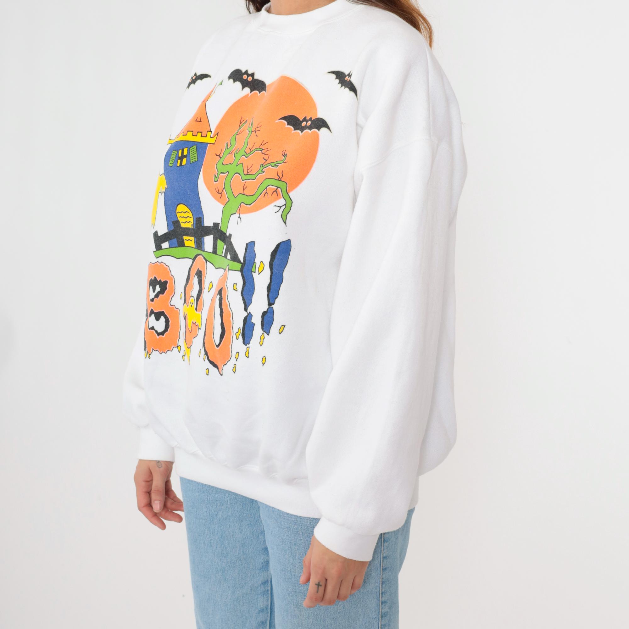 Vintage 90s sweatshirt in white with a Halloween haunted house graphic with Boo!! on the front.