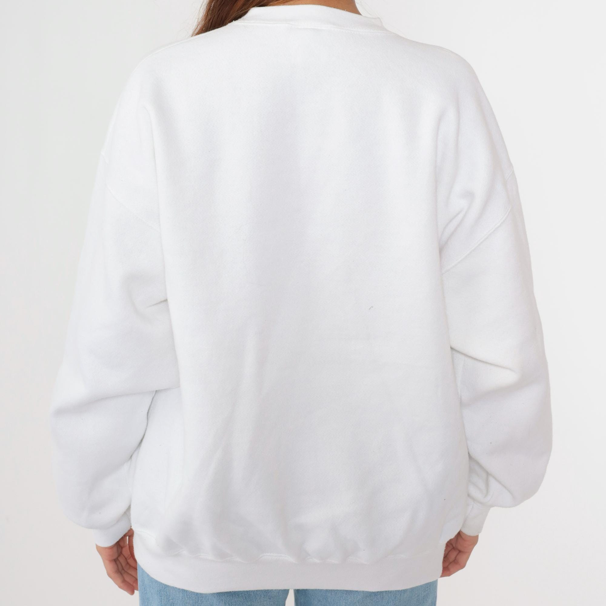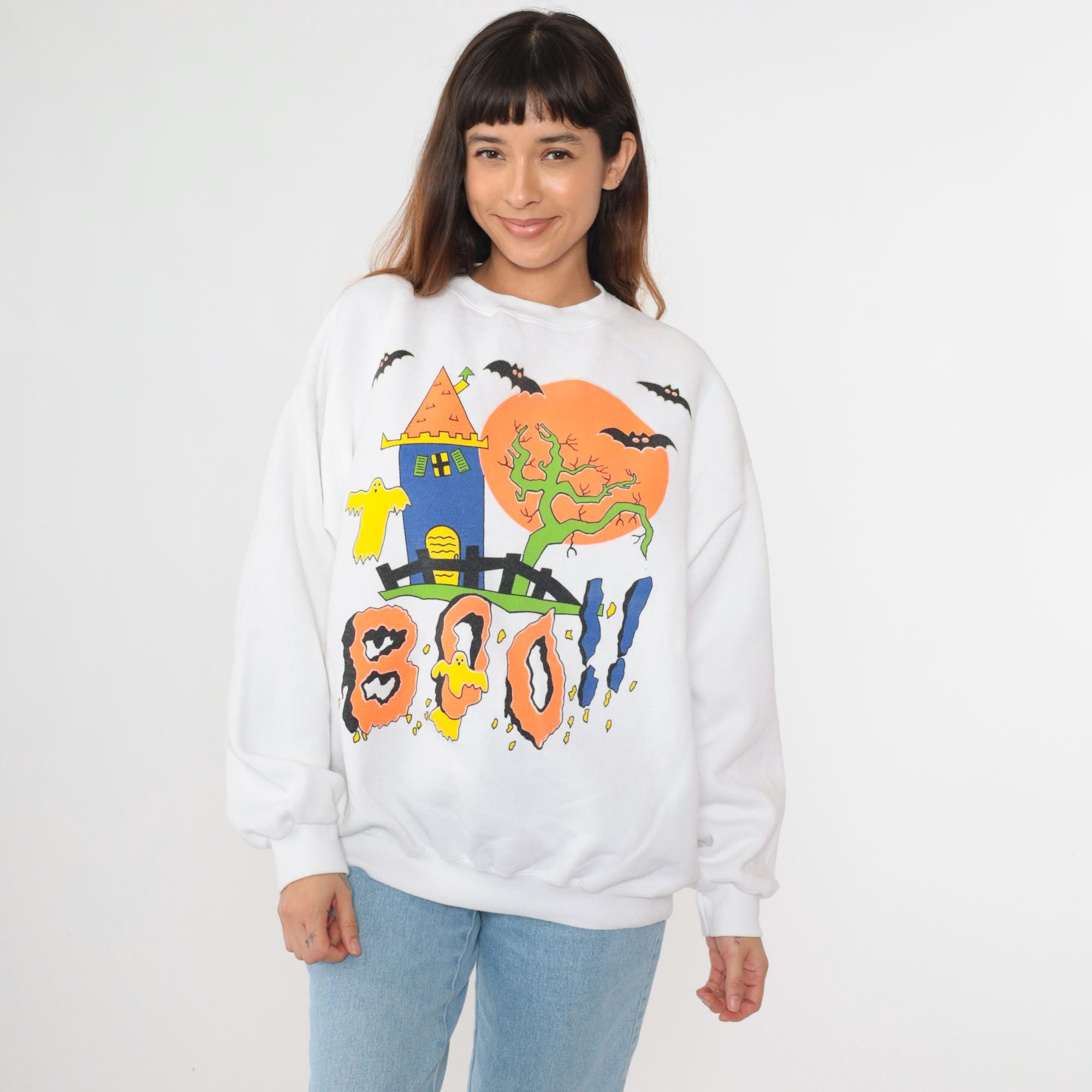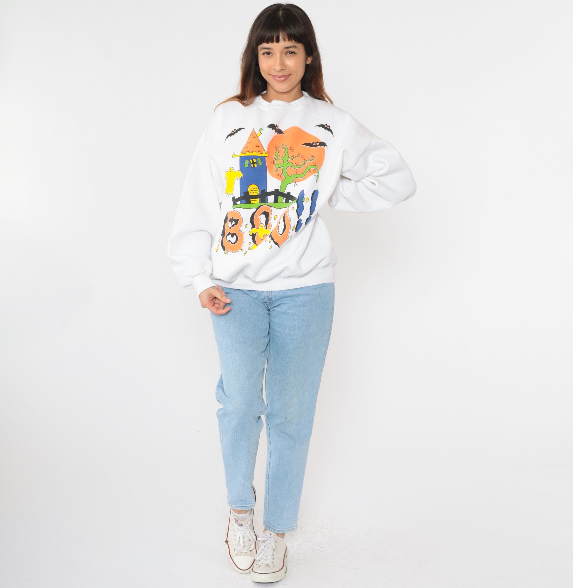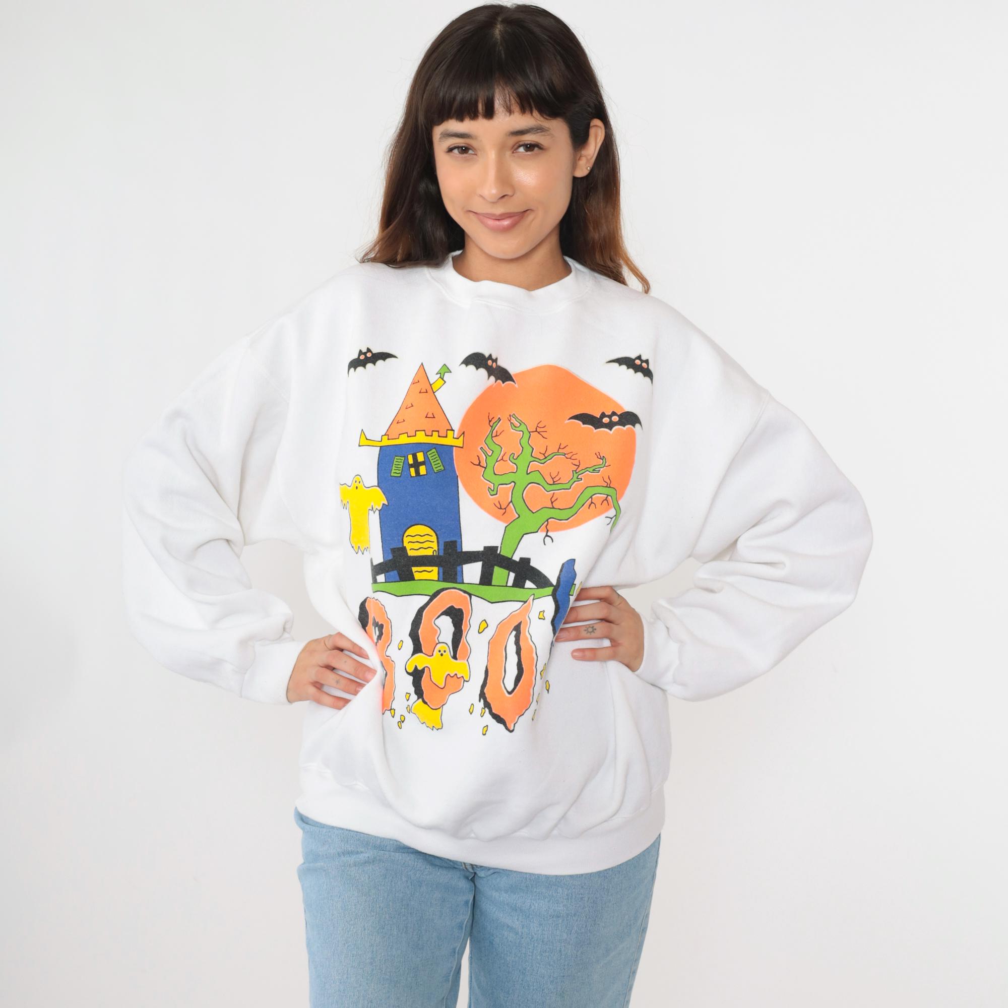 Vintage 90s sweatshirt in white with a Halloween haunted house graphic with Boo!! on the front.