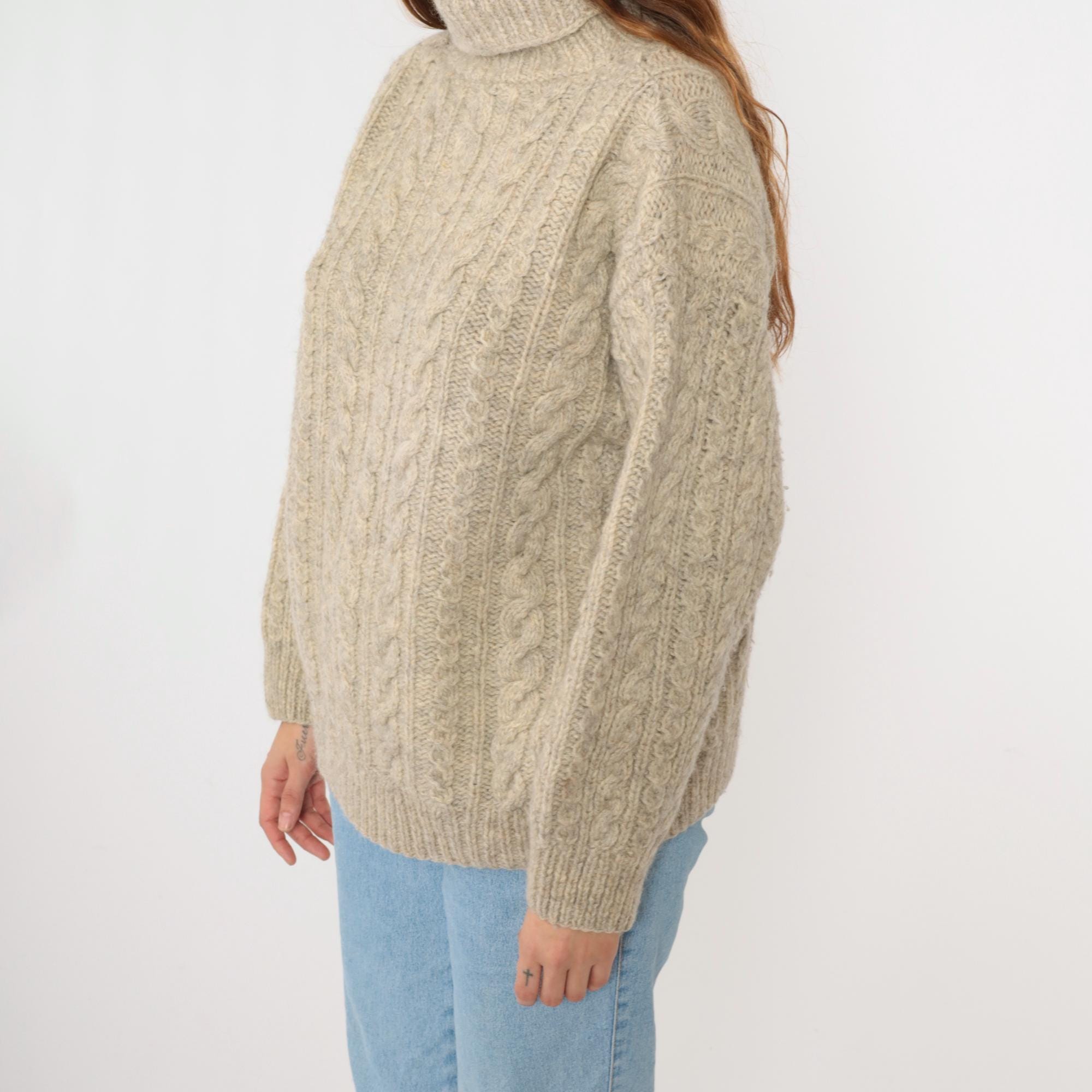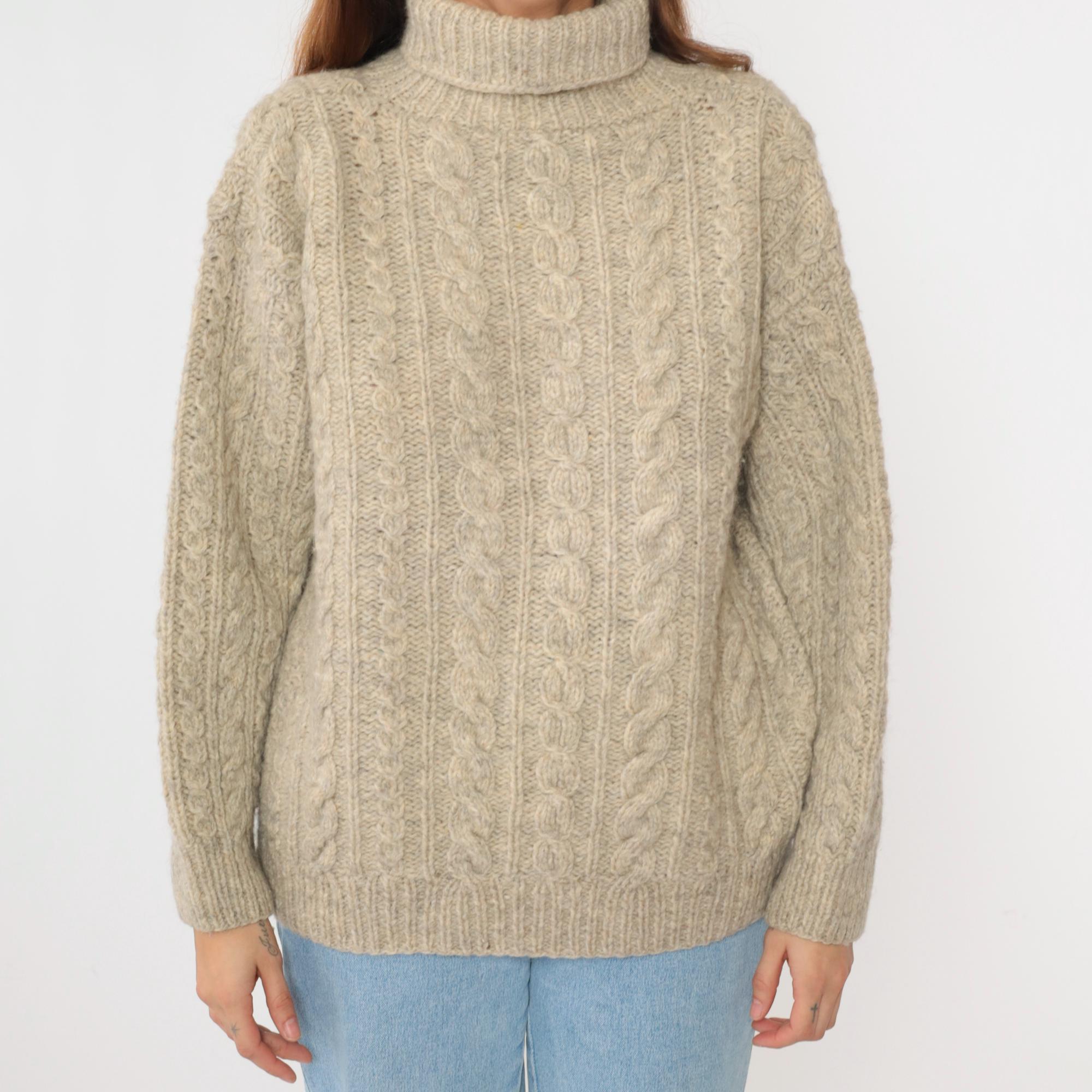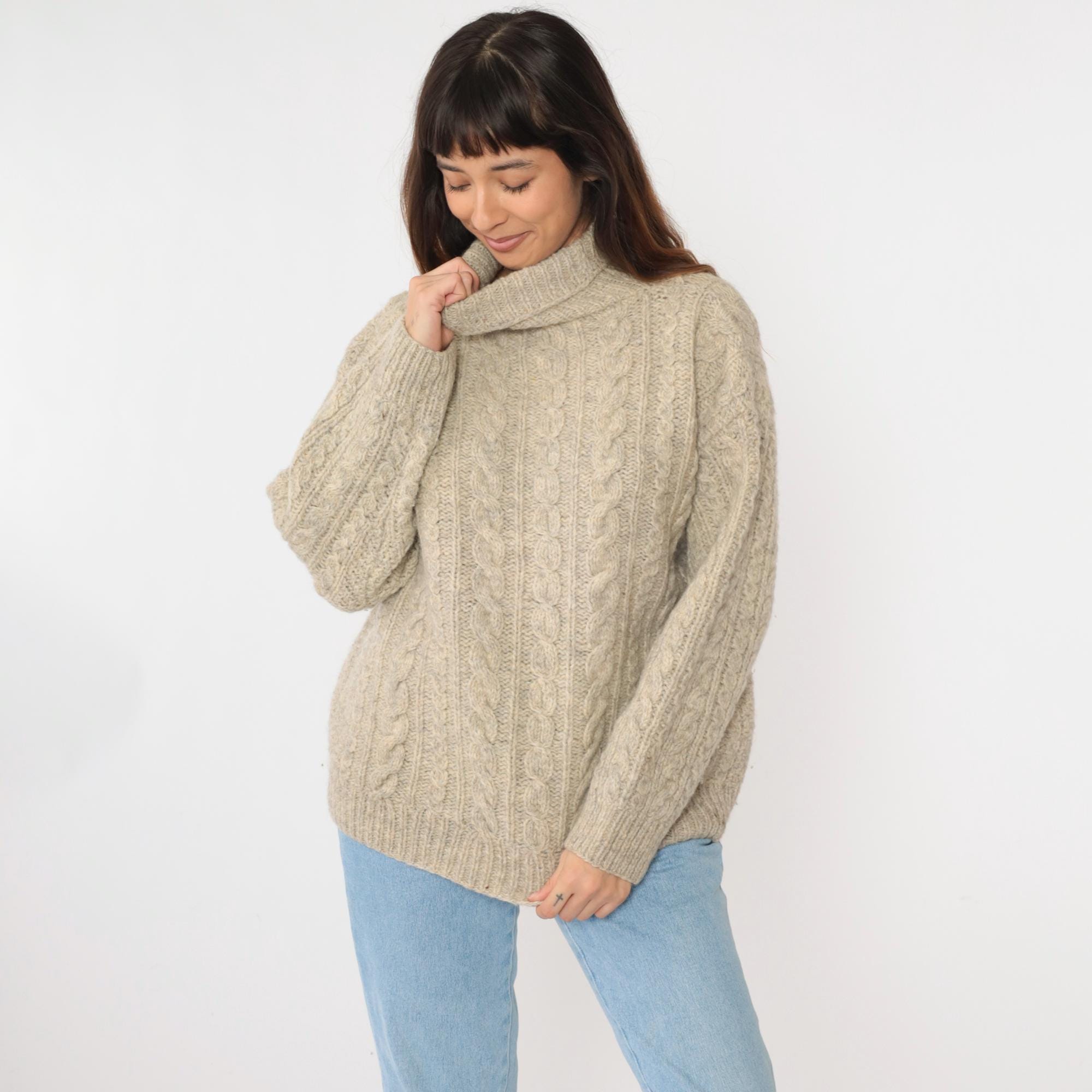 Vintage 80s sweater in flecked beige with a cable knit design and a turtleneck.