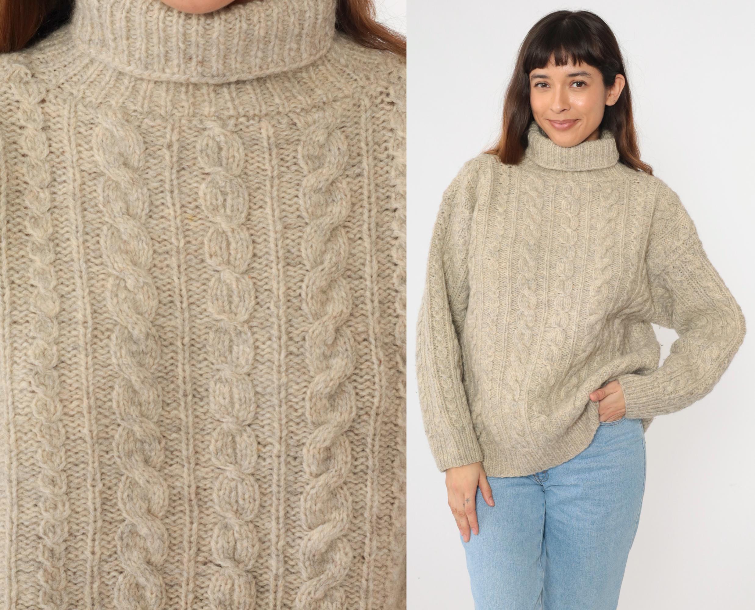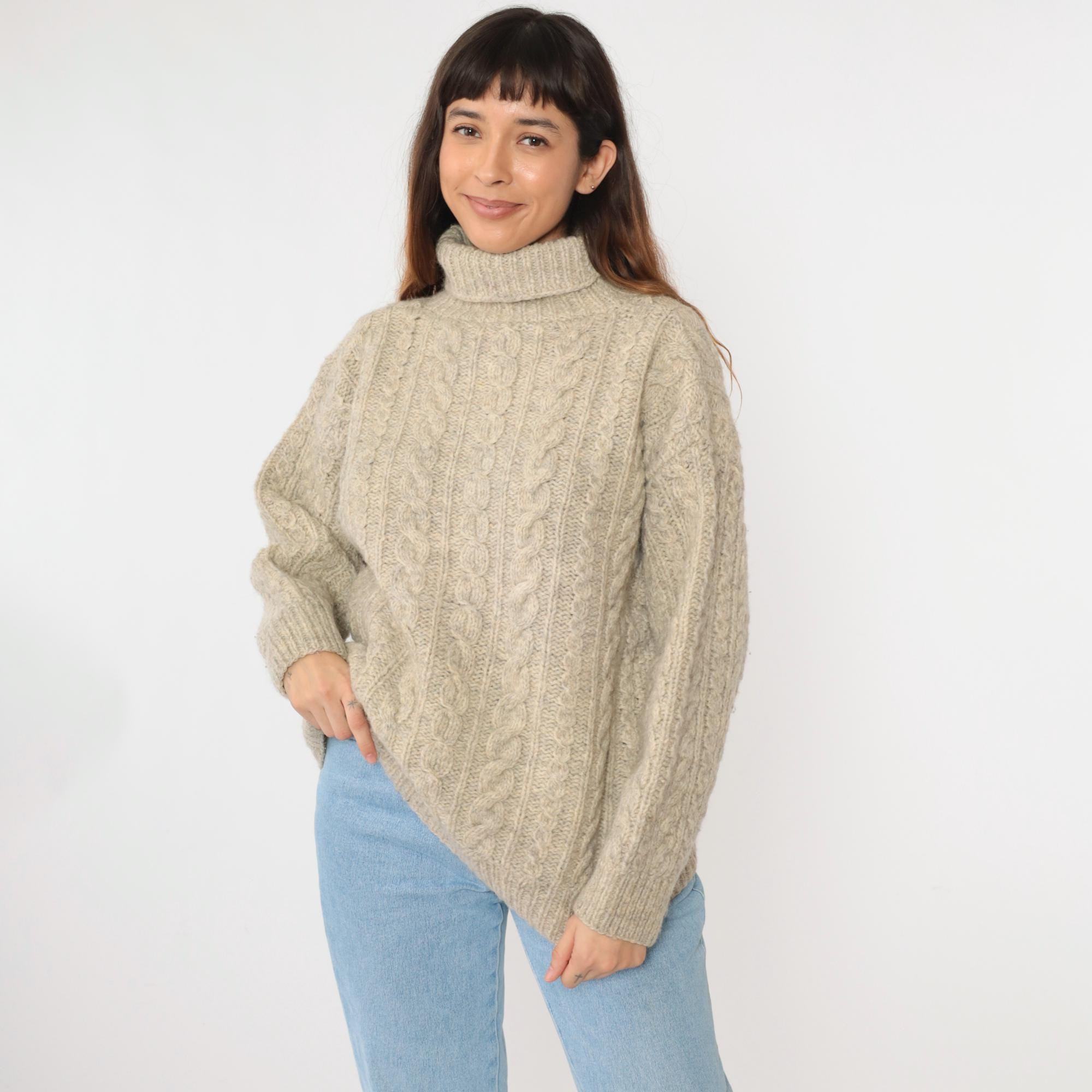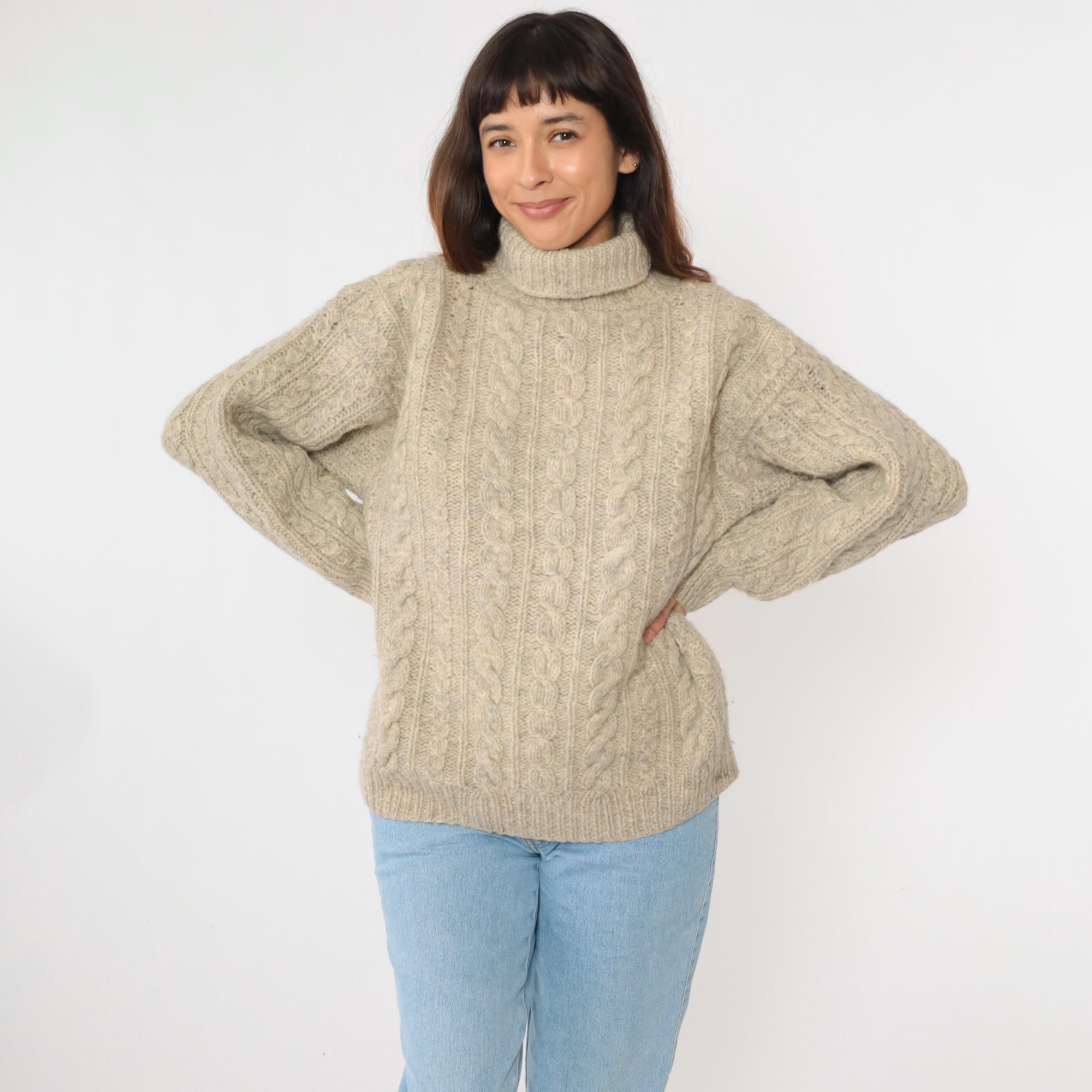 Vintage 80s sweater in flecked beige with a cable knit design and a turtleneck.