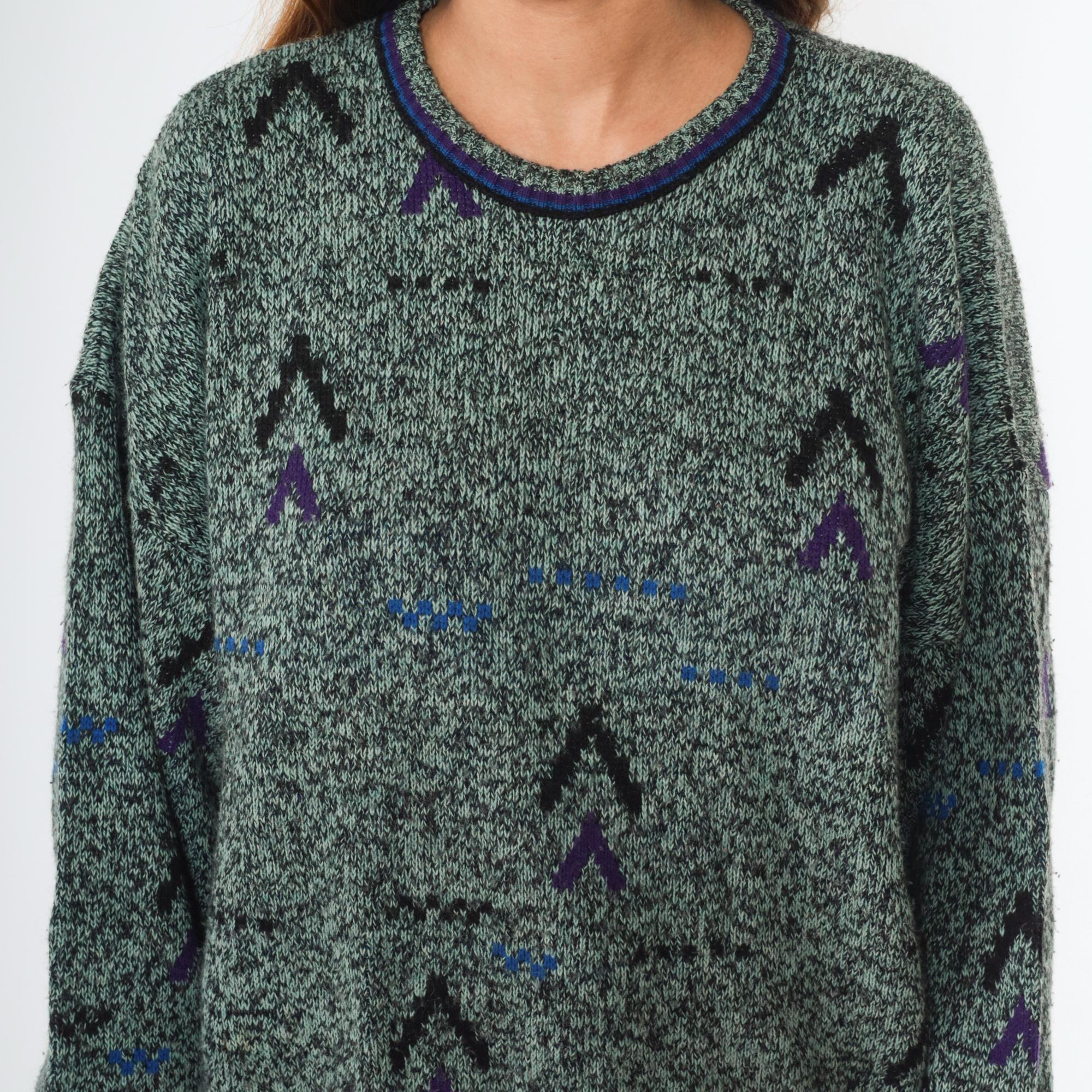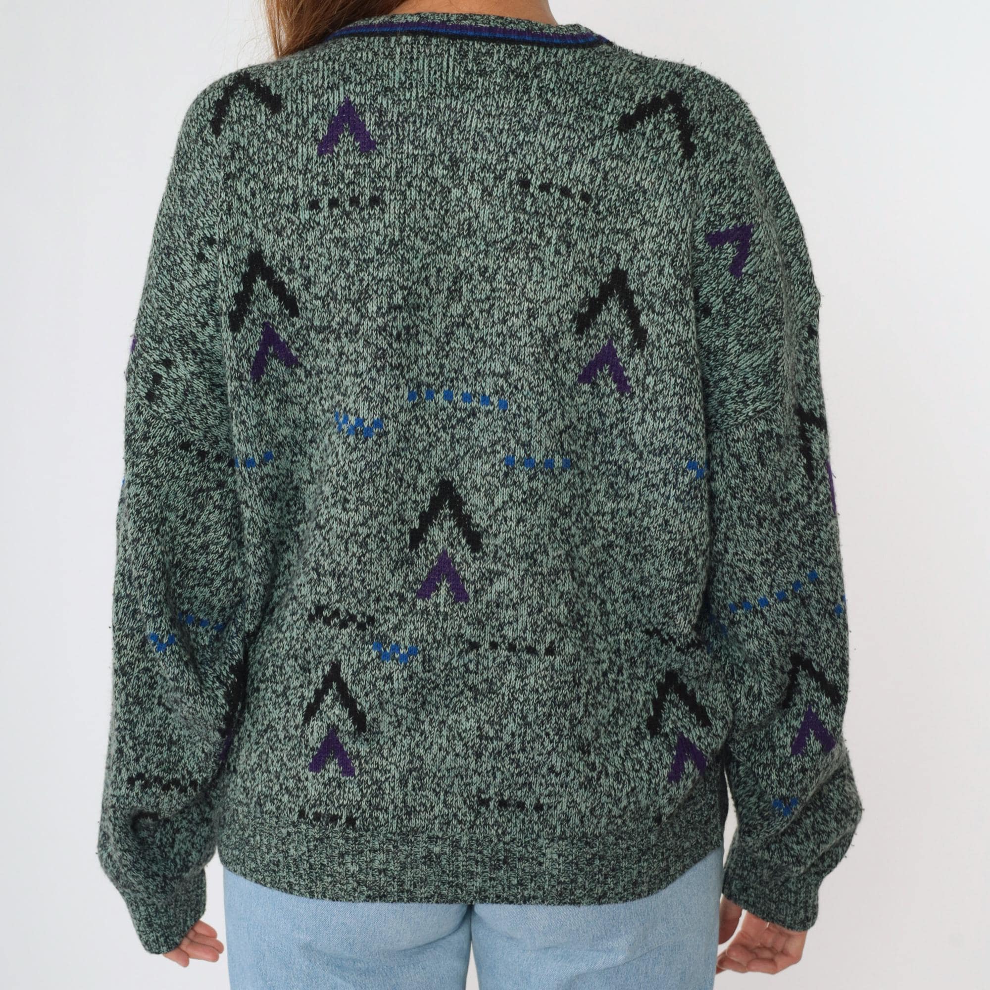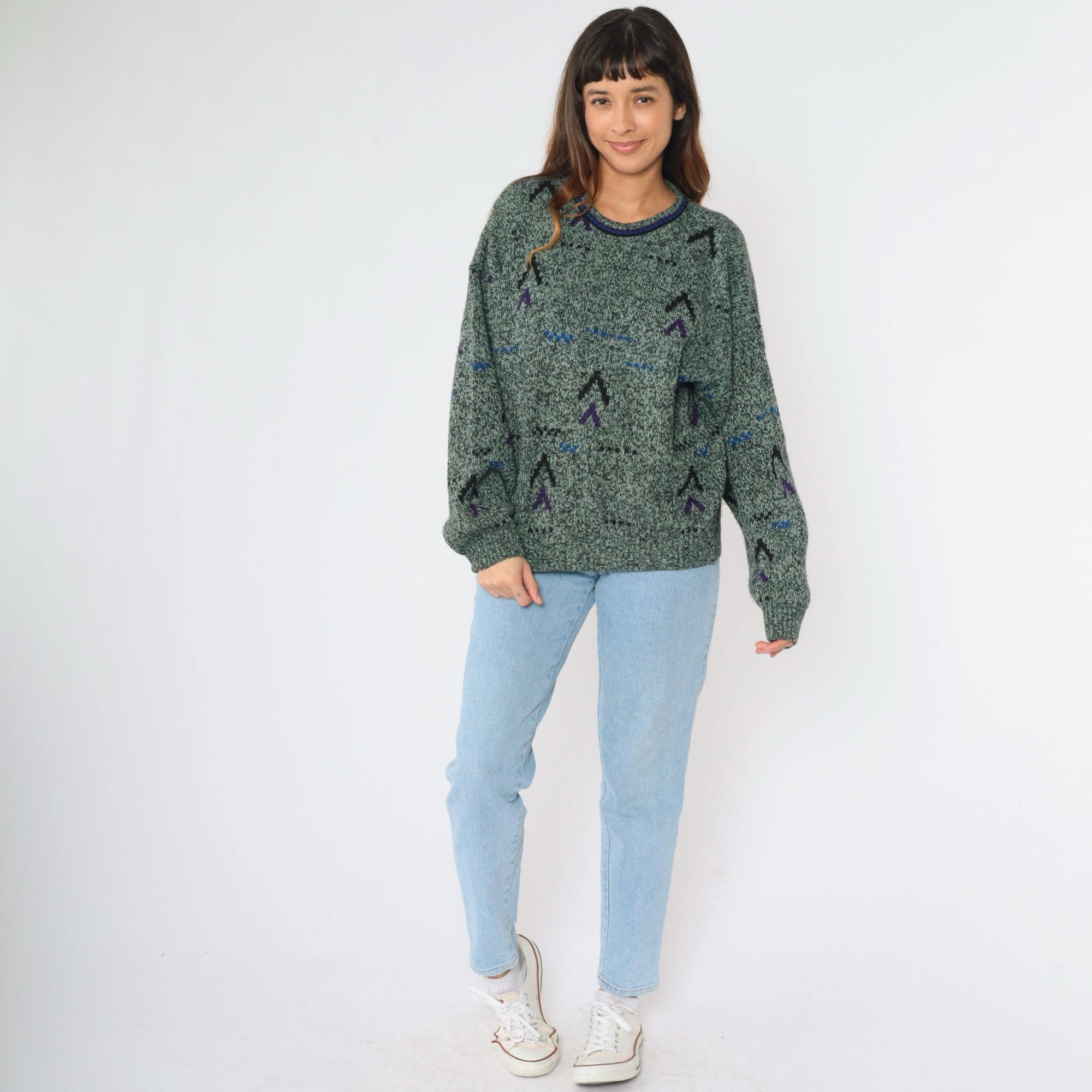 Vintage 90s sweater in seafoam green marled knit with a geometric pattern. Features a crew neckline with a striped accent, drop shoulders, and a cozy oversized silhouette.
