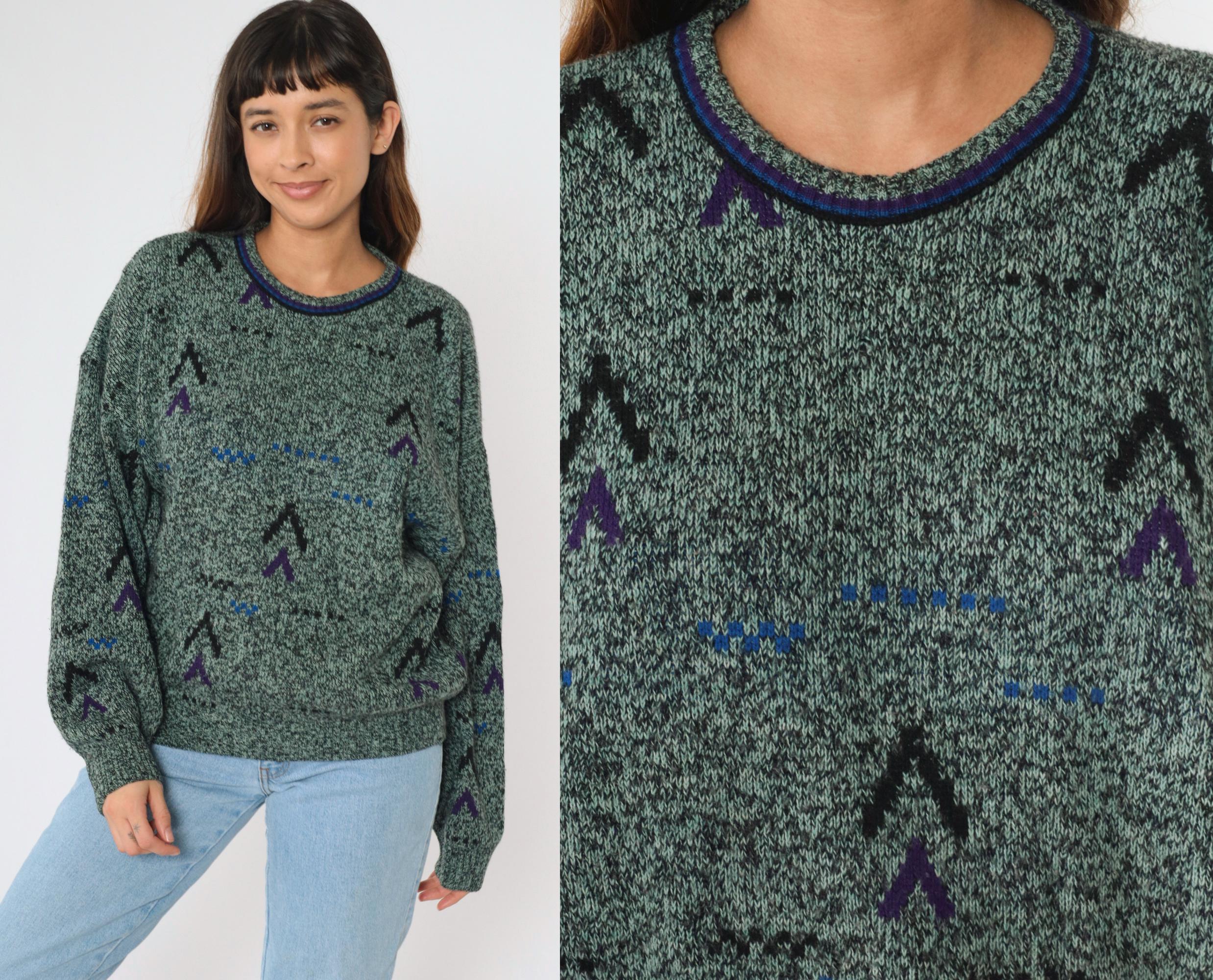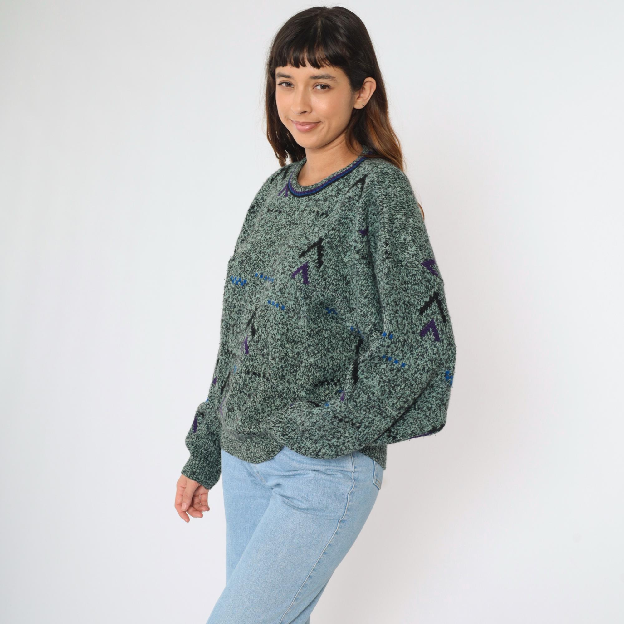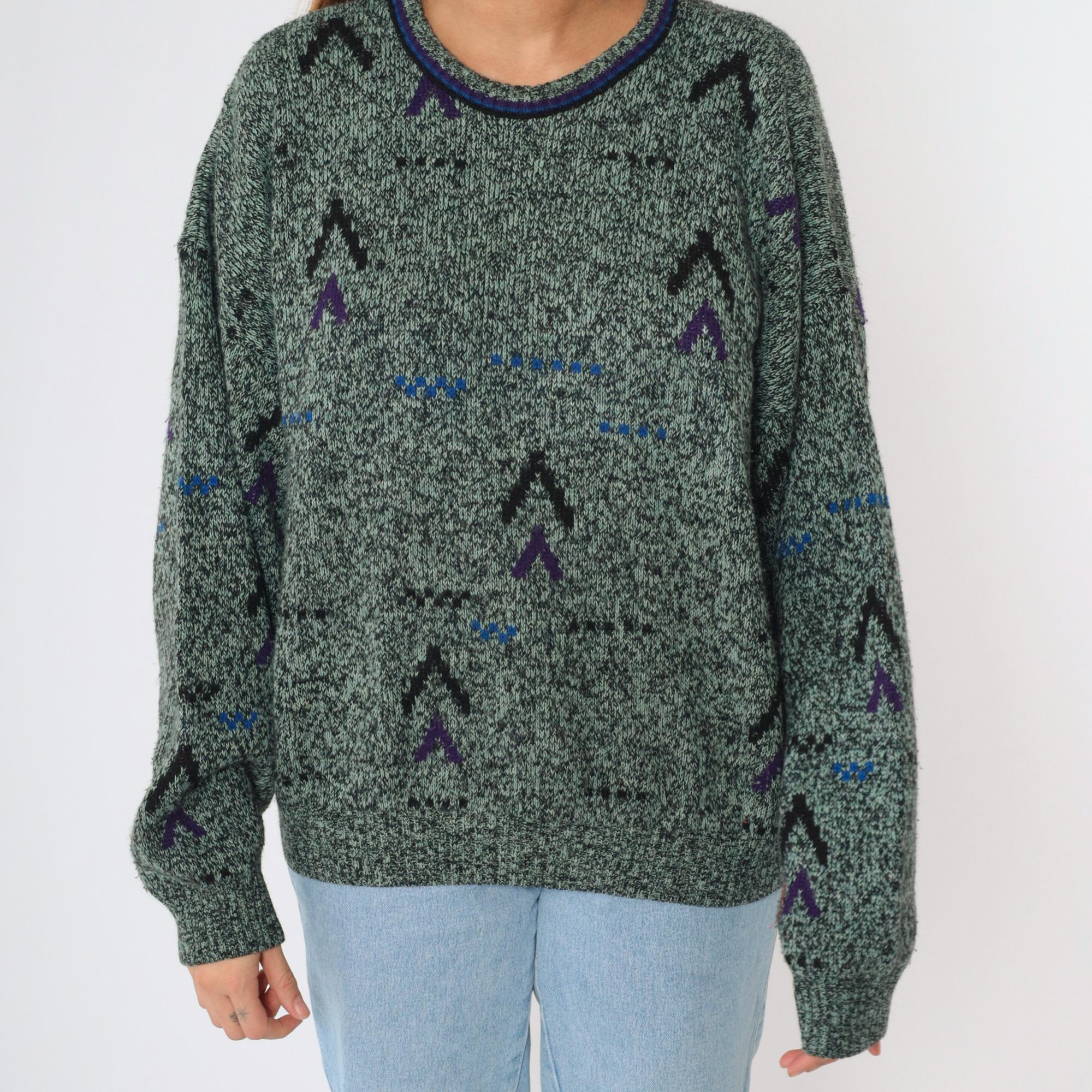 Vintage 90s sweater in seafoam green marled knit with a geometric pattern. Features a crew neckline with a striped accent, drop shoulders, and a cozy oversized silhouette.