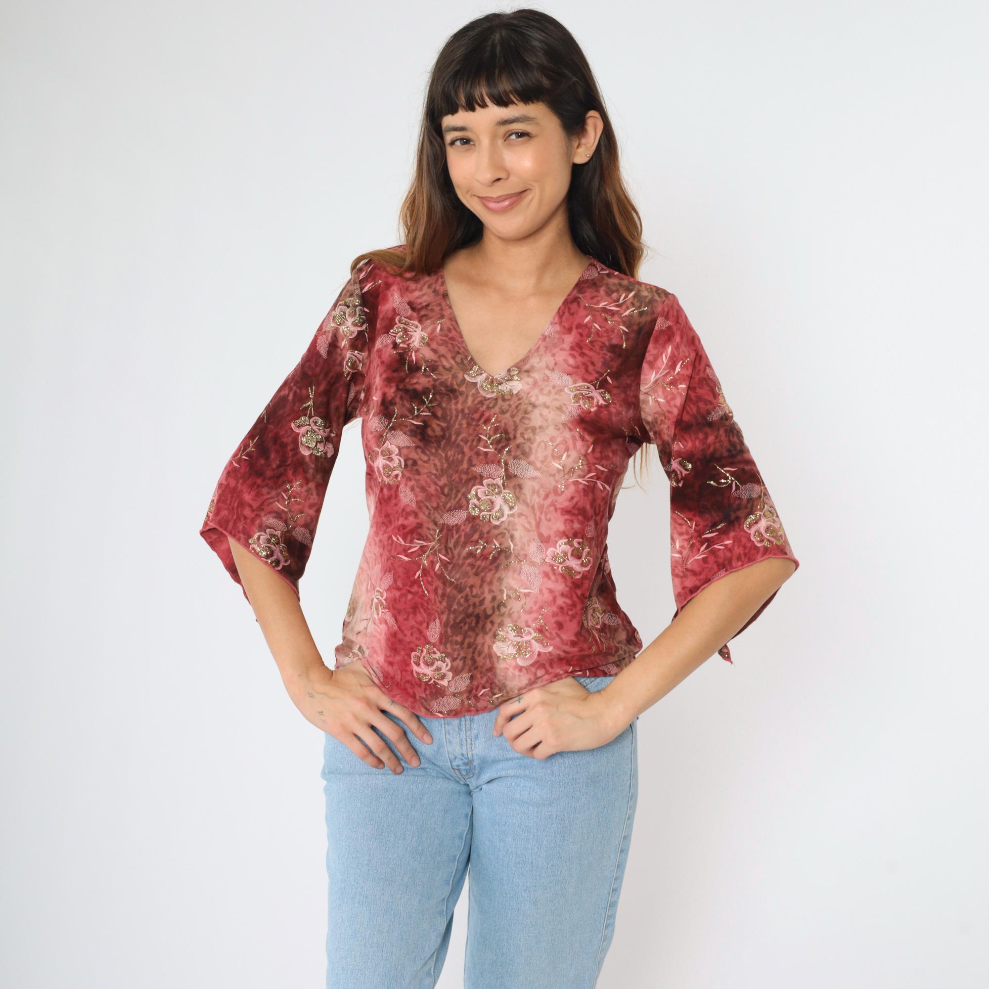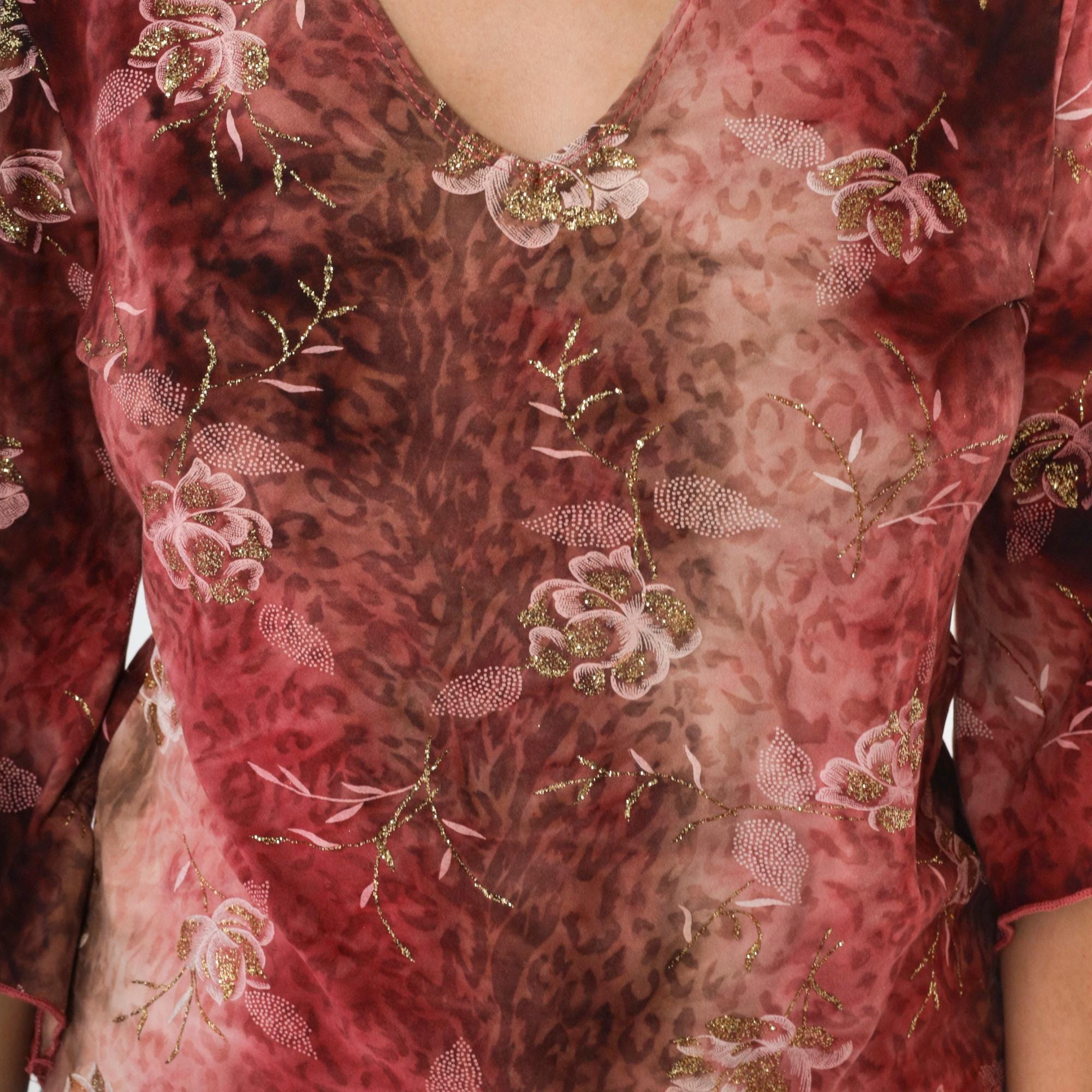 Vintage Y2K bell sleeve top features a glittery metallic floral print and a leopard-inspired abstract background.