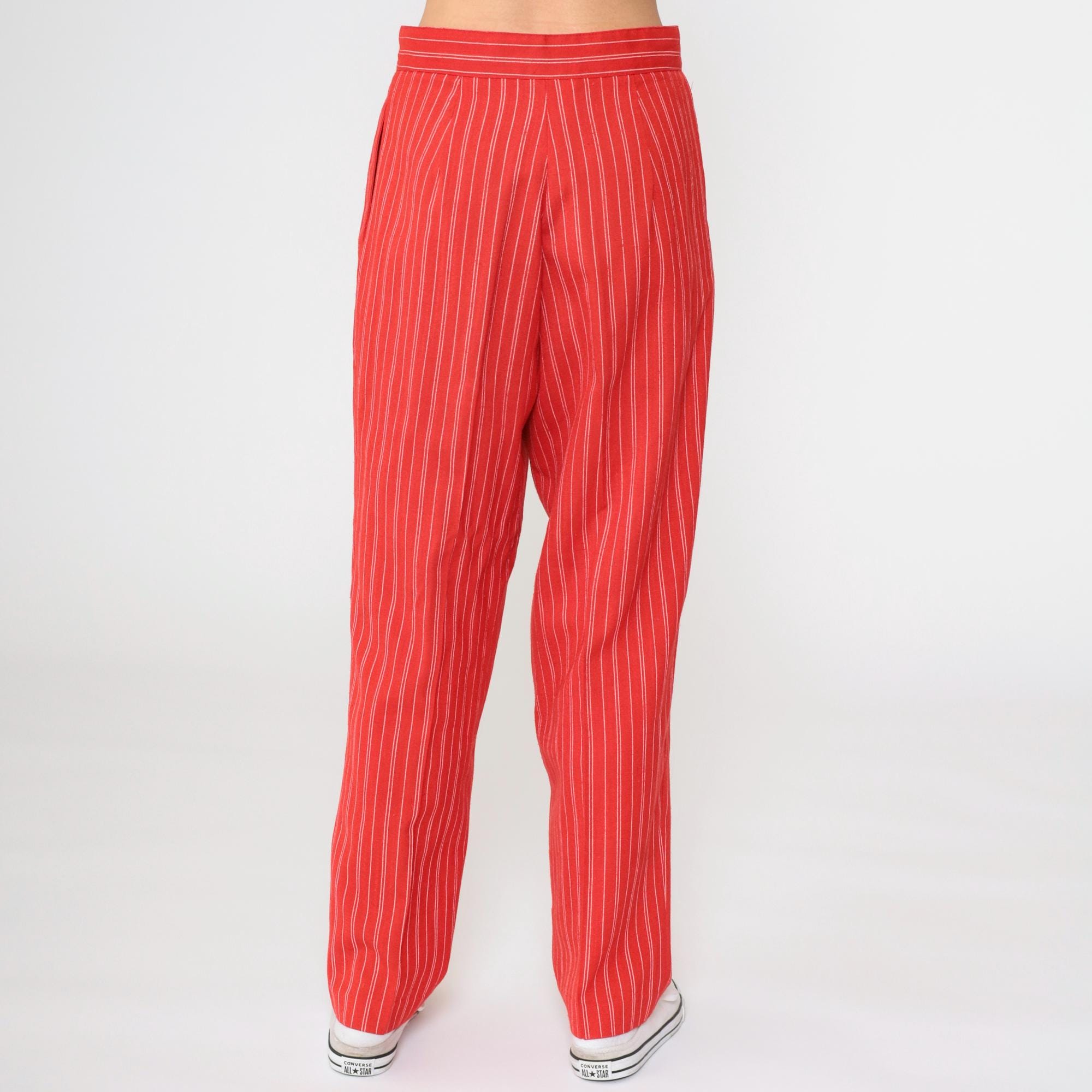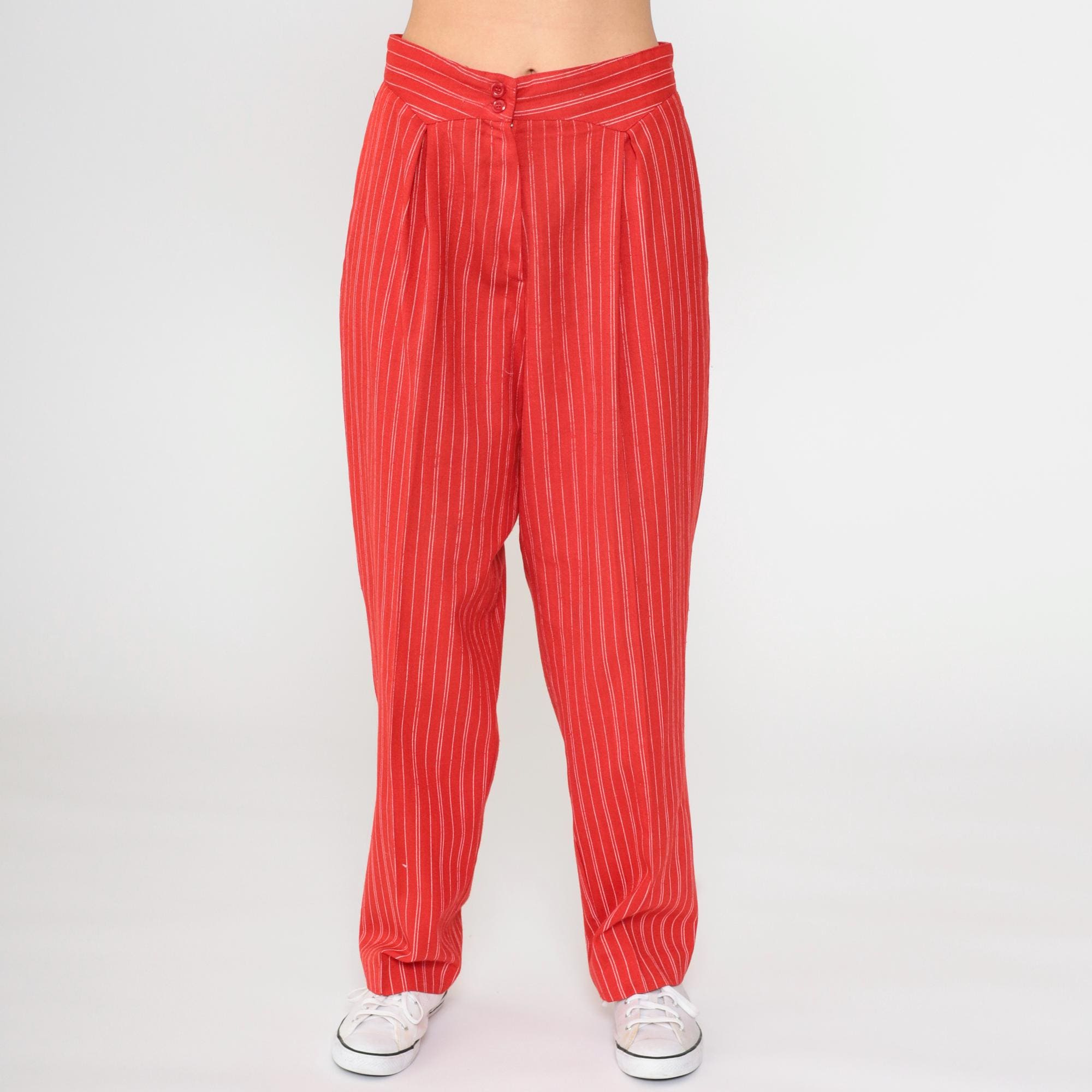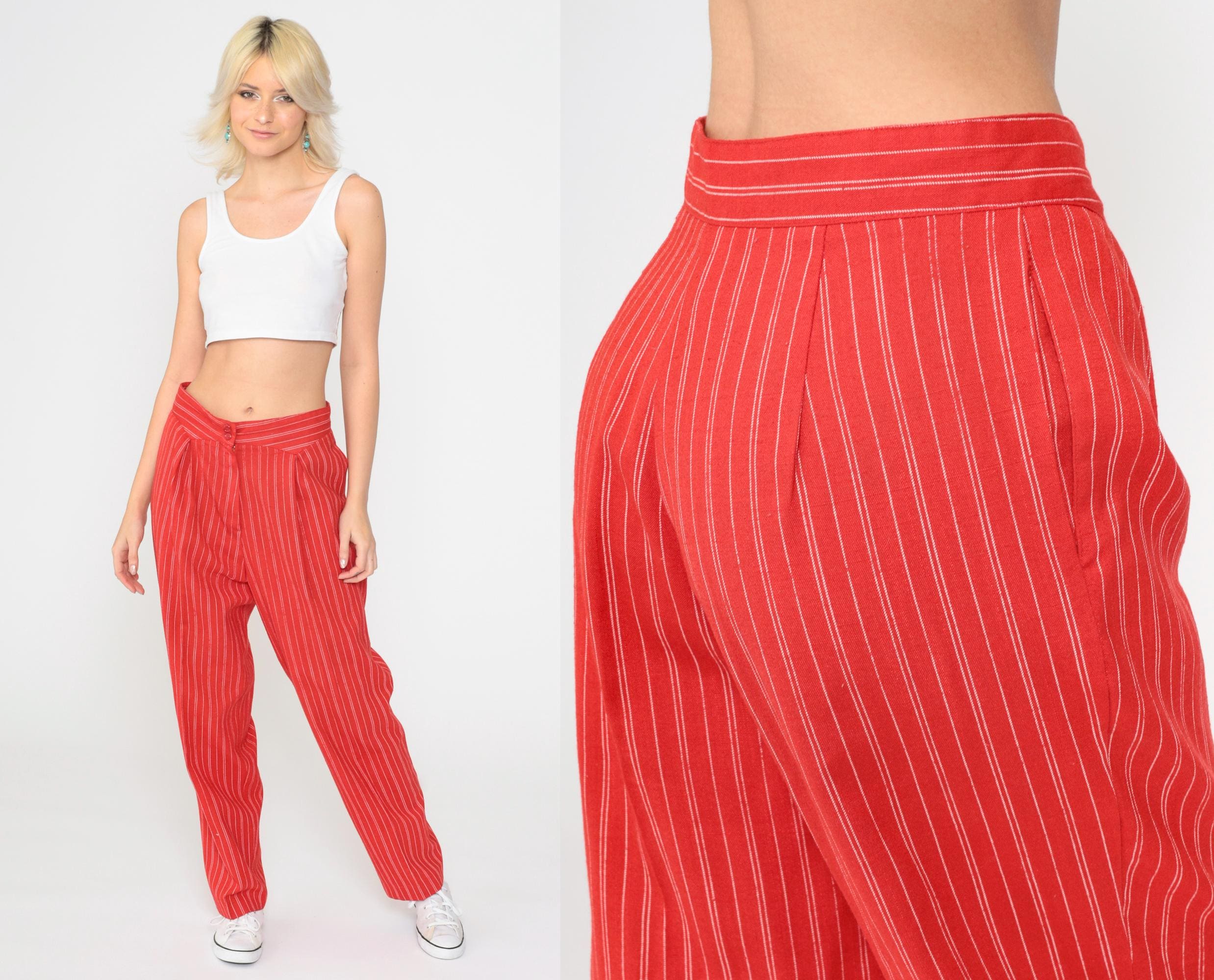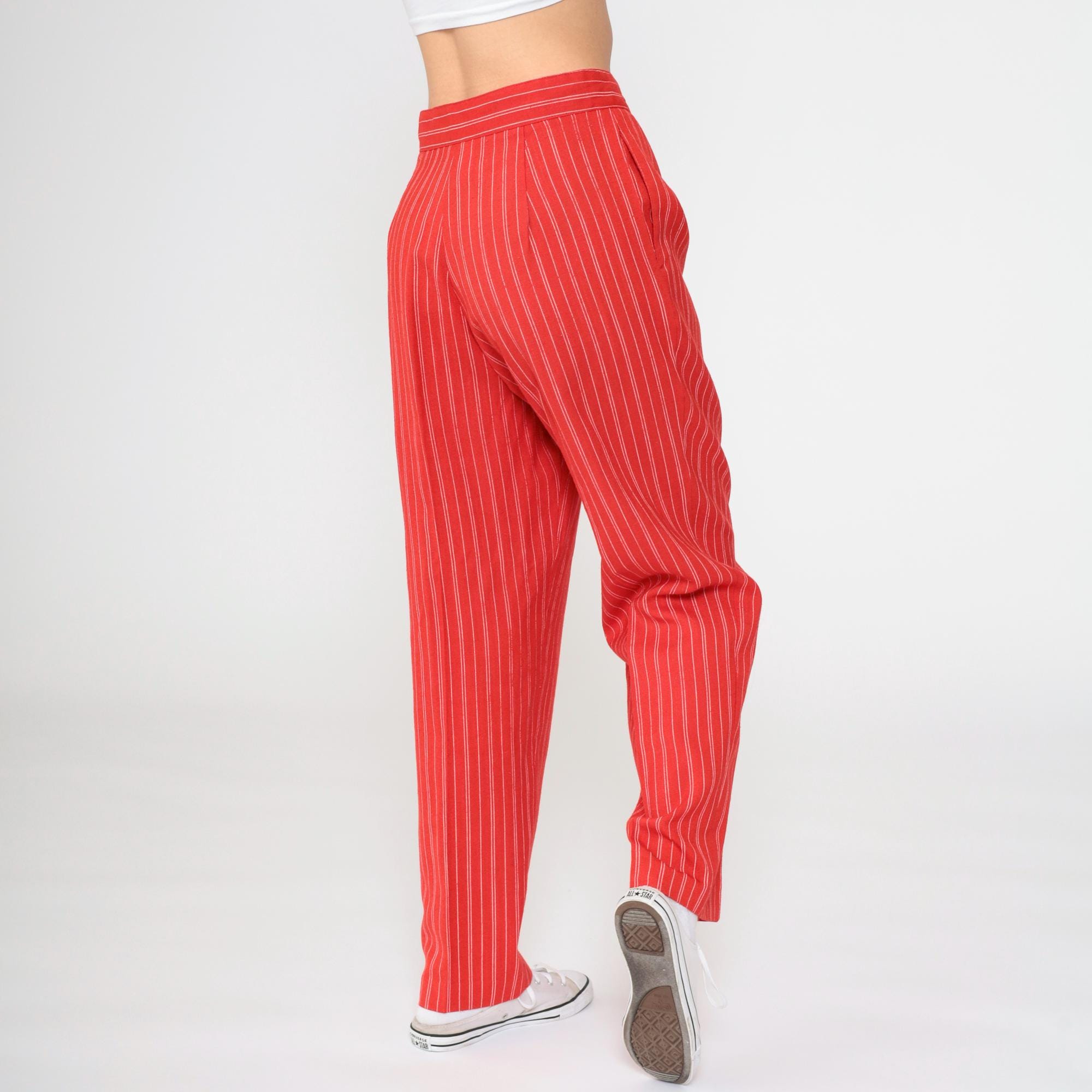 Vintage 80s pants in red with white pinstripes. High waisted with pleats and a tapered leg.