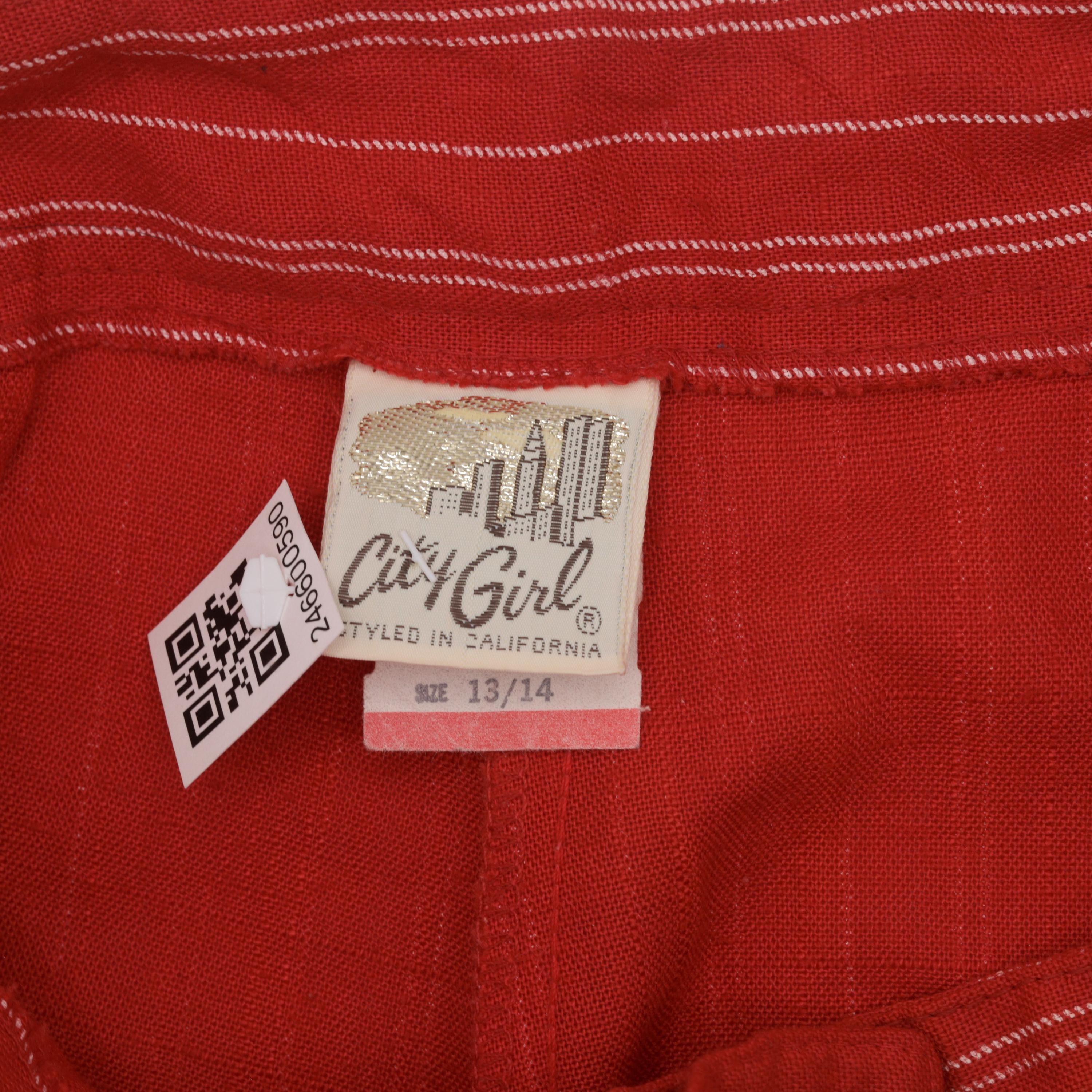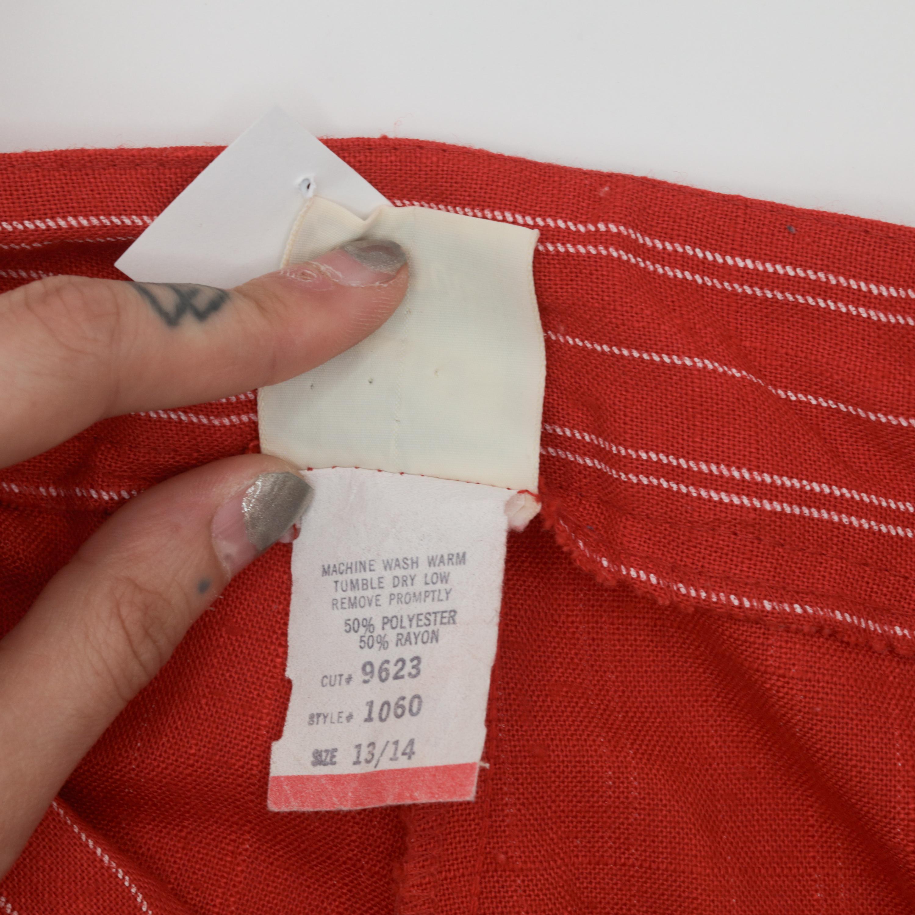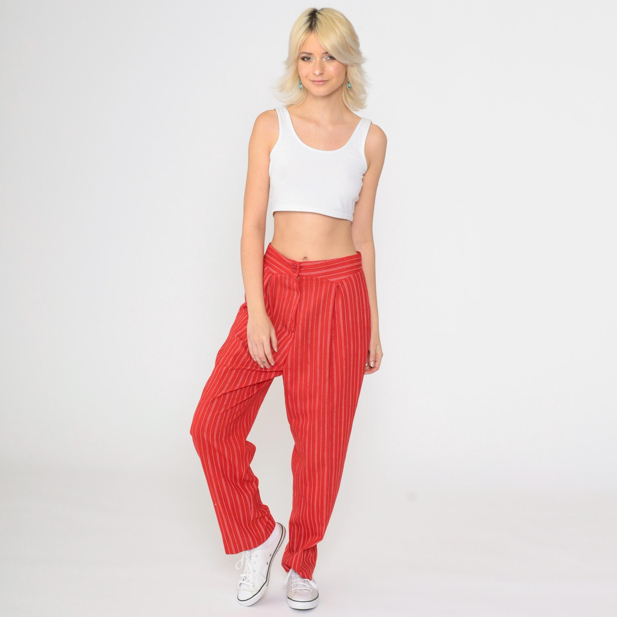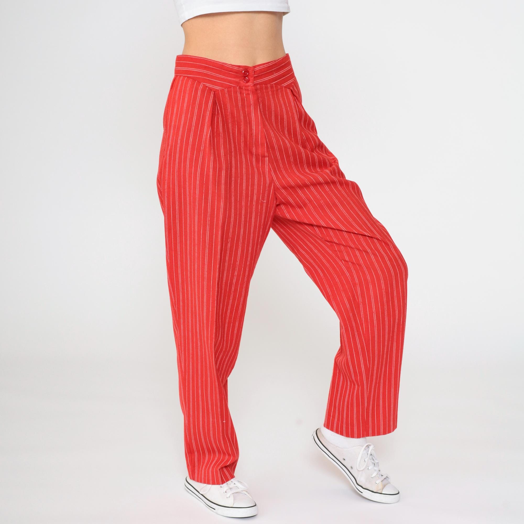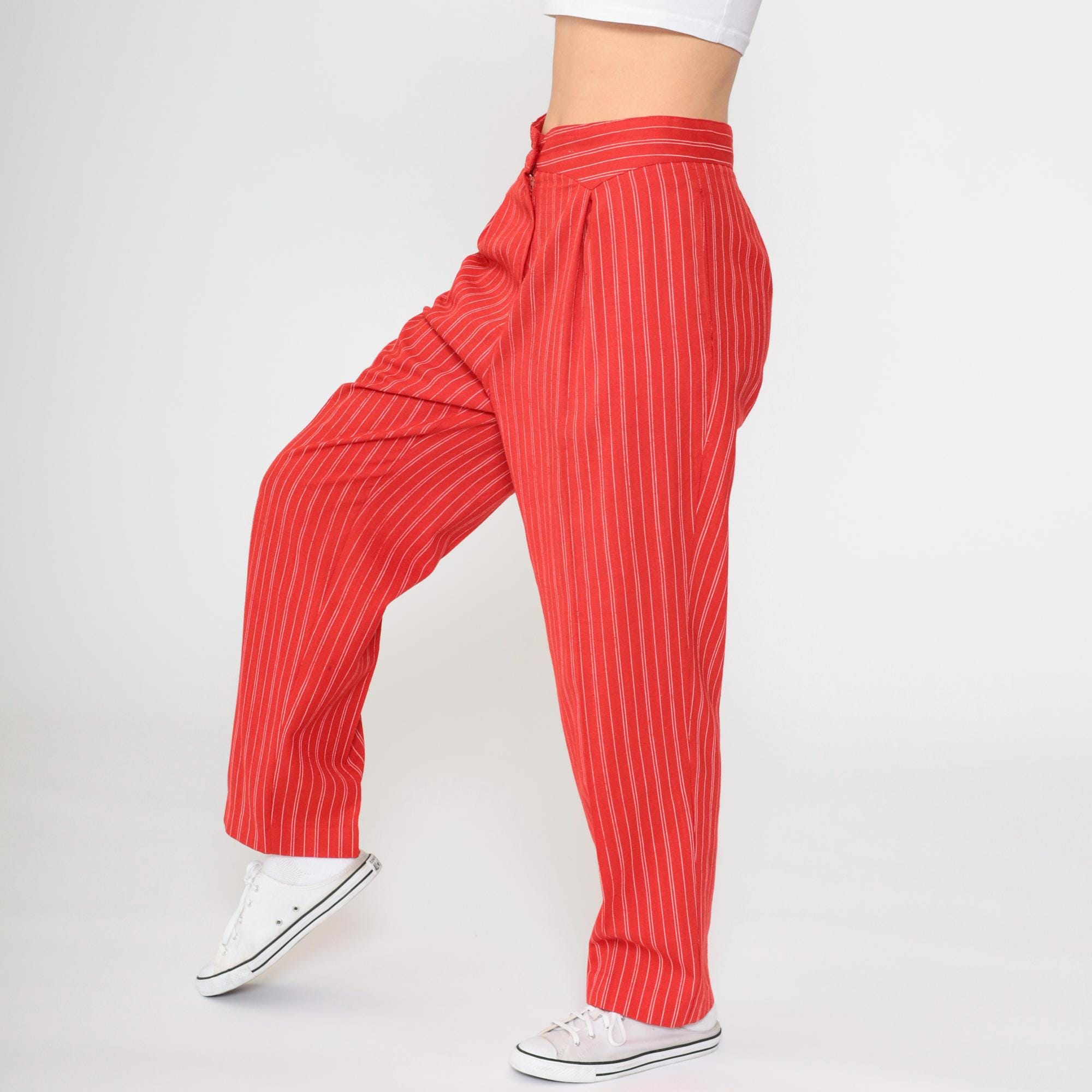 Vintage 80s pants in red with white pinstripes. High waisted with pleats and a tapered leg.