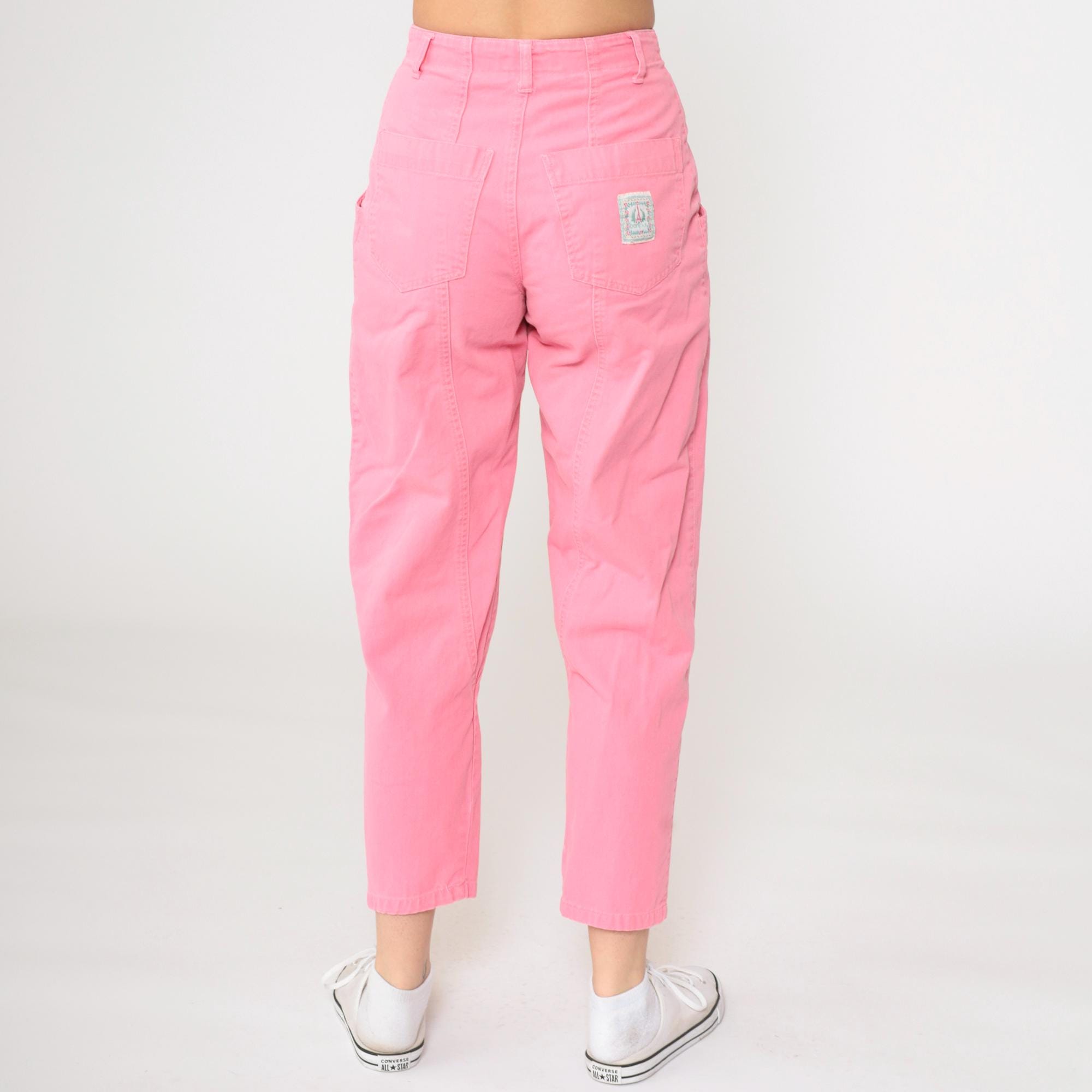 Vintage 80s pants in bright pink with a high waist and pleating in the front. Relaxed fit with a tapered leg.