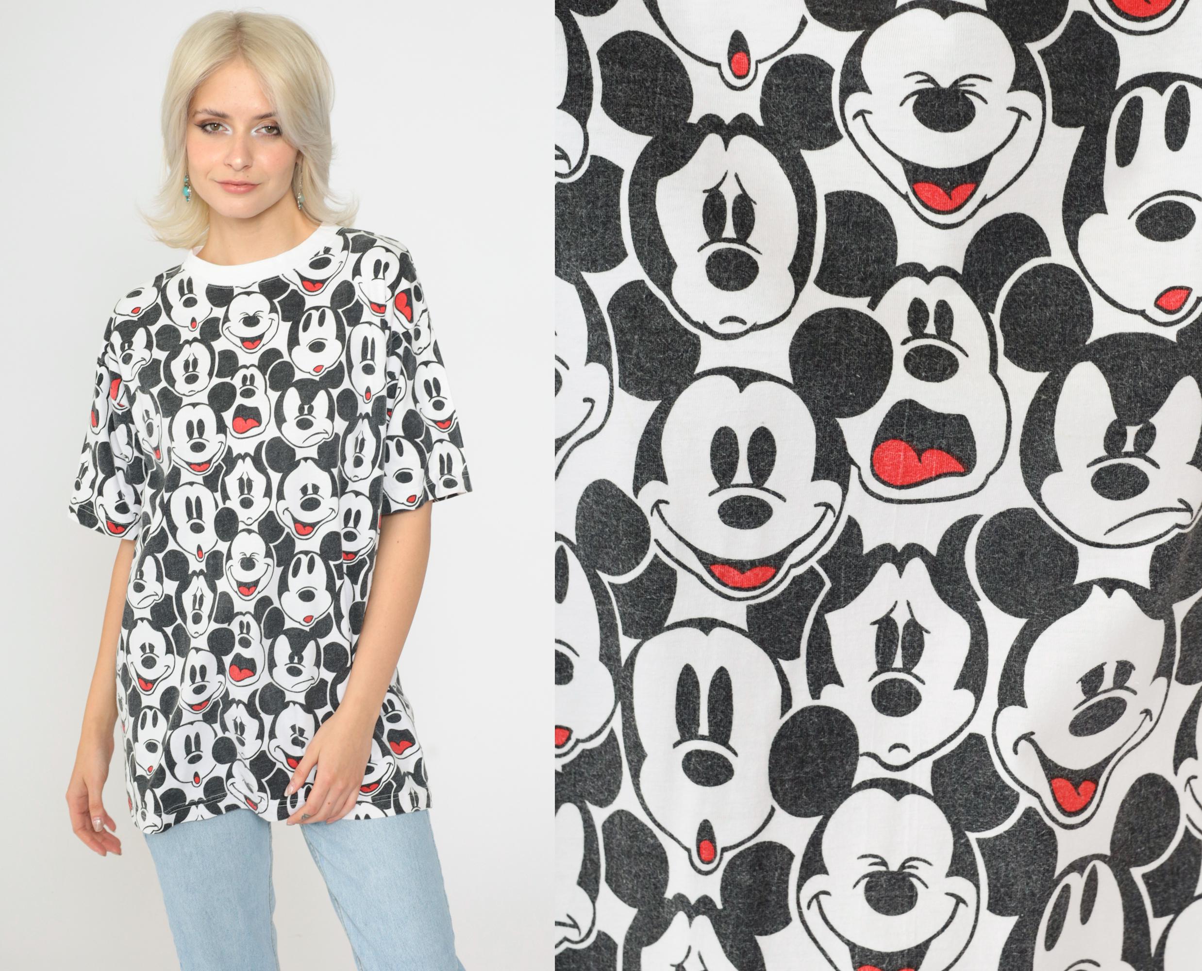 Vintage 90s t shirt with an all over Mickey Mouse expression print. It features a crewneck and short sleeves.