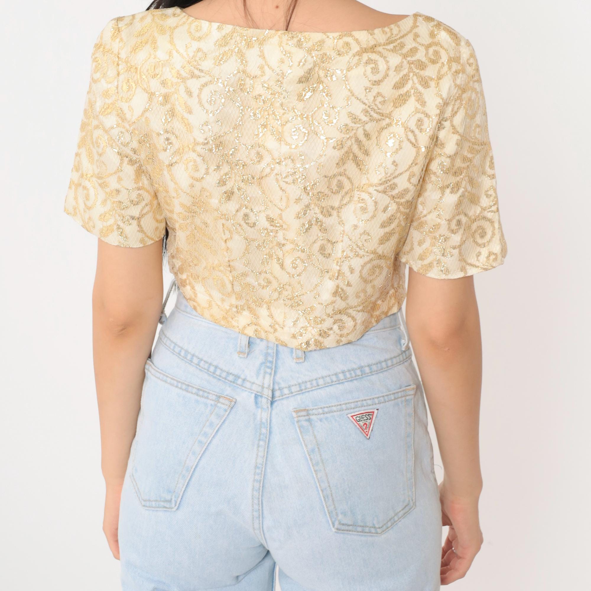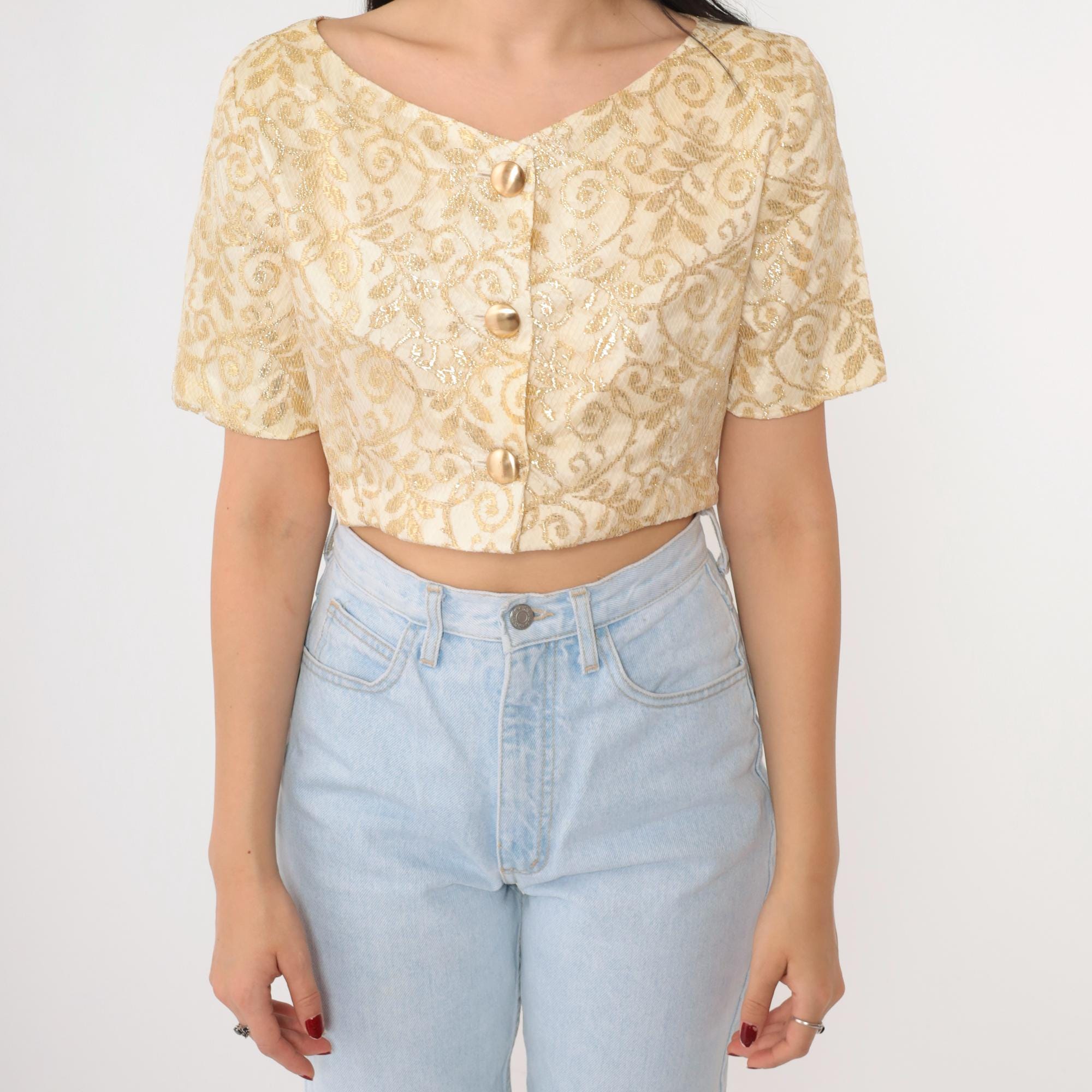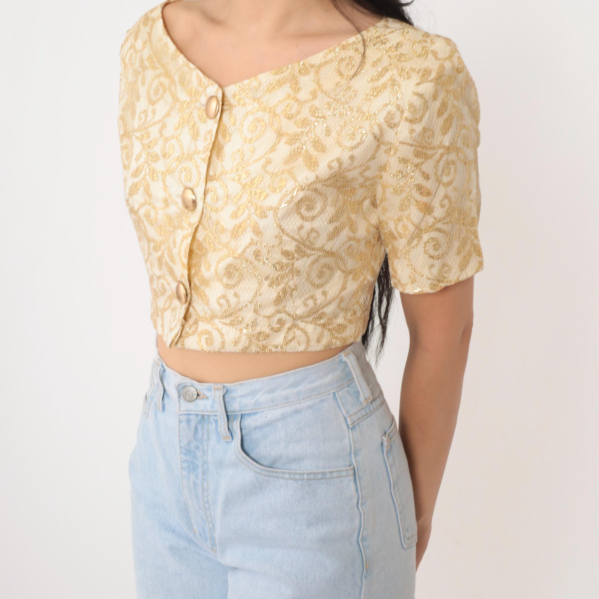 Vintage 90s blouse in cream and gold metallic lace with a botanical design. It features buttons up the front and a cropped hem.