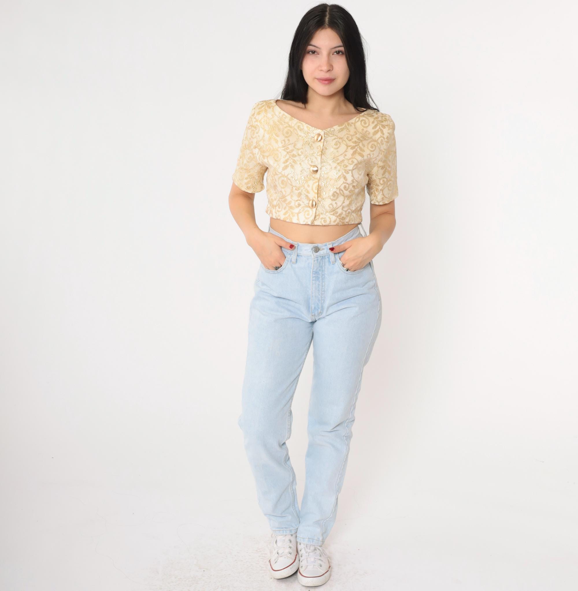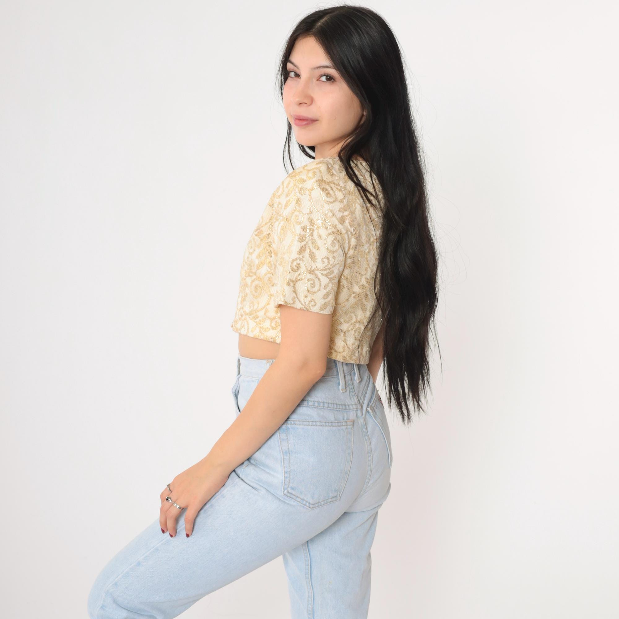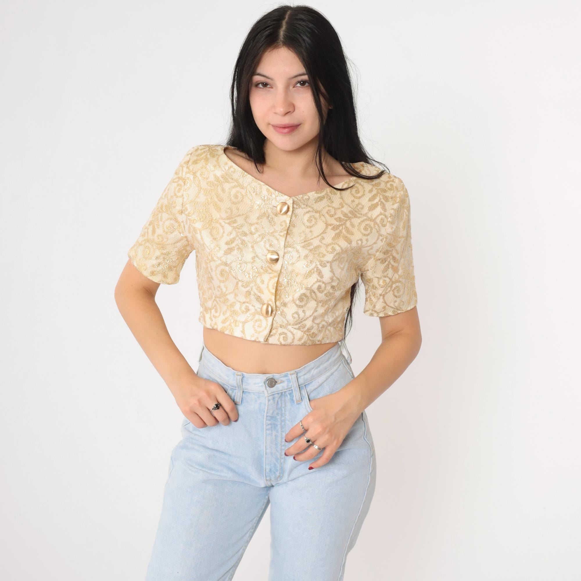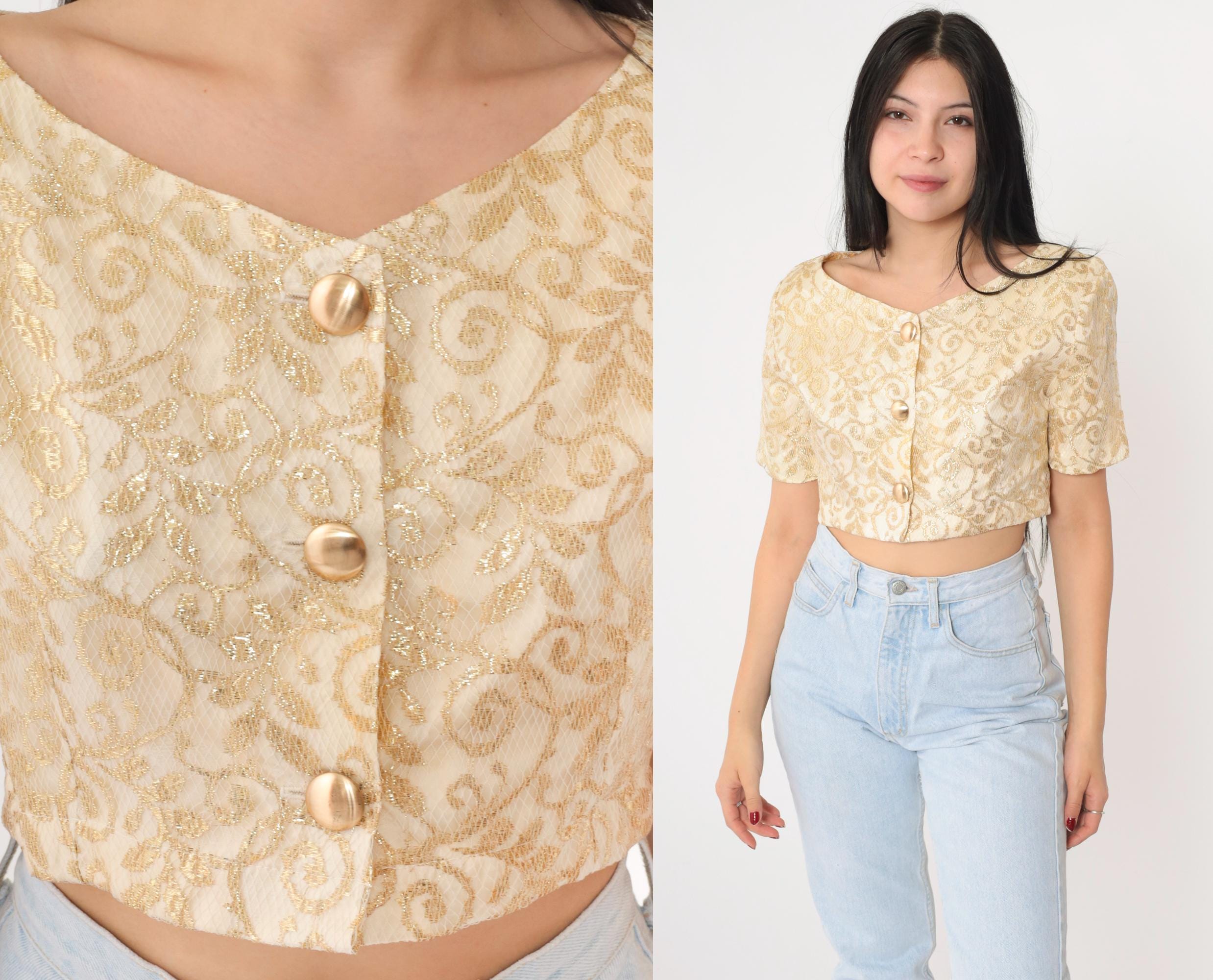 Vintage 90s blouse in cream and gold metallic lace with a botanical design. It features buttons up the front and a cropped hem.