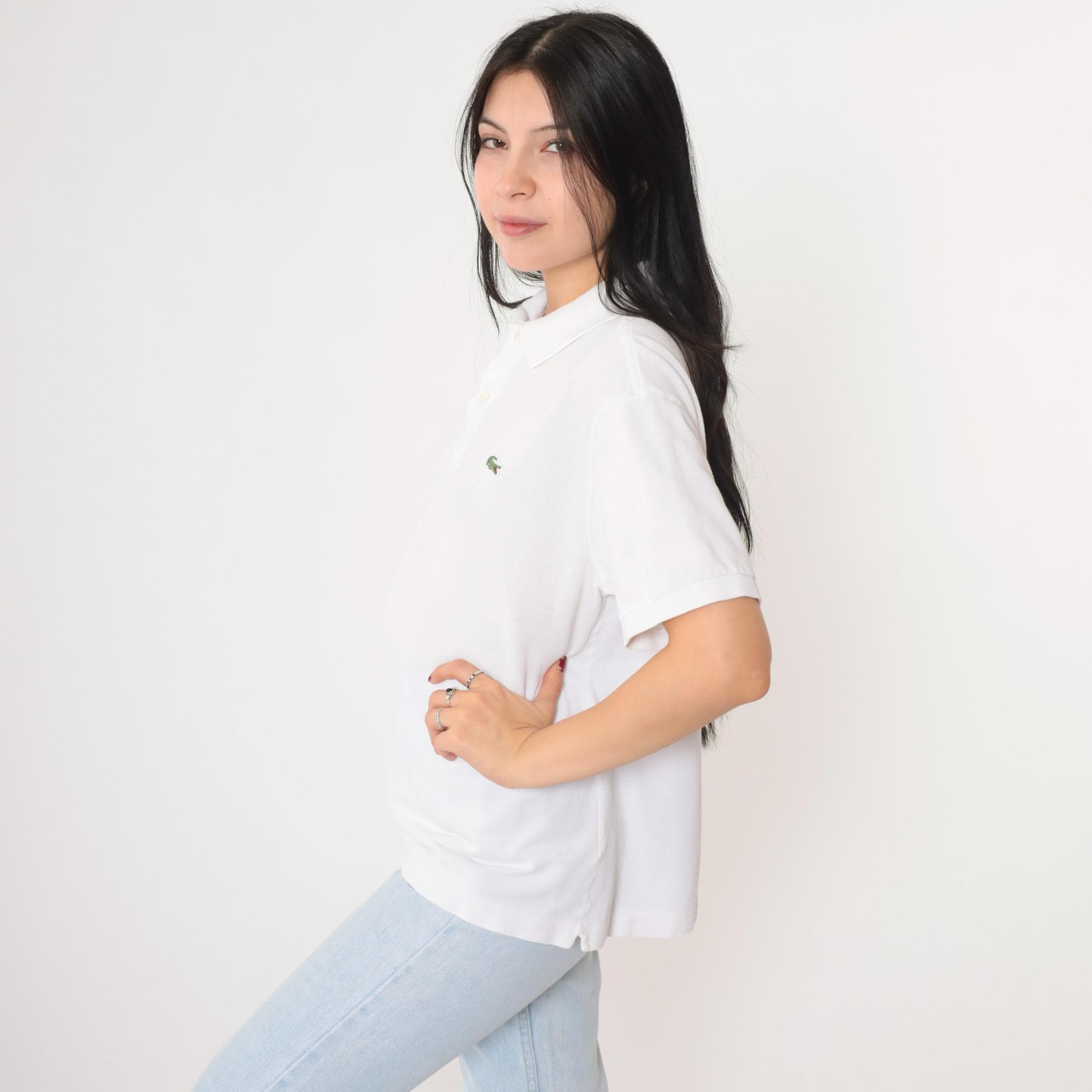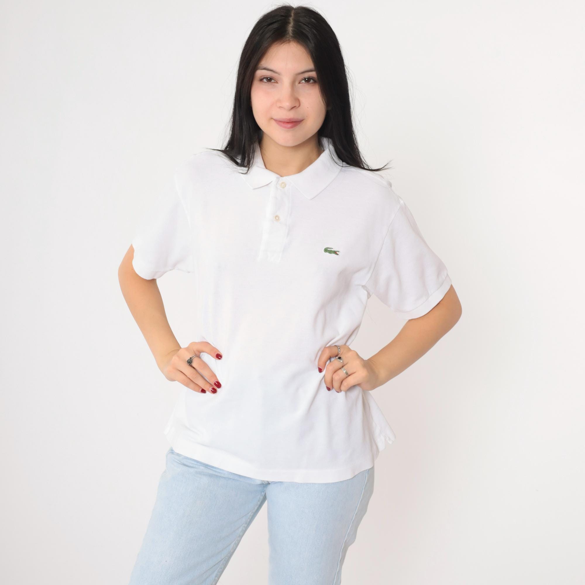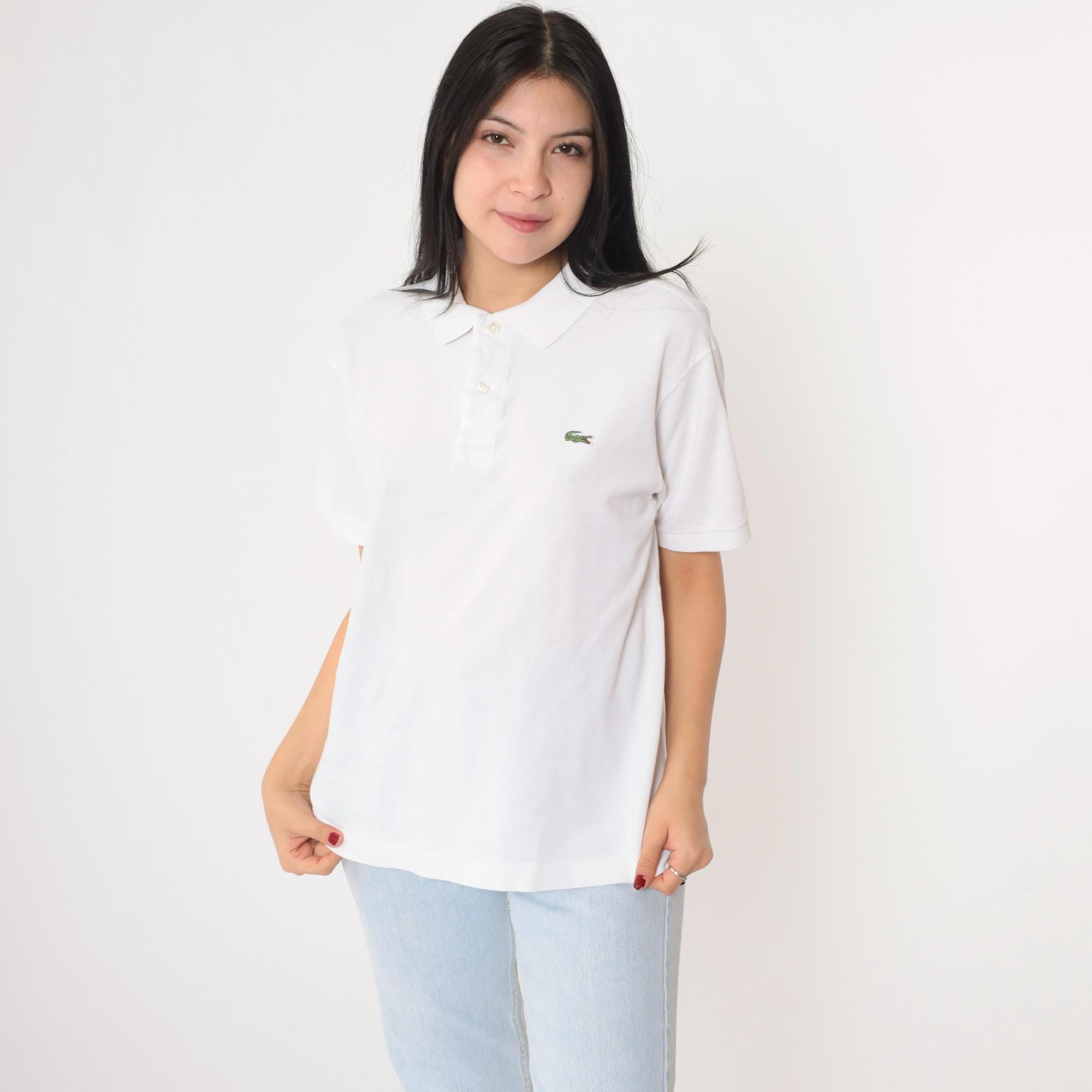 Vintage 00s polo shirt in white. Buttons up the chest with the crocodile logo.