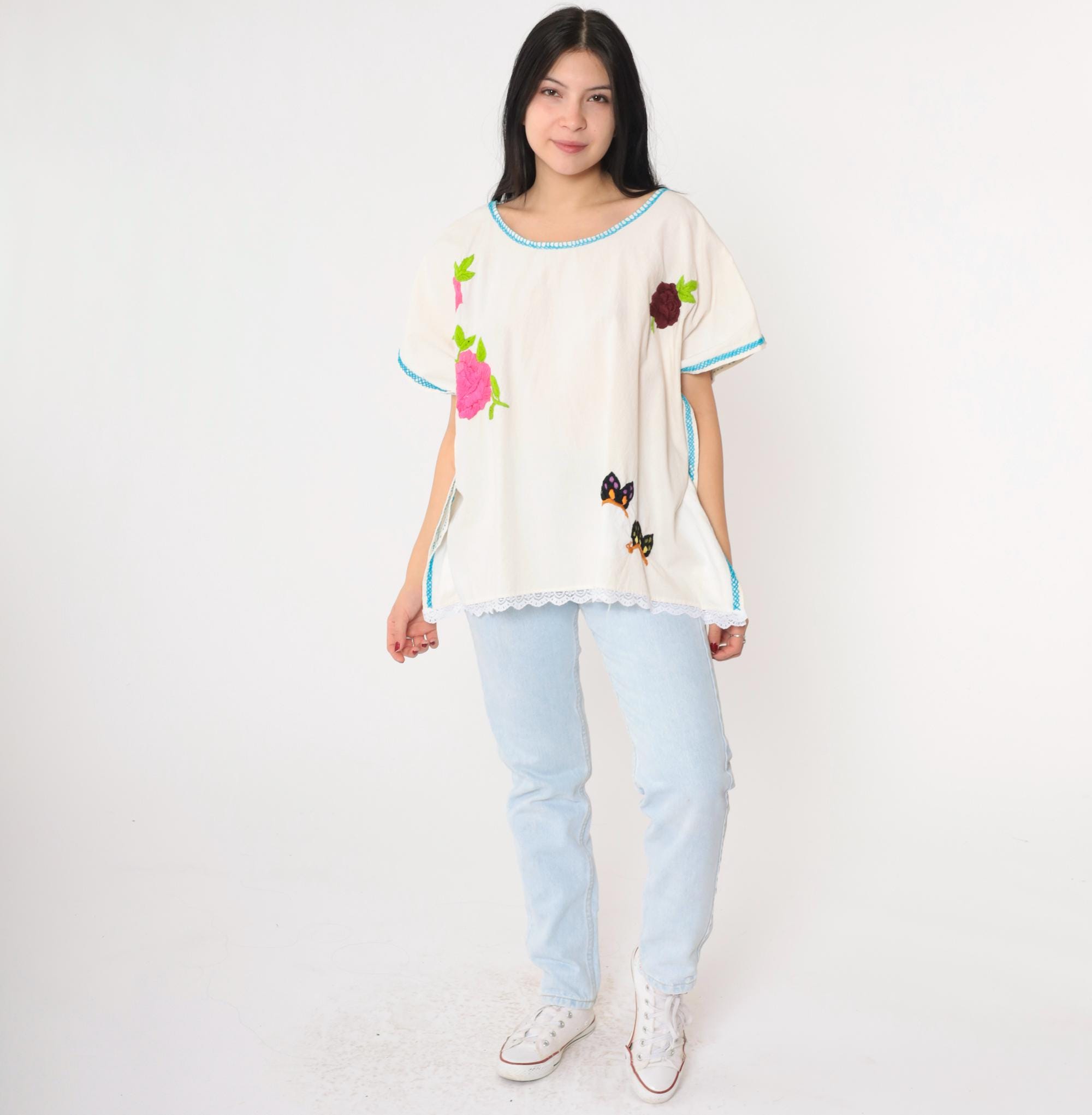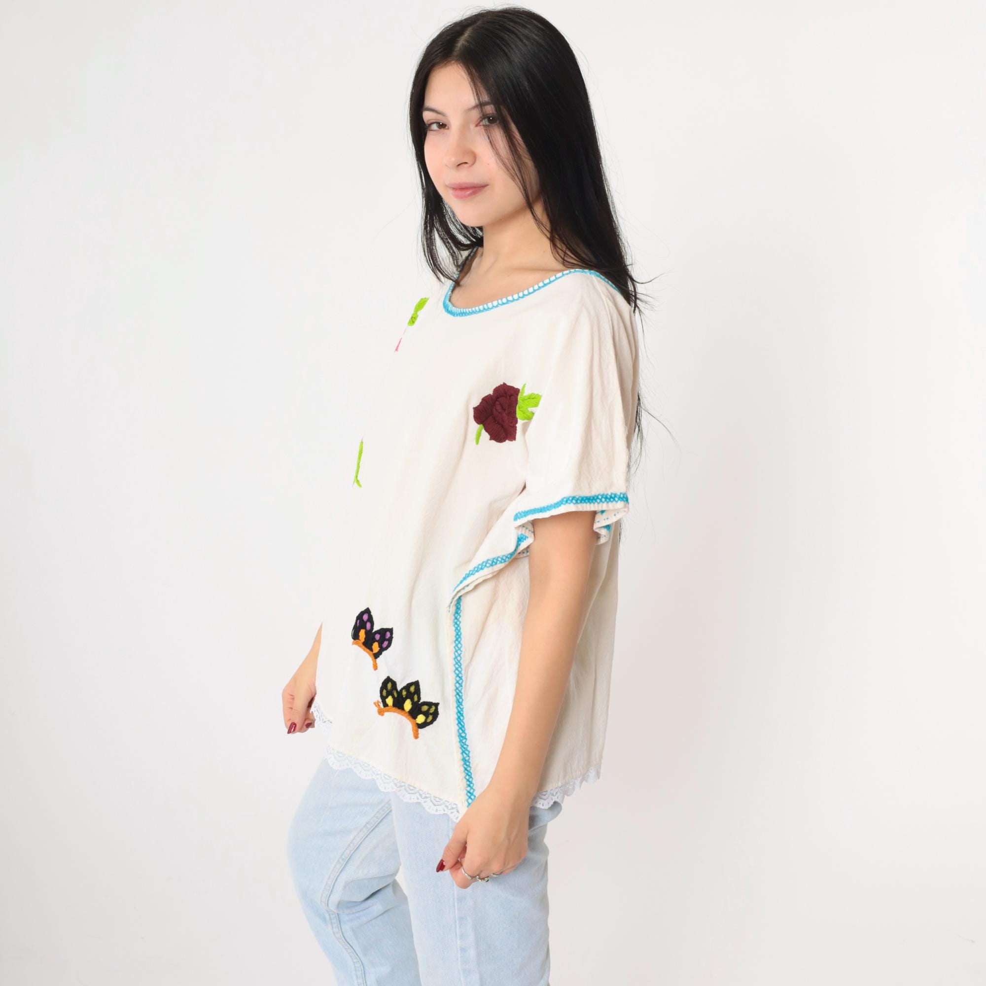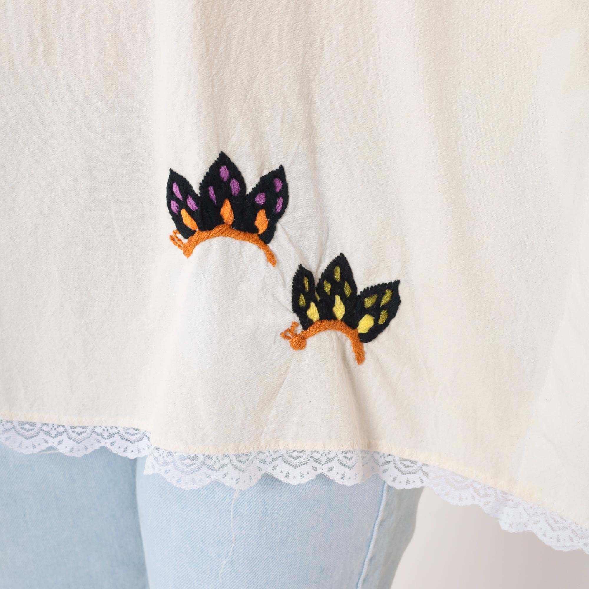 Vintage 90s blouse in cream with floral and butterfly embroidery.