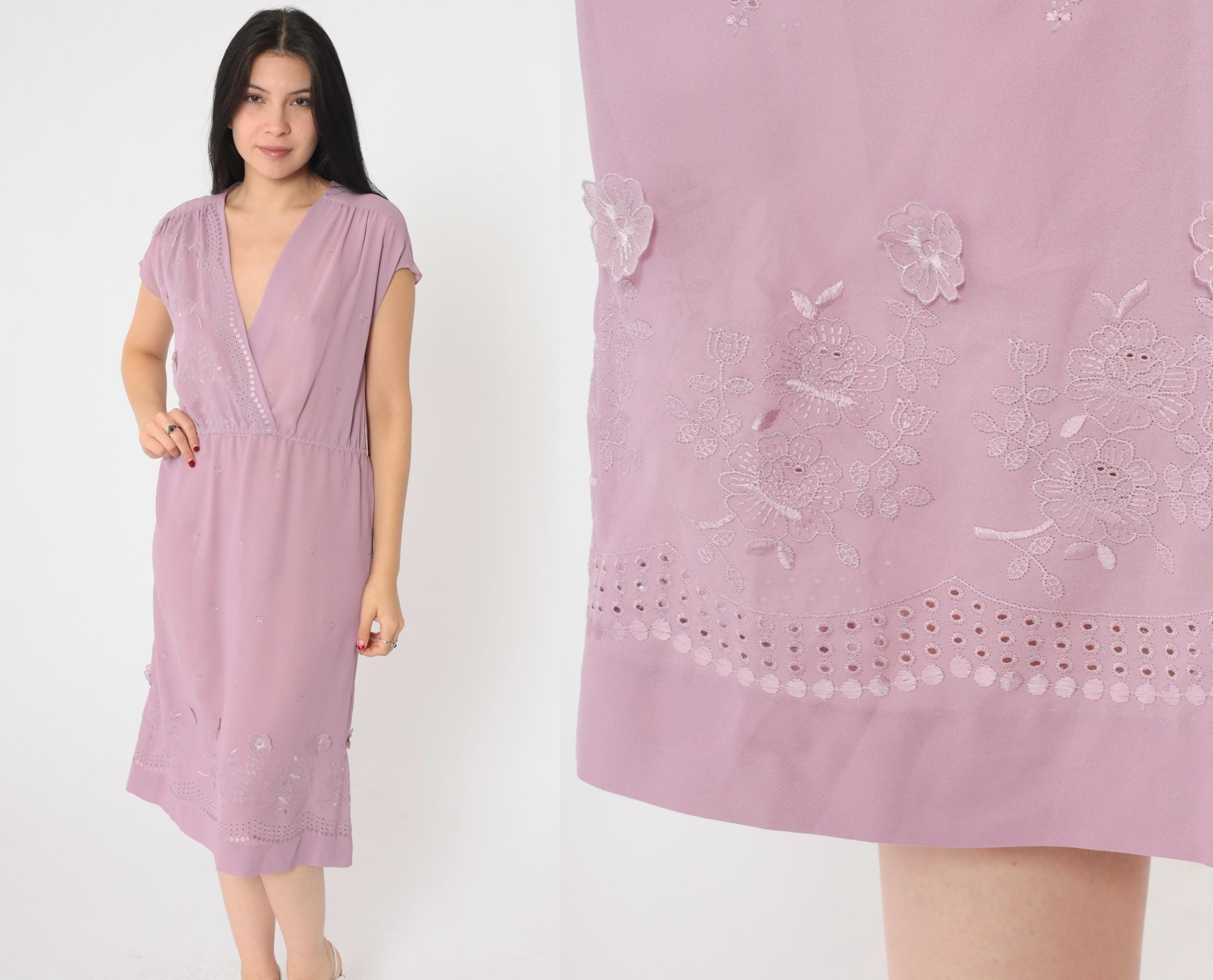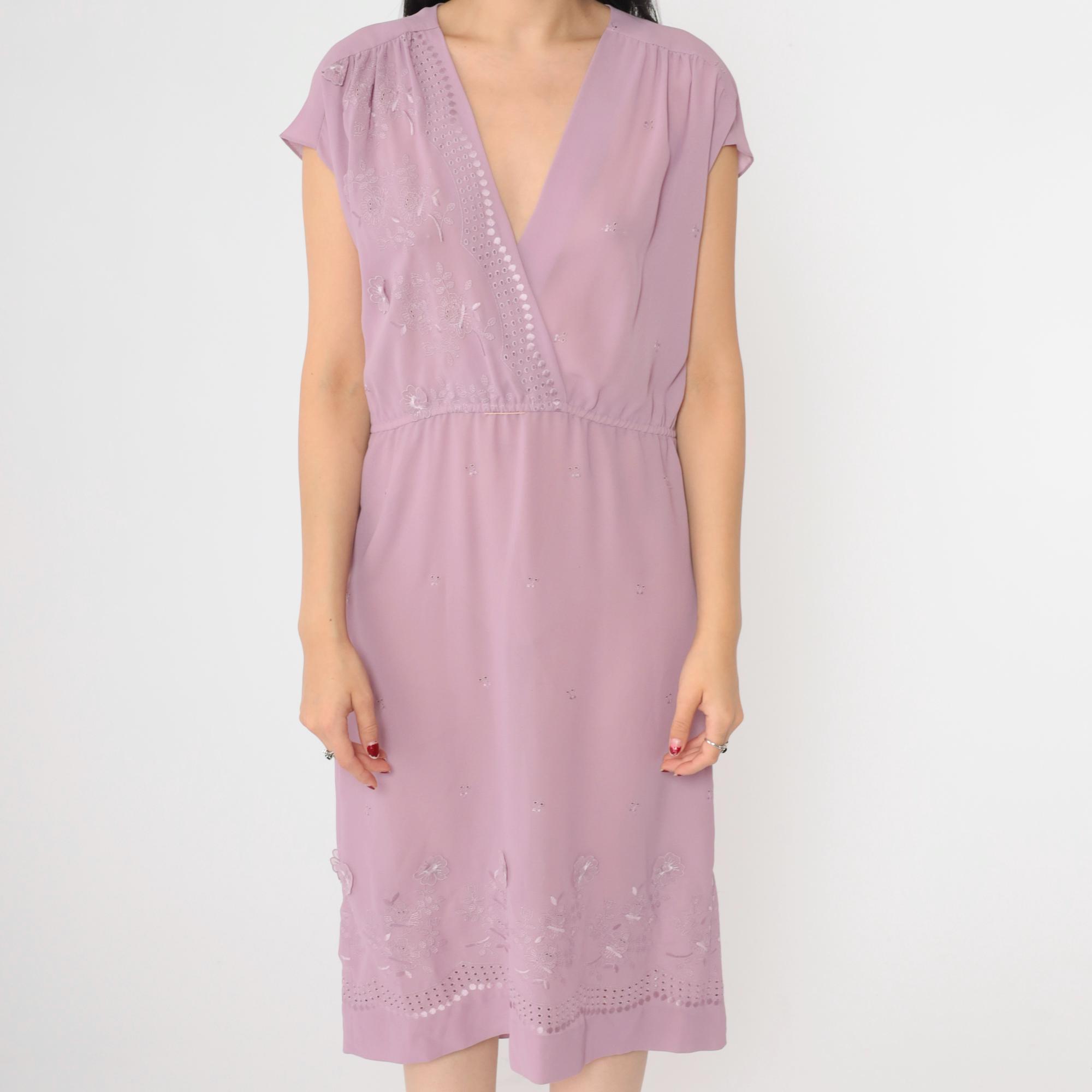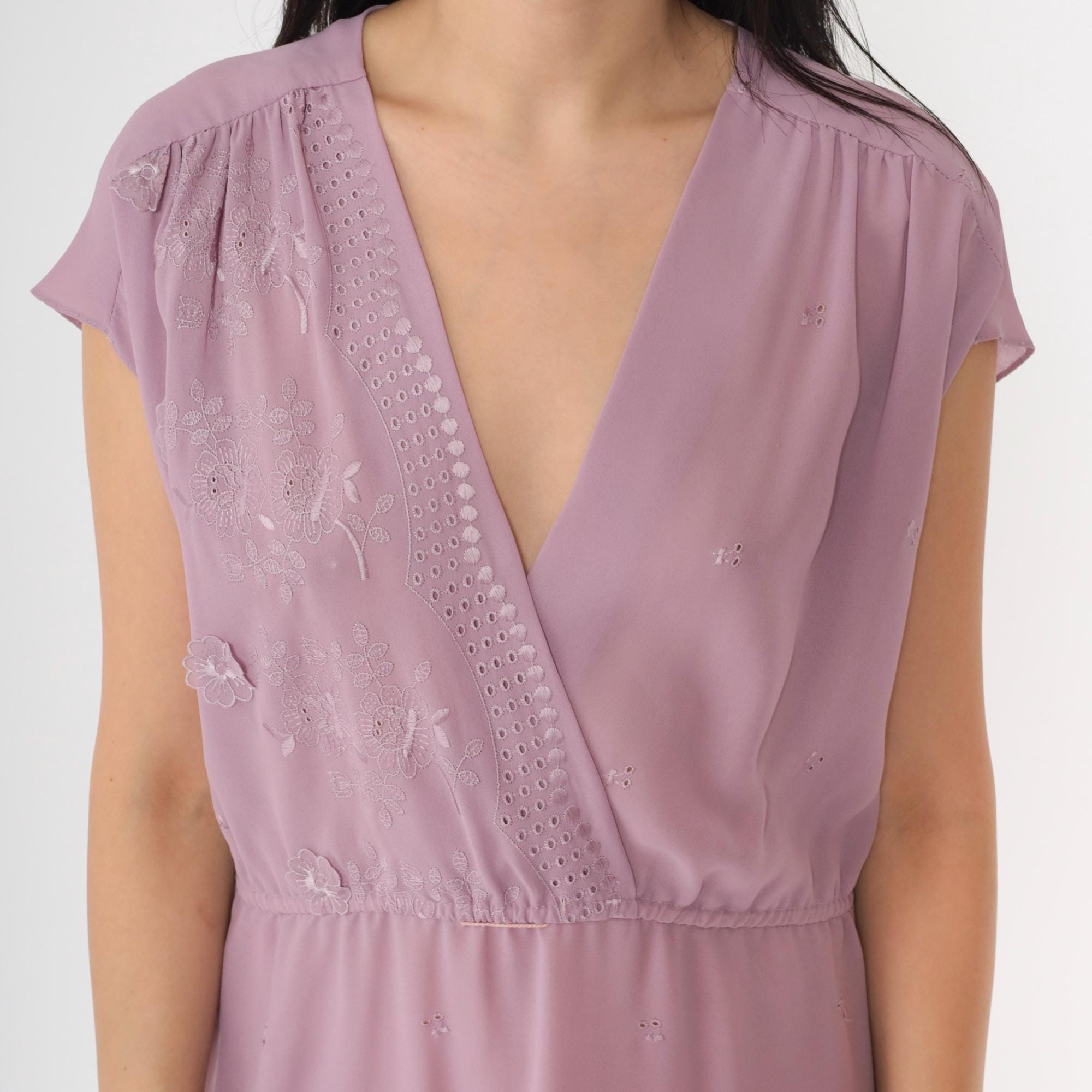 Vintage 70s 80s dress in sheer lavender with floral embroidery and eyelet trim. It has a wrap bodice, a v neck and a draped fit. High waisted with cap sleeves, midi length.