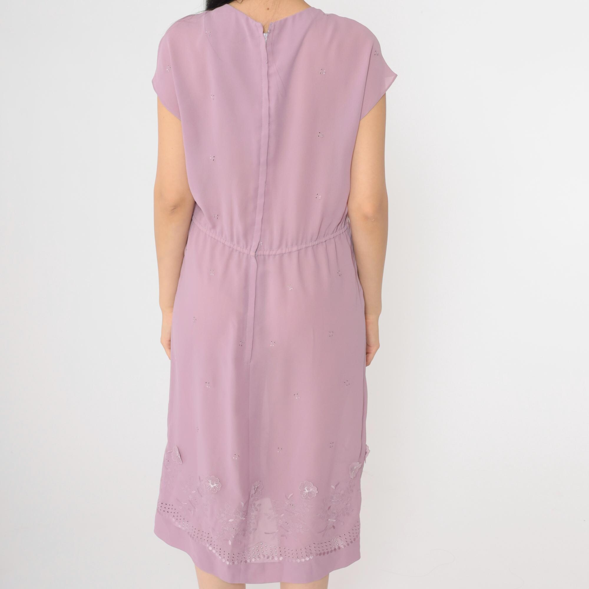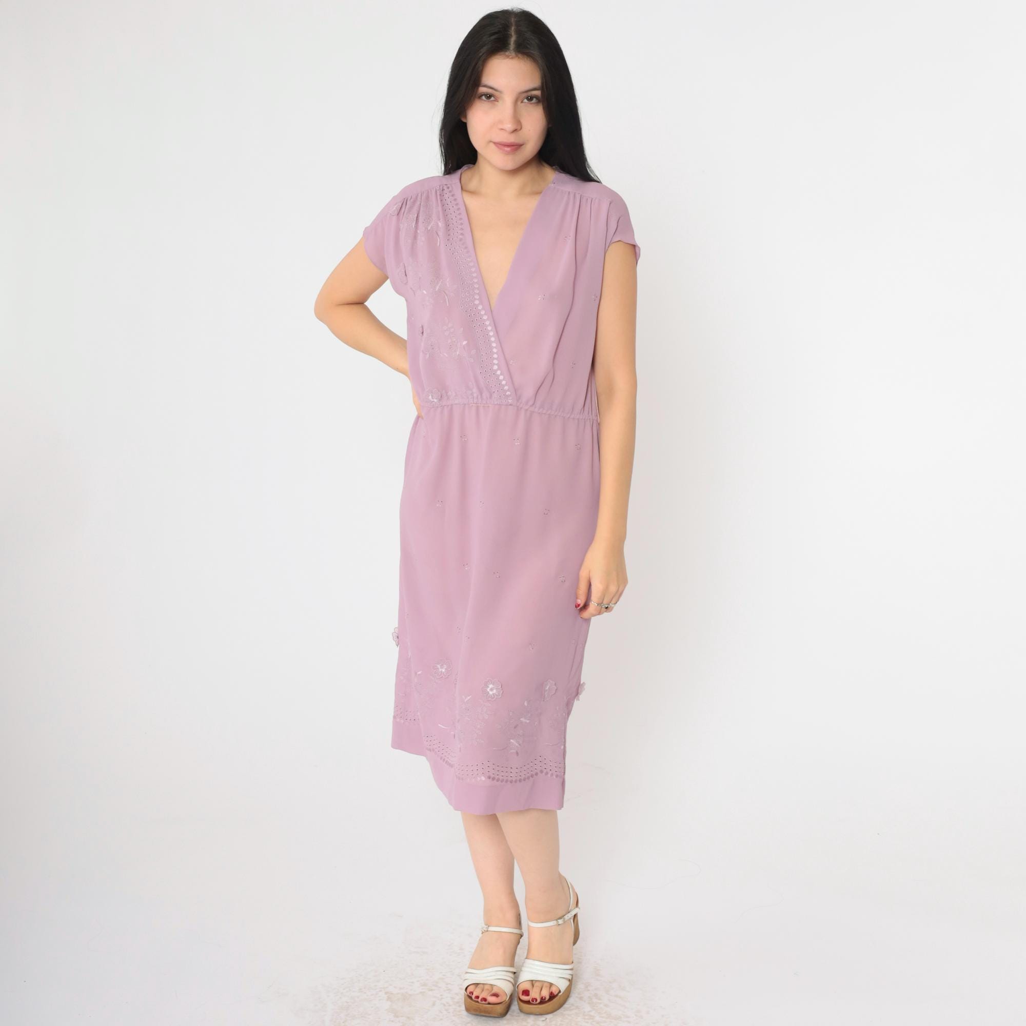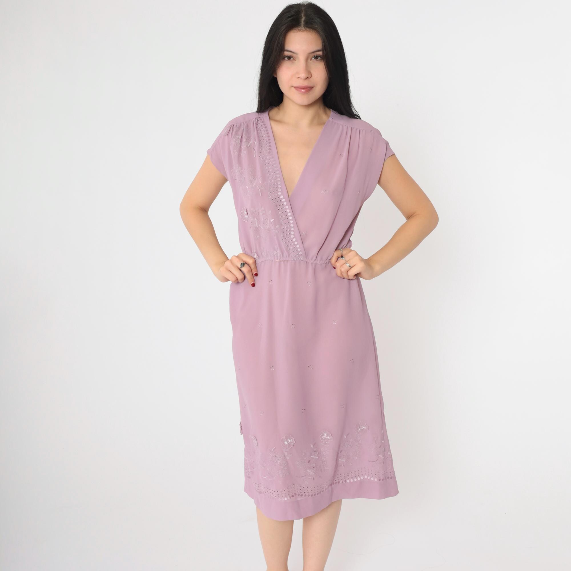 Vintage 70s 80s dress in sheer lavender with floral embroidery and eyelet trim. It has a wrap bodice, a v neck and a draped fit. High waisted with cap sleeves, midi length.